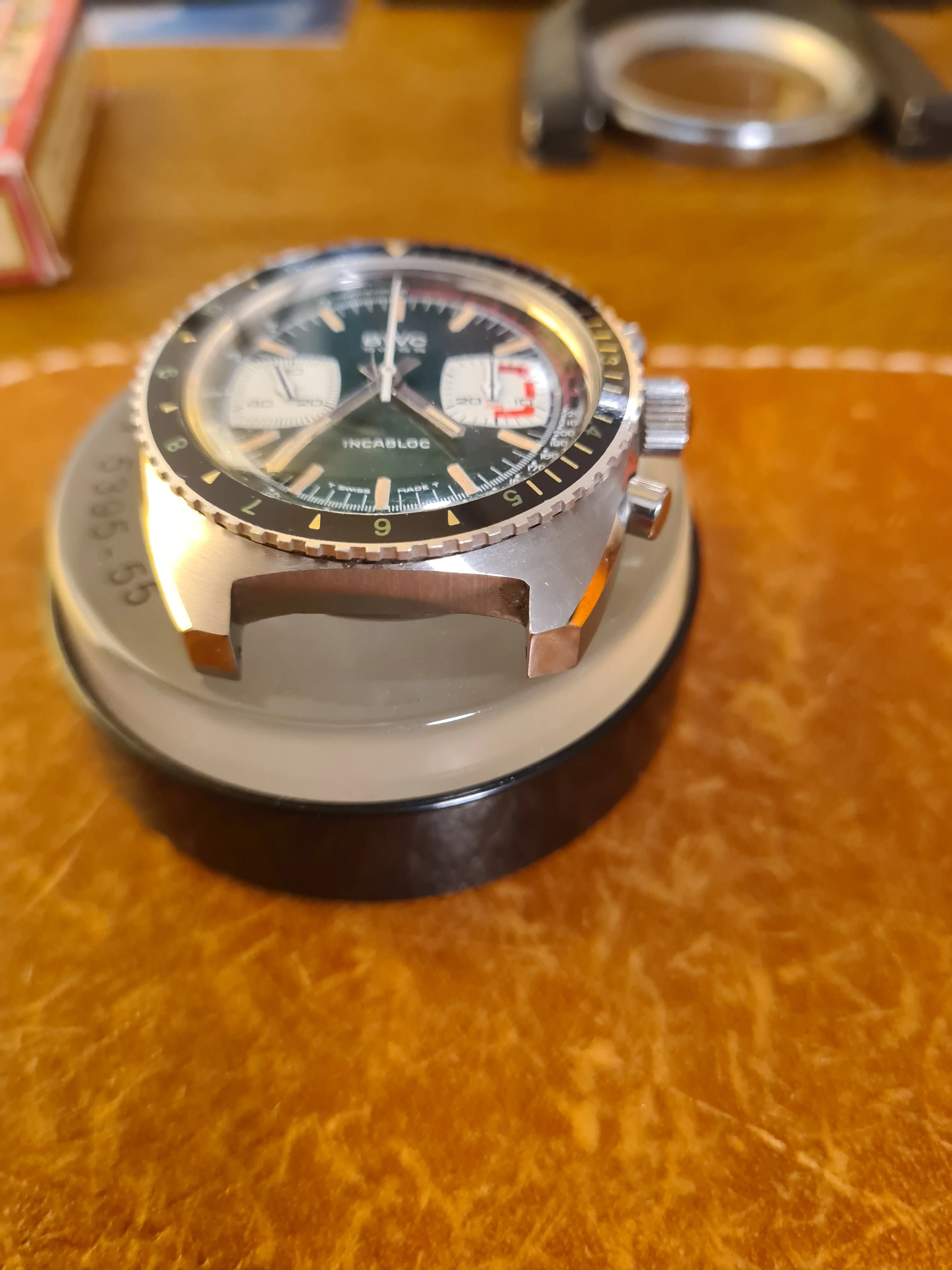 Other Details: Original screw-down crown. Very sharp, broad-toothed metal countdown bezel, bi-directional, turns smoothly w/good tension. 20mm lugs. Comes with a brand new, racing-green RIOS leather strap that suits the piece perfectly.