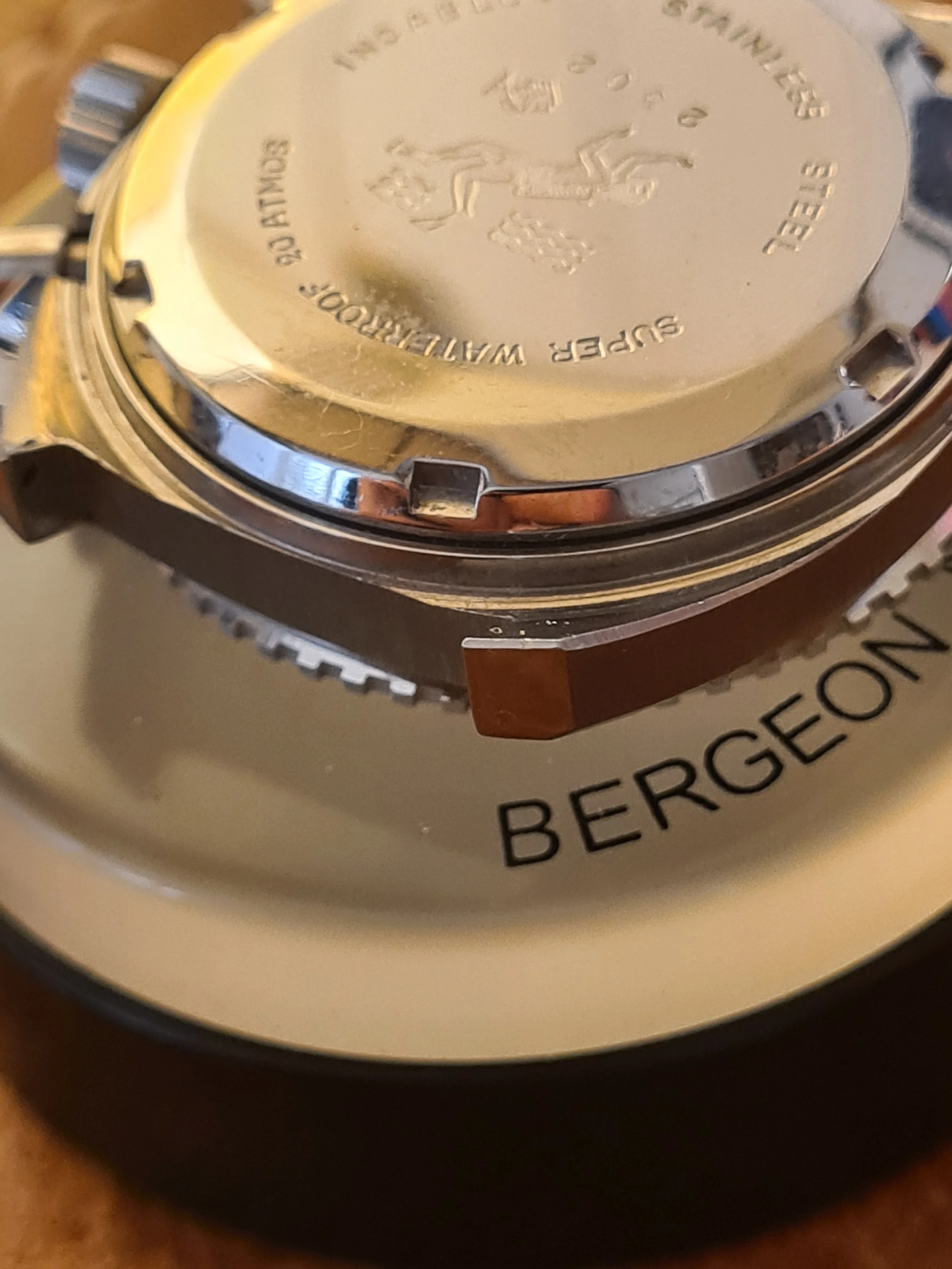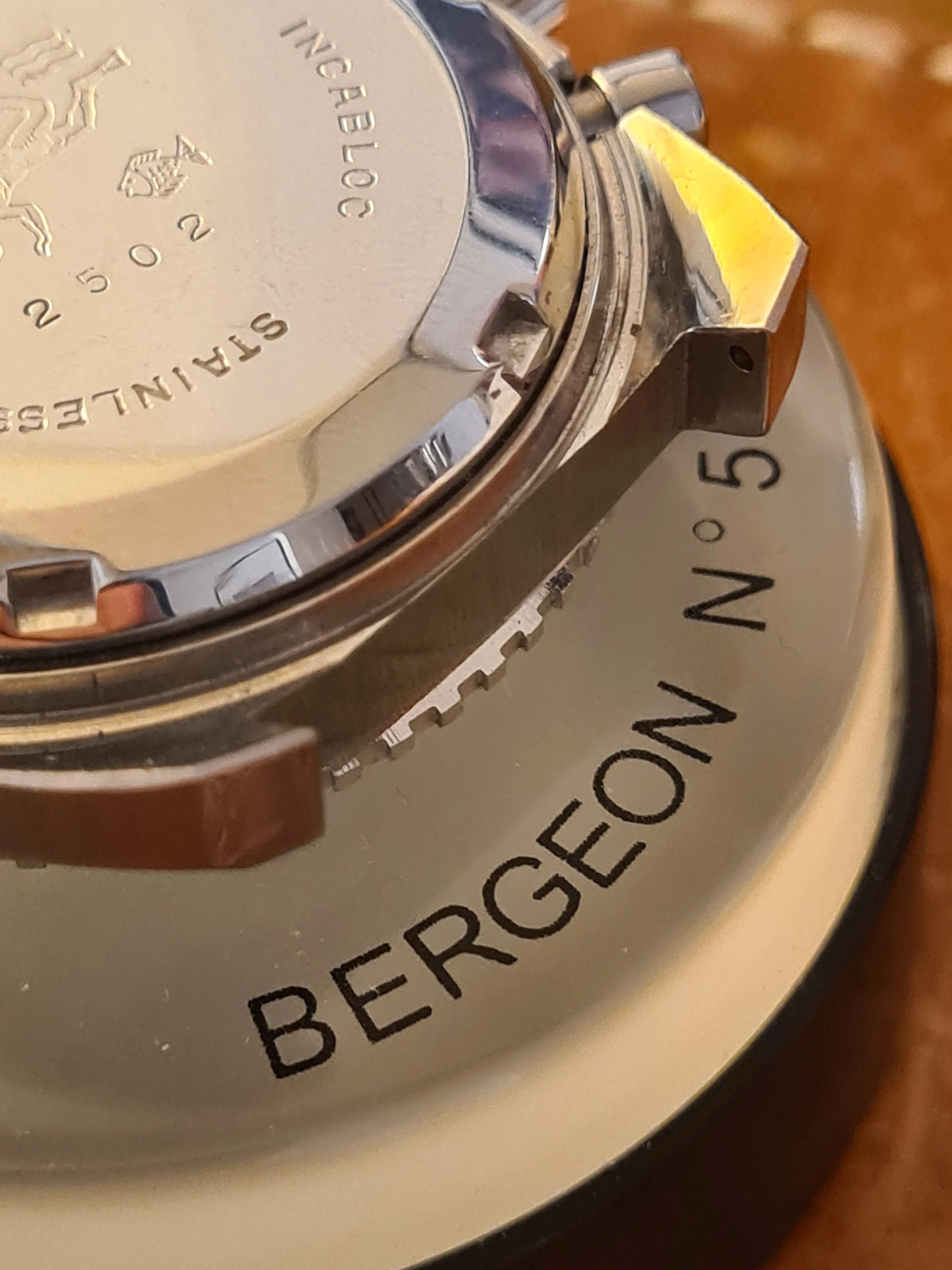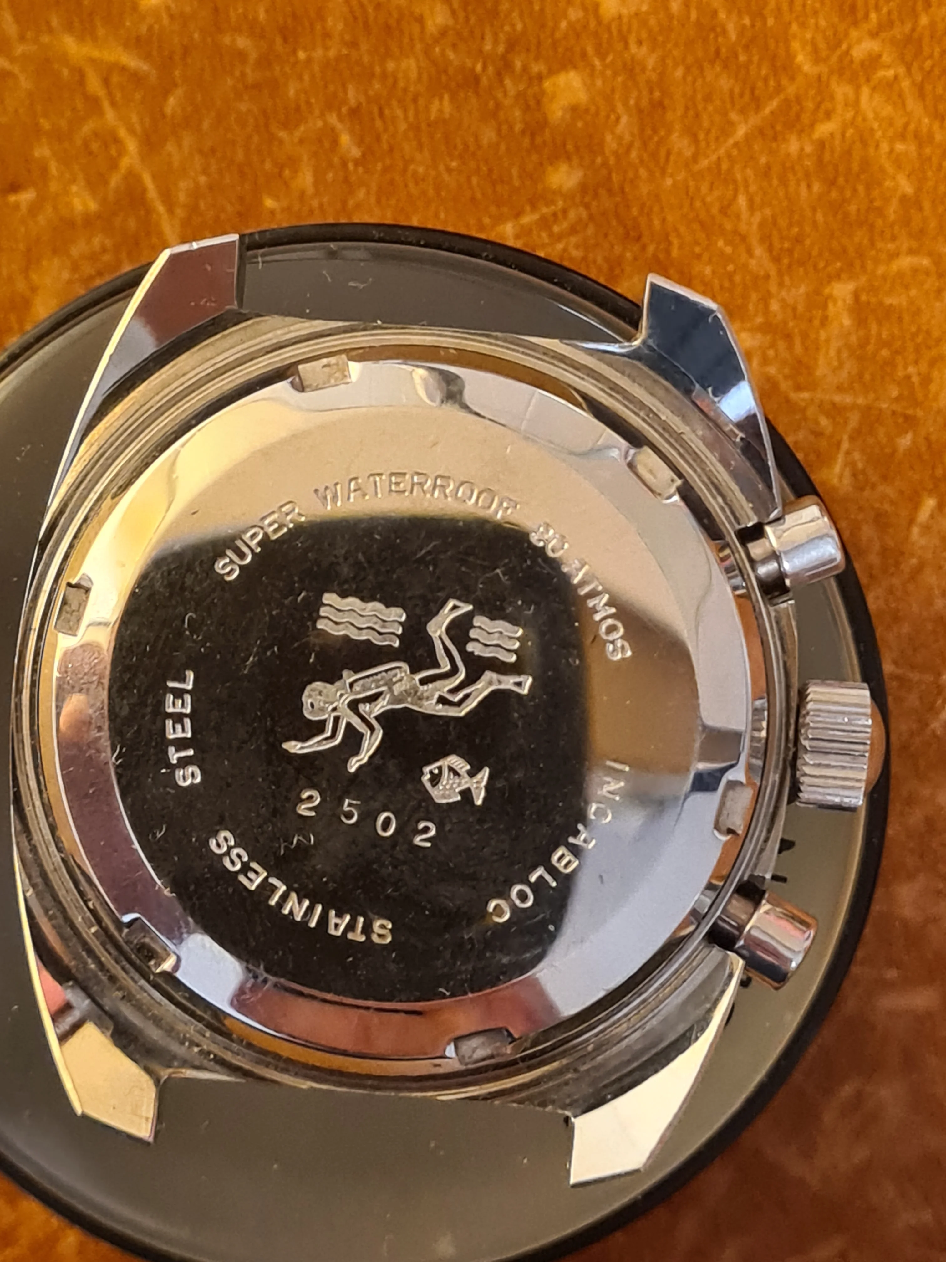 The Case: All-steel, ref. 2502 case is in near-NOS condition. 39mm diameter (w/o crown) makes for a robust wrist presence. Nice secondary beveling. All edges are razor sharp. No sign of polishing (or even any wear at all). Honestly, as far as vintage pieces from this period go, this is just about as nice as they come, condition-wise. Marked 20 atmospheres on caseback, with SCUBA diver logo. Though, as with any vintage piece, actual use for diving is not recommended (though you could wear it in the rain or get it splashed no problem).