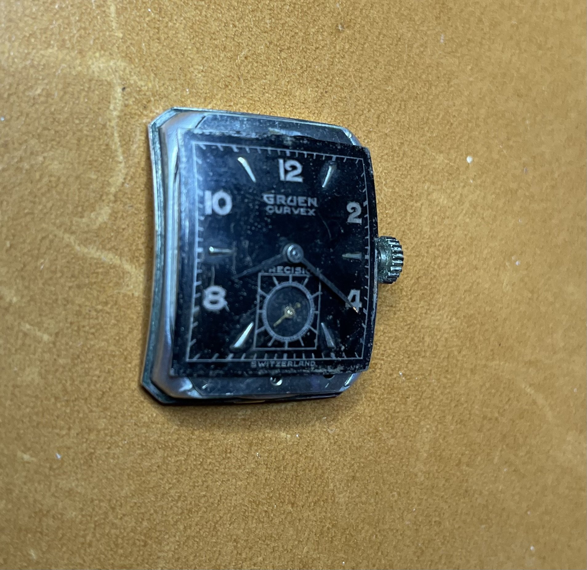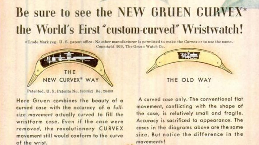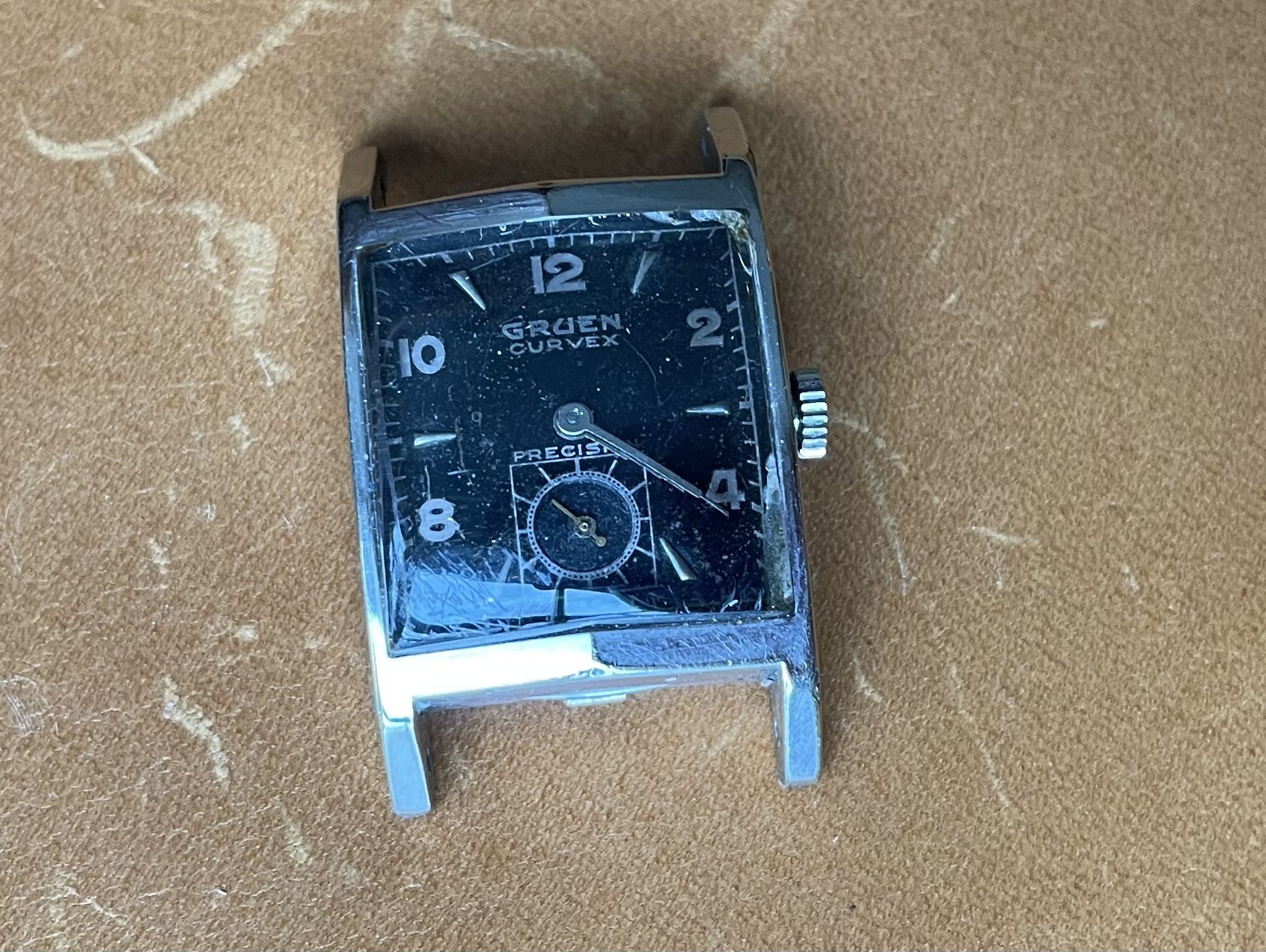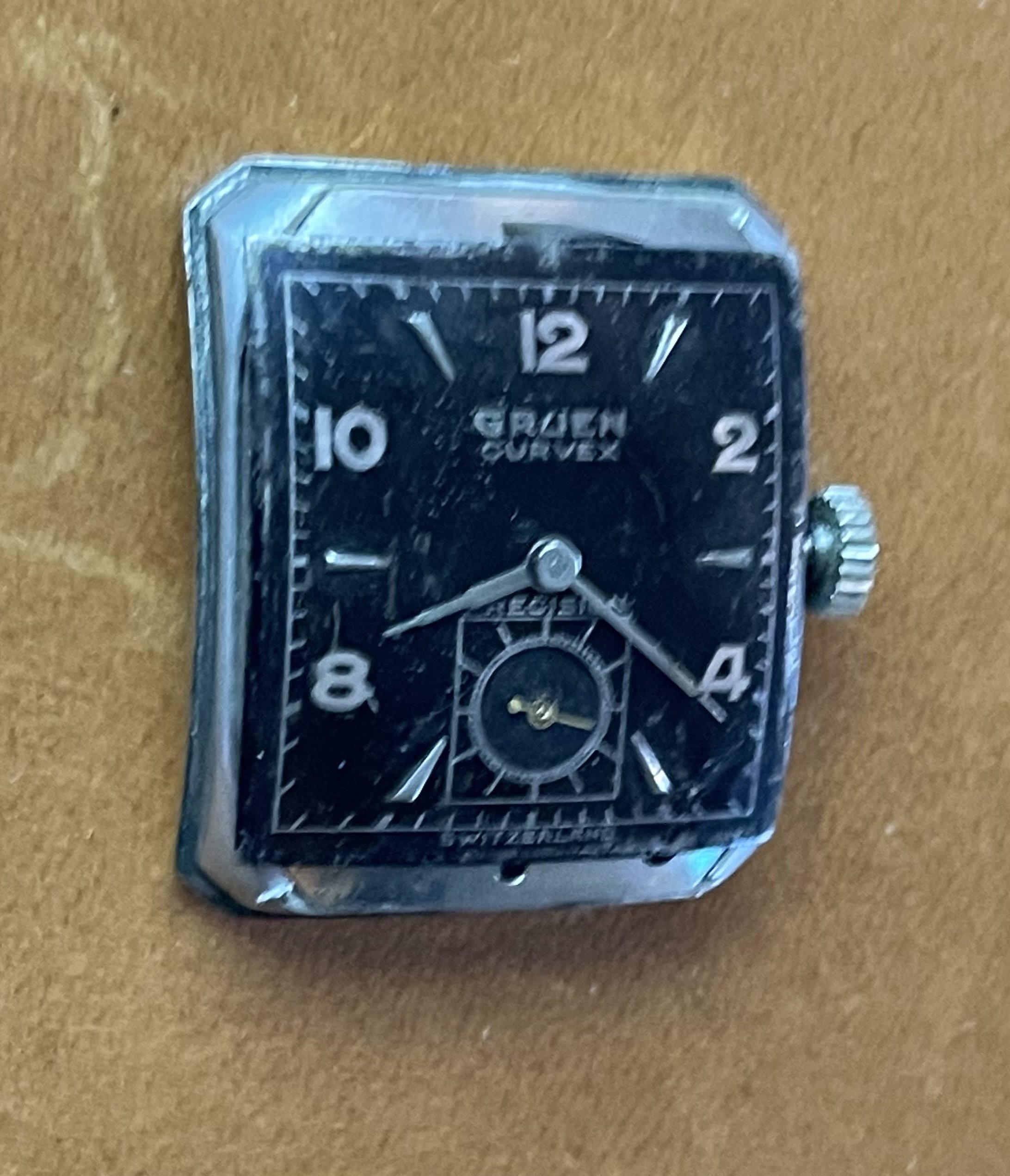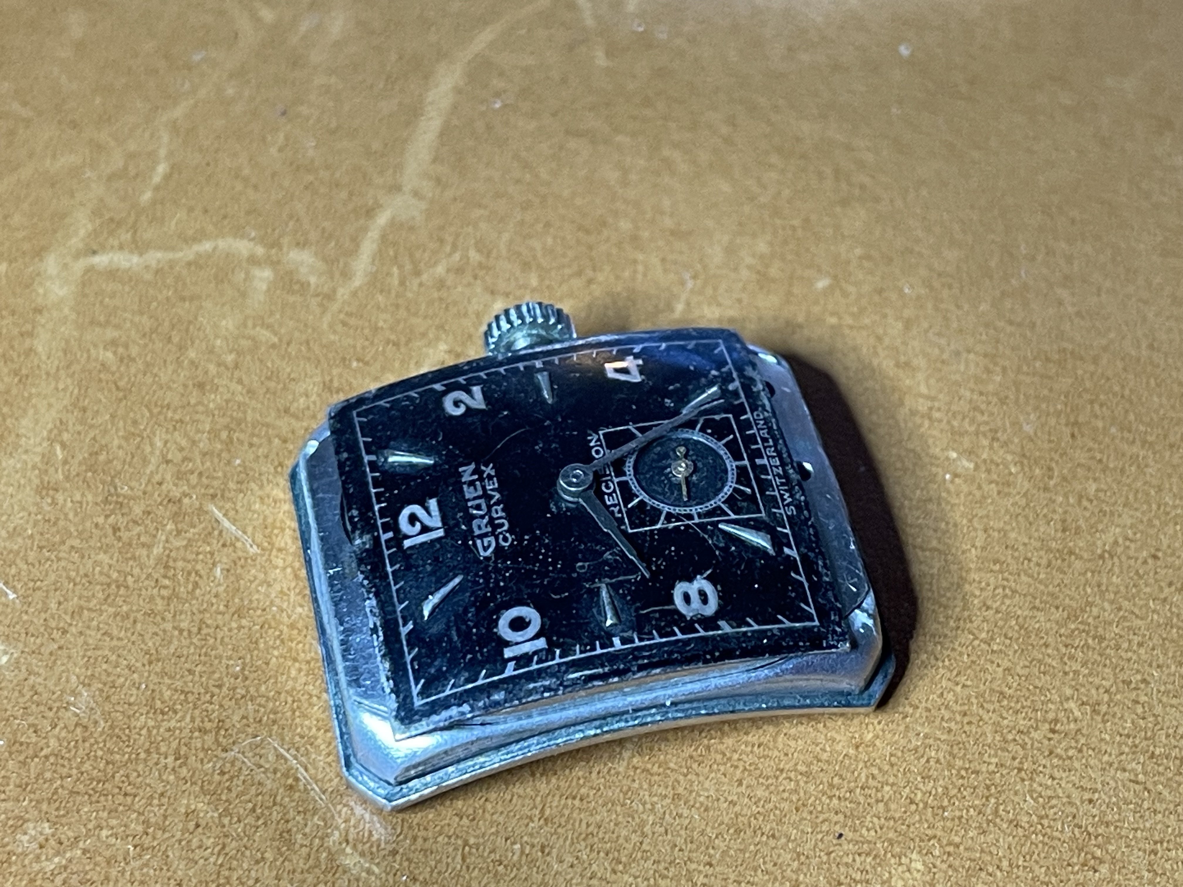 ·Up for sale for $2 Canadian is this c1948-1950 (dated to the best of my knowledge) Gruen Curvex in 10k white gold fill. Why is this in the accessories section instead of the watches for sale section? Well, the back pops off from time to time, so this is probably a parts watch. I wanted to offer it here because the shape/design is pretty compelling, and the applied furniture looks great when the light catches it, and hopefully it can be made whole again, or contribute as a donor. The watch runs and presents well, but note that the second hand is a replacement. The watch has a nifty cal 370 Curvex Precision movement.