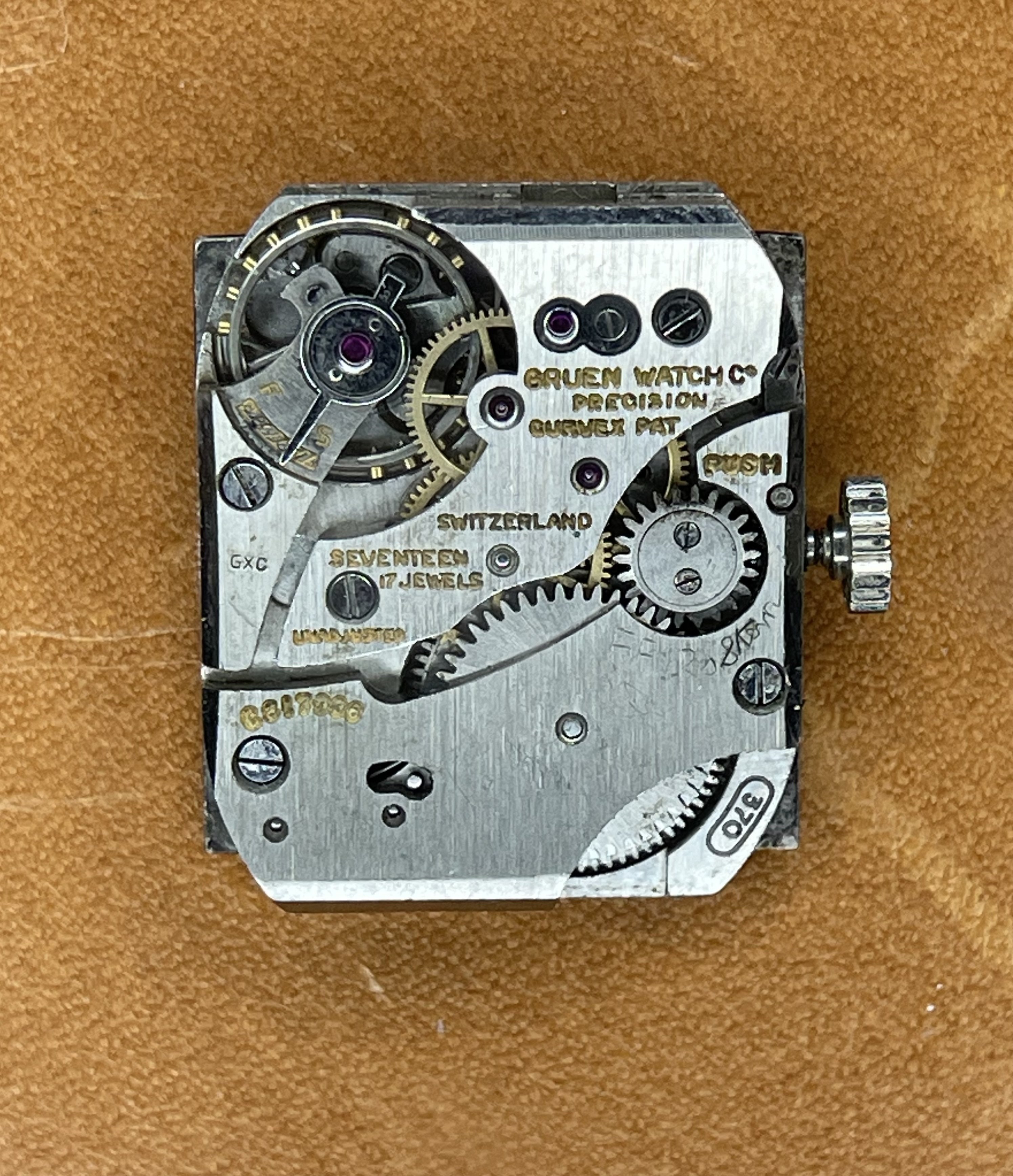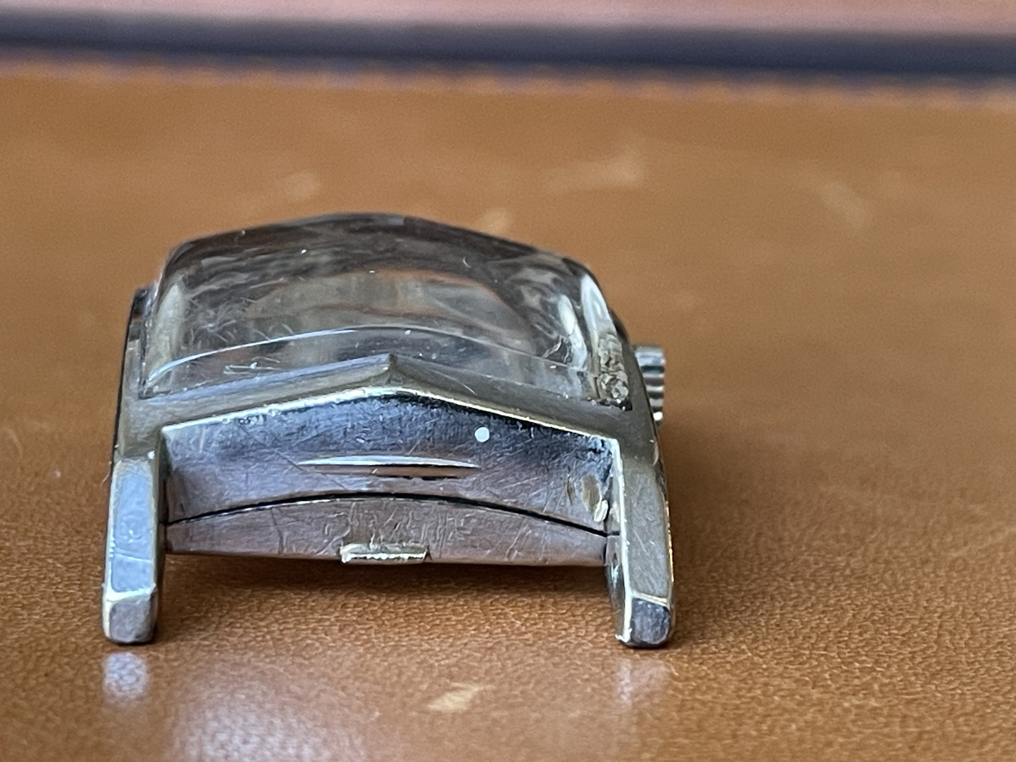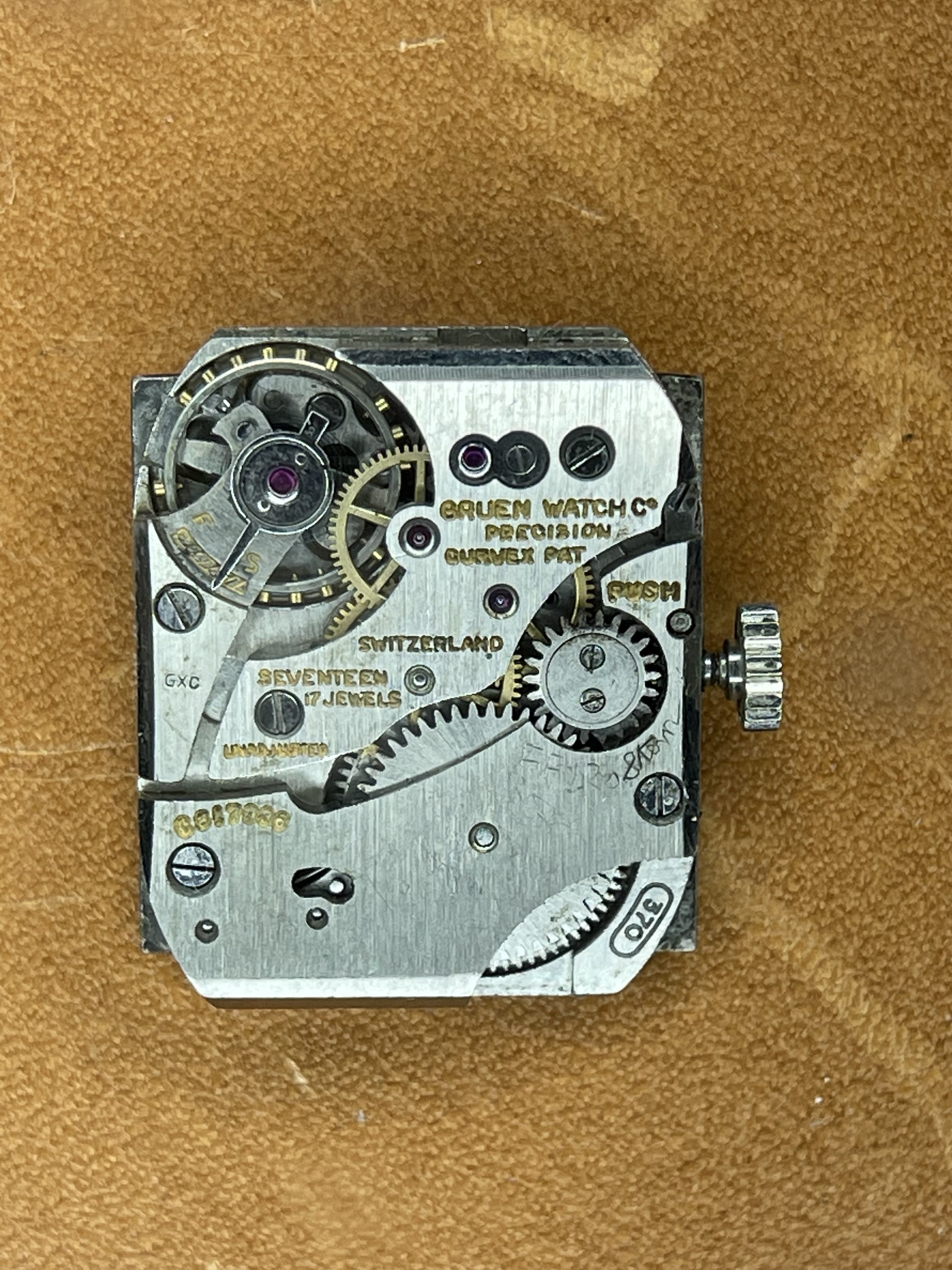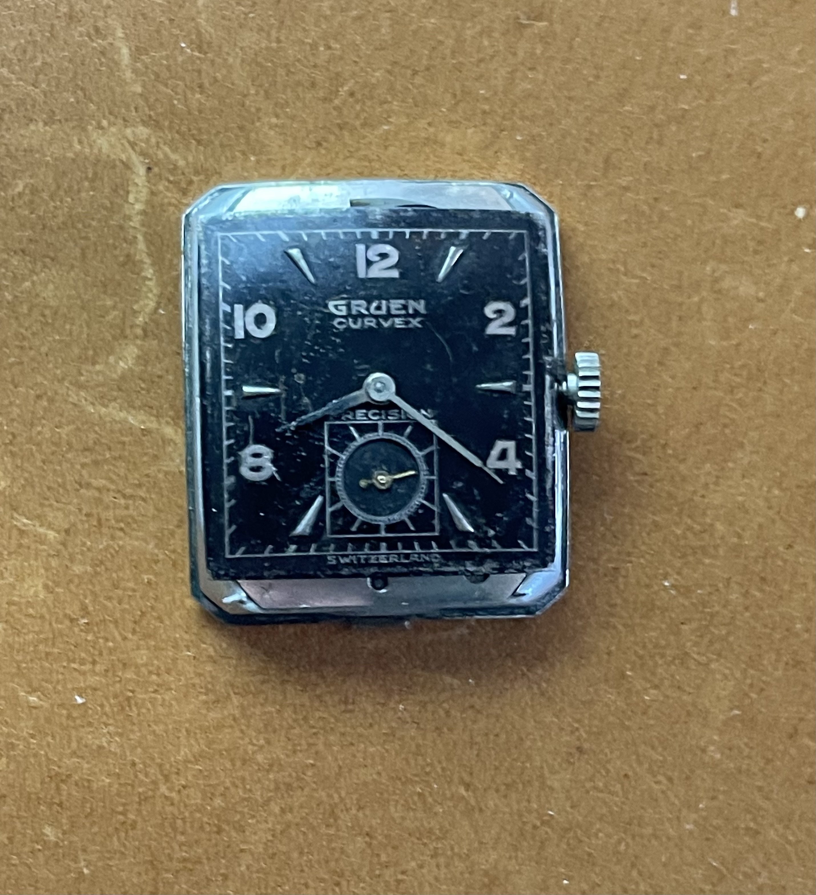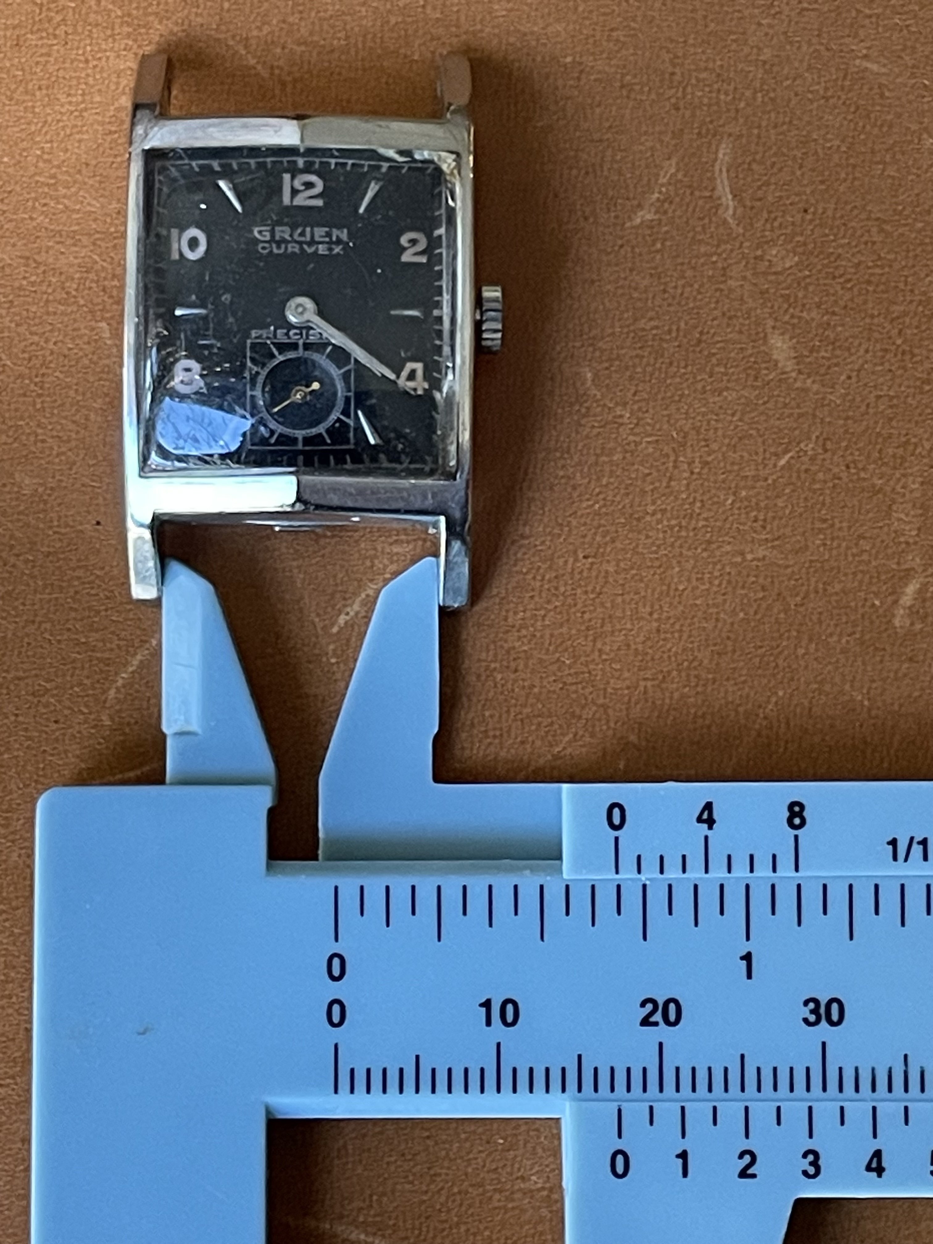 ·Up for sale for $2 Canadian is this c1948-1950 (dated to the best of my knowledge) Gruen Curvex in 10k white gold fill. Why is this in the accessories section instead of the watches for sale section? Well, the back pops off from time to time, so this is probably a parts watch. I wanted to offer it here because the shape/design is pretty compelling, and the applied furniture looks great when the light catches it, and hopefully it can be made whole again, or contribute as a donor. The watch runs and presents well, but note that the second hand is a replacement. The watch has a nifty cal 370 Curvex Precision movement.