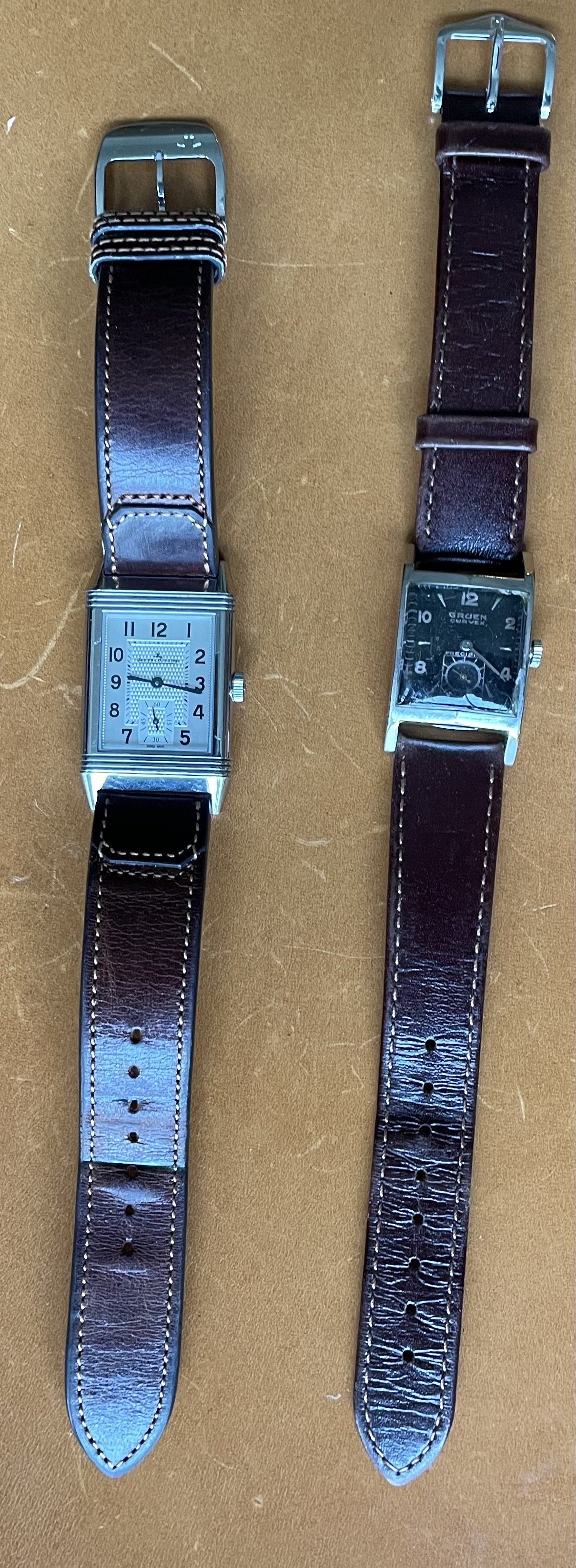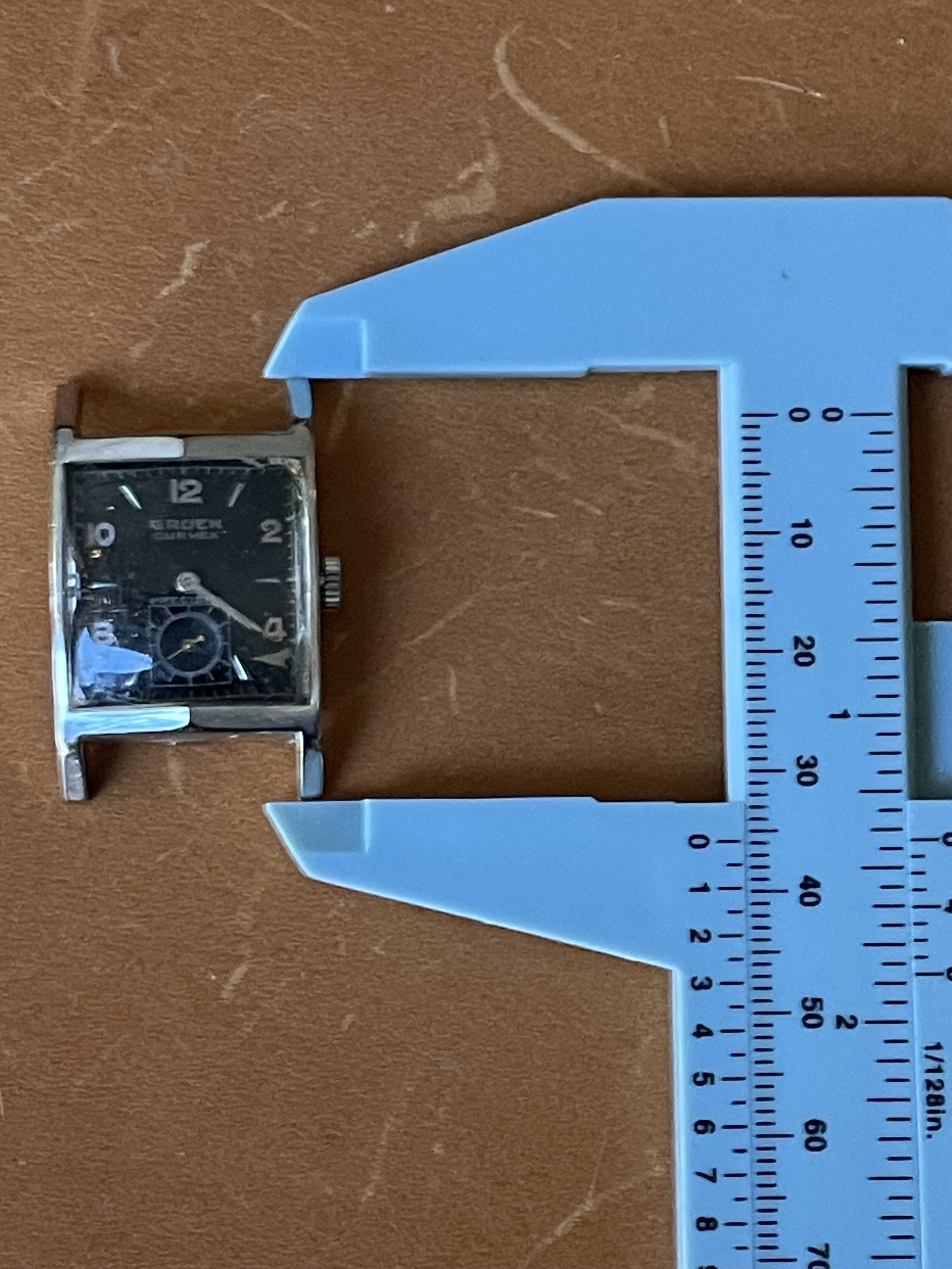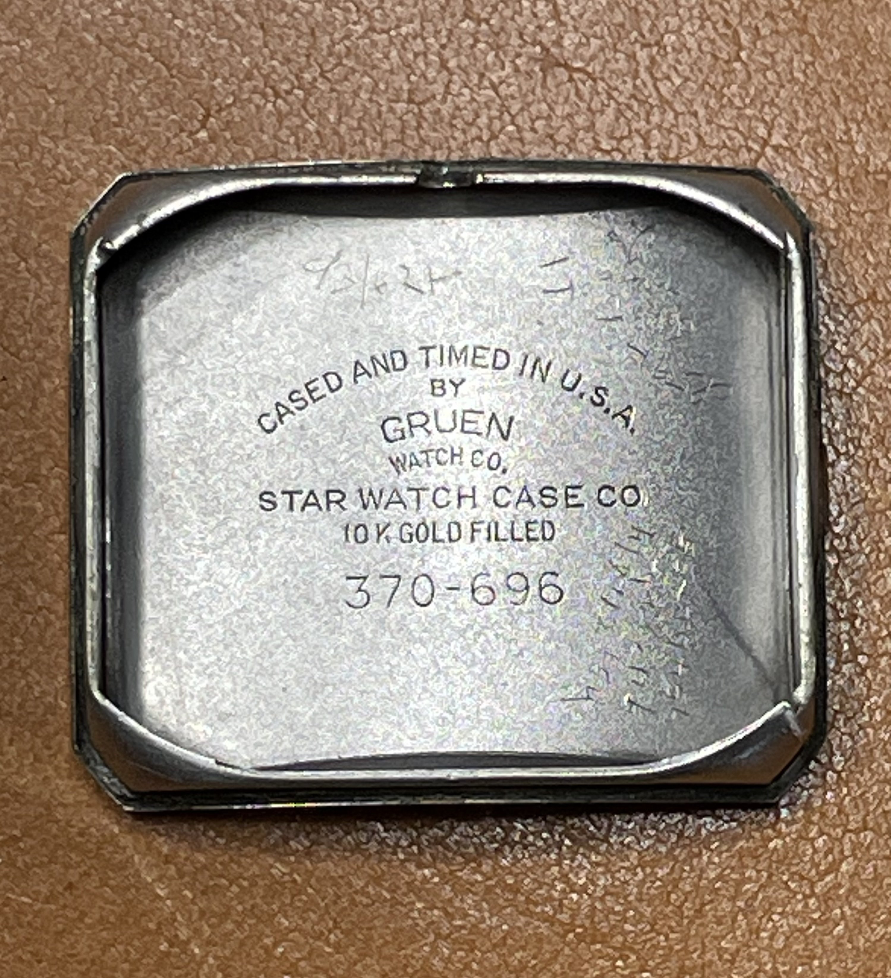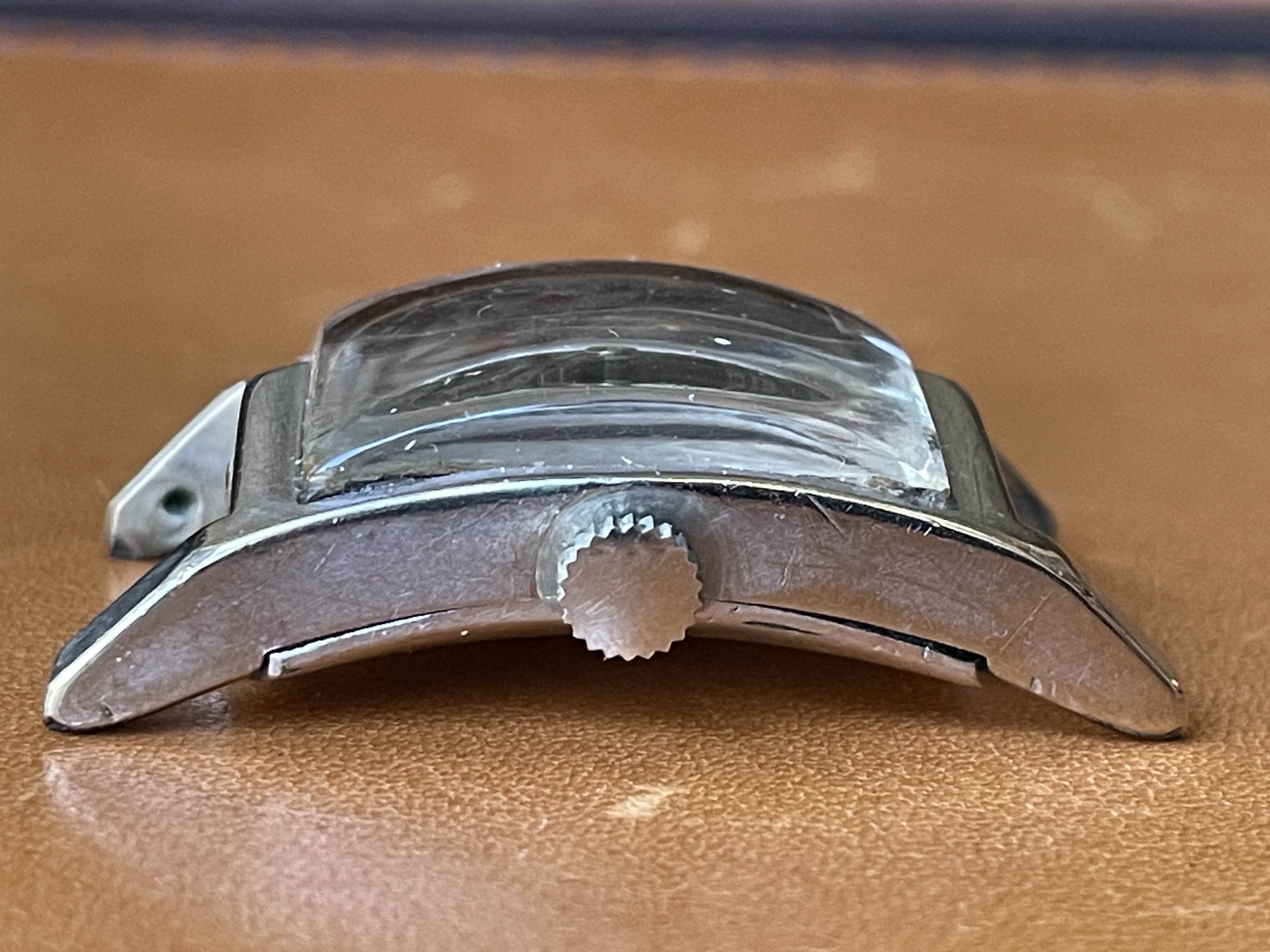 ·Up for sale for $2 Canadian is this c1948-1950 (dated to the best of my knowledge) Gruen Curvex in 10k white gold fill. Why is this in the accessories section instead of the watches for sale section? Well, the back pops off from time to time, so this is probably a parts watch. I wanted to offer it here because the shape/design is pretty compelling, and the applied furniture looks great when the light catches it, and hopefully it can be made whole again, or contribute as a donor. The watch runs and presents well, but note that the second hand is a replacement. The watch has a nifty cal 370 Curvex Precision movement.