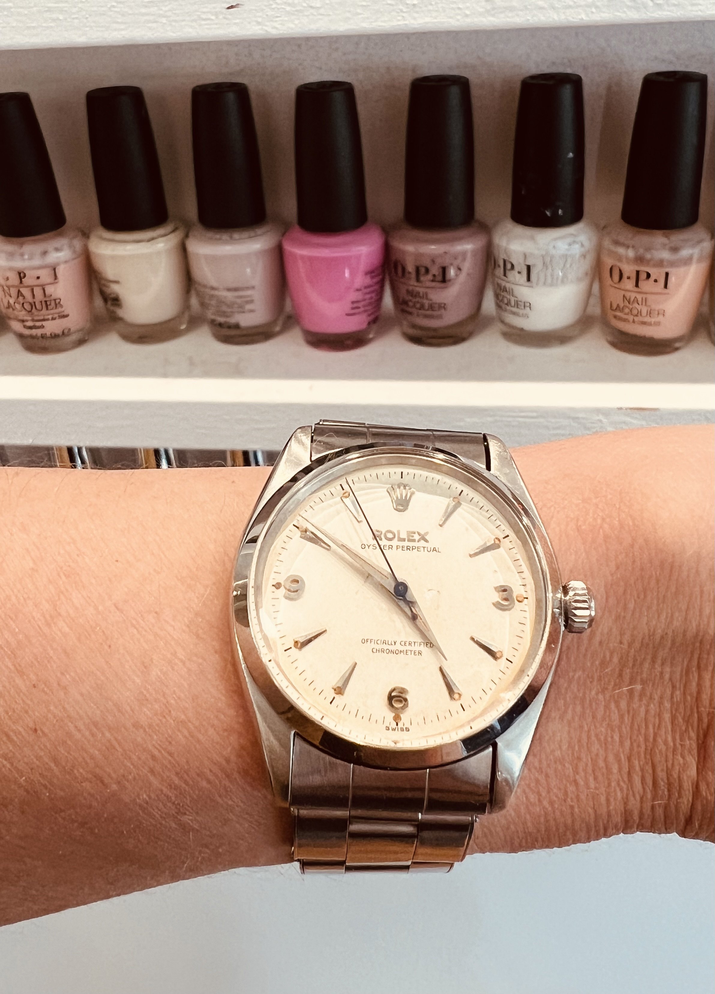 ·This caliber of the Oyster Perpetuals has a lot of variety. Here is my channel dial variant from 1957 with a rugged strap from Bulang and Sons. It’s kind of my beater Rolex—all original, plenty of dial patina, case back untouched but the rest of the case apparently not so pristine—but reliable, accurate, and gives me that Rolex thrill every time I wear it.