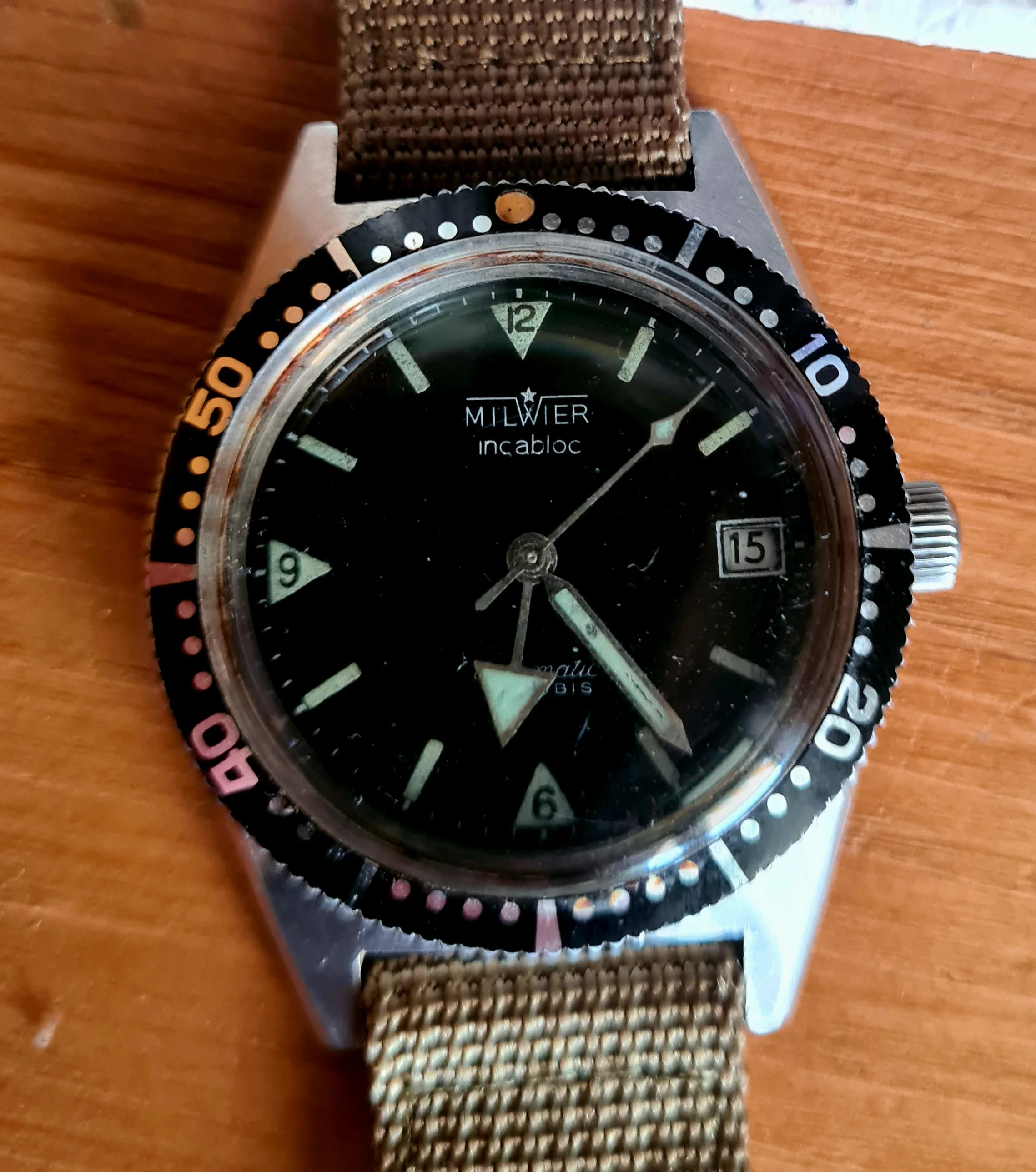 This is a barn-find from a recent trip to Italy. I can't find any info on the brand, and it's not listed on Microlisk. It looks like a Seiko 62mas-style case (also used by Stowa, the Smith's Astral, and in several other divers from the period), though with some nice additional beveling. The dial most closely resembles the Yema "skin diver" model, and the hands and bezel, those on the Smith's Astral. I've seen that particular style of "w" on a Waltham, but that might be coincidence. Any info appreciated!