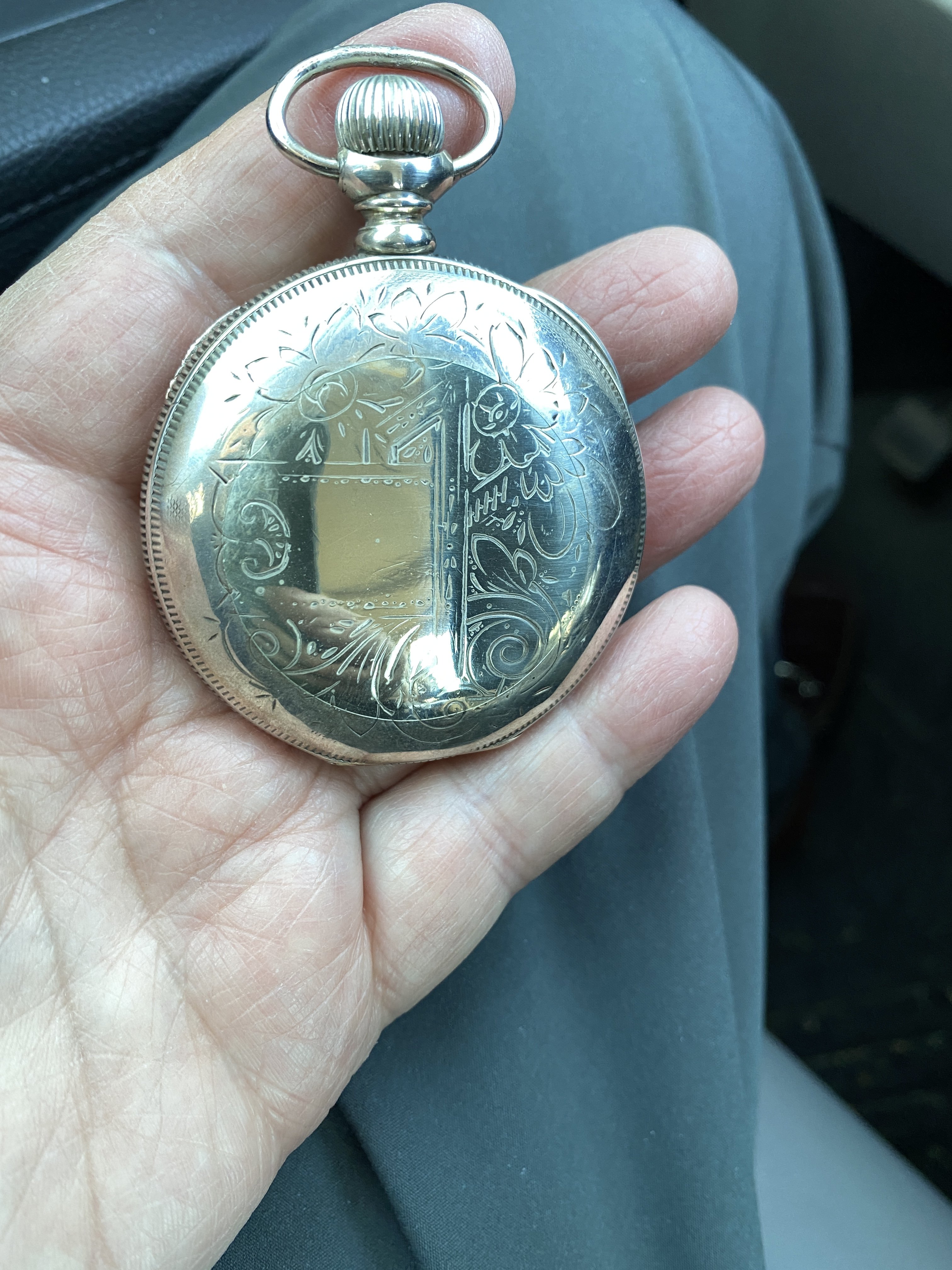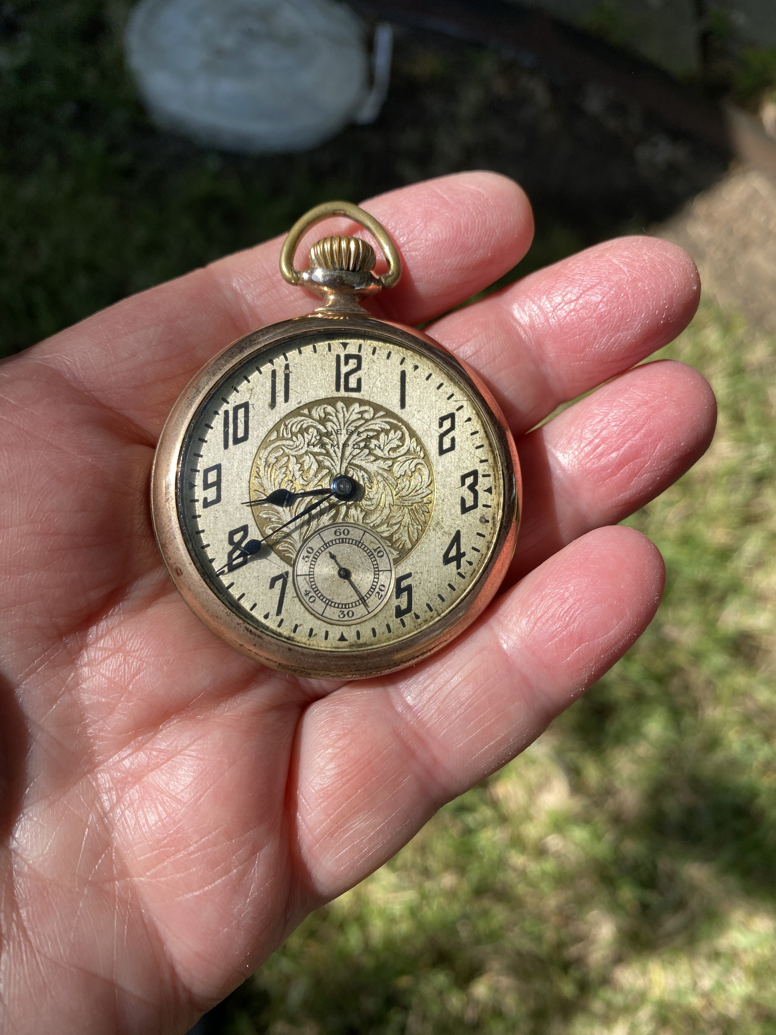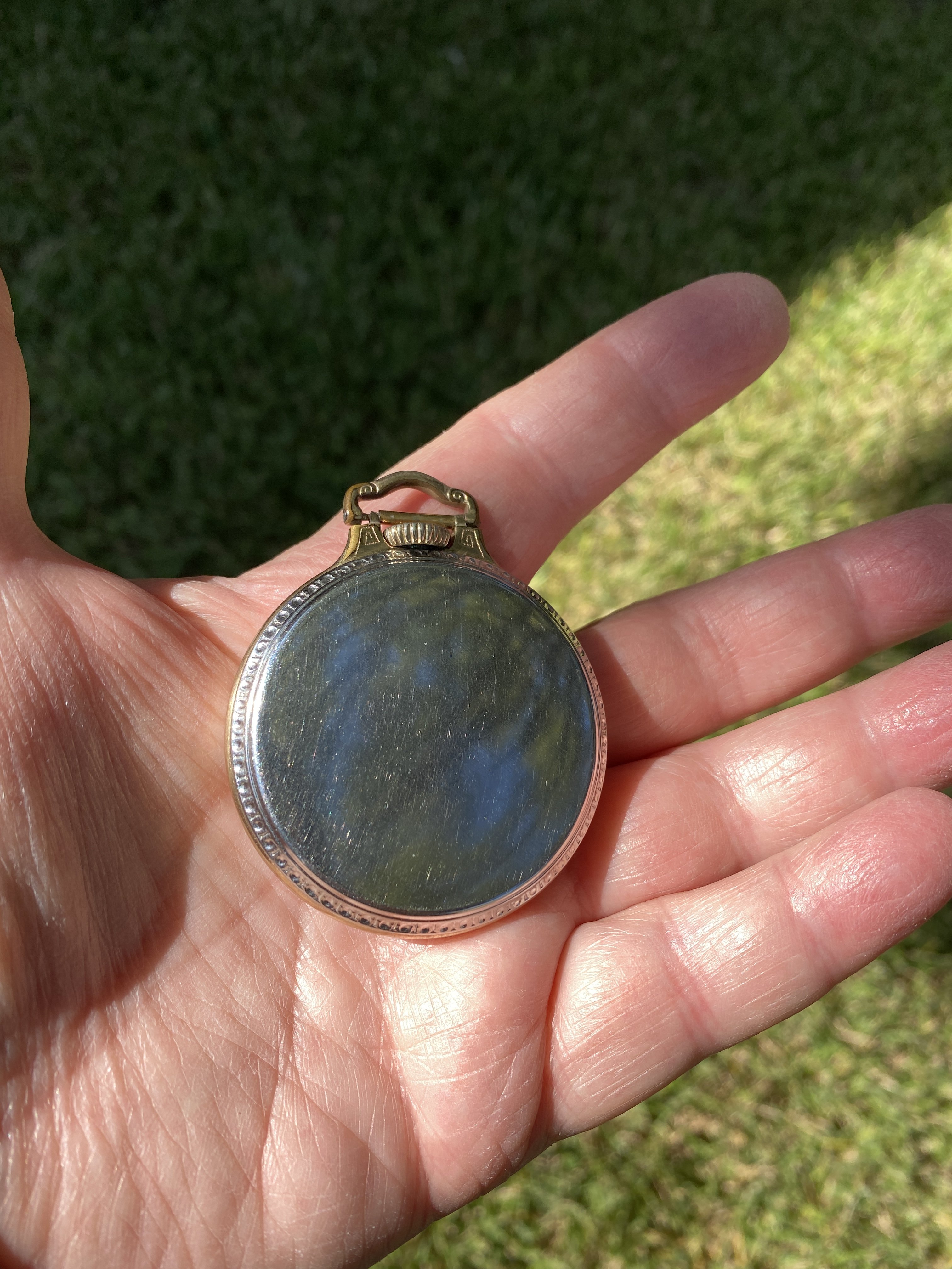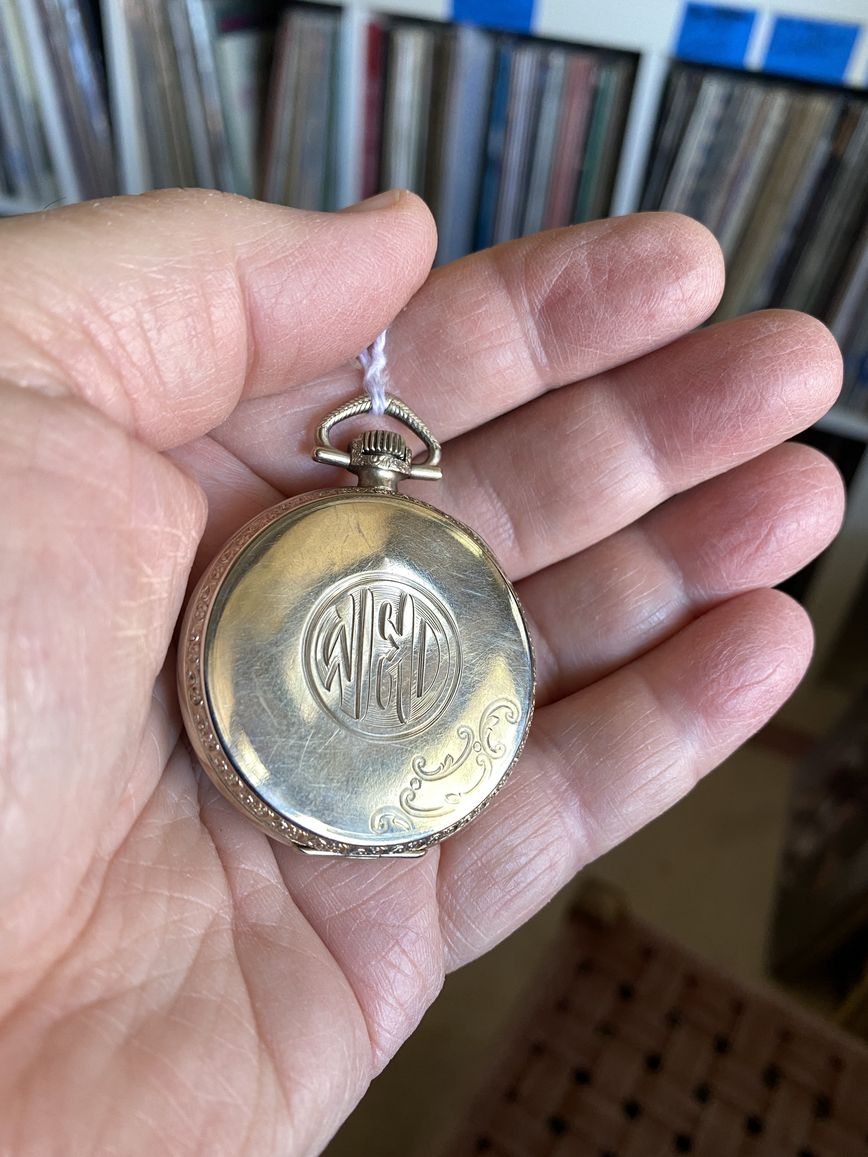 Indeed, a nicely finished movement in a high quality 14-karat gold case, and over all, in very nice condition. The case (to me), almost looks like green gold. I’ve had no luck deciphering the initials on the case back