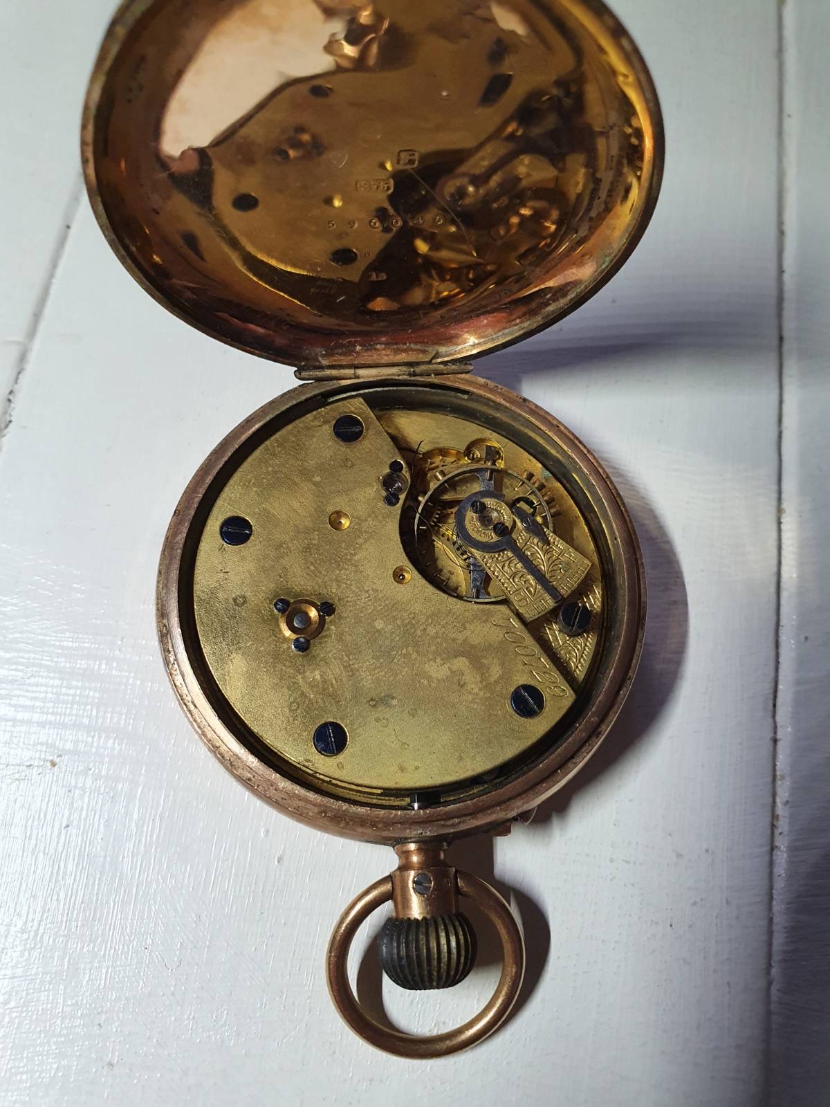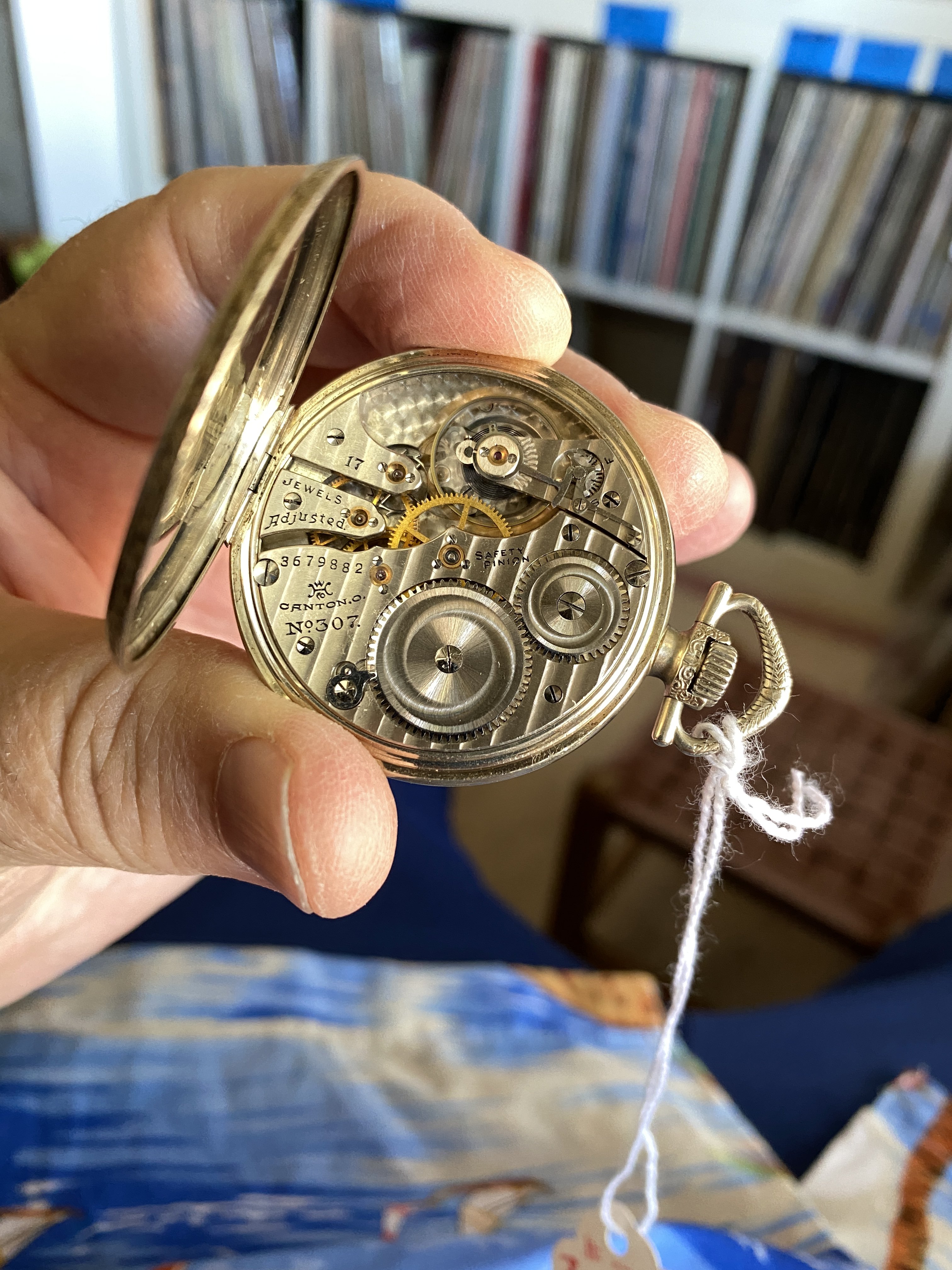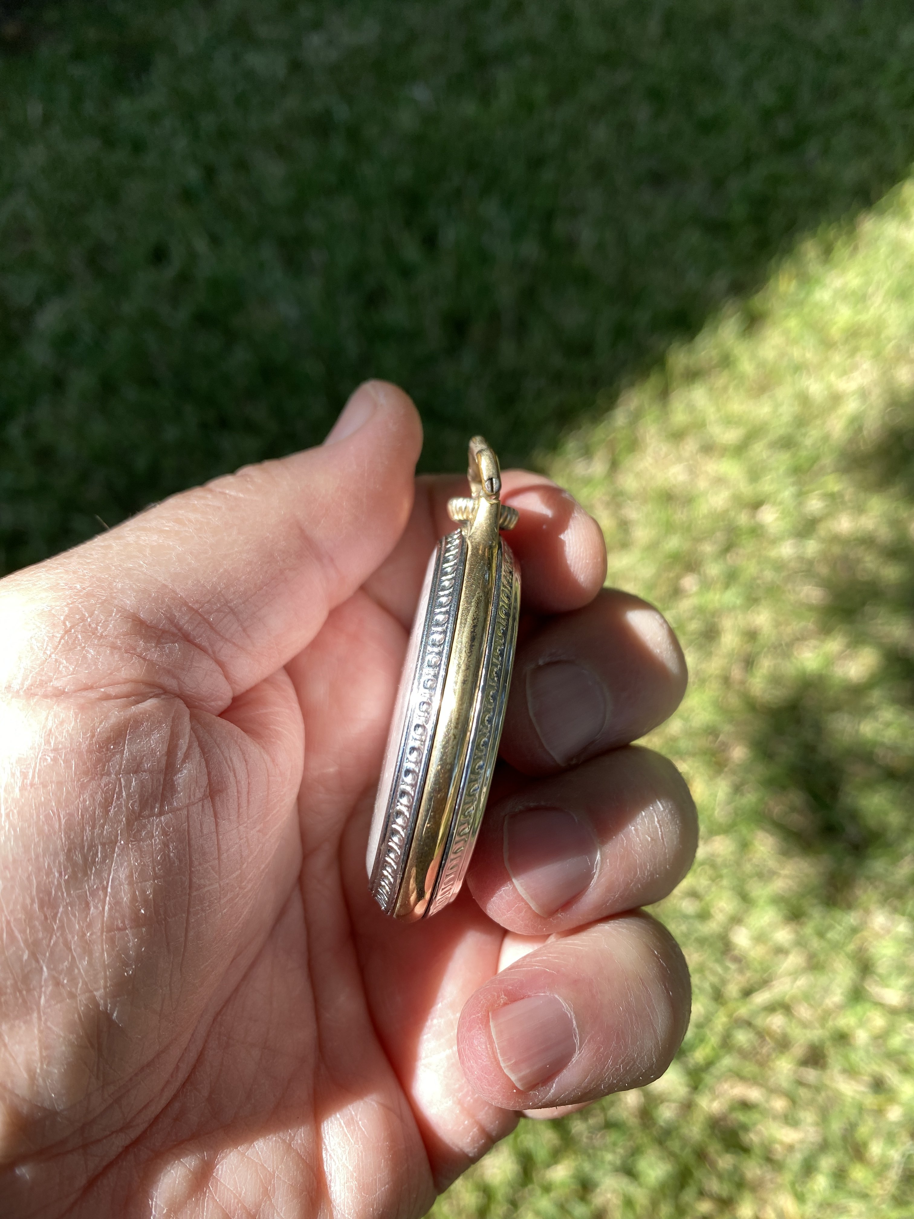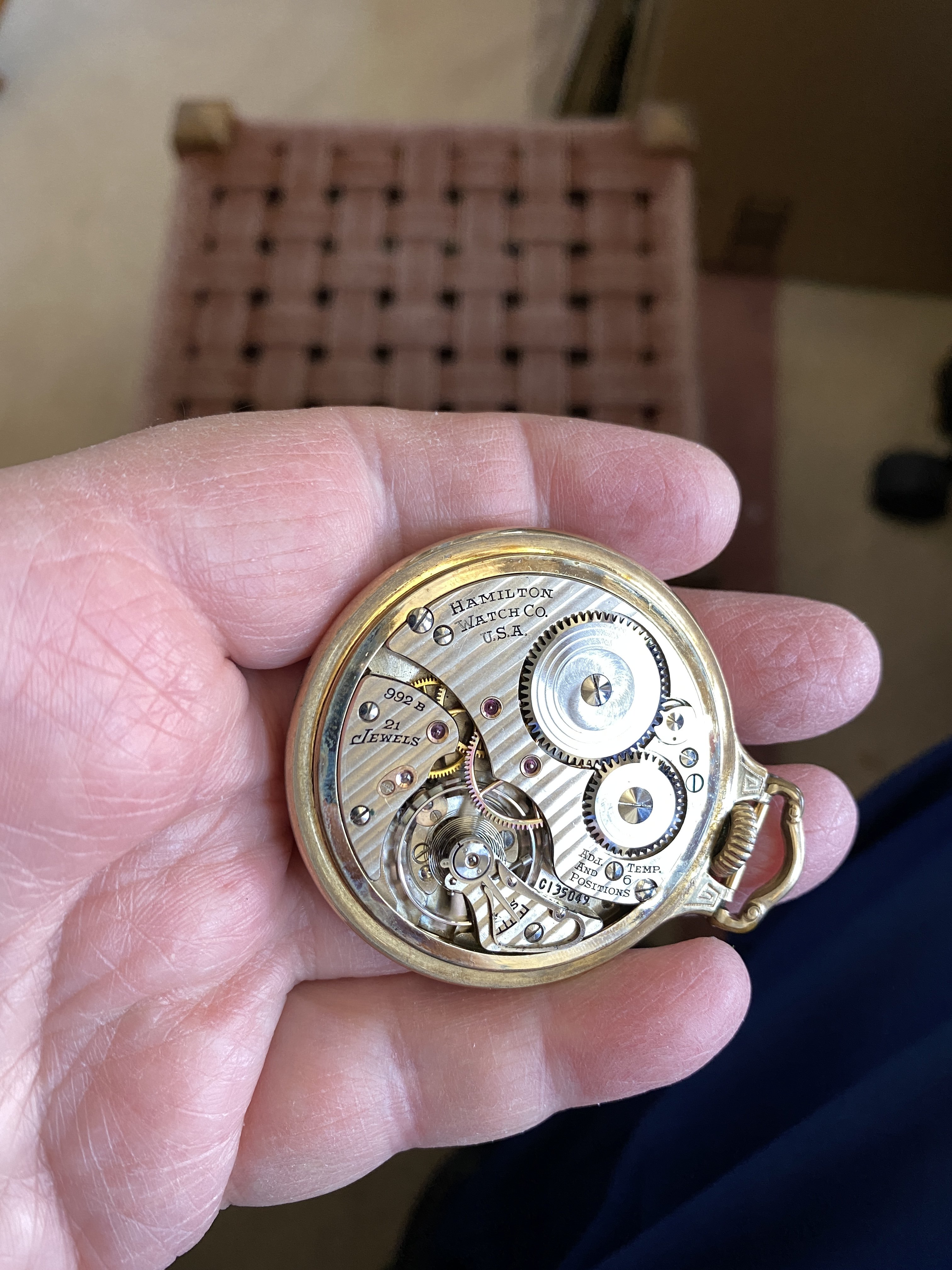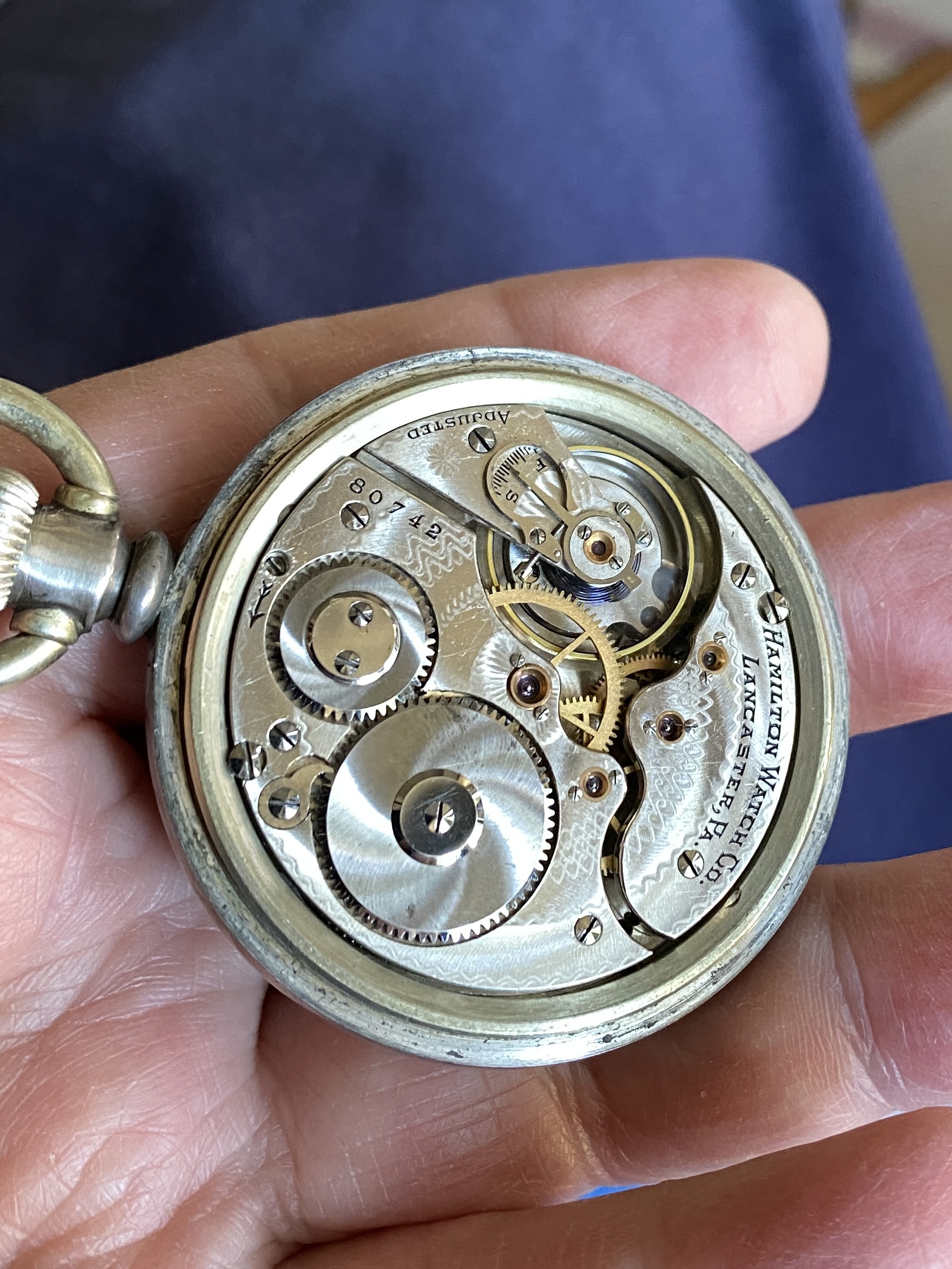 Indeed, a nicely finished movement in a high quality 14-karat gold case, and over all, in very nice condition. The case (to me), almost looks like green gold. I’ve had no luck deciphering the initials on the case back