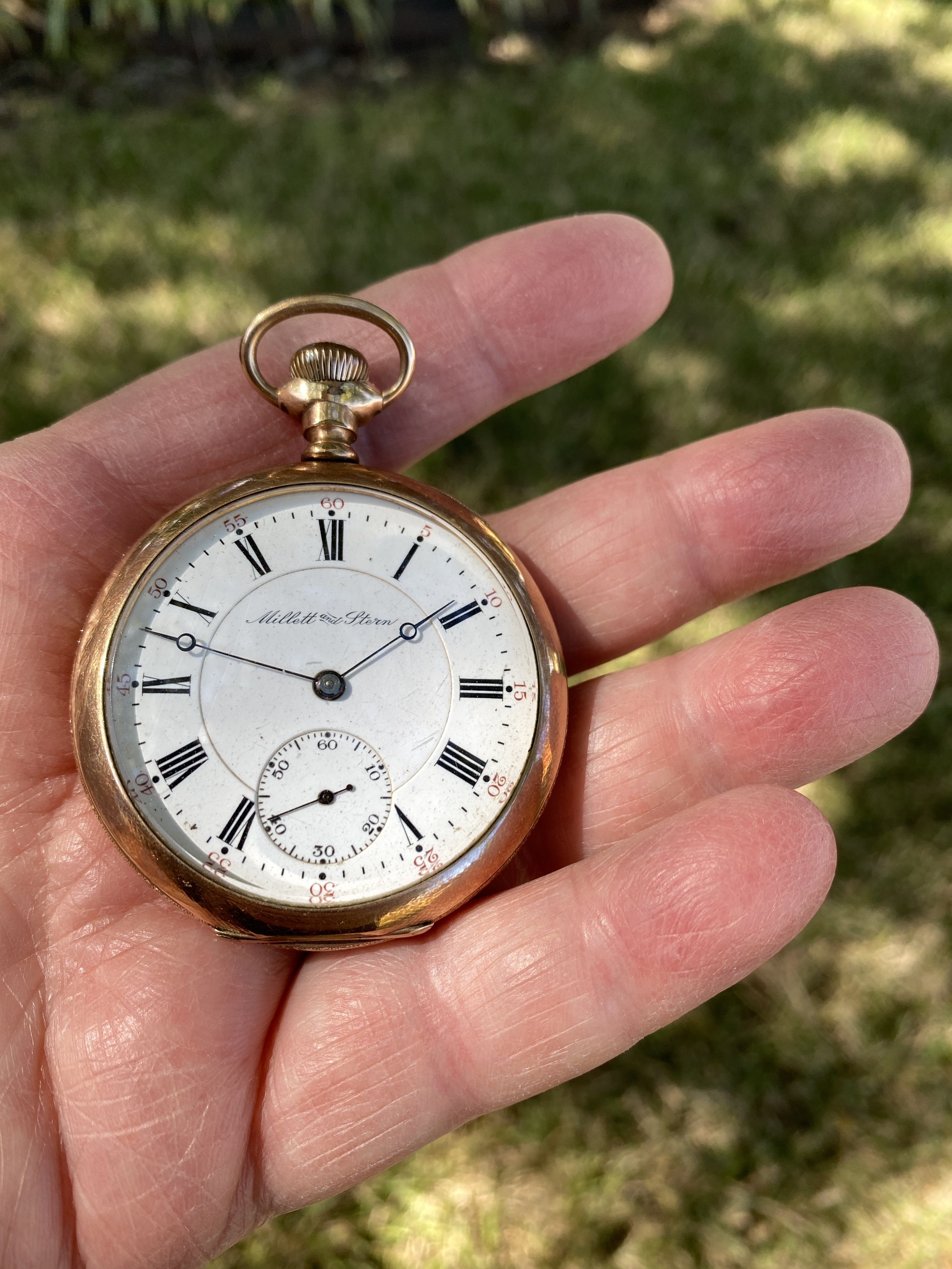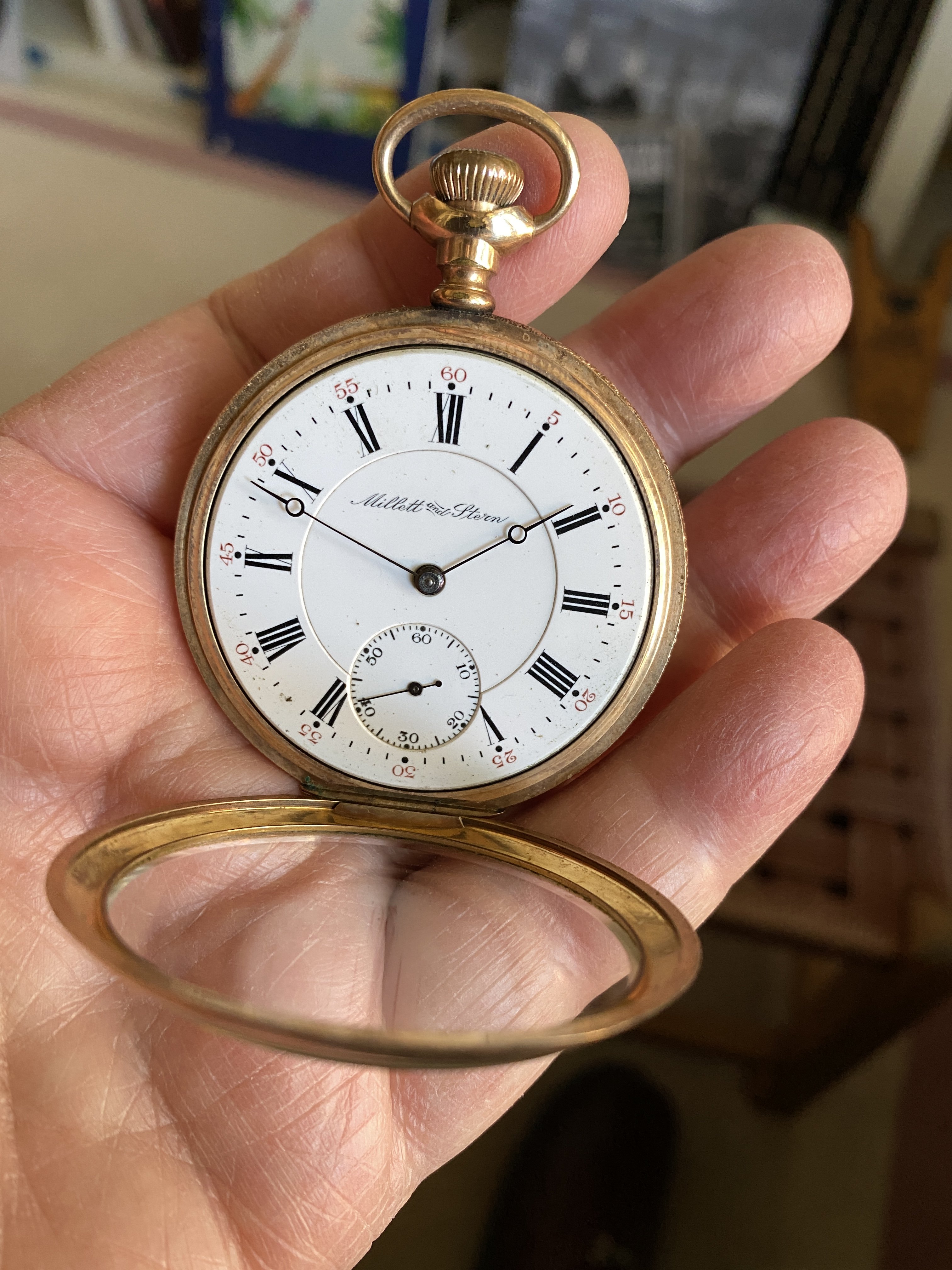 Handsome private label double sunk dial with Roman numerals and a nicely scripted, "Millet and Stern"