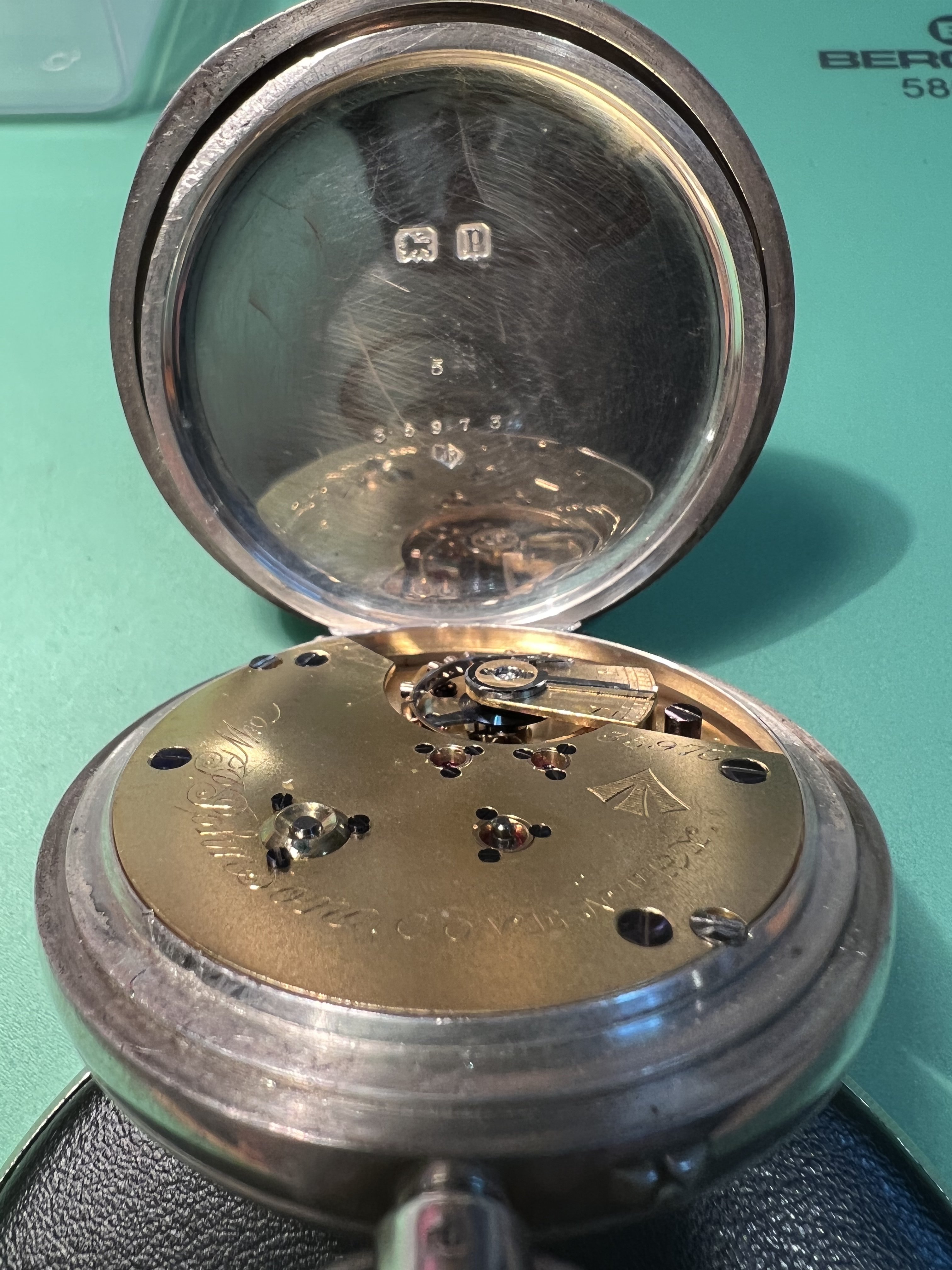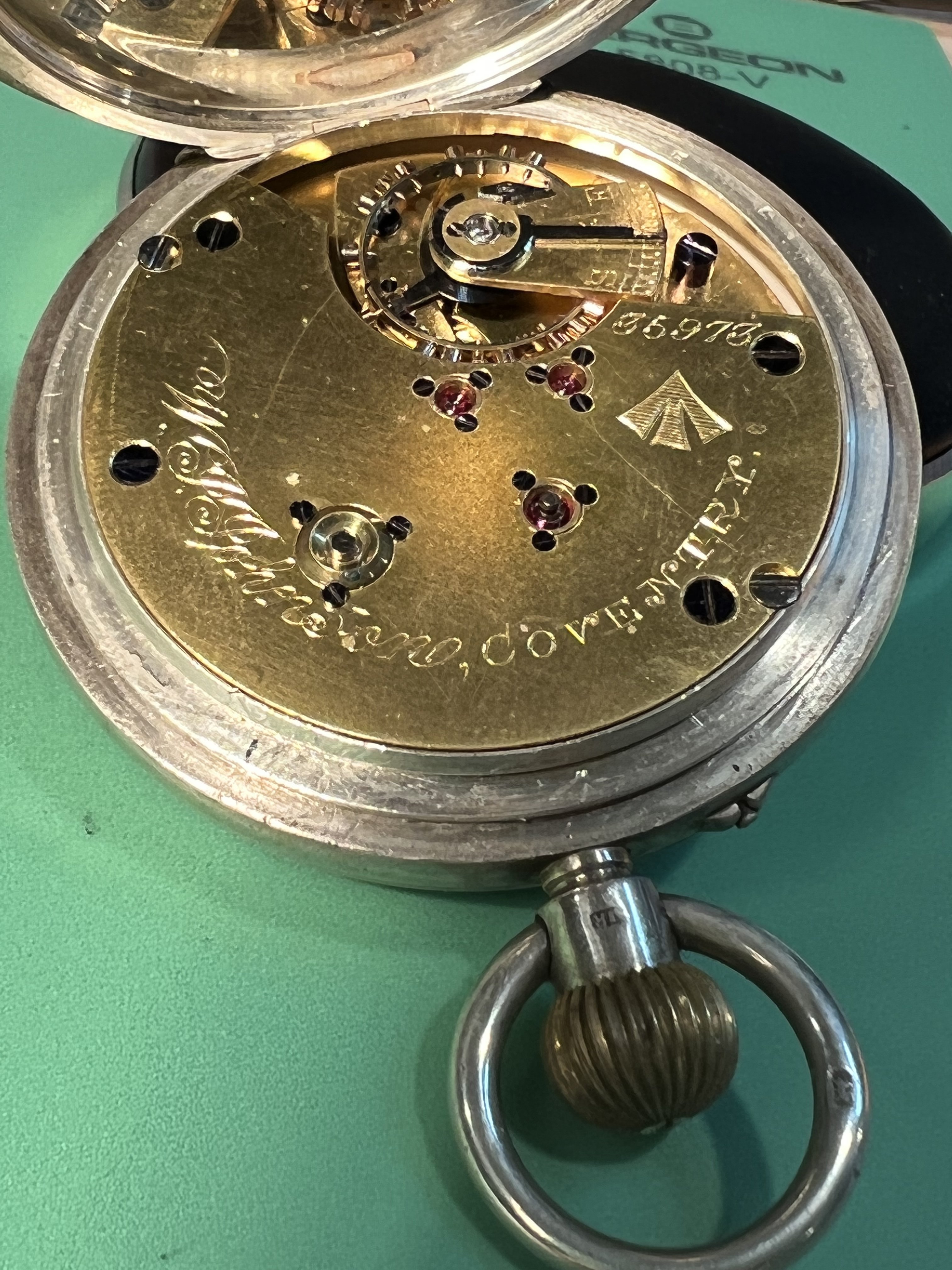 According to Phillip Priestley in his treatise on English watch case makers, the case on your watch was made by Joseph Radges (reg’d March of 1865), of 11 & 14, Summerland House, Butts, Coventry. Very often pocket watches of that era that have a centre sweep seconds hand, have a hack mechanism that allows the balance wheel to be stopped, so the watch can be used as a timer.
