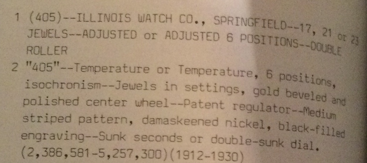 The Meggers & Ehrhardt “Blue Book” lists 4801327 as 12-size, medium grade, pendant set, double roller, gold beveled and polished centre wheel, adjusted to temperature, 6 positions, isochronism, medium striped pattern, nickel plates, jewels in settings, patent regulator, black filled engraving open faced model 3, grade 405. The grade 405 was Illinois’ highest production 12-size grade with over 400,000 produced. Also seen engraved with “Autocrat”. The grade 405 was extensively used in private label watches.