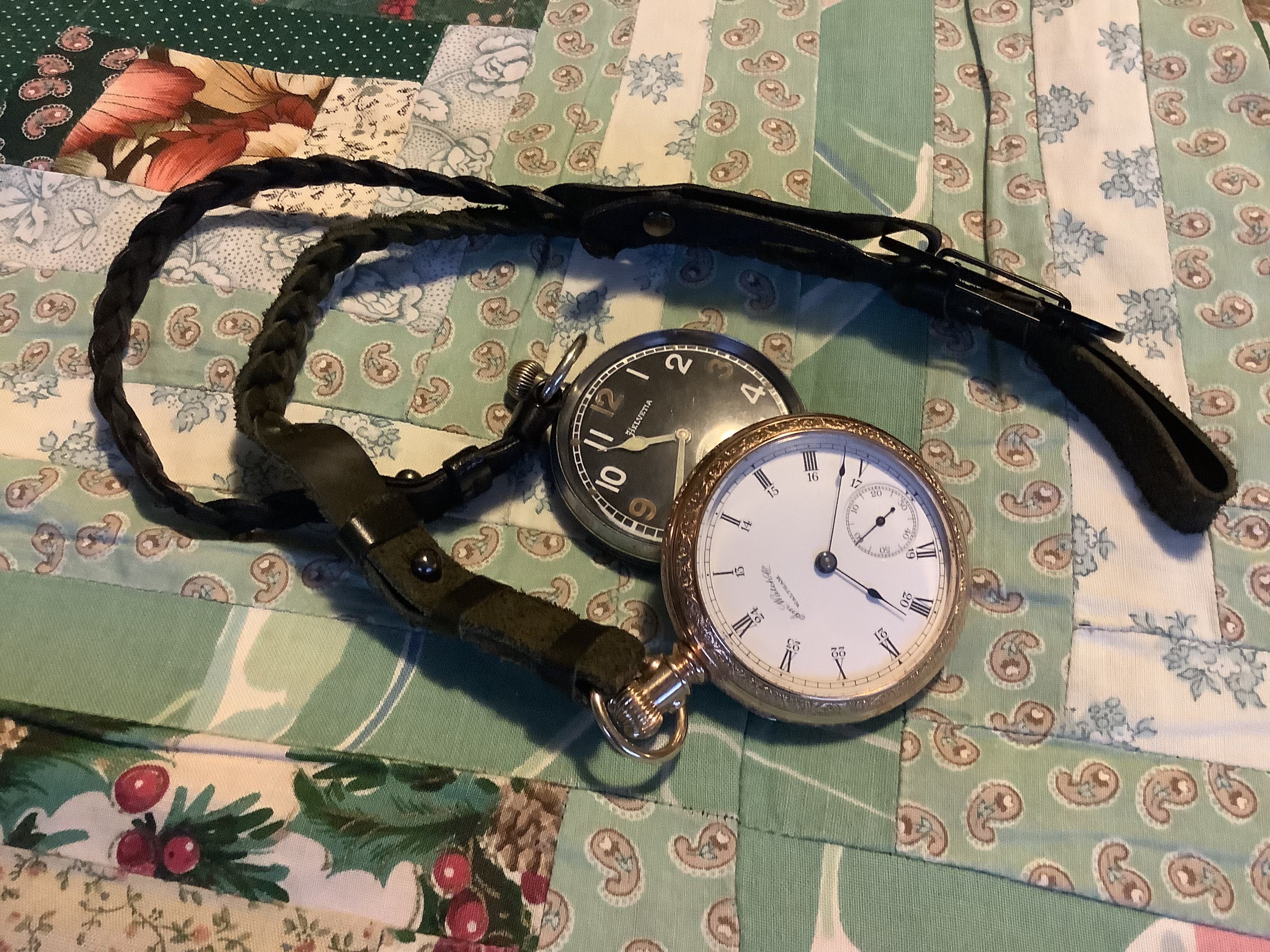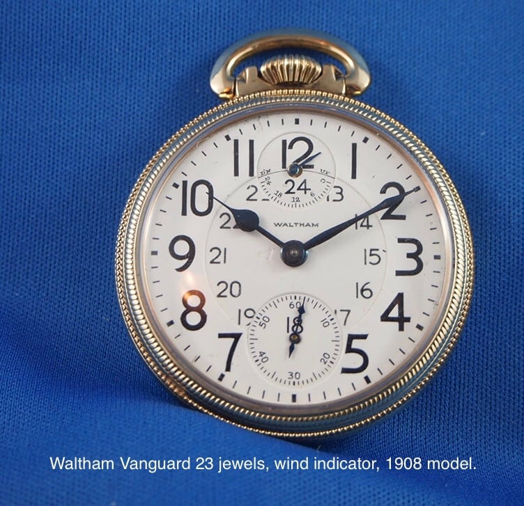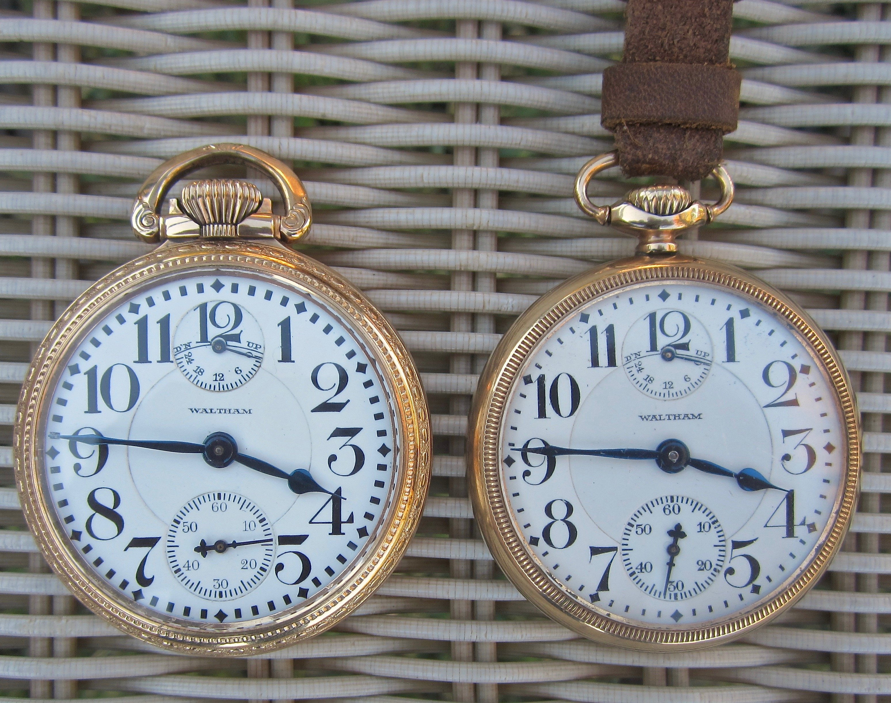 Well, even neophyte pocket watch aficionados like me can field a couple of Waltham wind indicators, a Vanguard (left), and a Crescent Street (right). I'll just stick 'em up here again.