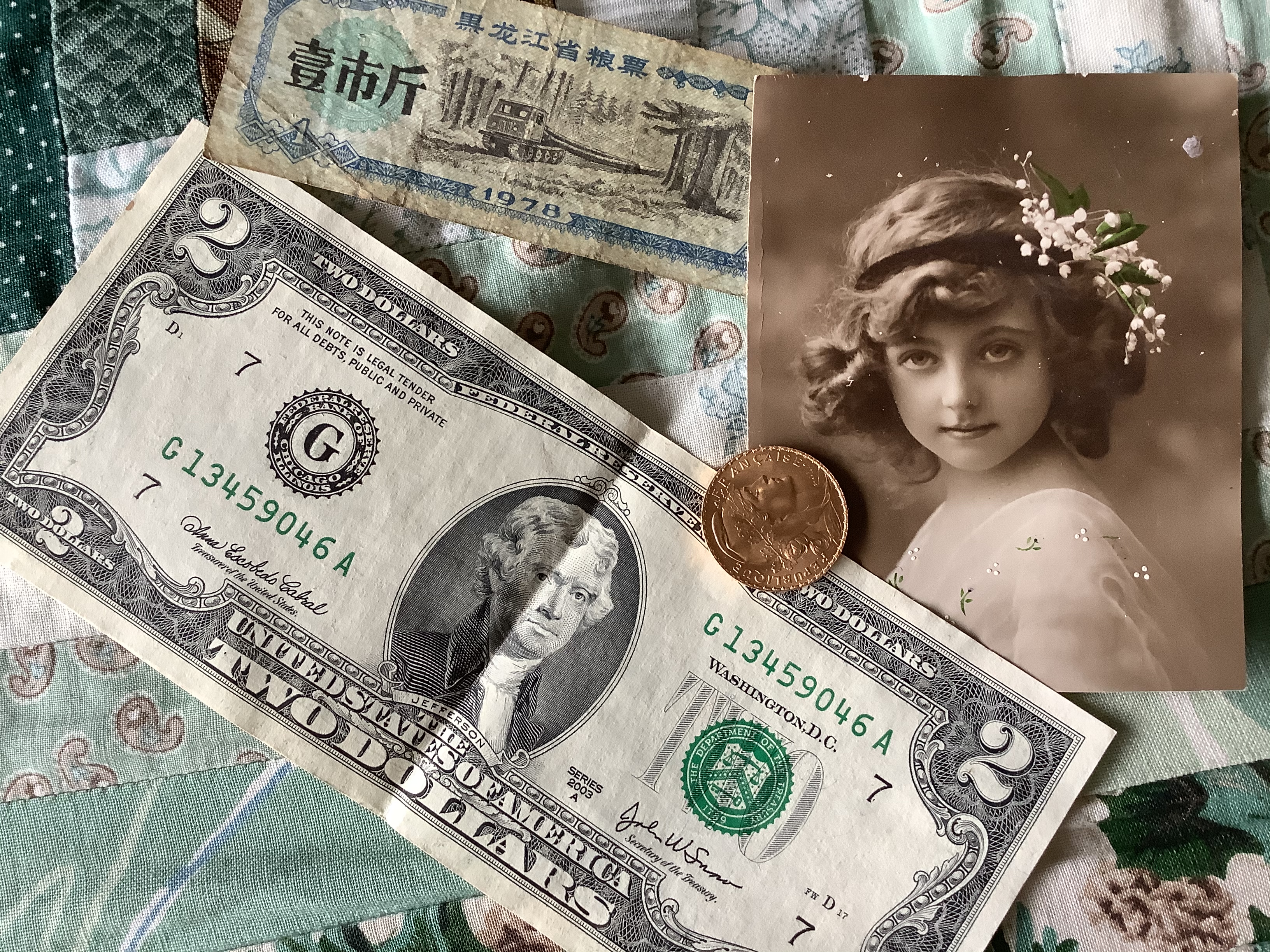 no idea why I have an American two dollar bill, who the little girl is or what that tiny piece of paper money is, I am pleased to have found the French coin though as it is a Marianne and worth somewhat more than the 20 francs its marked as.