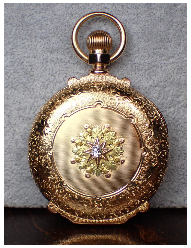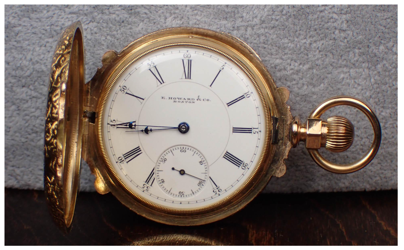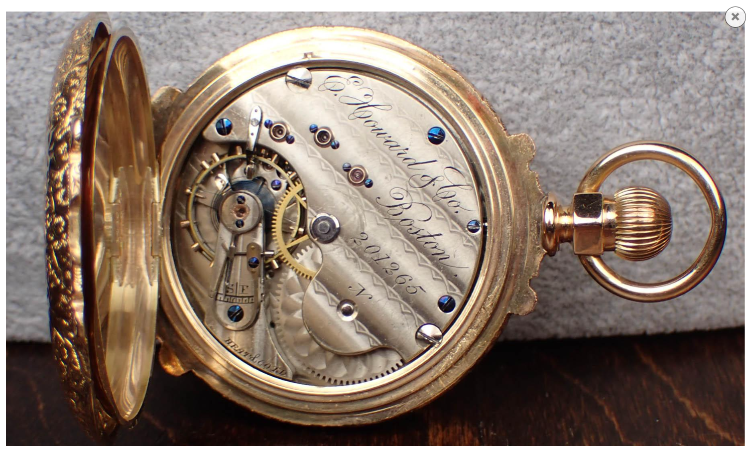In his book on the E Howard & Co. watches, Colonel Townsend lists this “N” size Howard S# 201265 as being a VII th model. This was not a designation given by Edward Howard. E Howard watches were almost entirely individually produced by one workman. Howard made no secret of the fact that interchangeability of parts was not his priority. There are differences from model to model which are obviously different. I have shown a picture of my (only) E Howard watch (S# 219761) which is also an N size, VII th model. The pinning point for the hairspring stud is on the balance cock, not a separate “bib” attached to the bridge over the train wheels. Howard had a system of designating the grade of his movements. The “hound” grade had a hound engraved on the train bridge, and it was “unadjusted”. Next was the”horse” grade which was adjusted for heat and cold. Then there was the “stag” grade which was adjusted to heat, cold, and 6 positions. The hound, horse, or stag was usually engraved on the bridge over the train wheels. The watch posted by @WestCoastTime doesn’t have the grade designated on the movement. Notice on the image of my E Howard, the “stag” (denoting the highest grade) is engraved on the plates. Notice the subject watch doesn’t have the grade designation marked, but it is engraved Heat & Cold which indicates to me that it must be a “horse” (mid range) grade of movement. My “stag” grade example is marked adjusted. Interesting differences from watch to watch was common with E Howard watches. Beautiful four colour gold (likely karat gold) case!