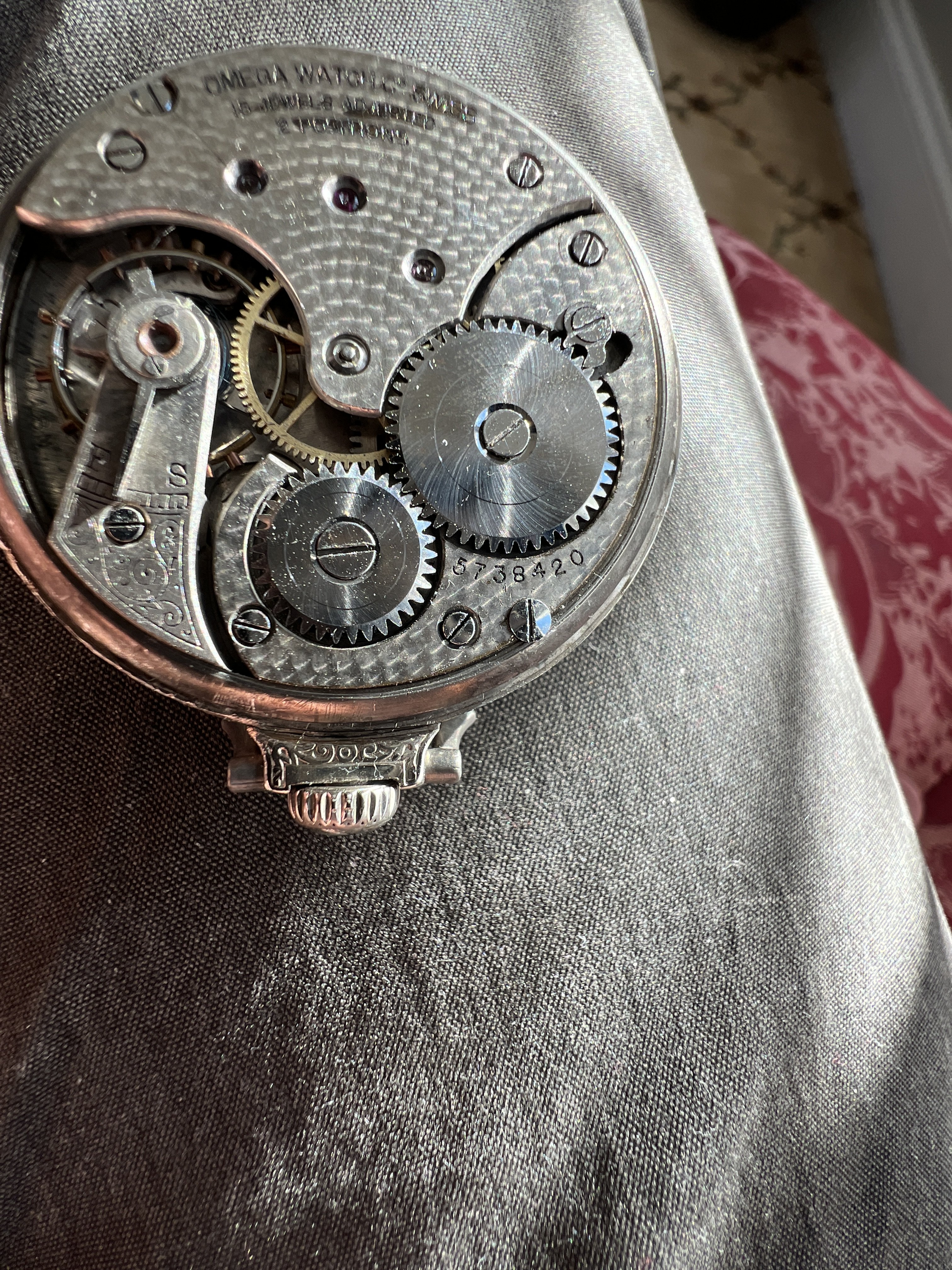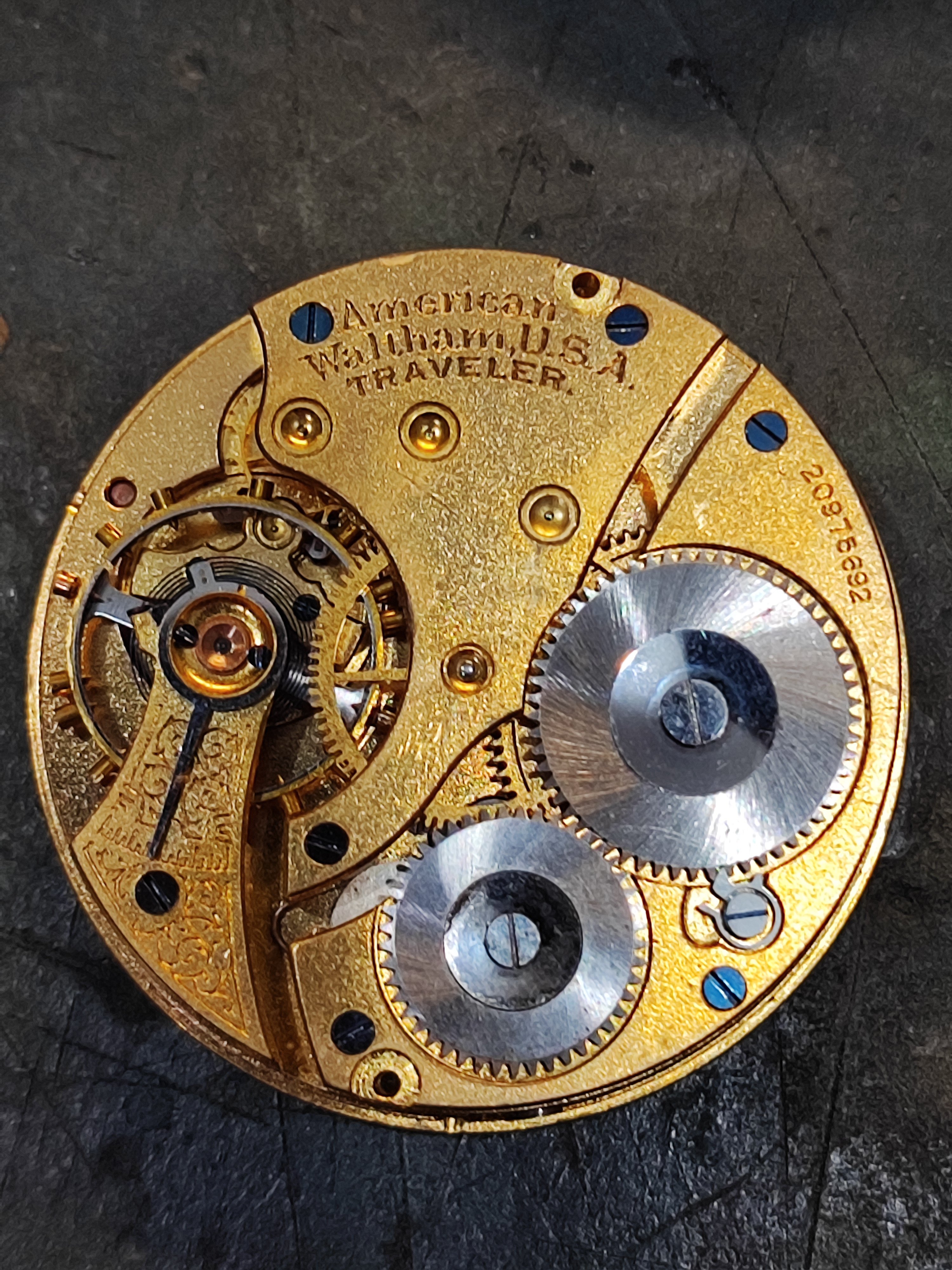 This preamble leads to discussion of the subject watch. Recently, one of the local watch repair fraternity called me, asking for help. He had a “Washington” watch for which he had been unable to locate a new balance staff. Why? Because there never was a “Washington” watch. The name was a house brand name for Illinois watches as sold by the U S Department store chain, Montgomery Ward. This chap asked me if I would make a balance staff for the watch. He sent me the watch. It is a rare 24-jewel, model 5, 18-size Illinois movement, marked on dial and movement, Washington! I had 18-size Illinois balance staffs on hand, but for a different model. The only dimension that was correct on the replacement staff was length, and the hub for the balance wheel. I had to reduce the sizes of the pivots, reduce the size of the roller table portion, and reduce the size of the hairspring collet portion. Job done.