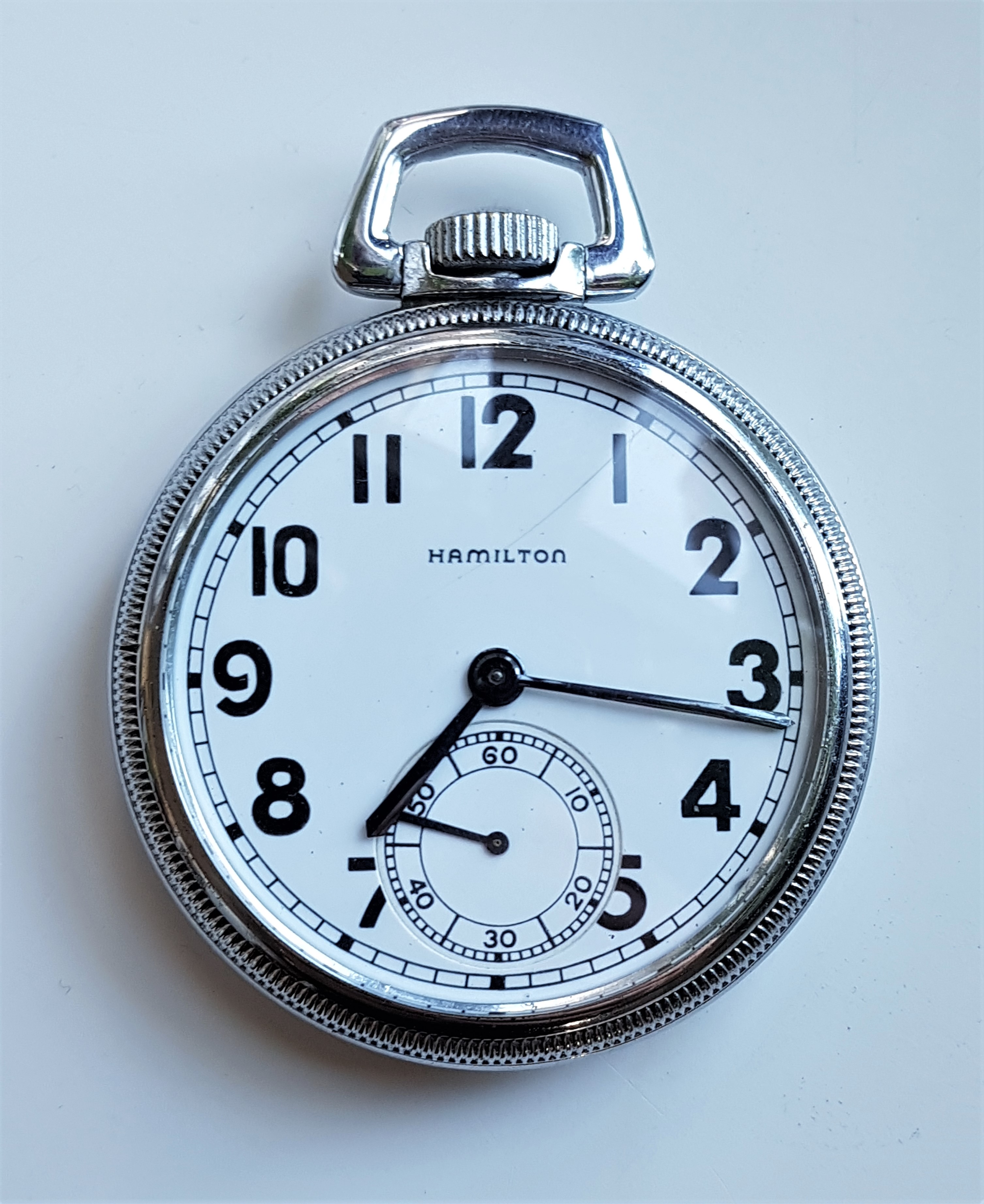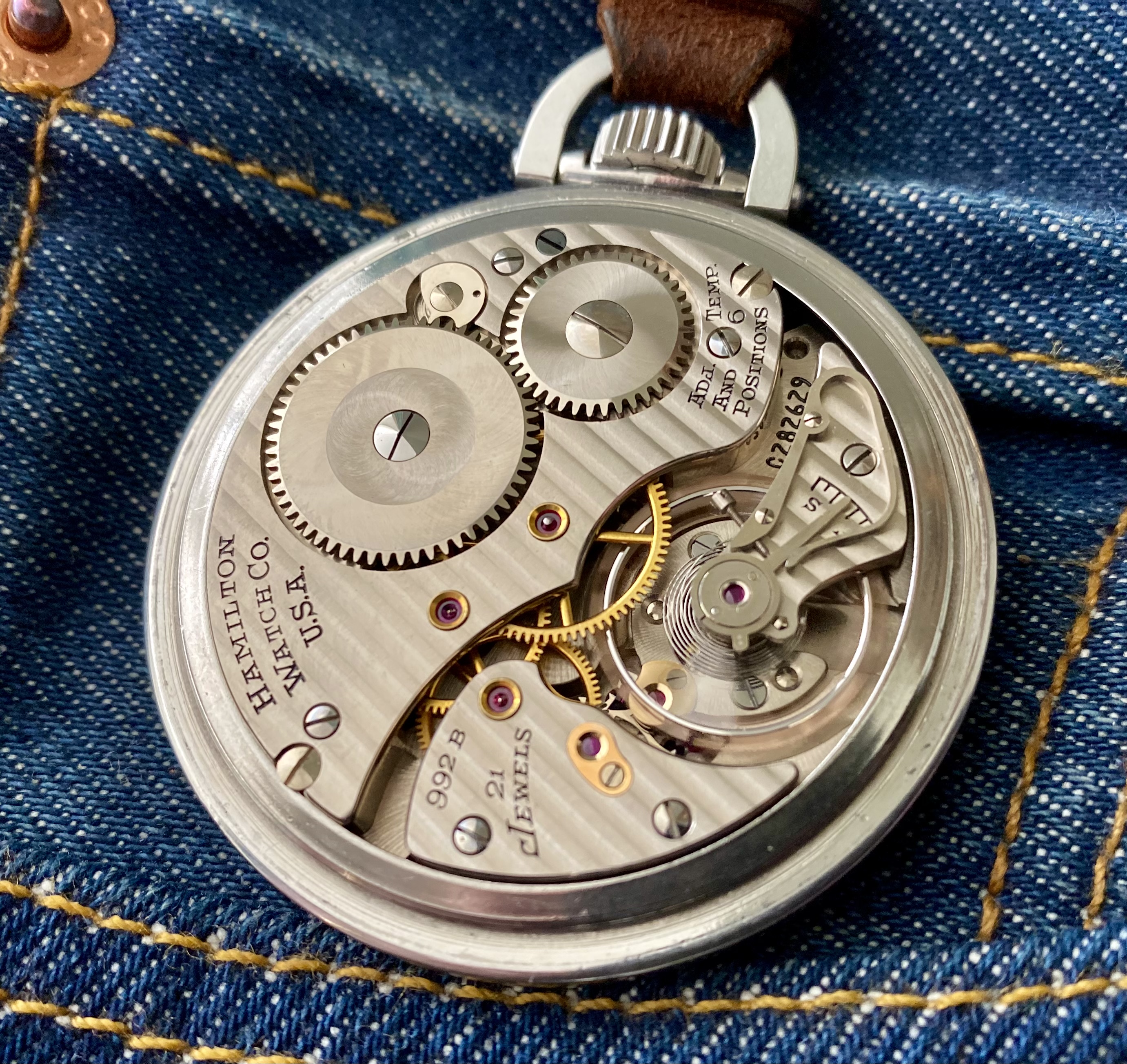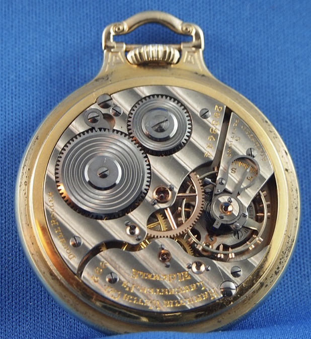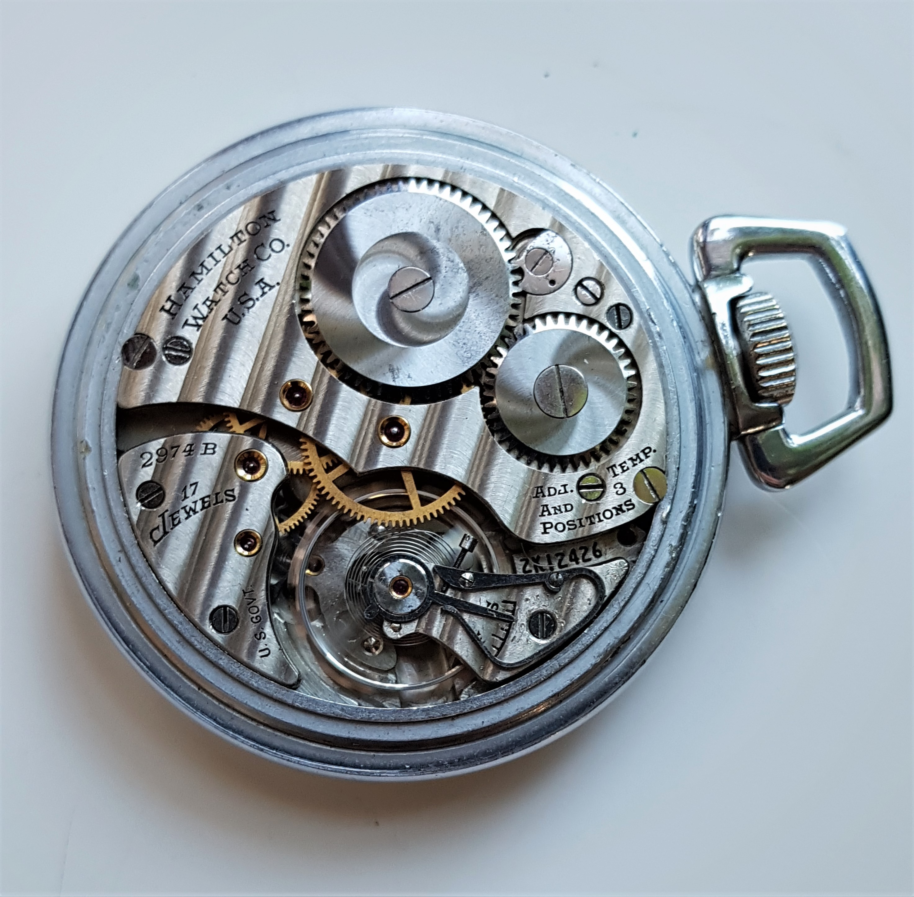 That is the stainless steel case model # 15 from circa 1950. I have its twin. This is the second one of these that I have owned. Maybe 25 years ago, a Canadian Railroad Historic group contacted me that a valued member had retired from his day job, and was leaving their group. They wanted to send him off with a genuine railroad watch to remember them by. They wondered if I had anything I might sell them. I offered the my 992B in the steel model #15 case for $150.00. They weren’t prepared to spend that much! But eventually, they came around, and I sold it to them. I bought the watch at an NAWCC Mart for $75.00 U S, but it had a broken balance staff. I fixed it up.