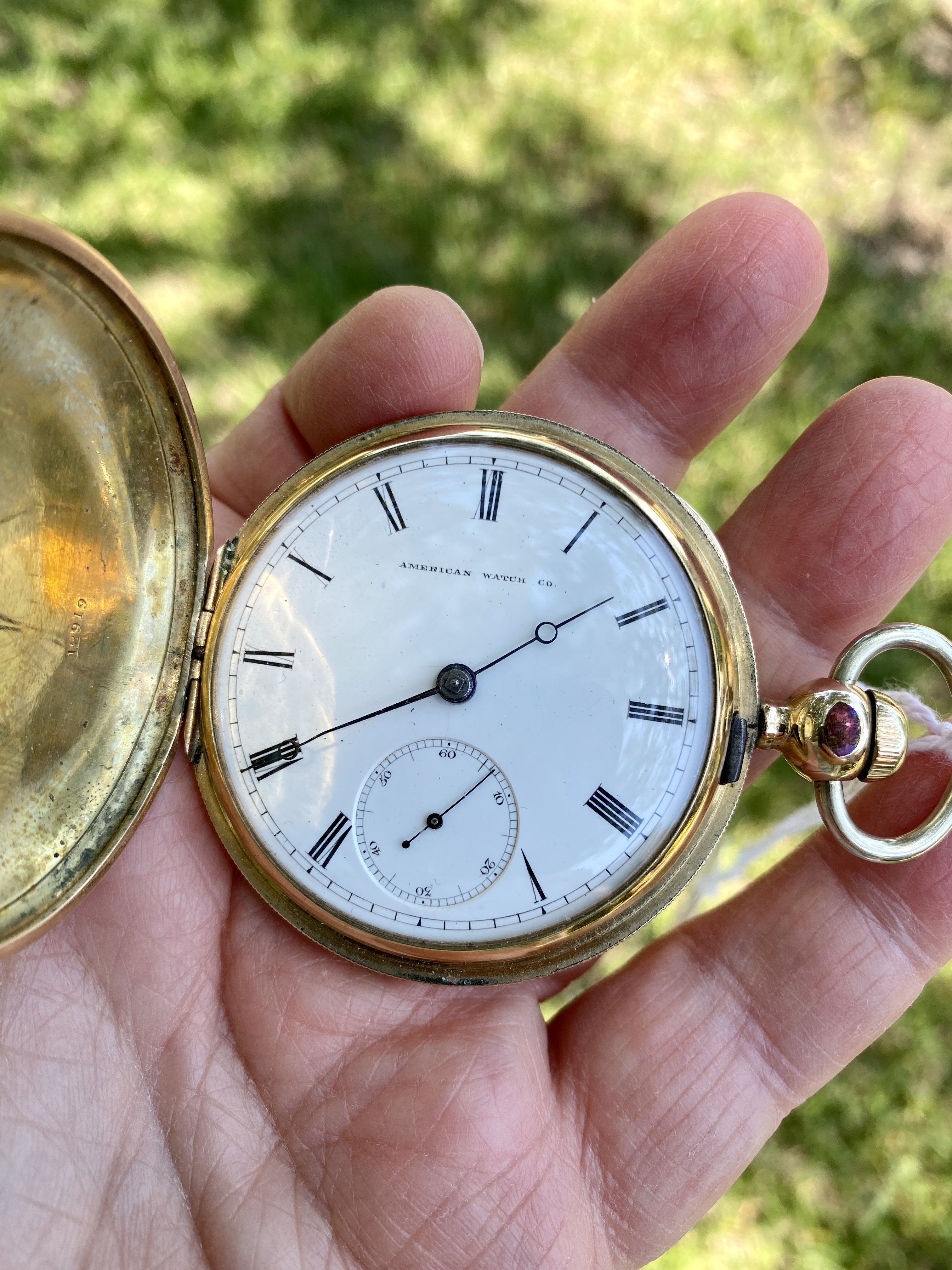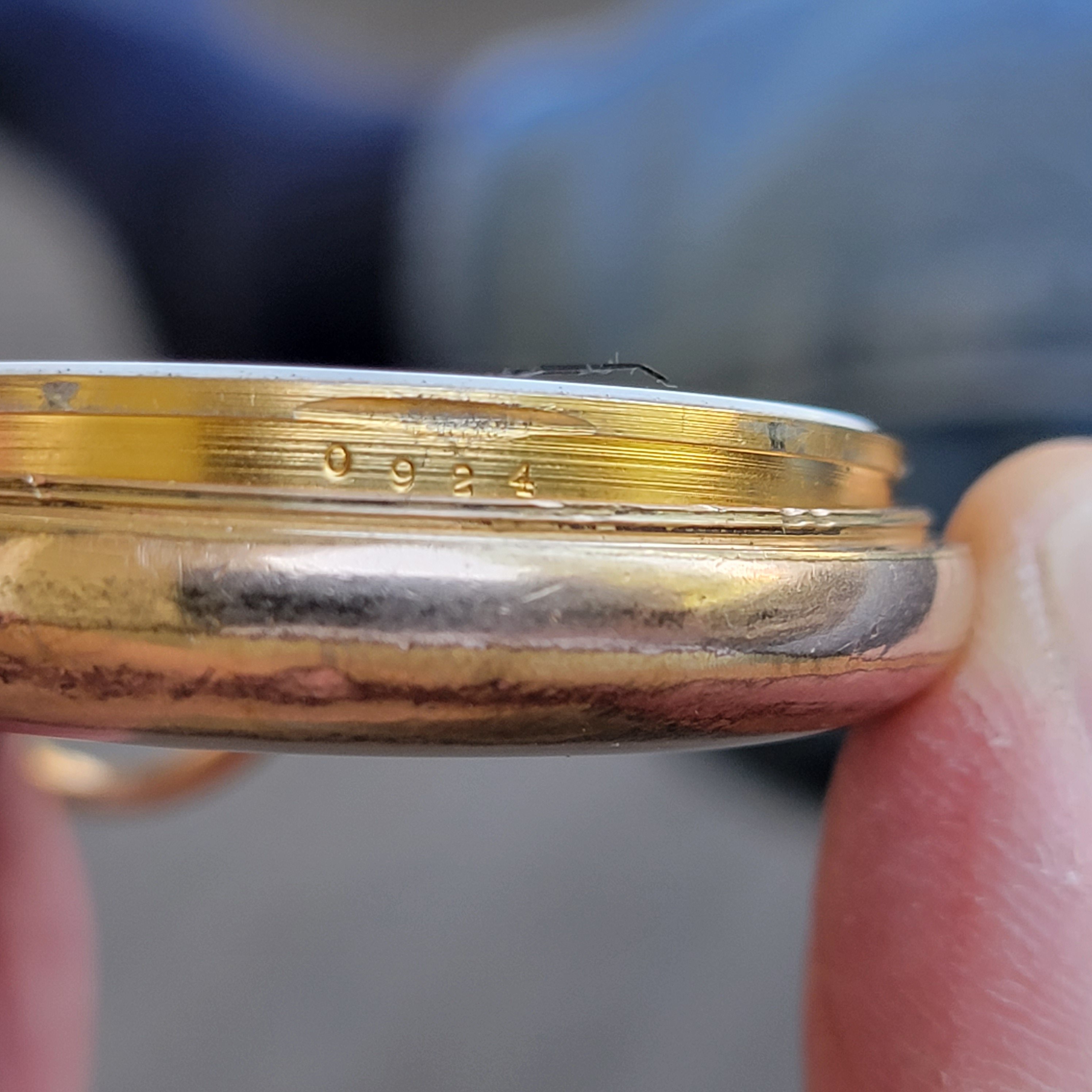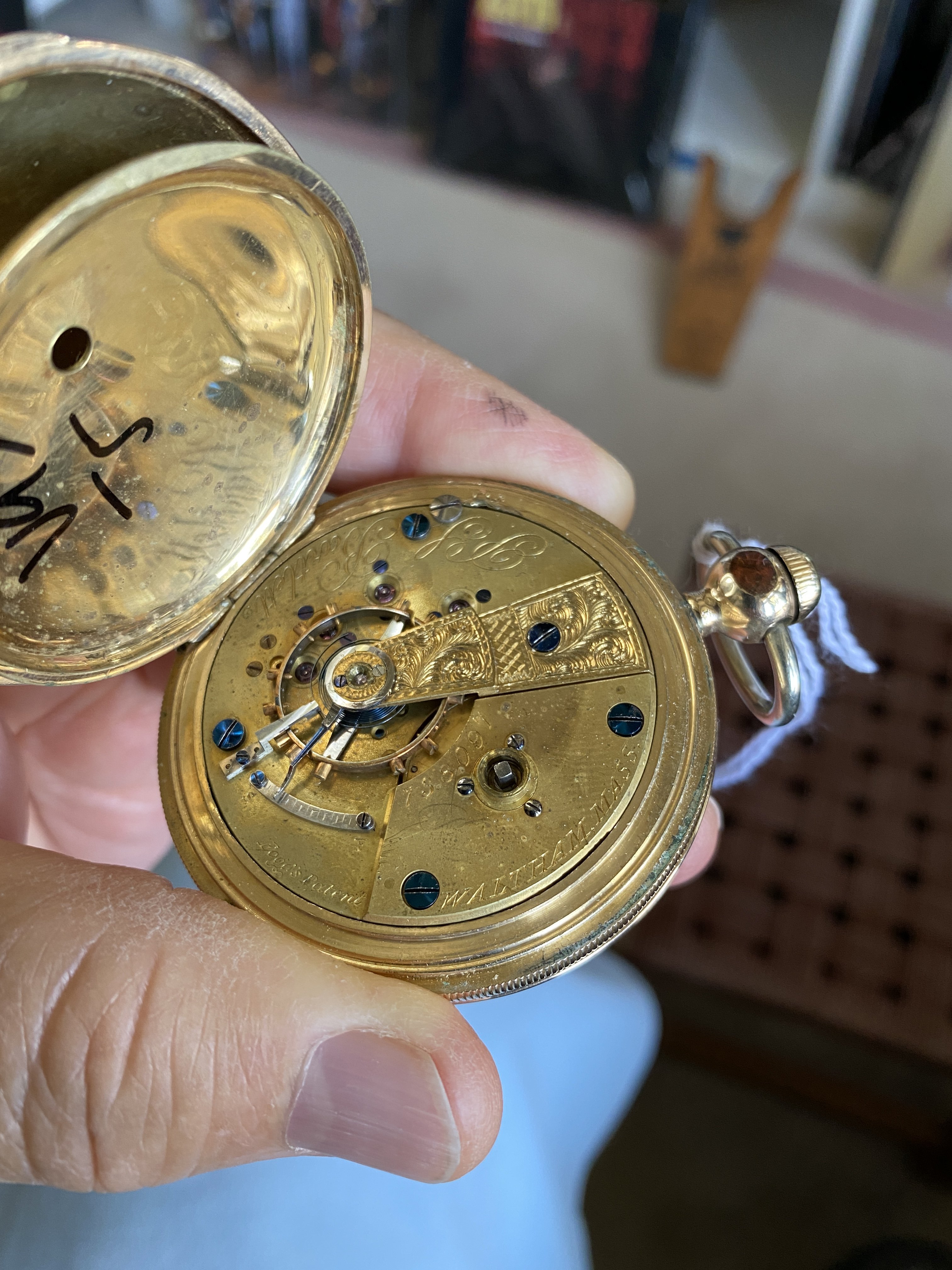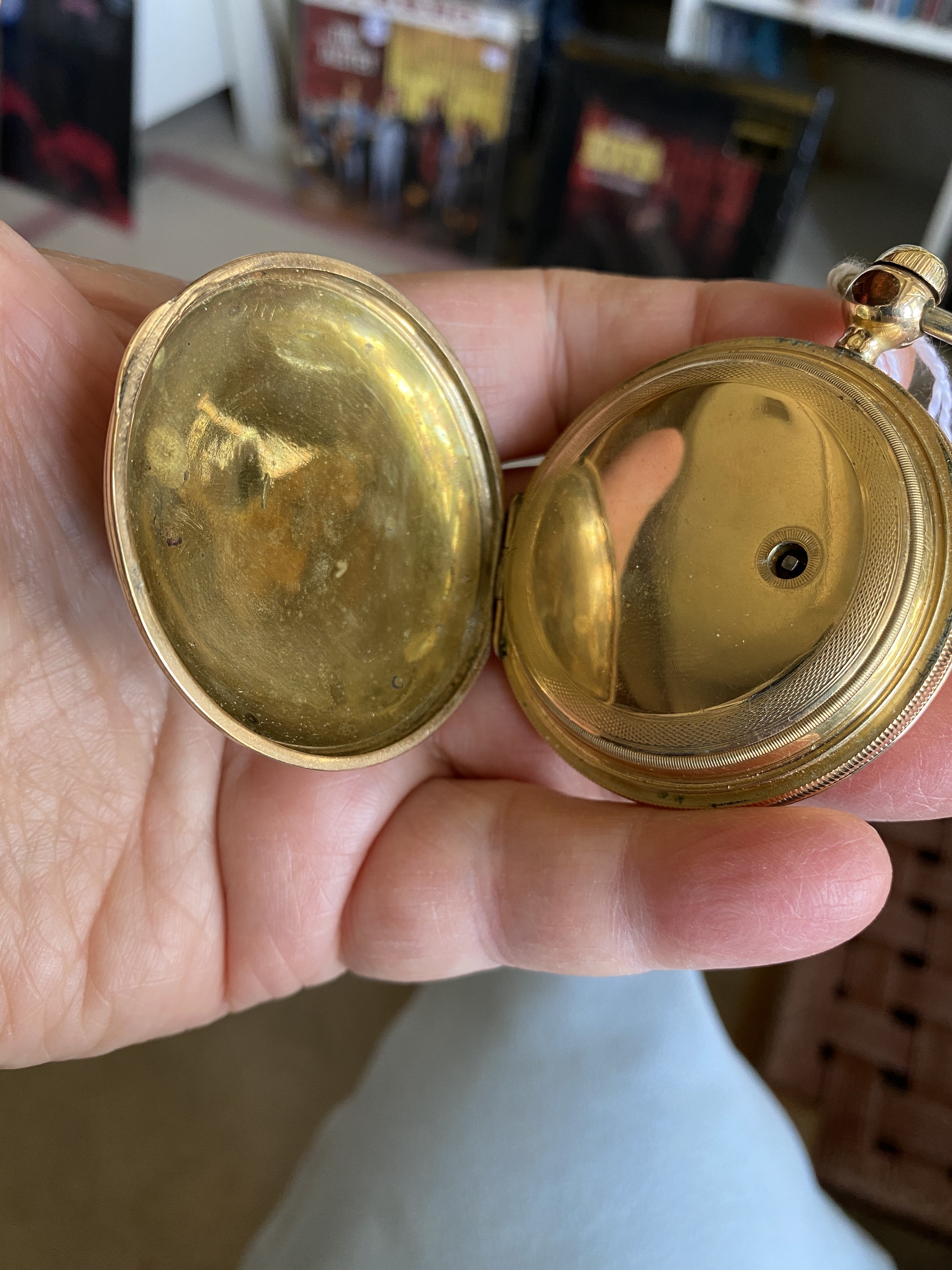 hunter case, one with a cover on both the front of the case, and the back. I think I see a mark on the flange on the inner lip of the case, around the movement, that indicates an alien case screw mark from a previous tenant. The colour of the case has a pink tone which is characteristic of a lot of English made cases.