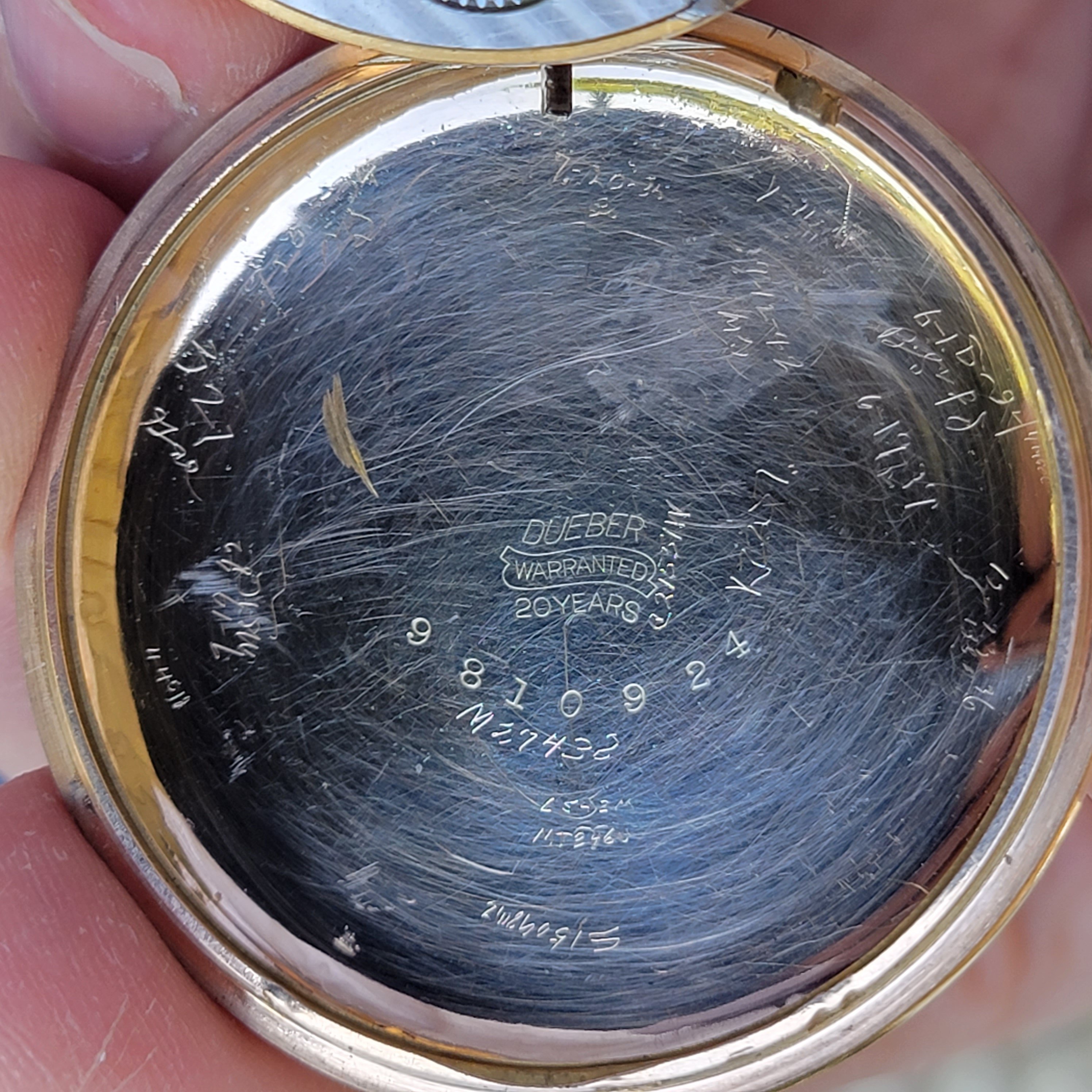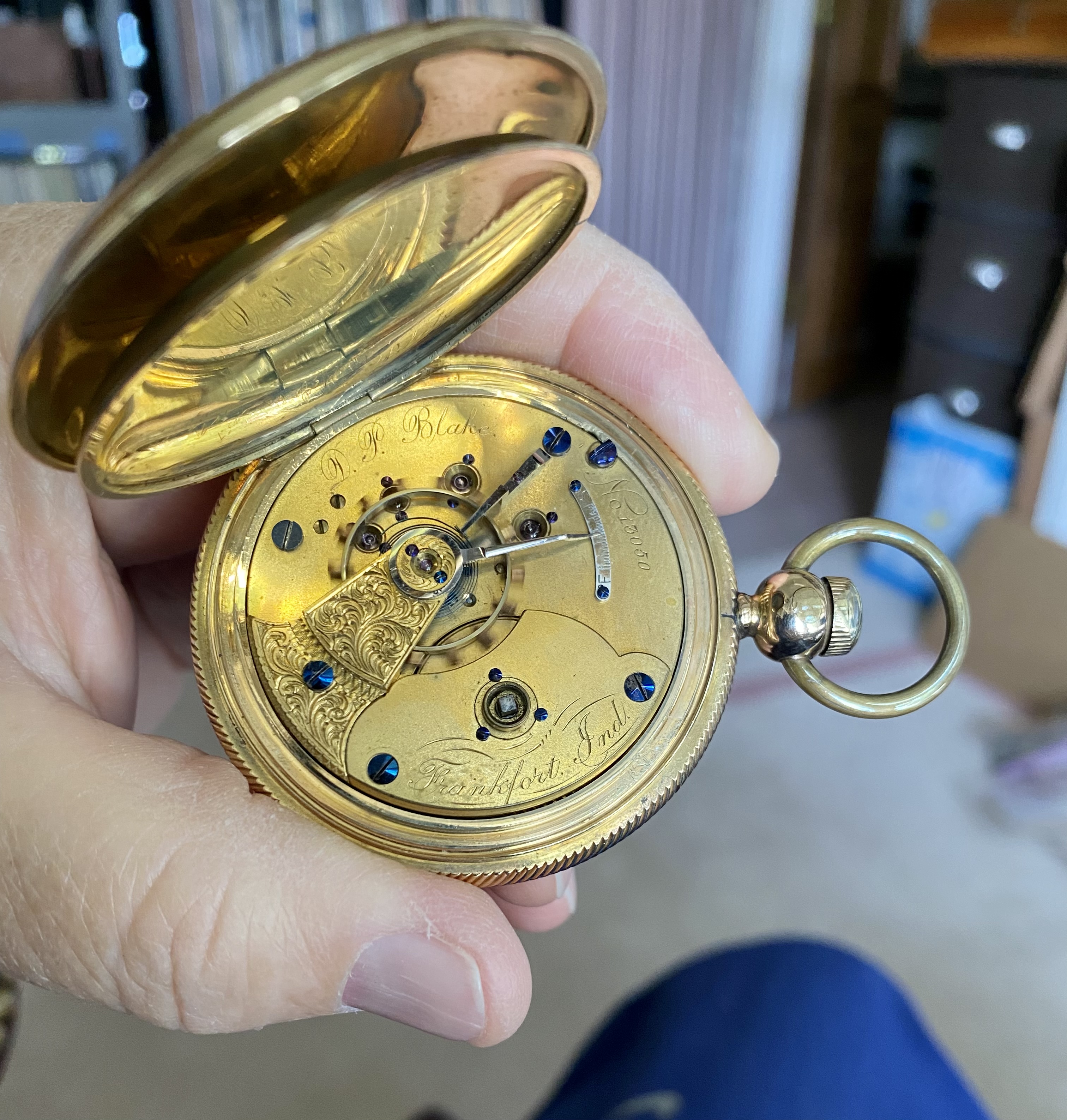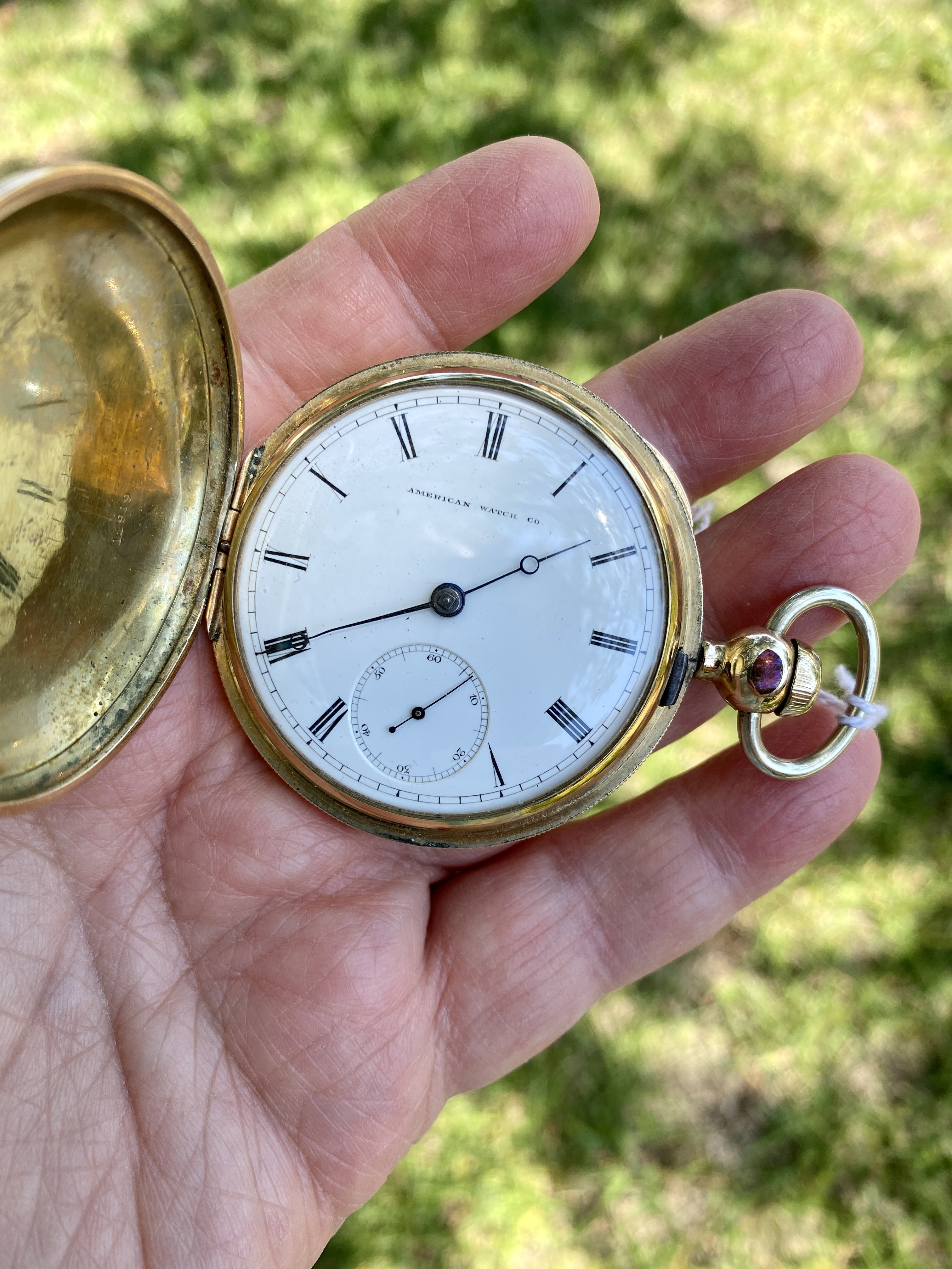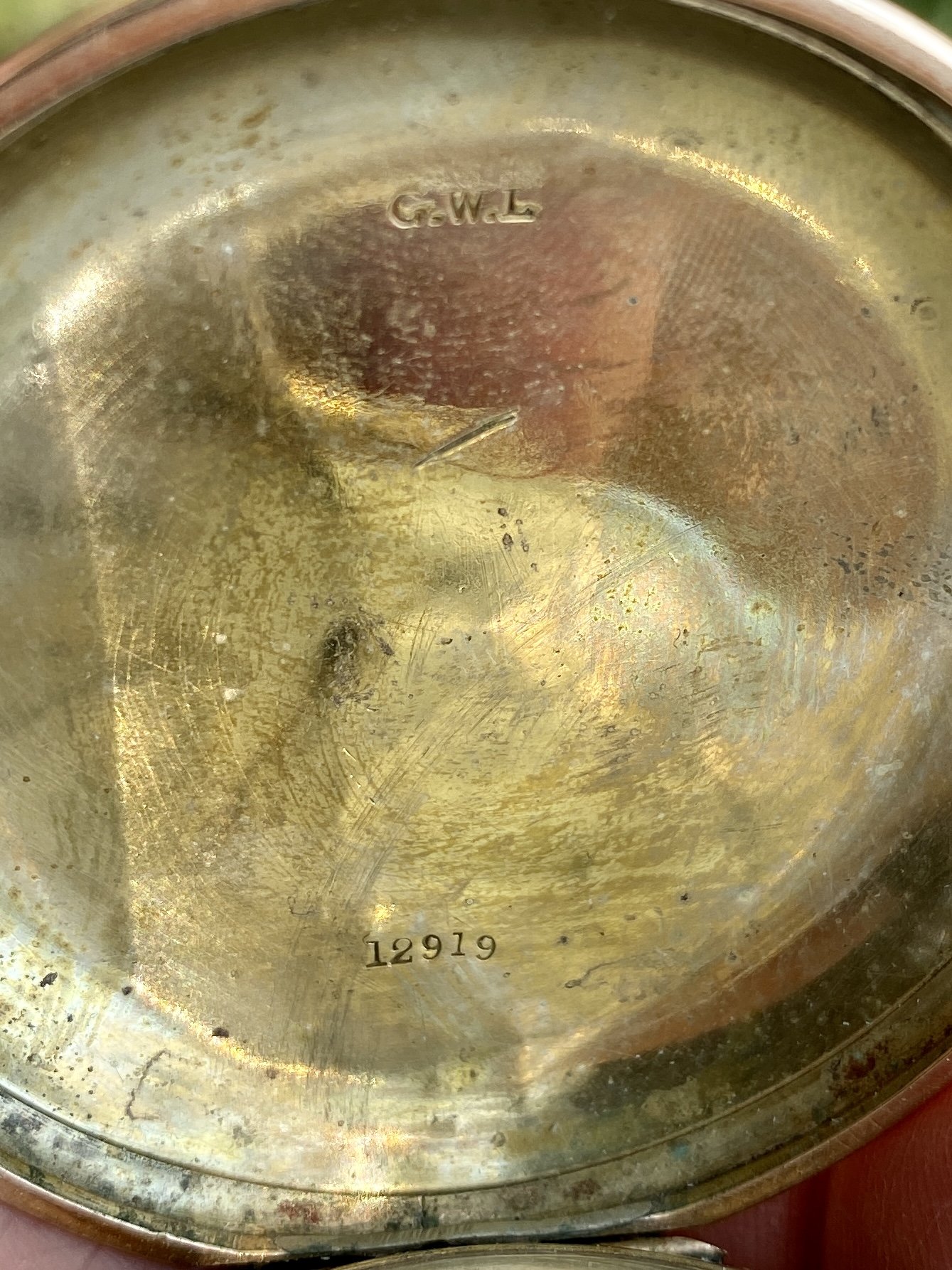 hunter case, one with a cover on both the front of the case, and the back. I think I see a mark on the flange on the inner lip of the case, around the movement, that indicates an alien case screw mark from a previous tenant. The colour of the case has a pink tone which is characteristic of a lot of English made cases.