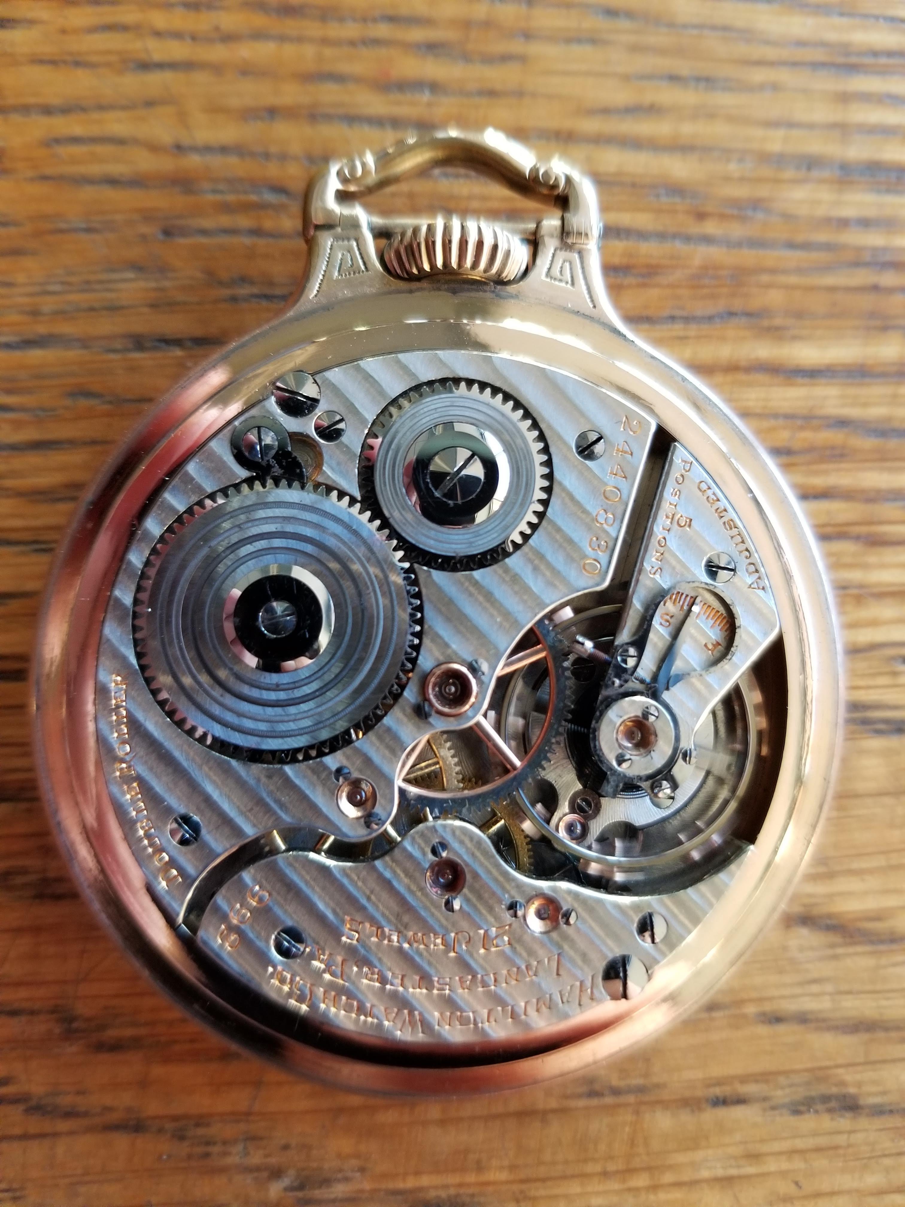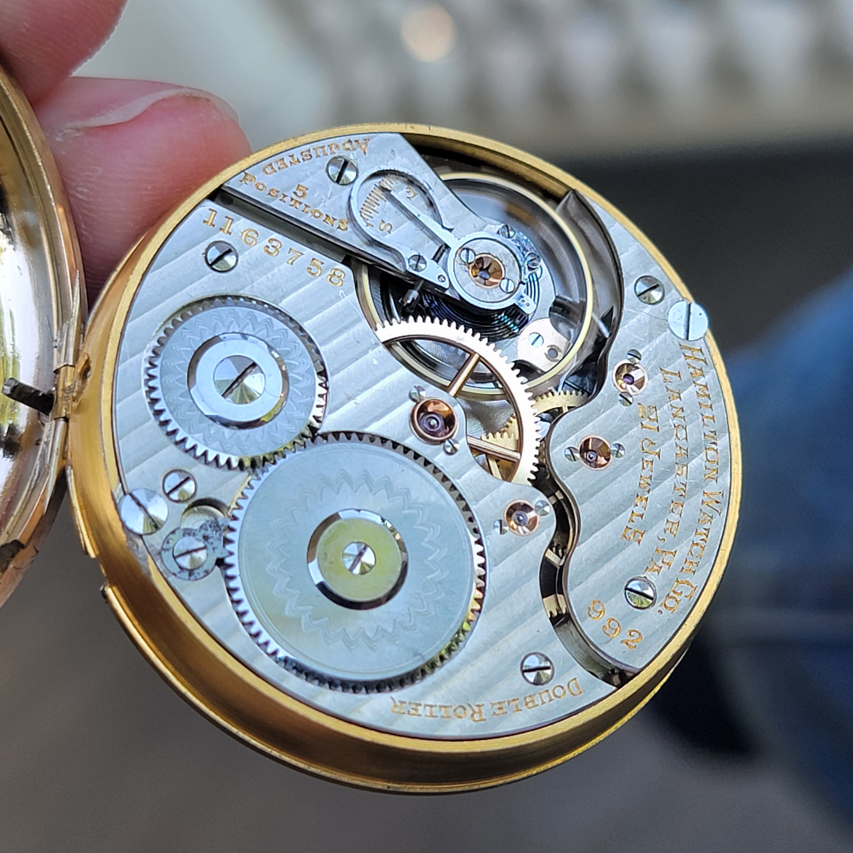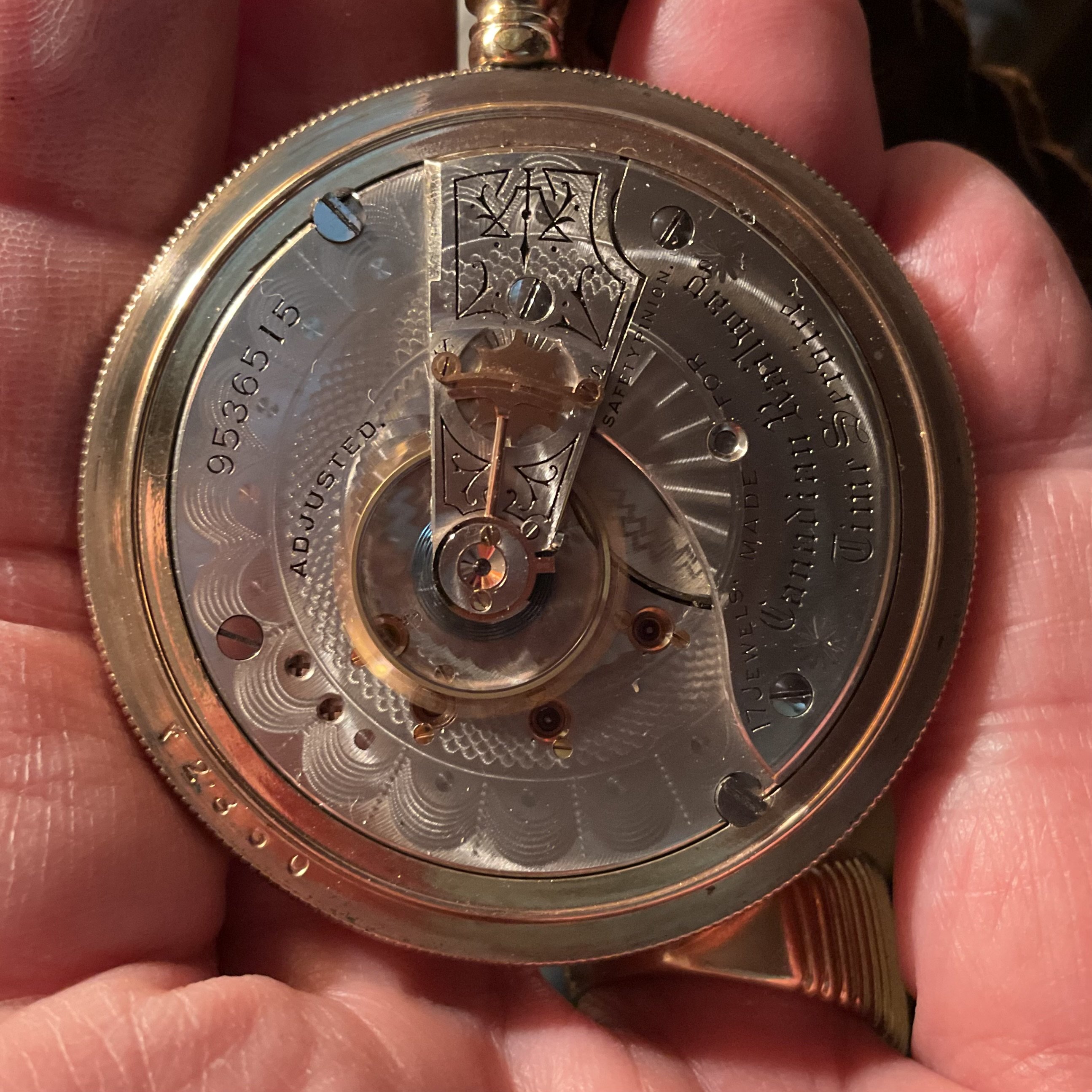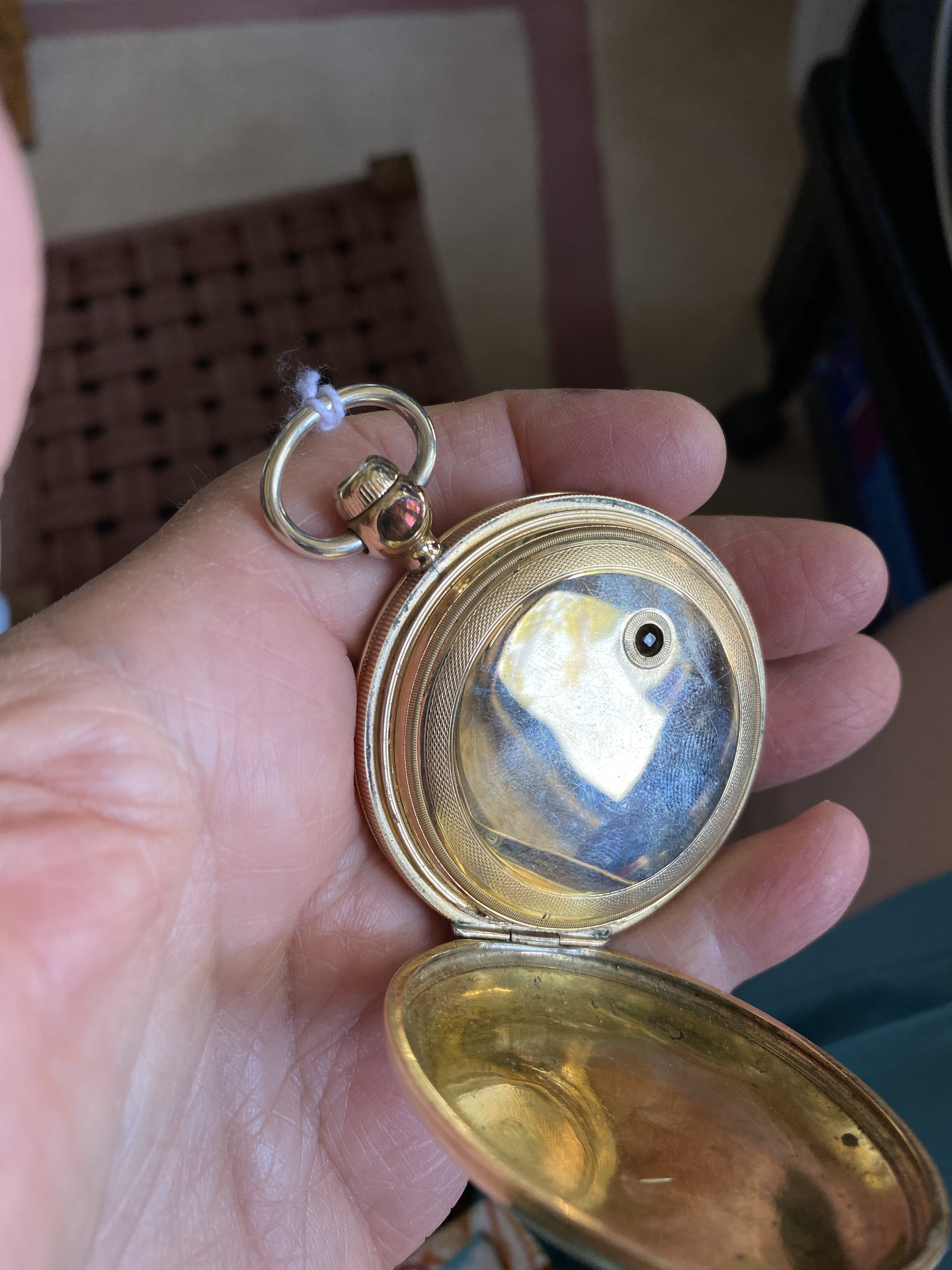hunter case, one with a cover on both the front of the case, and the back. I think I see a mark on the flange on the inner lip of the case, around the movement, that indicates an alien case screw mark from a previous tenant. The colour of the case has a pink tone which is characteristic of a lot of English made cases.