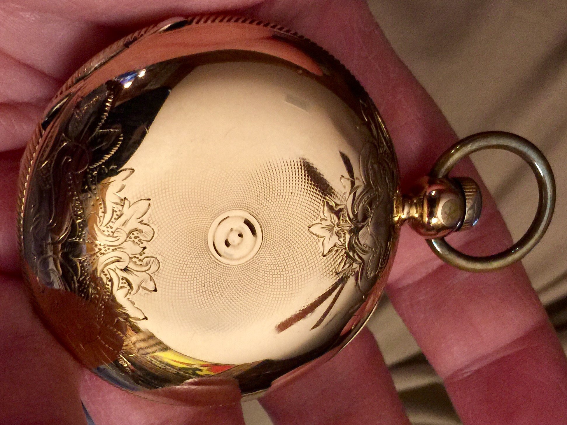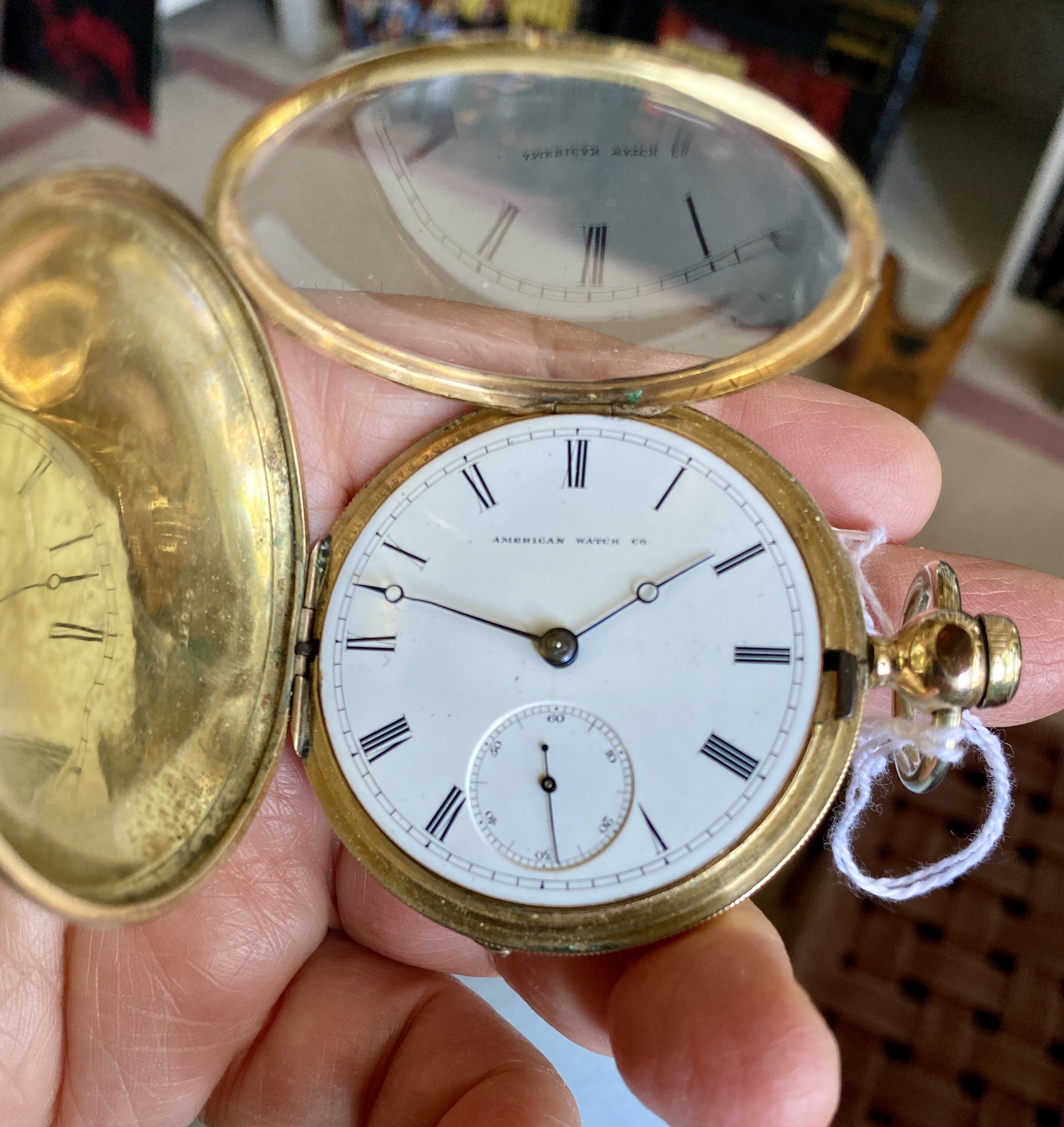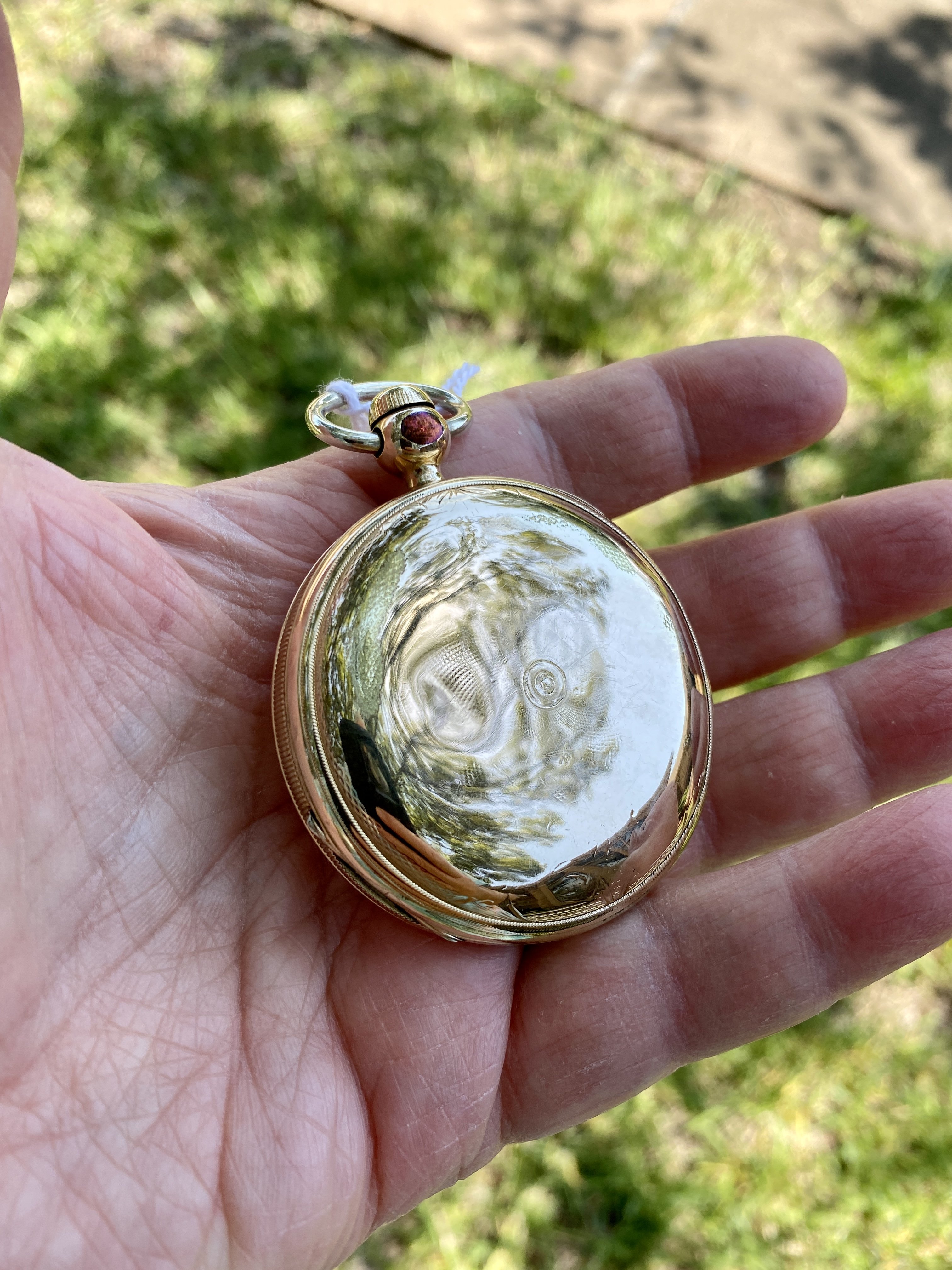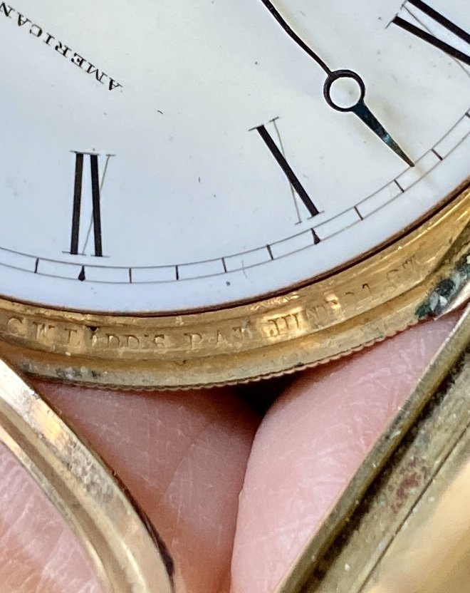 Since you posted the pocketwatchdatabase info on your watch, it confirms that the movement is an 1888 model, made for a hunter case (not an open faced case). If I am correct about this being an English case (with an American movement), this was done to beat English import duties at the time.
