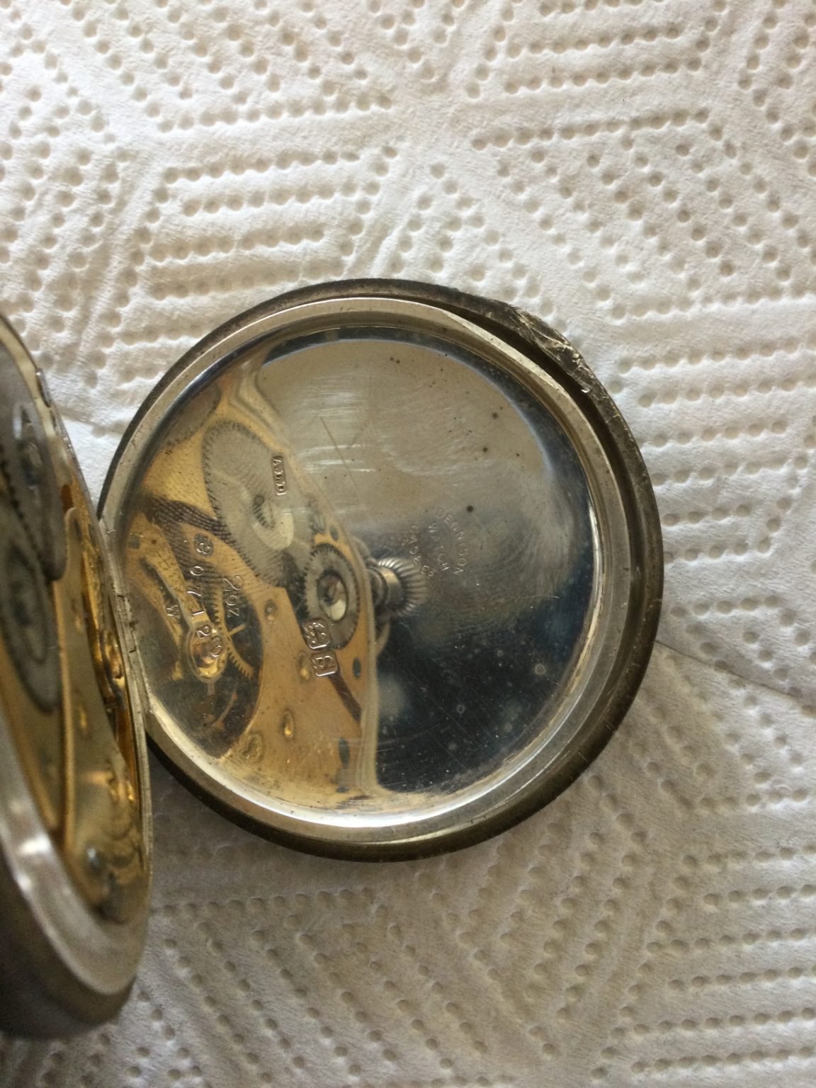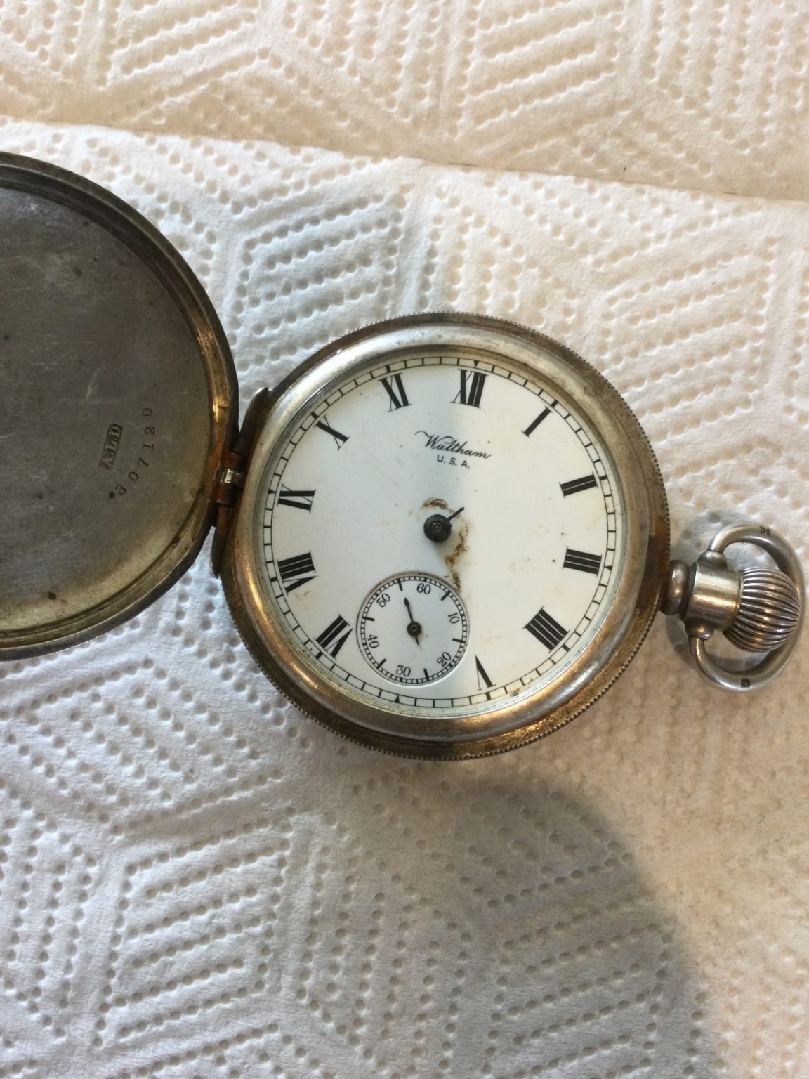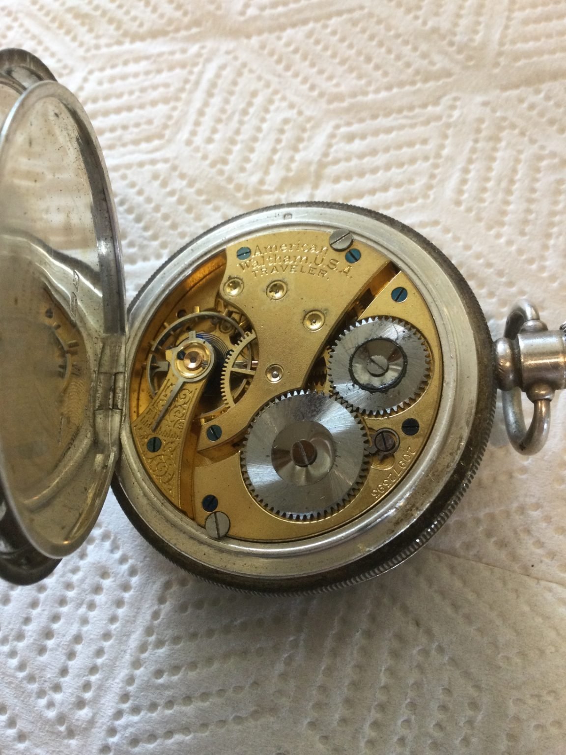 Badly sprung hinge on the front cover. Let us know how you make out with that problem. The movement will come in handy as a donor for future projects. The dial likewise. It should clean up. The Traveller grade name is typical of a Waltham movement sold (usually) in England. The trade mark A L D is Aaron Lufkin Dennison, a founder of the Waltham company who resided in England.
