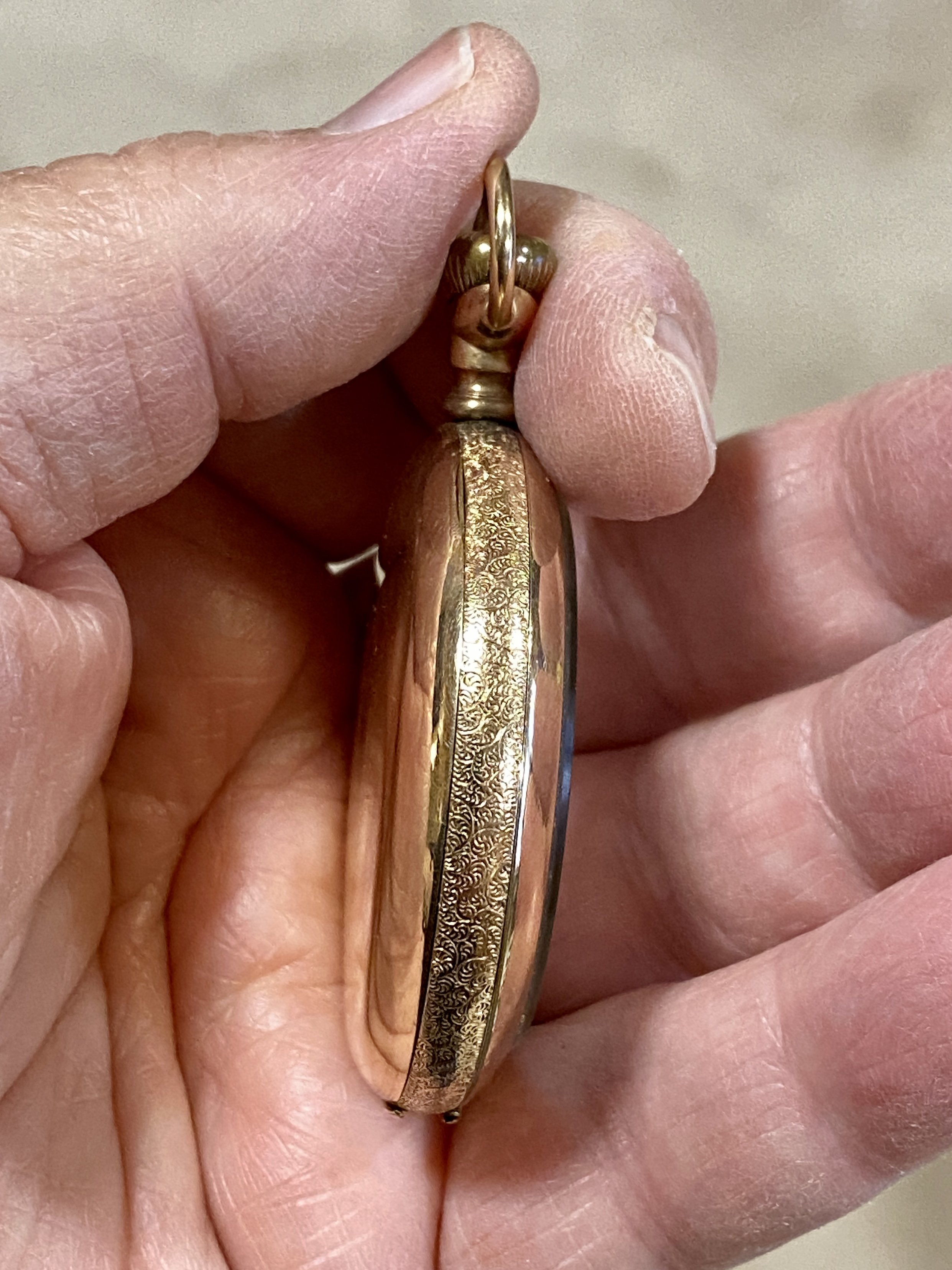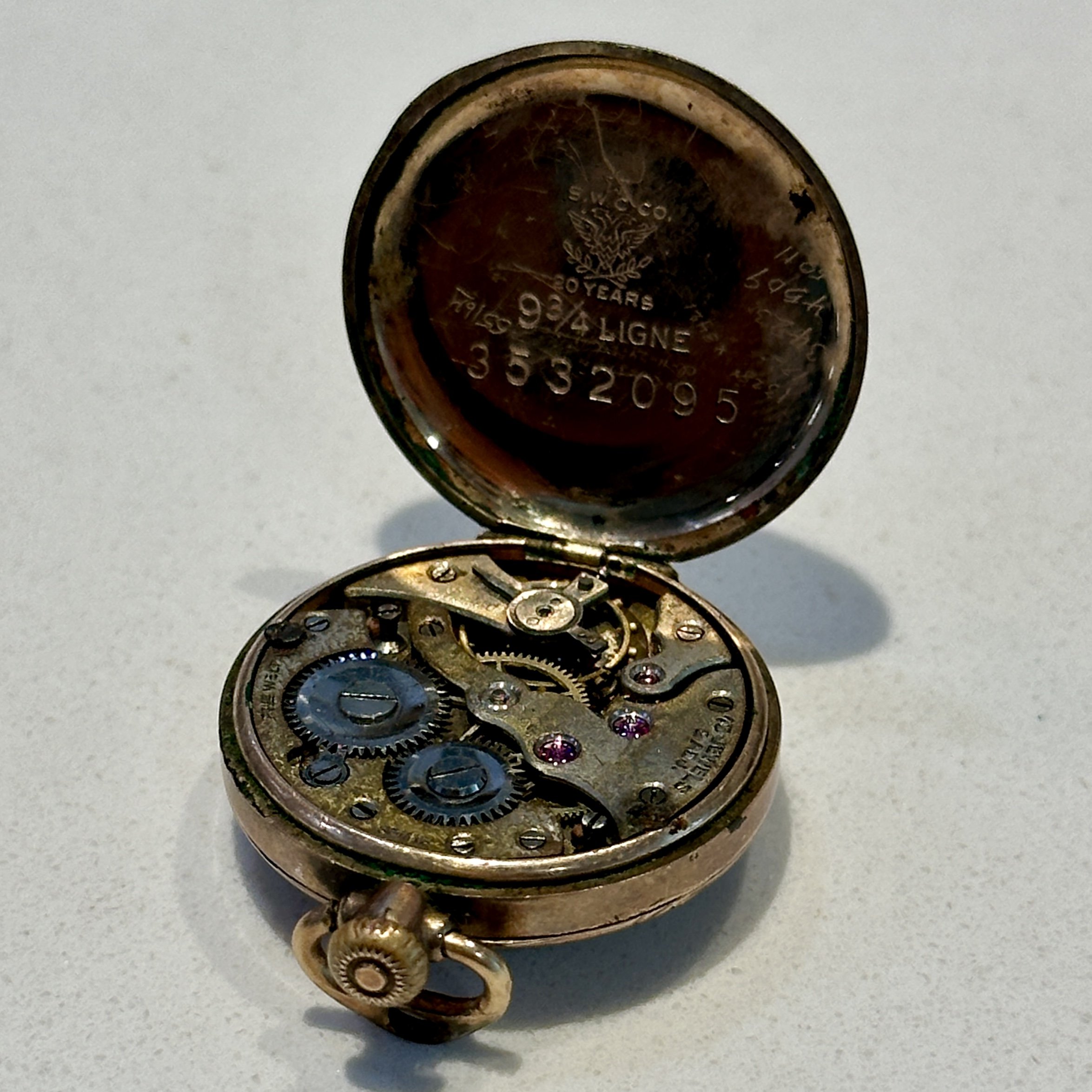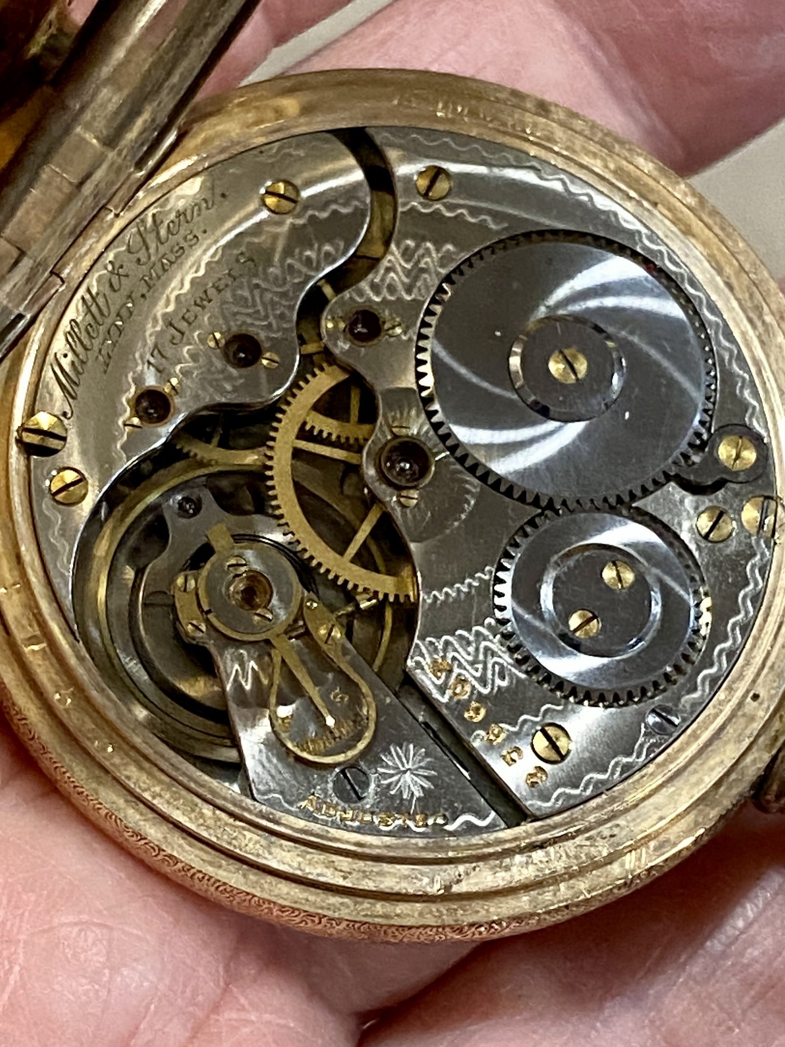 Badly sprung hinge on the front cover. Let us know how you make out with that problem. The movement will come in handy as a donor for future projects. The dial likewise. It should clean up. The Traveller grade name is typical of a Waltham movement sold (usually) in England. The trade mark A L D is Aaron Lufkin Dennison, a founder of the Waltham company who resided in England.