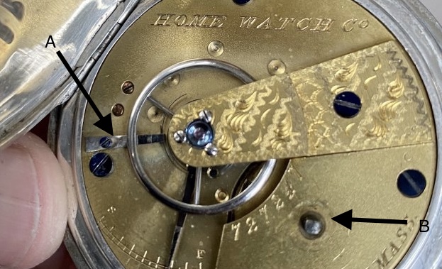 2- At B on both images, the arrow points at the fourth wheel upper jewel. On the grade 950 on the left, the jewel is in a separate setting, fitted into a milled recess, and held in place with two screws. All the jewels on this grade 950 are this way. On the grade 950B on the right, all the jewels have adopted the Swiss system of friction fit, non-removable jewels.