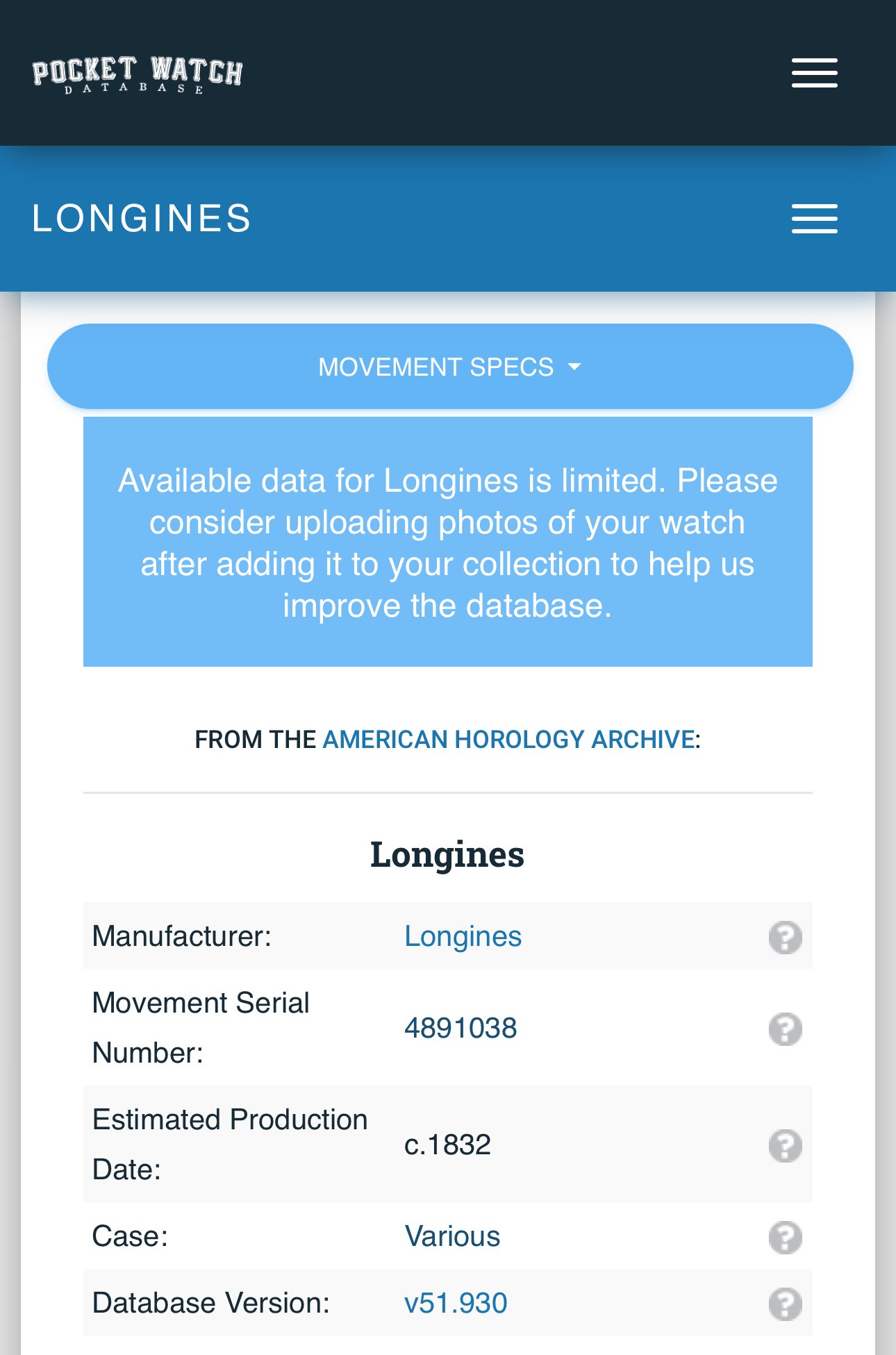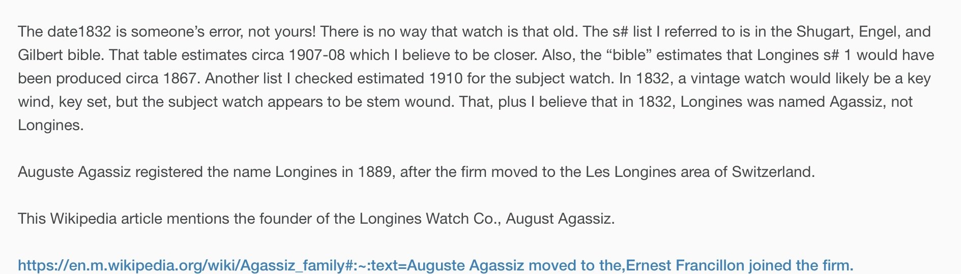 You appear to have acquired a Longines pocket watch or two. You enquired about a Longines with a 2 million serial number recently. When you check a data base, it indicated a date of 1832. The subject watch has a 4million serial number, and that same data base also indicated 1832! You need to no longer refer to that data base. A lot of the background relative to Agassiz/Longines company names appears in the thread, so there is no sense repeating the information here. The site I checked indicated circa 1928. Value? Not much I fear, based on the scanty information you have supplied. Plus the fact the watch needs repair.