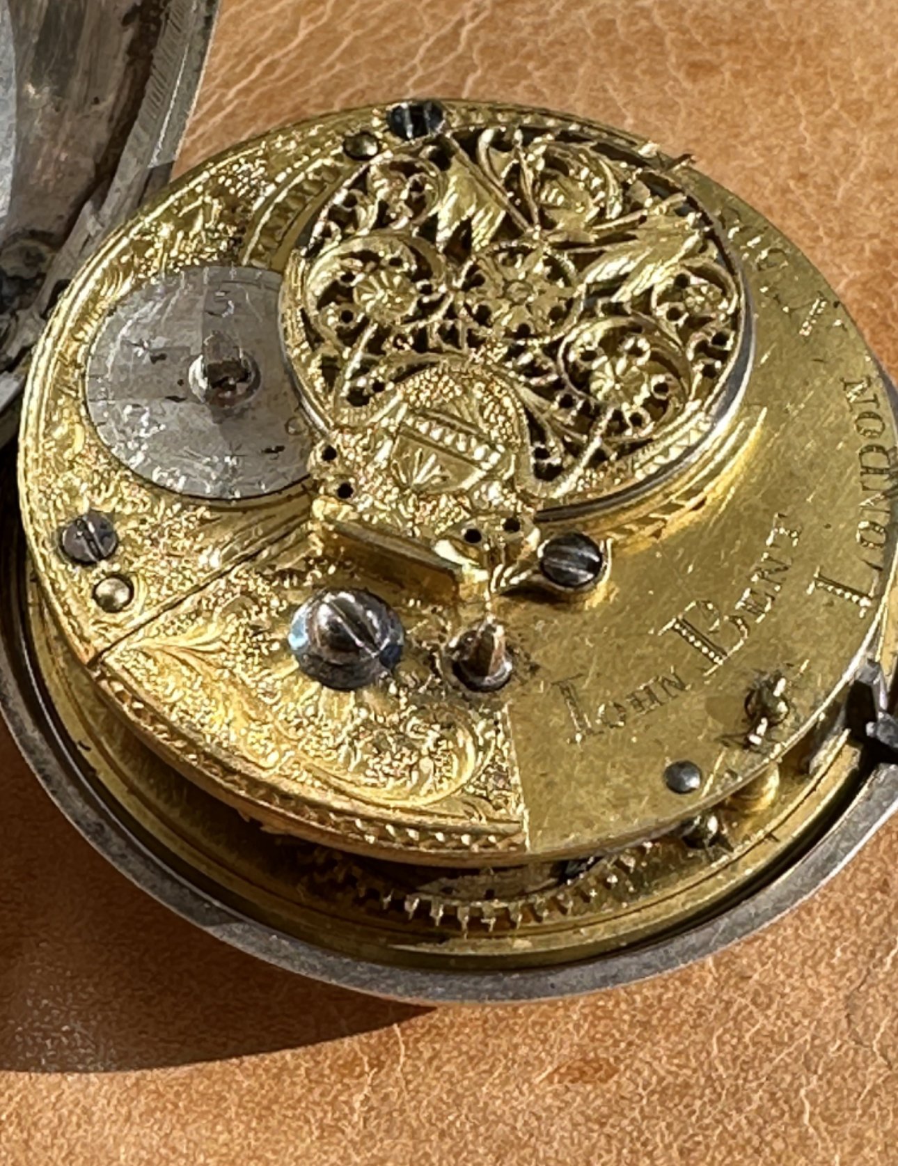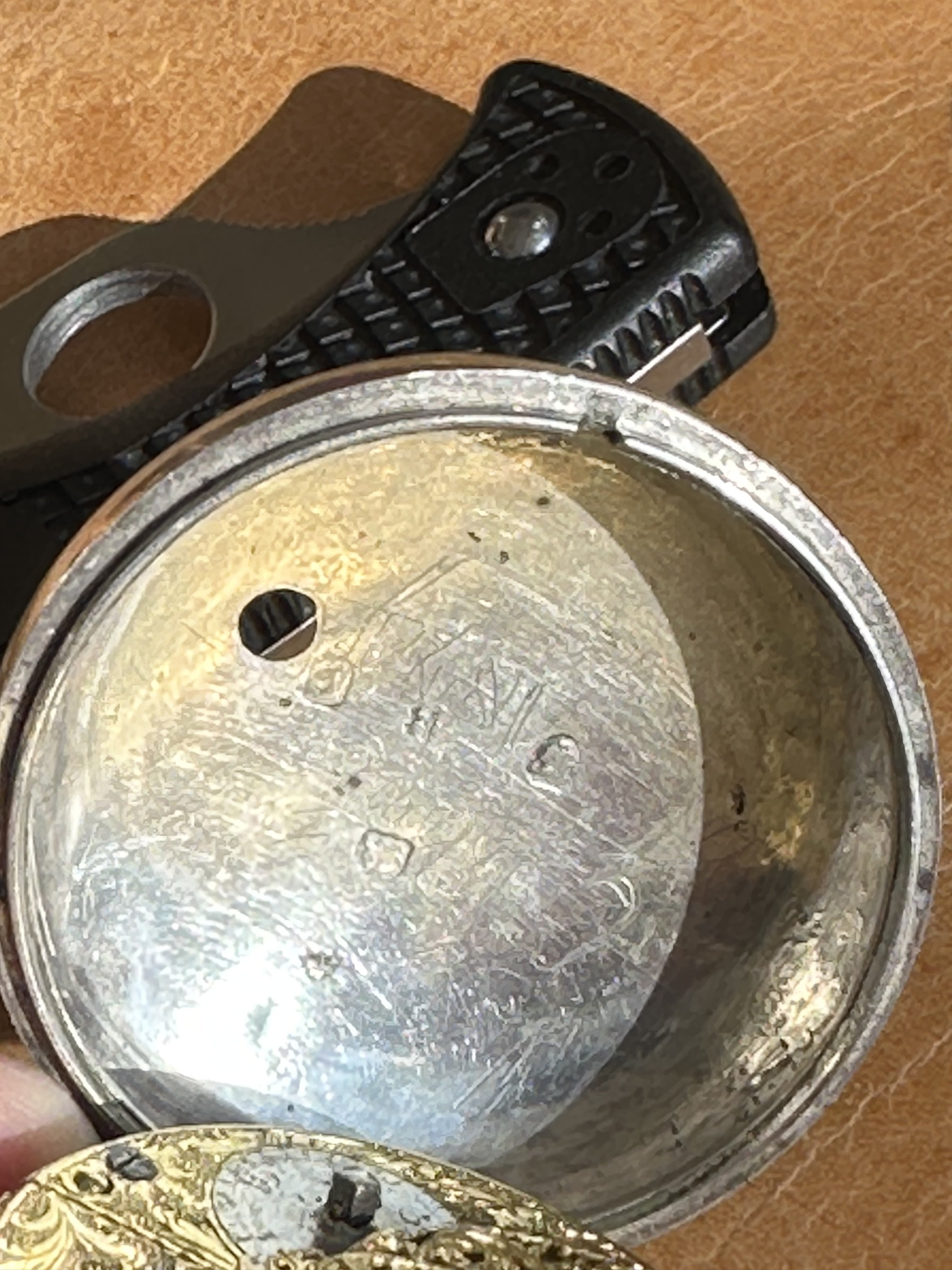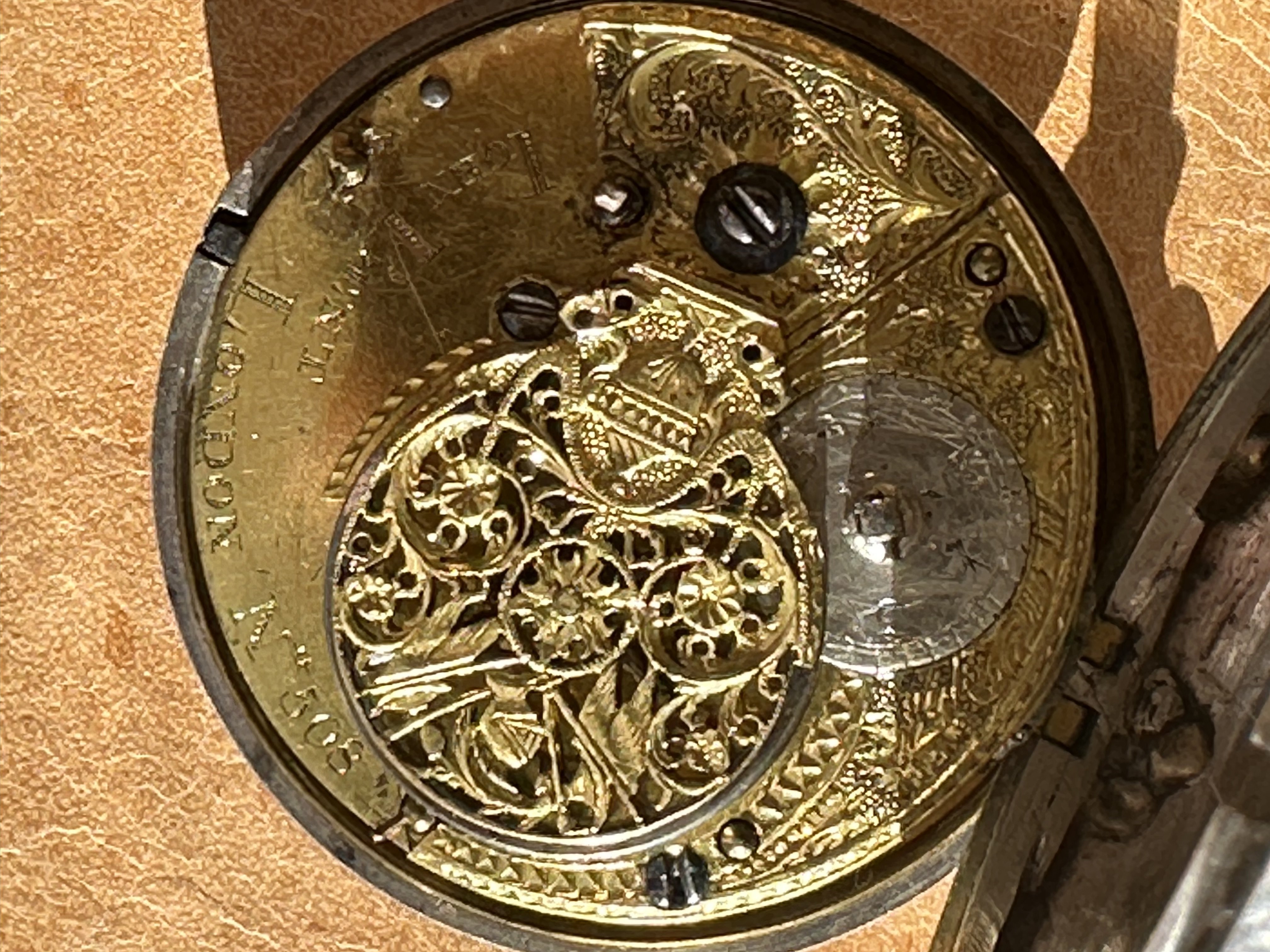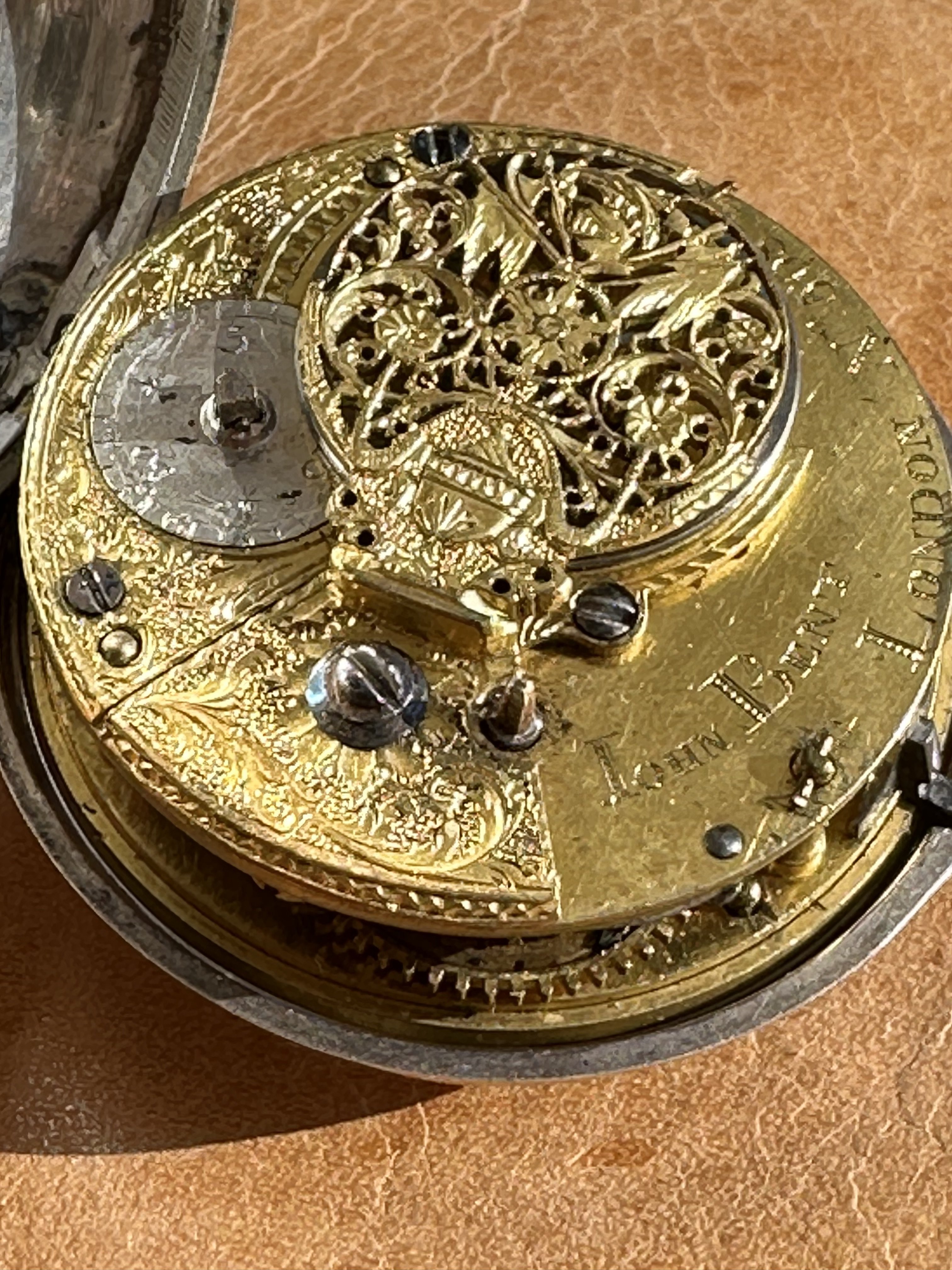 The hallmark is London, the date letter C in that cartouche appears to be 1798-99. What appears to be the case maker’s mark (IB or IH, incuse) could be any one of about half a dozen case makers. If it is IH incuse, it could be John Hadley, 10 St. James Buildings, Rosomans Row (London?), reg’d 1789. If it is IB incuse, it could be John Bullocke, 40 Ironmonger Row, Old St. (London?), reg’d 1782. My initial guess of circa 1734, based on the Baillie listing for this watchmaker, was way early. But English maker’s names were often used for decades after the death of the scion, as these businesses often remained in the family. Unfortunately, the case maker’s stamp is not well defined. Thanks to Steve for daring to remove the case papers. These papers alone, often tell a story.