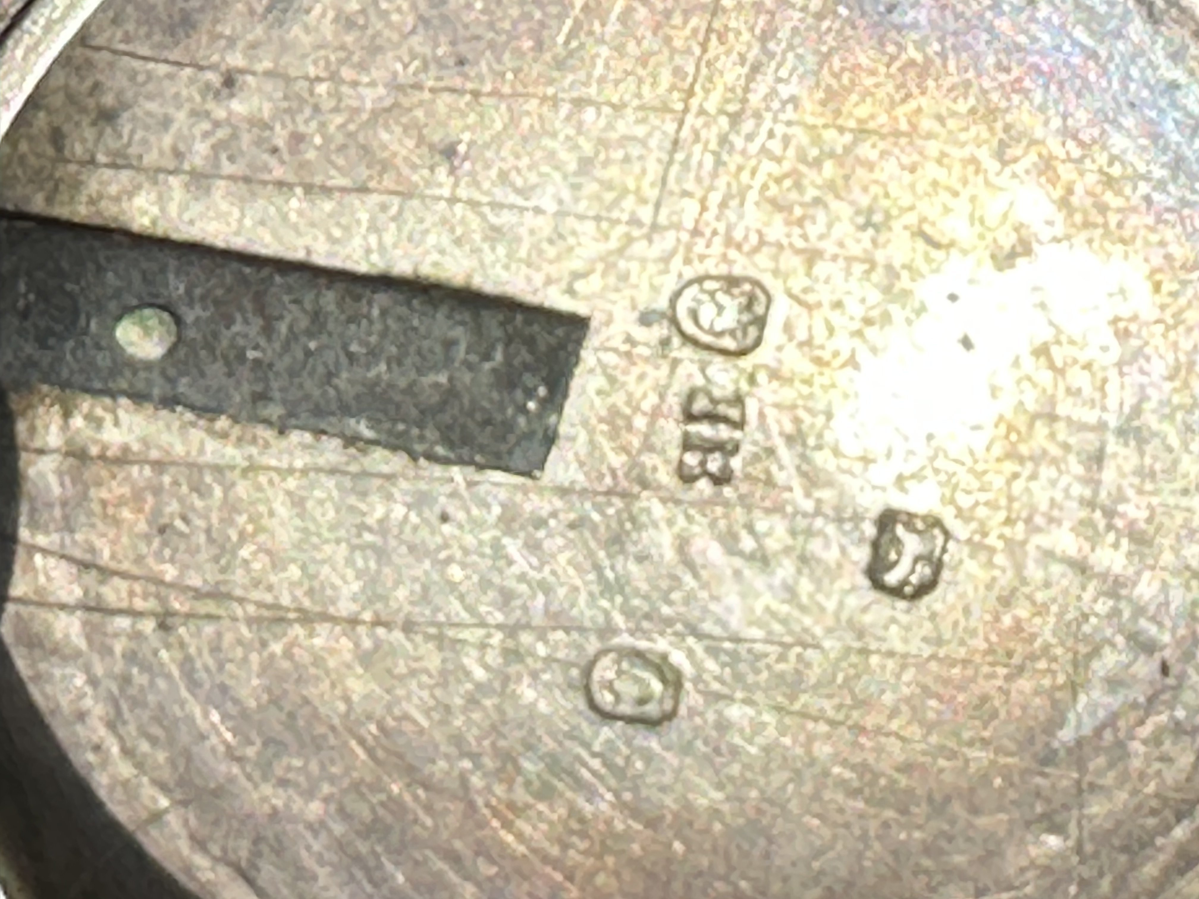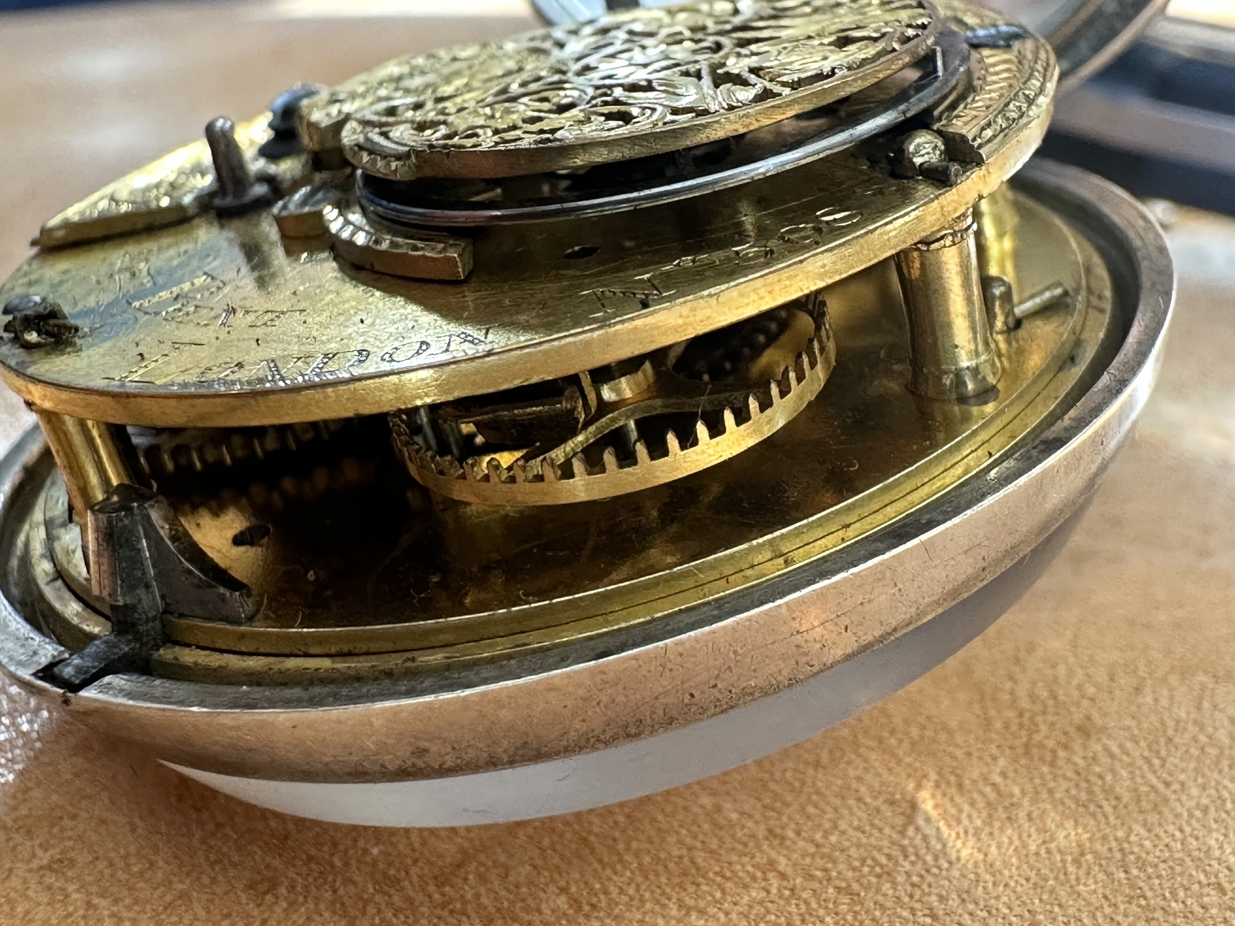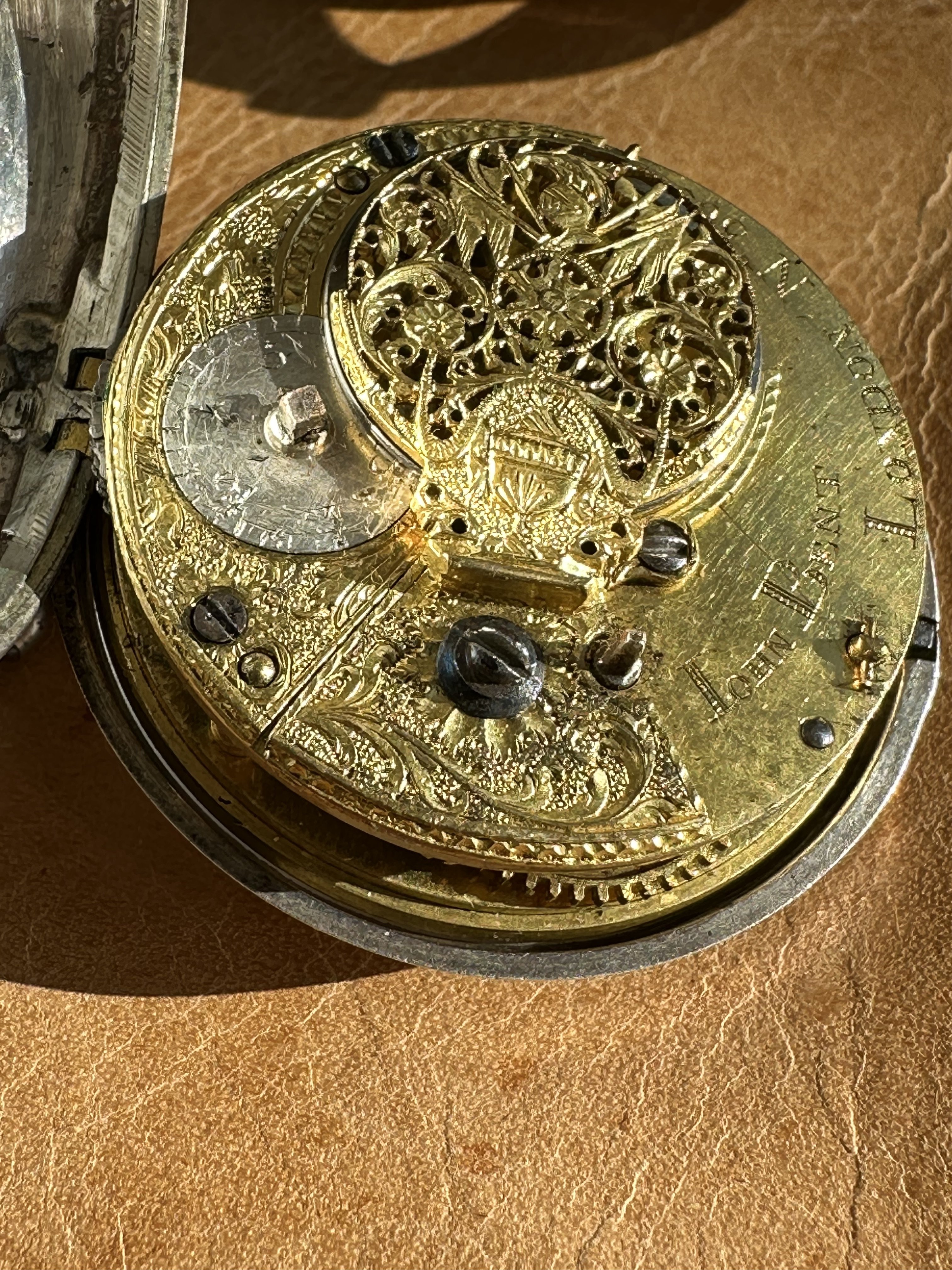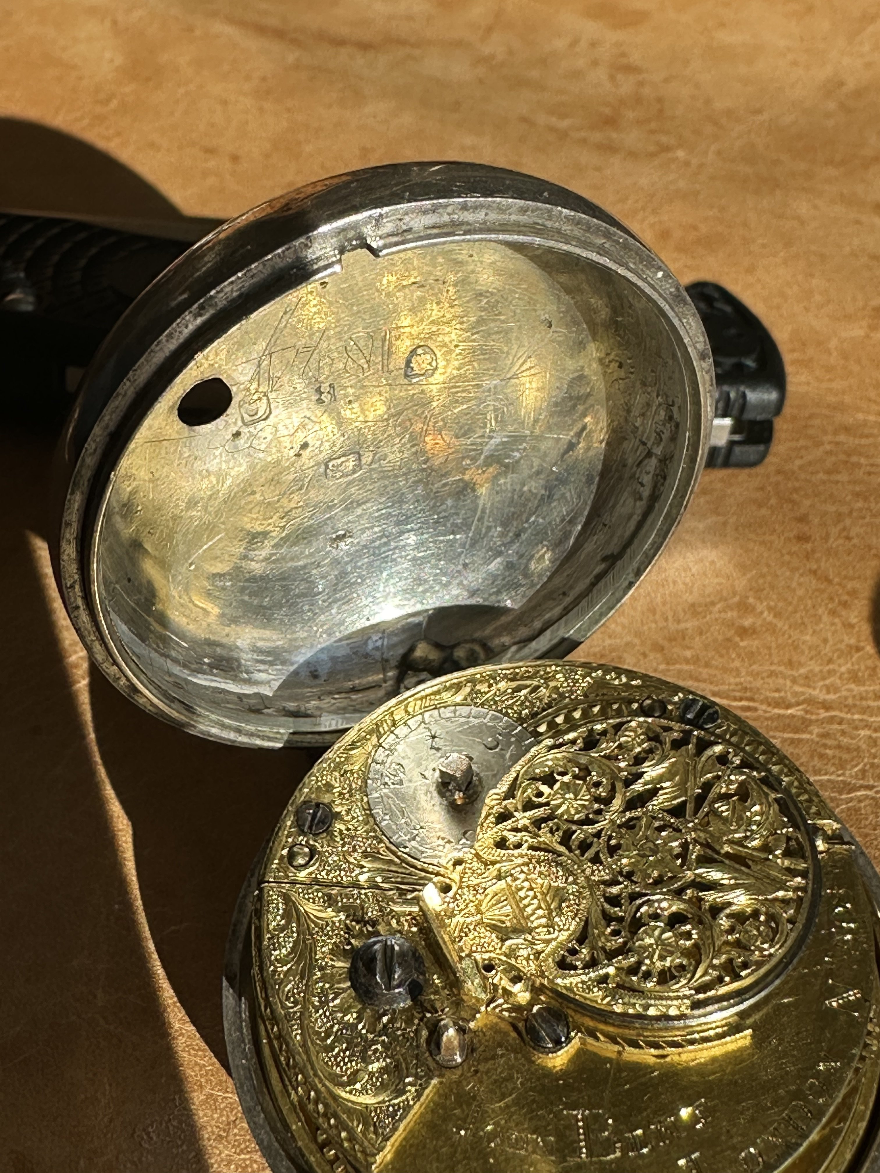 The hallmark is London, the date letter C in that cartouche appears to be 1798-99. What appears to be the case maker’s mark (IB or IH, incuse) could be any one of about half a dozen case makers. If it is IH incuse, it could be John Hadley, 10 St. James Buildings, Rosomans Row (London?), reg’d 1789. If it is IB incuse, it could be John Bullocke, 40 Ironmonger Row, Old St. (London?), reg’d 1782. My initial guess of circa 1734, based on the Baillie listing for this watchmaker, was way early. But English maker’s names were often used for decades after the death of the scion, as these businesses often remained in the family. Unfortunately, the case maker’s stamp is not well defined. Thanks to Steve for daring to remove the case papers. These papers alone, often tell a story.