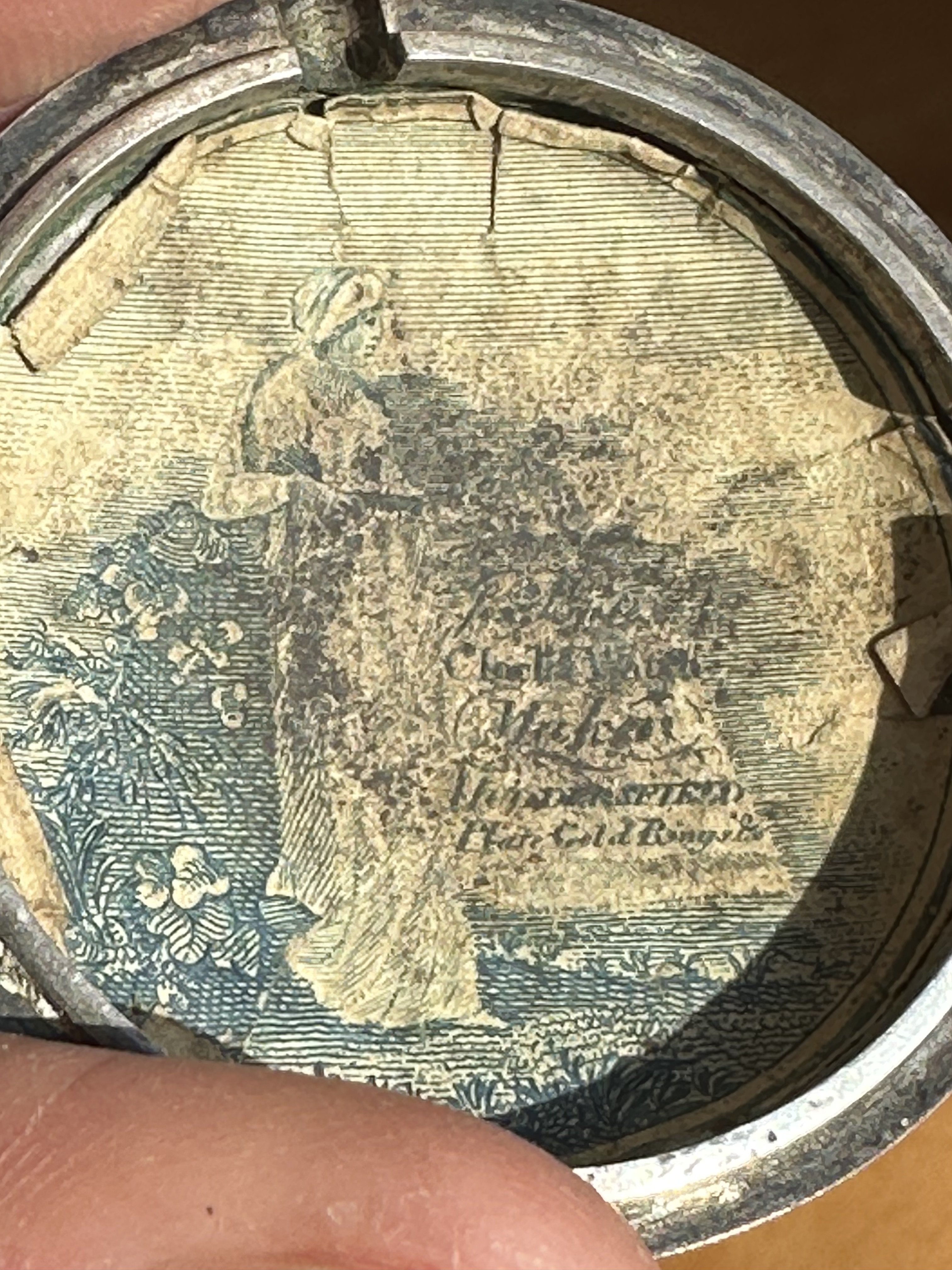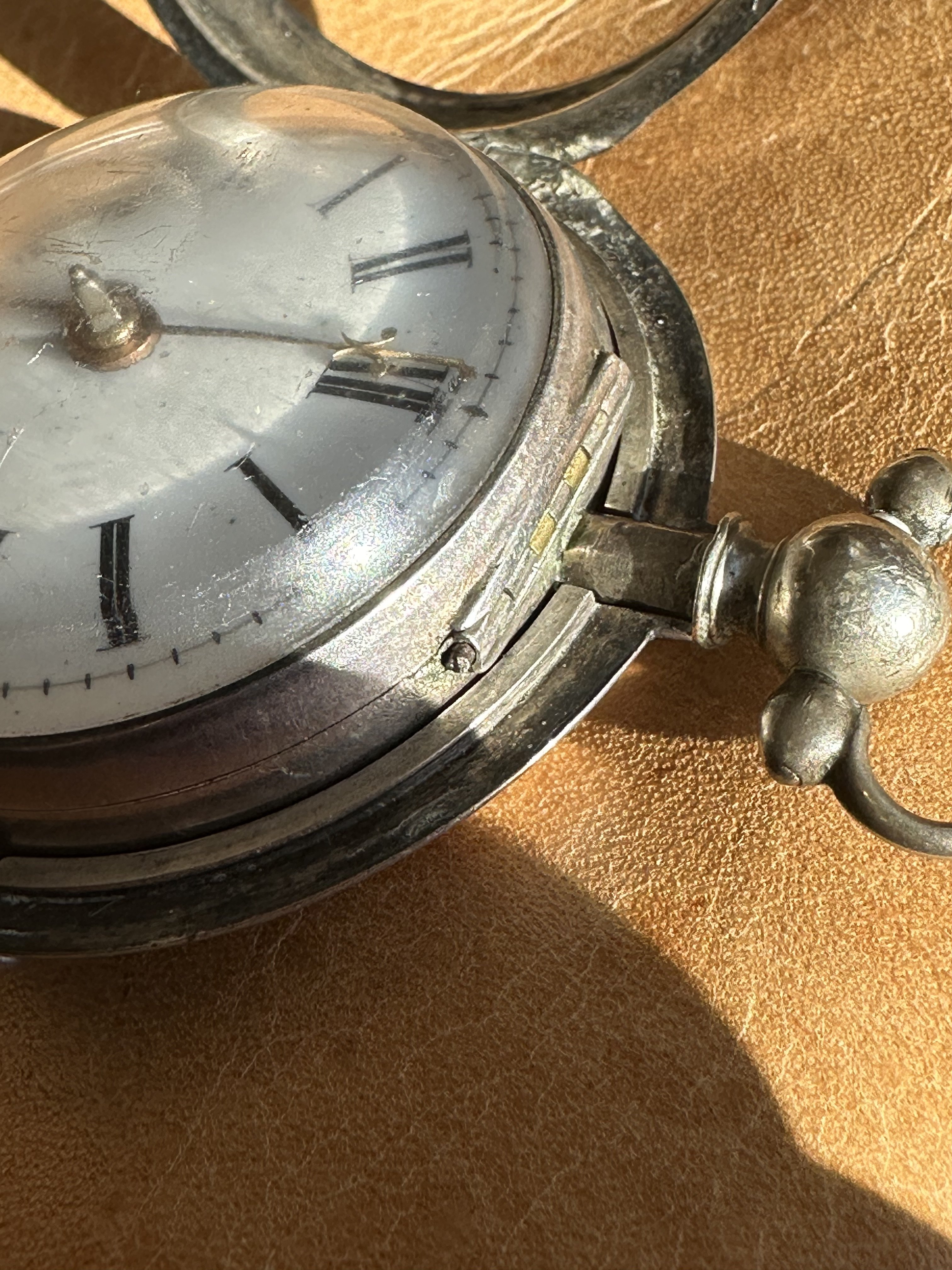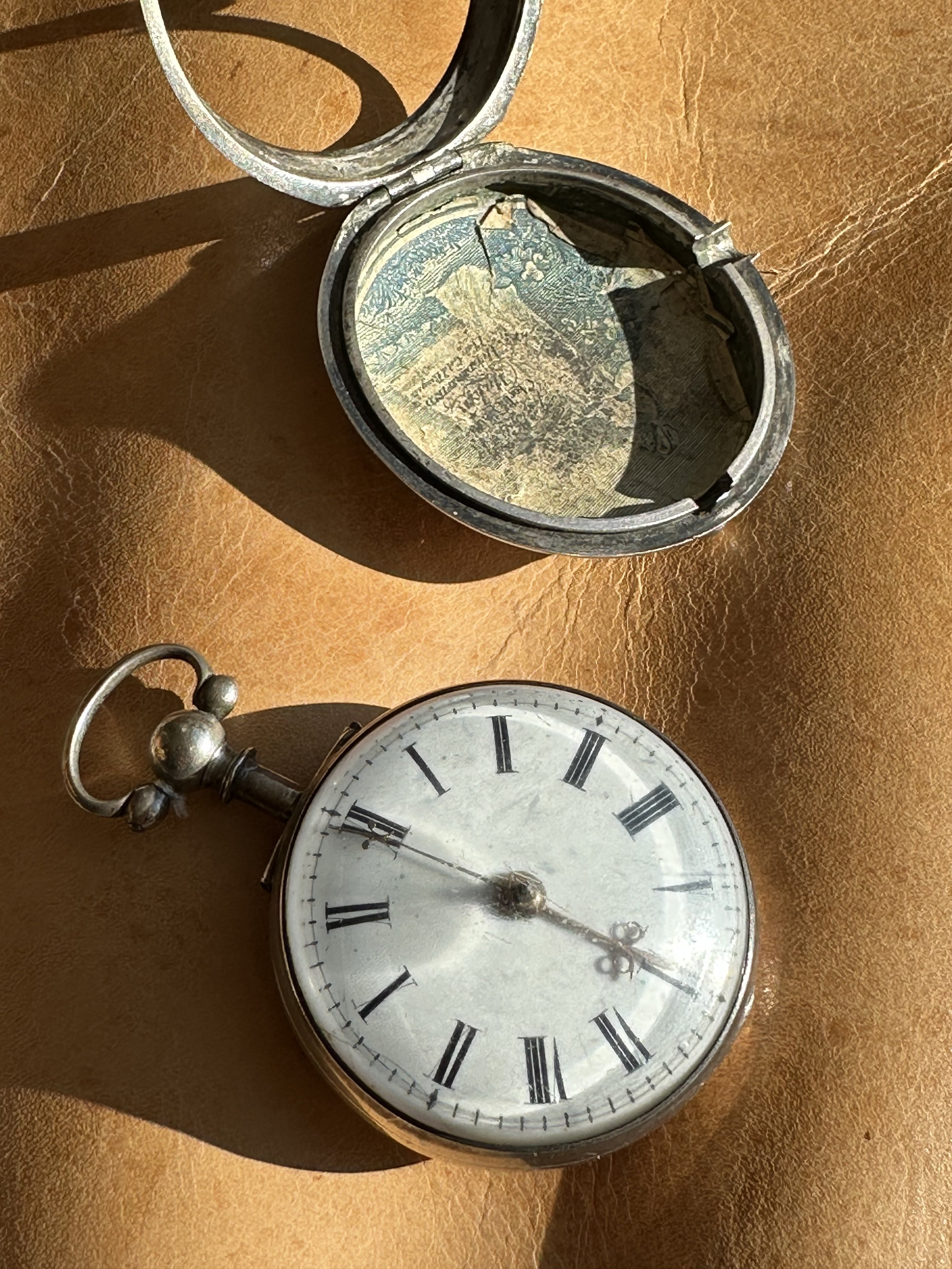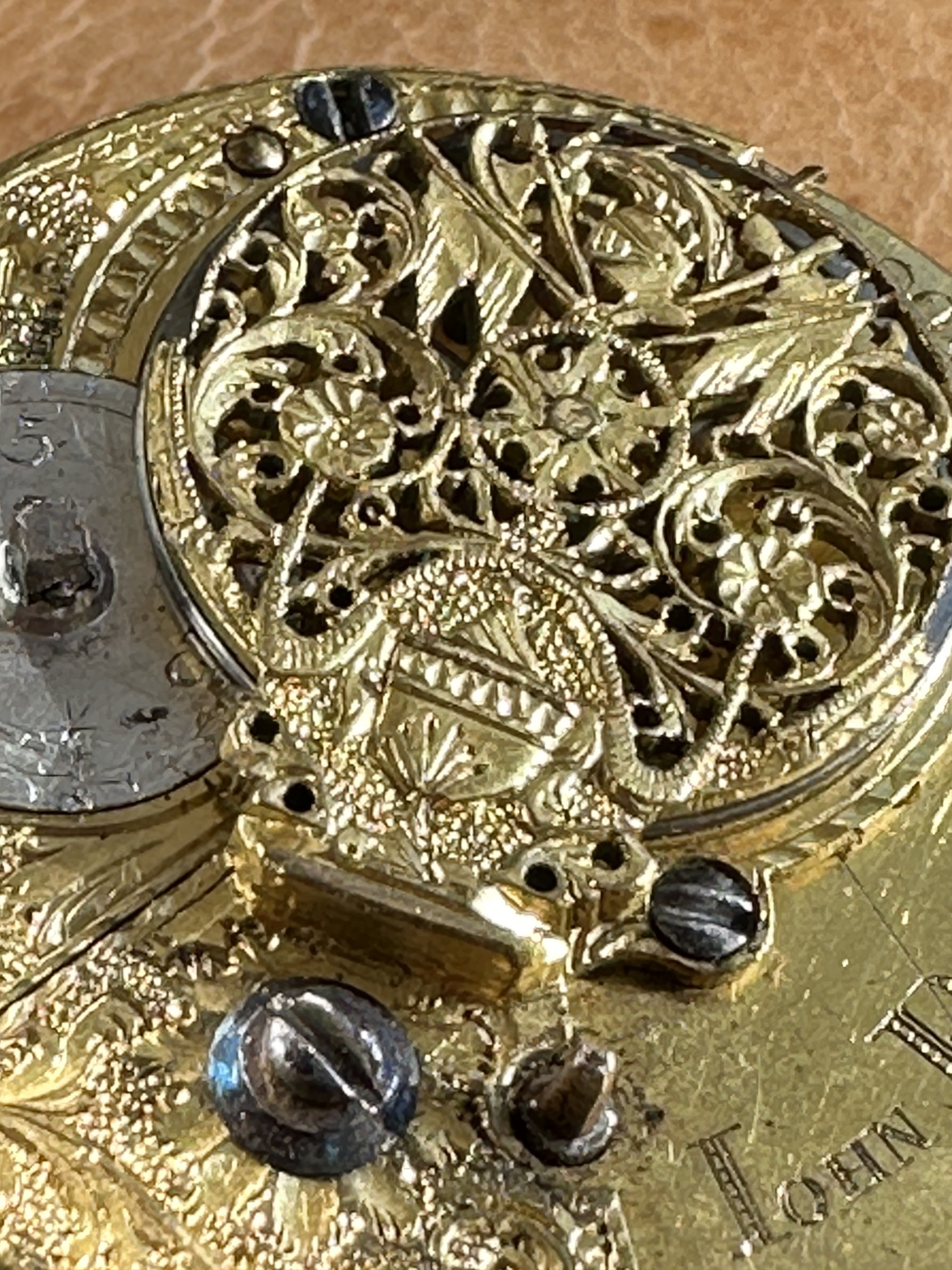 The hallmark is London, the date letter C in that cartouche appears to be 1798-99. What appears to be the case maker’s mark (IB or IH, incuse) could be any one of about half a dozen case makers. If it is IH incuse, it could be John Hadley, 10 St. James Buildings, Rosomans Row (London?), reg’d 1789. If it is IB incuse, it could be John Bullocke, 40 Ironmonger Row, Old St. (London?), reg’d 1782. My initial guess of circa 1734, based on the Baillie listing for this watchmaker, was way early. But English maker’s names were often used for decades after the death of the scion, as these businesses often remained in the family. Unfortunately, the case maker’s stamp is not well defined. Thanks to Steve for daring to remove the case papers. These papers alone, often tell a story.