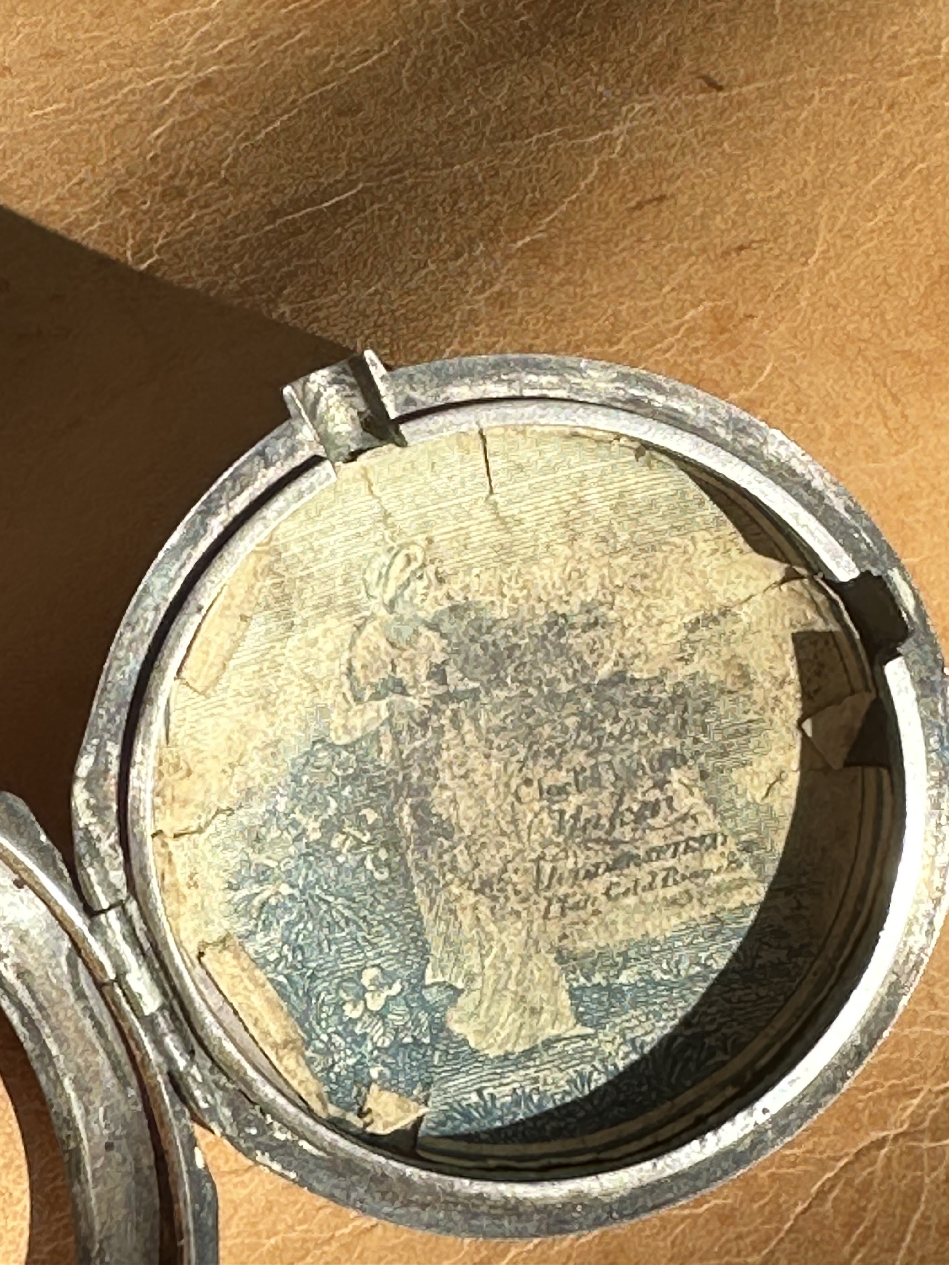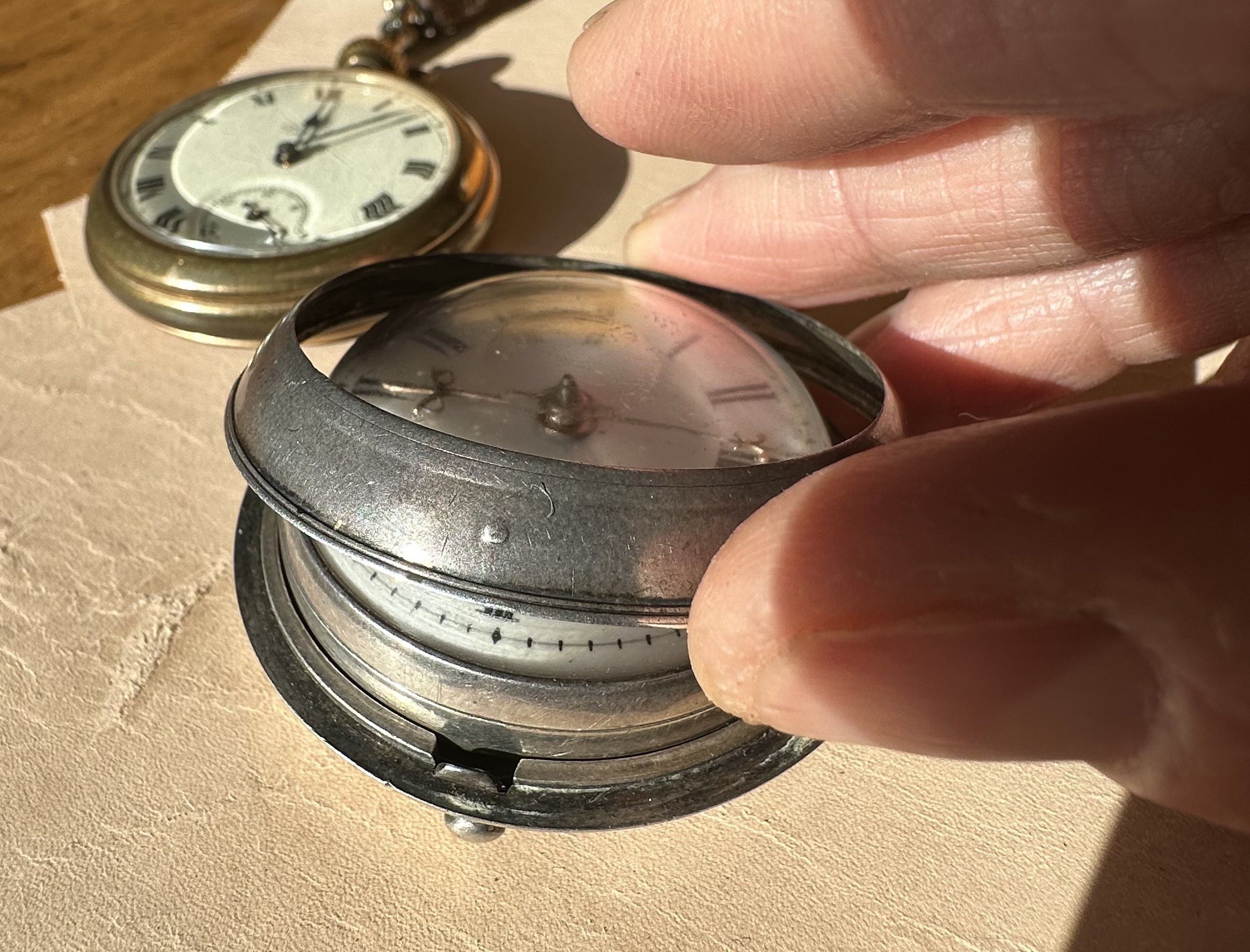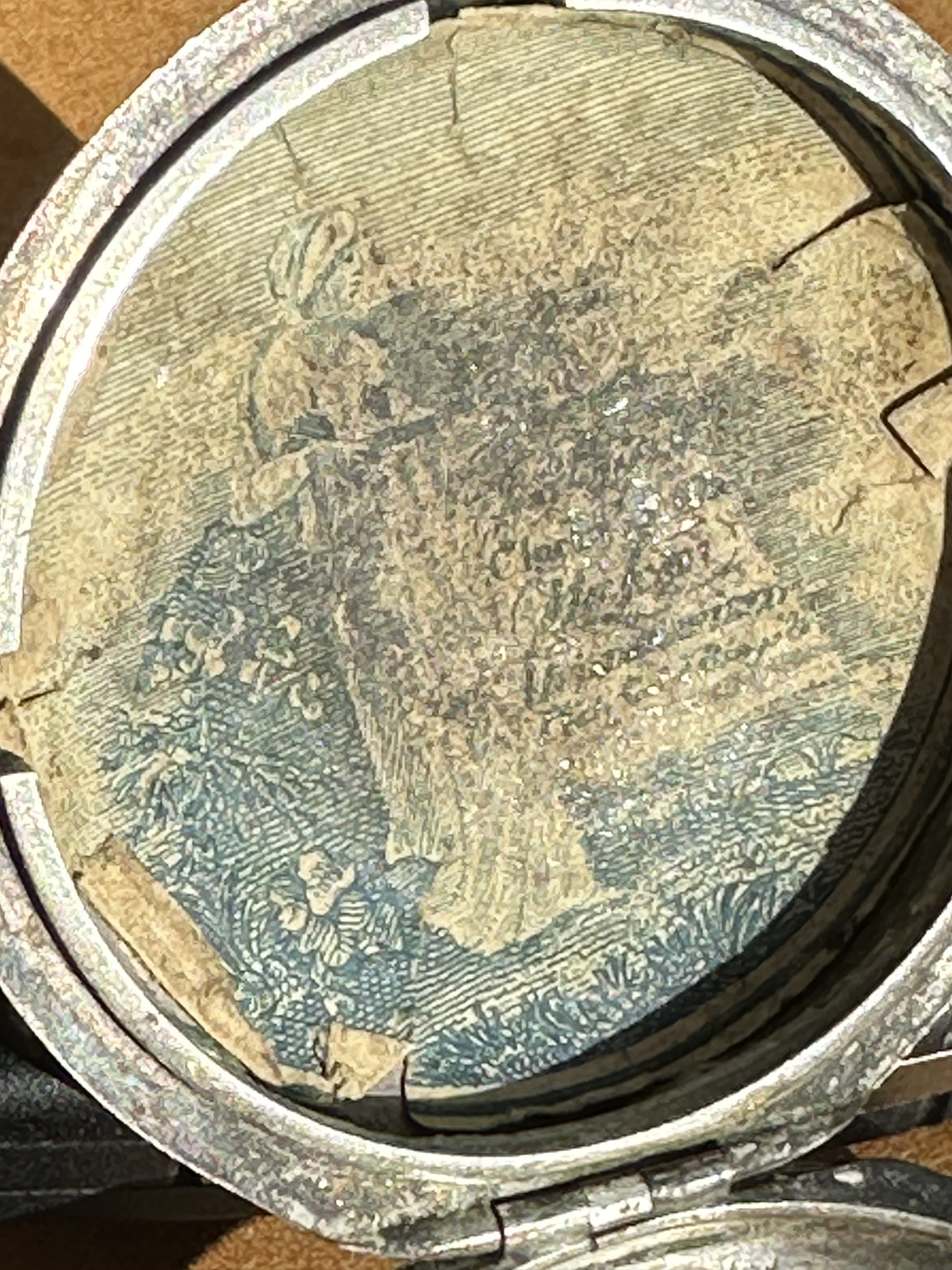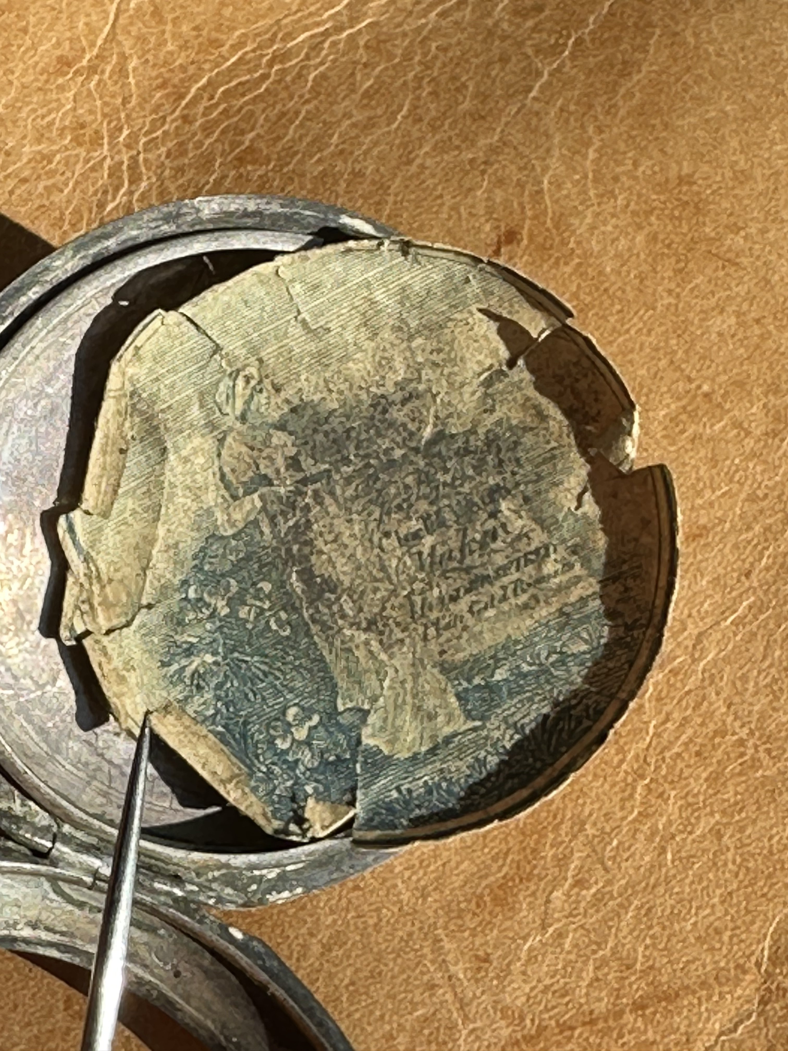 I picked up the old watch this morning. Here are photos. I used a large stitching needle to remove the paper. Some photos may be redundant.