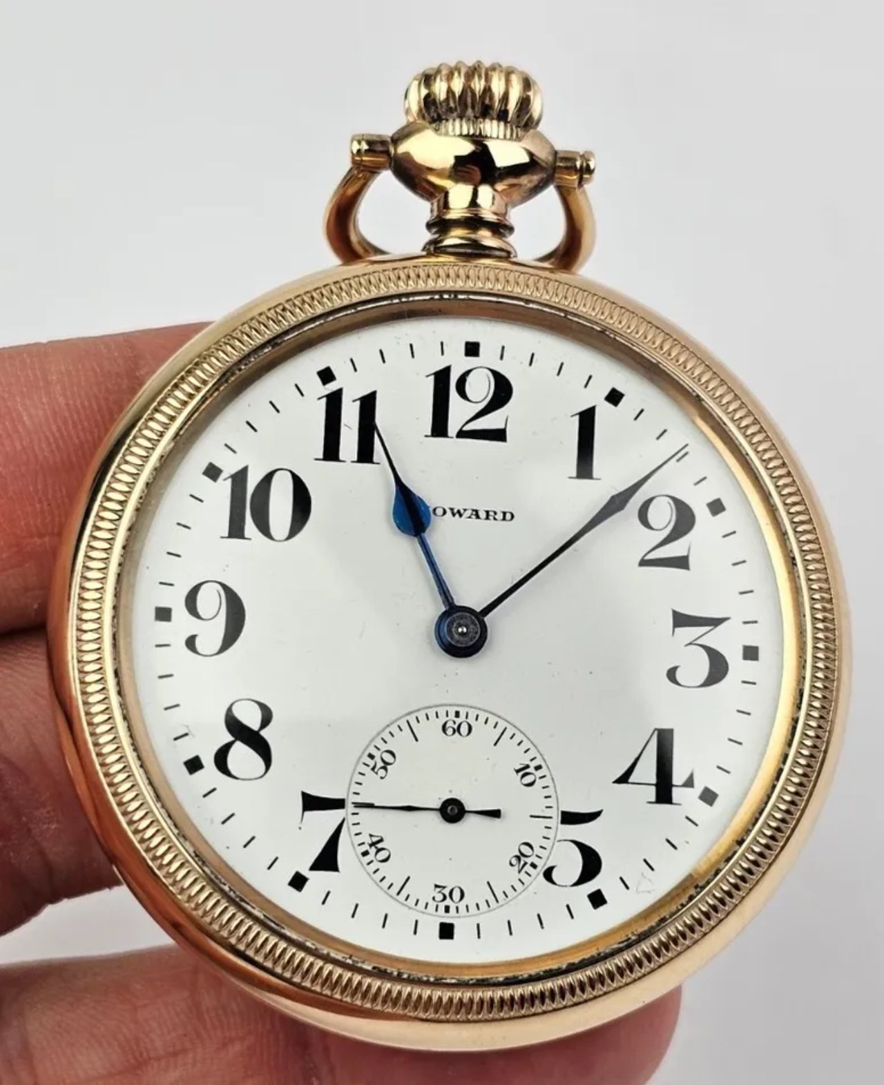 The Howard # 11 at $400.00 seems high for that model, in spite of its apparent excellent condition. The # 11 is quite collectible (I have one), but many collectors look down their noses at it. Howard acquired the New York Standard watch company, makers of “popular priced” (reads as inexpensive) watches. One of the NYS models was developed into the 16-size Howard model # 11, railroad chronometer. The Howard version strongly resembles the NYS version. And thereby, collectors have a tendency to shy away from them. But I quite like mine. Like so many of my watches, it came to me with a history.
