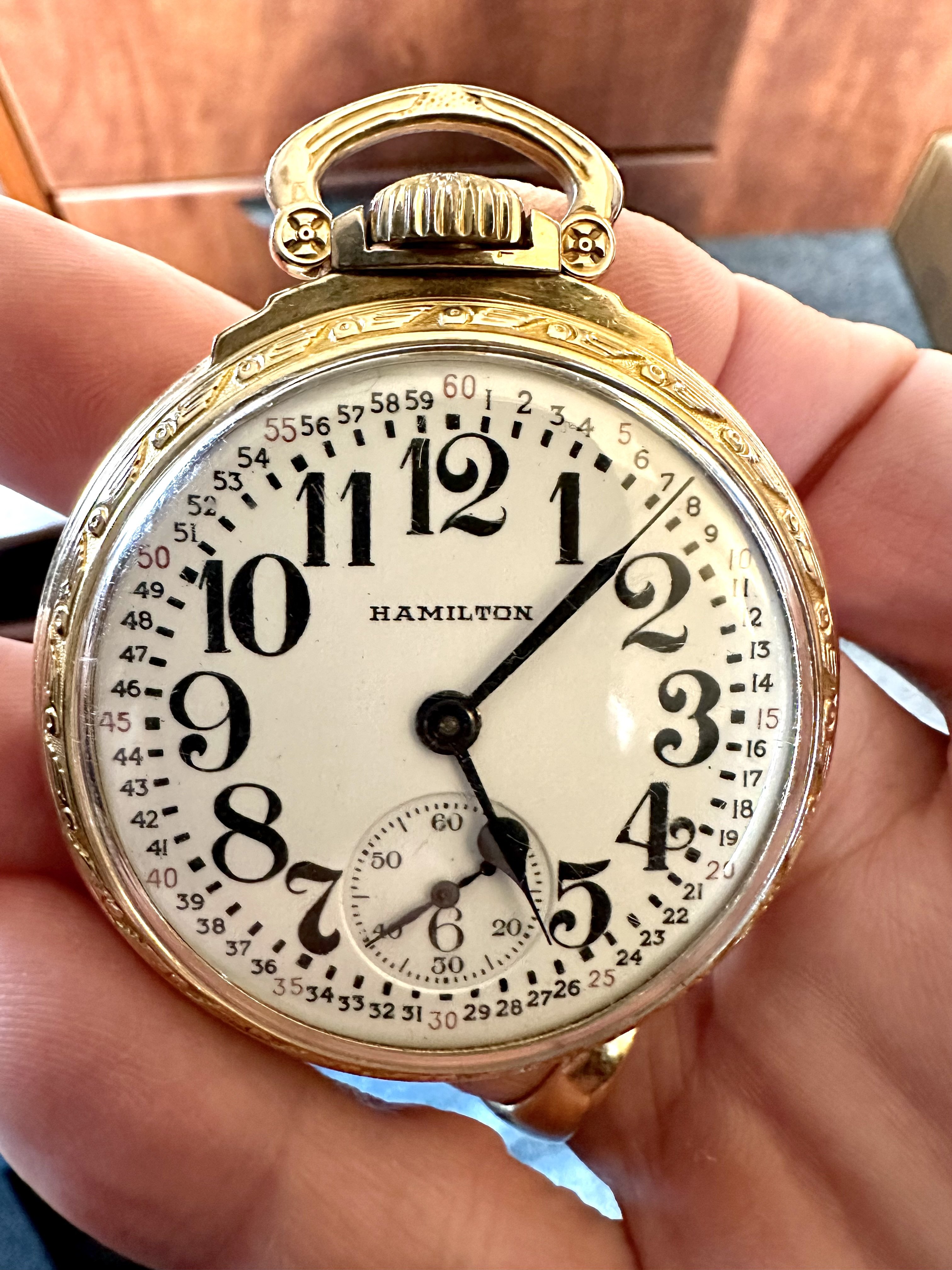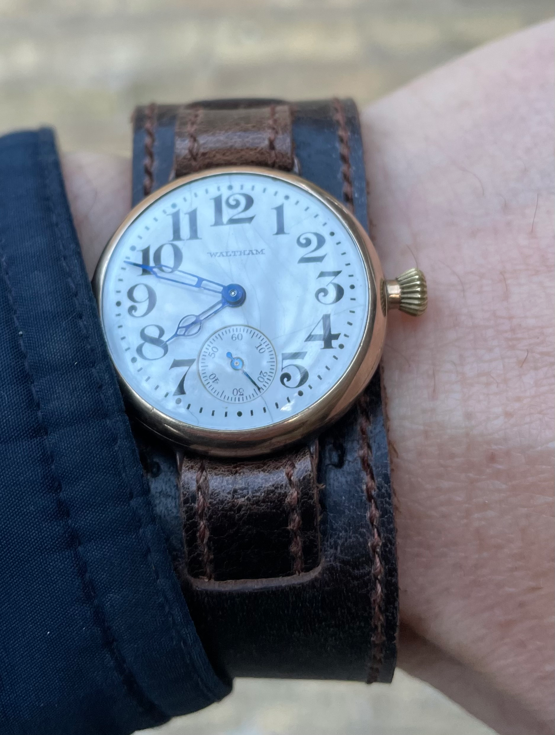 Late in the 19th century, before the rising popularity of the wrist watch, this type of watch might have been worn by a woman, carried on a long chain, and hung from a chatelaine (type of brooch), pinned to the front of the dress or jacket. These women’s watches were produced in both open faced styles and hunter (covered front) styles. Open faced watches had the winder at the 12, and hunter styles generally had the winder at the 3. Both might have been used by women. Early wrist watches usually utilized the hunter cased styles (crown at 3, but without the cover). Many of these open faced watches (crown at 3) were converted for use as wrist watches by their owners. The subject watch is an open faced model (crown at12). Converting such watches (I consider) is awkward because the lugs were added at the 9 and 3 positions, thus the orientation on the wrist is a bit awkward. Yours may very well be a conversion, but it appears to have been well done, so it is anyone’s guess as the whether it is a conversion, or perhaps made that way.