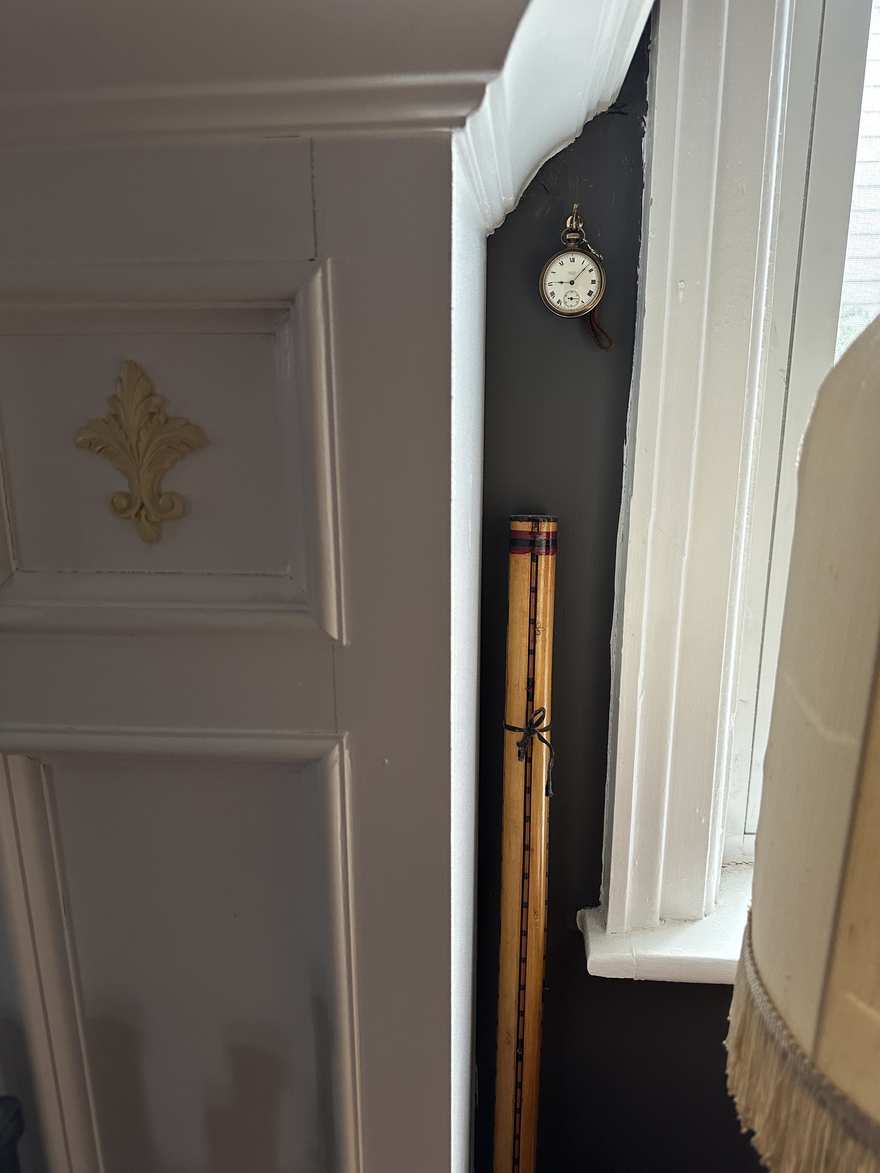 Here is the Smiths, hanging « A la Alpha » between the mantel and the window, visible from the wing chair. That’s my maternal grandfather’s fishing rod underneath Interesting to see the Smiths trembling a teeny bit from the engine within.