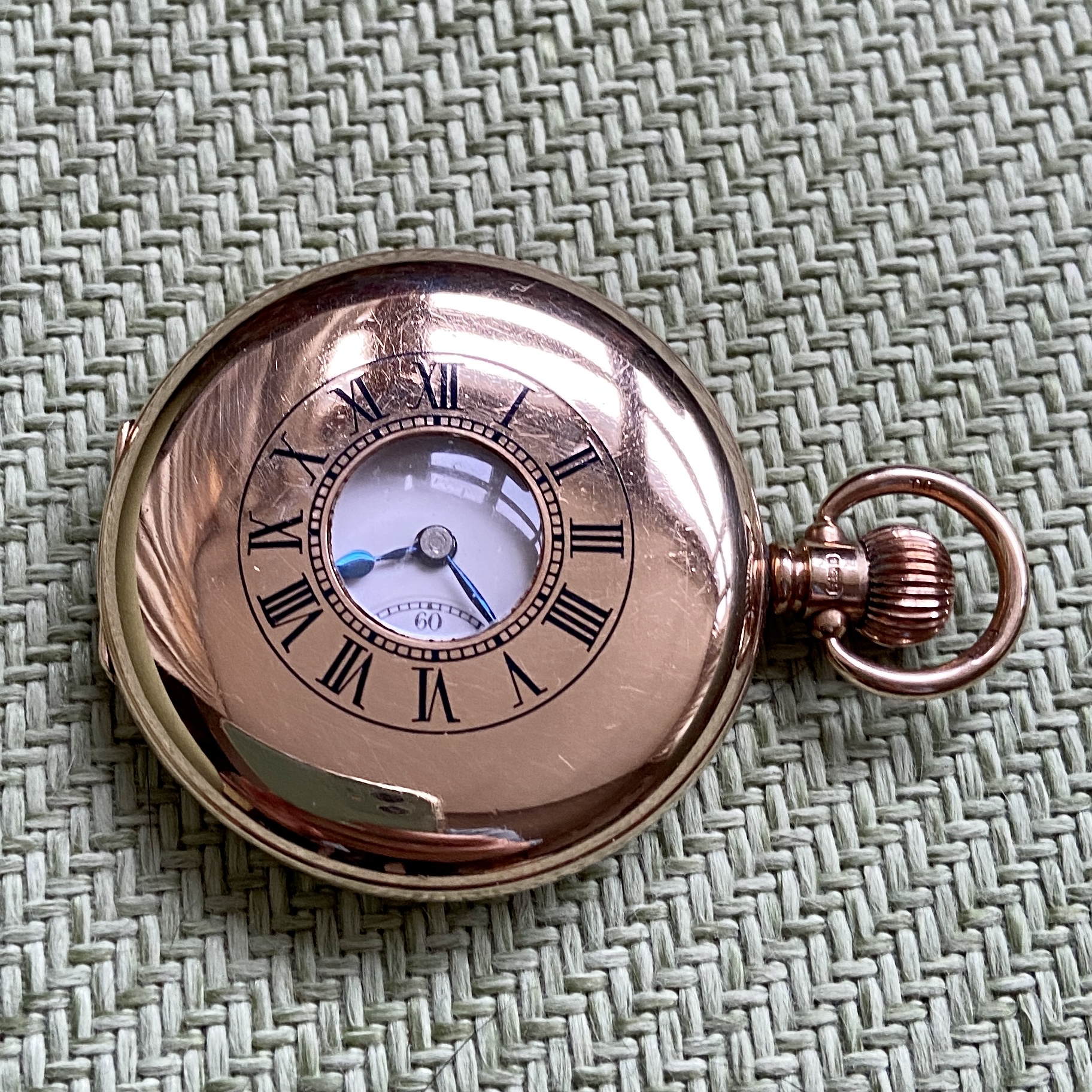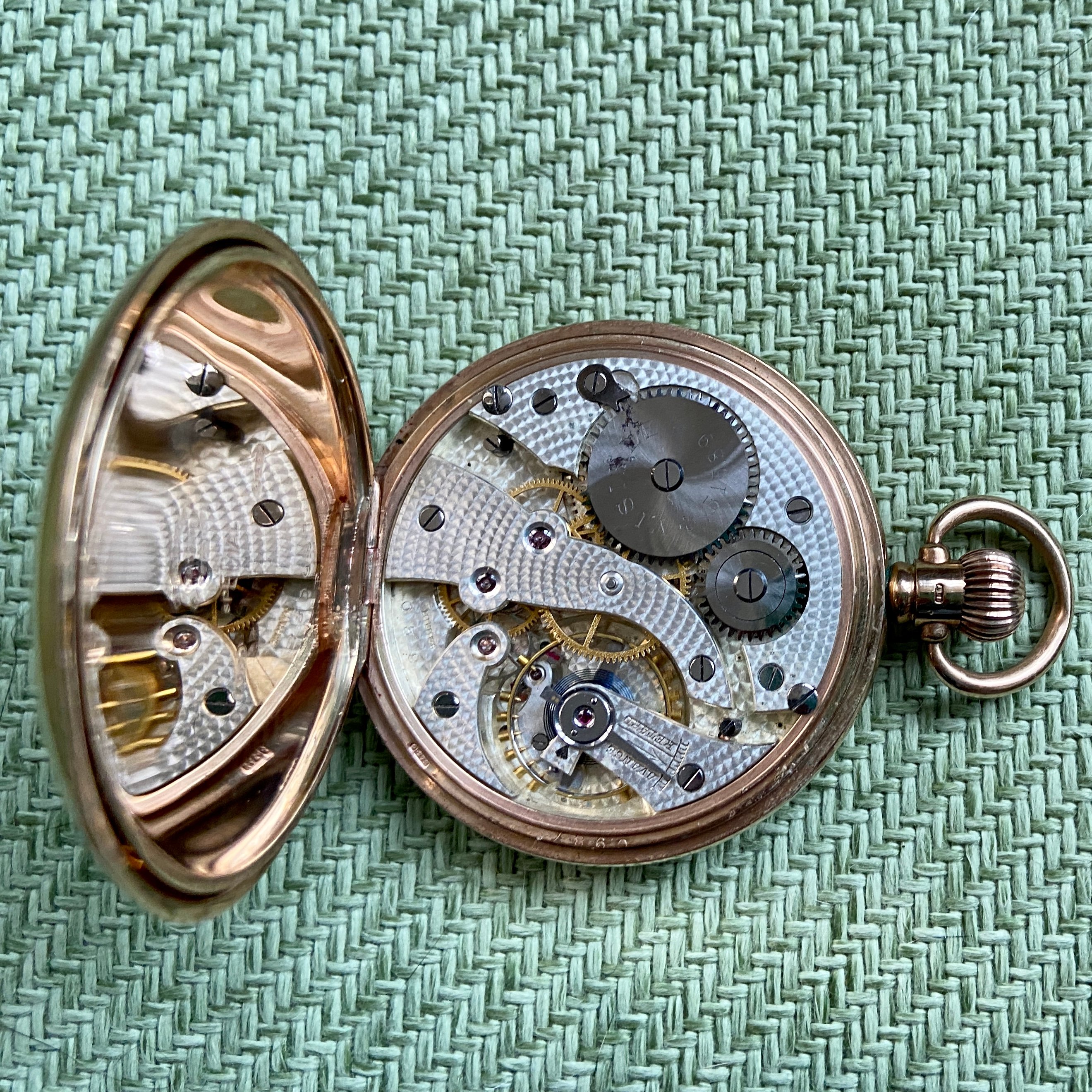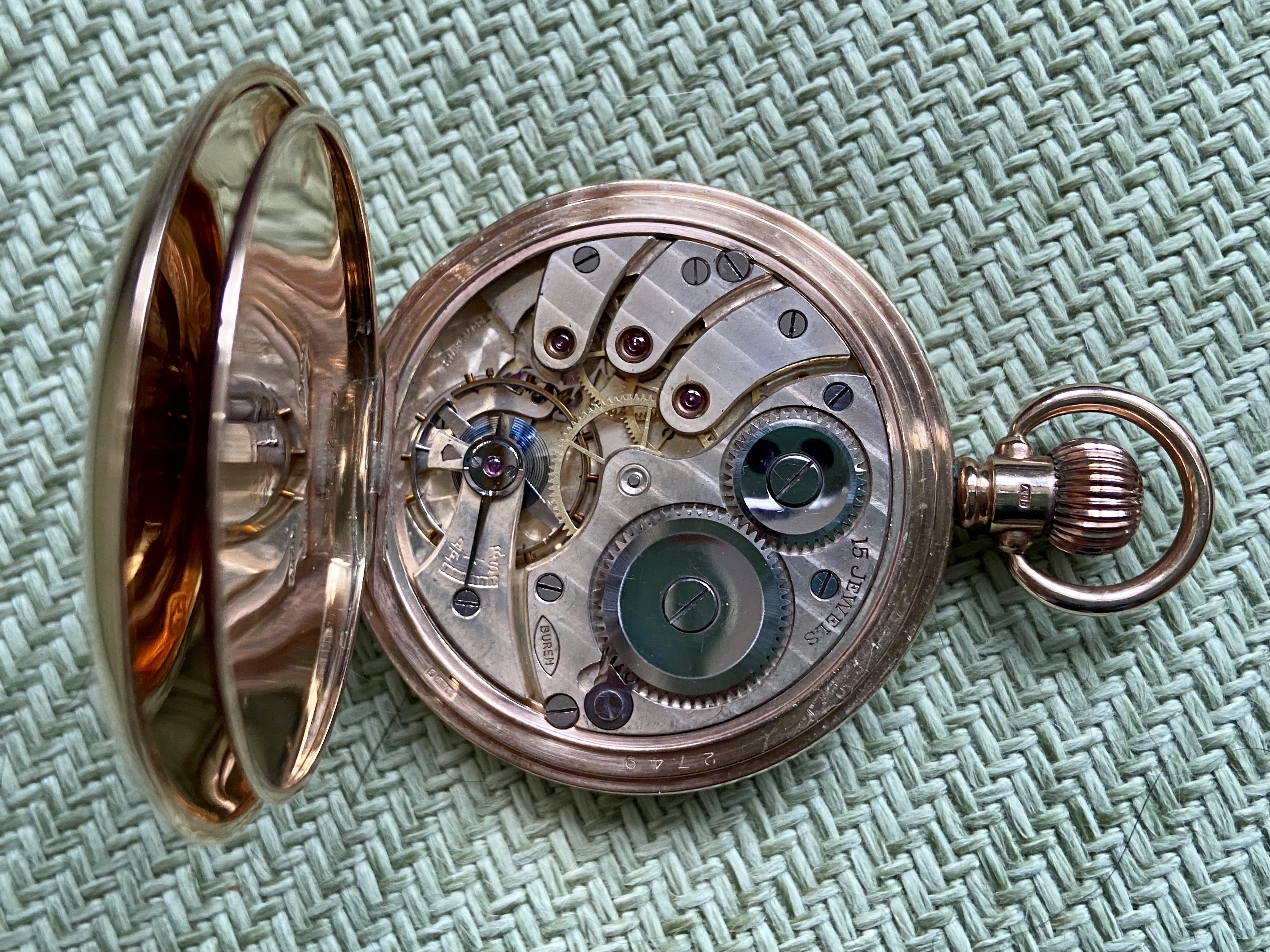 Another 9K Dennison cased model, this time a half hunter. Dates (I think) to 1922. Swiss movement by Buren (who eventually were bought by Hamilton). Shares quite a few similarities with the above: