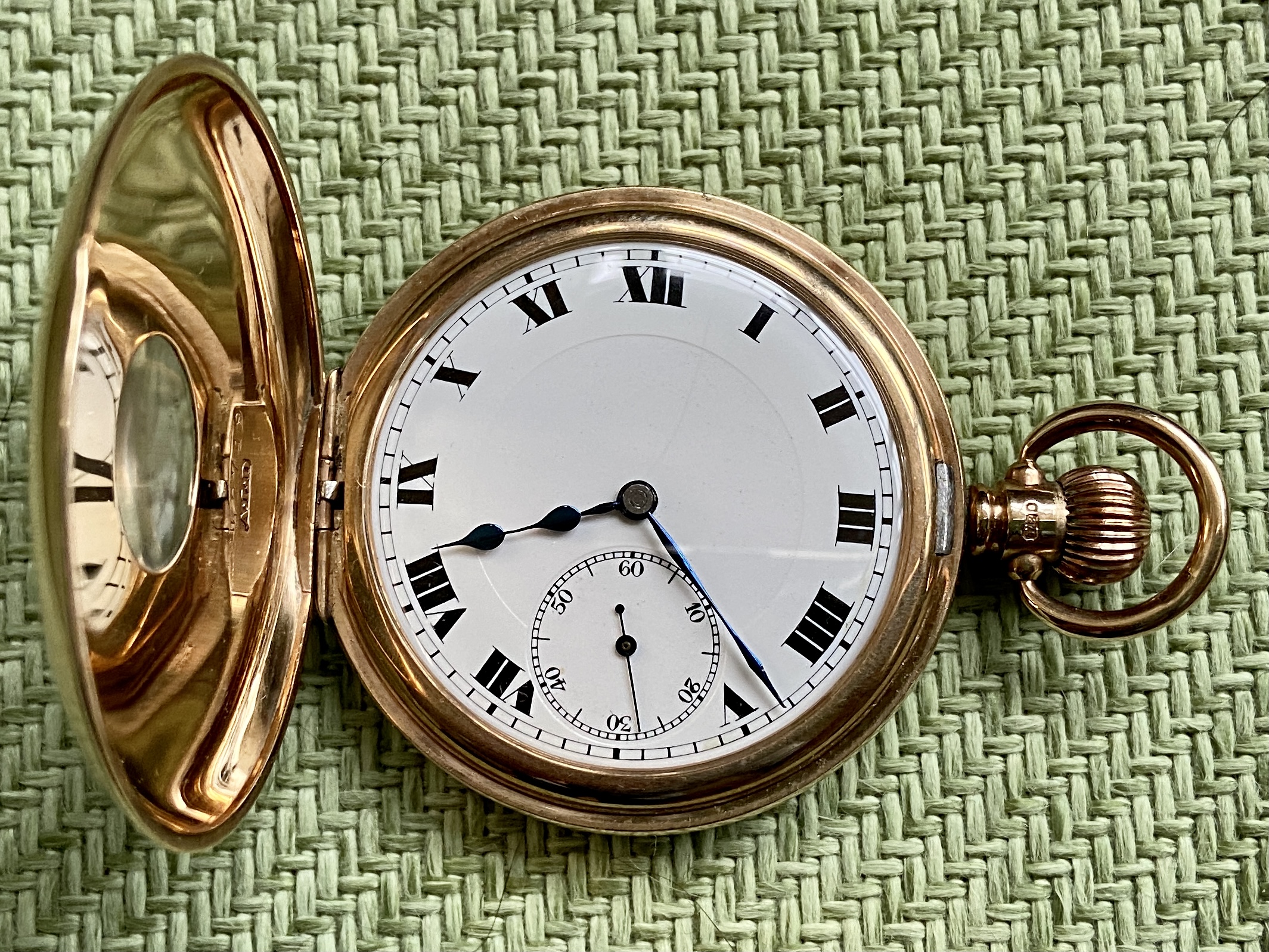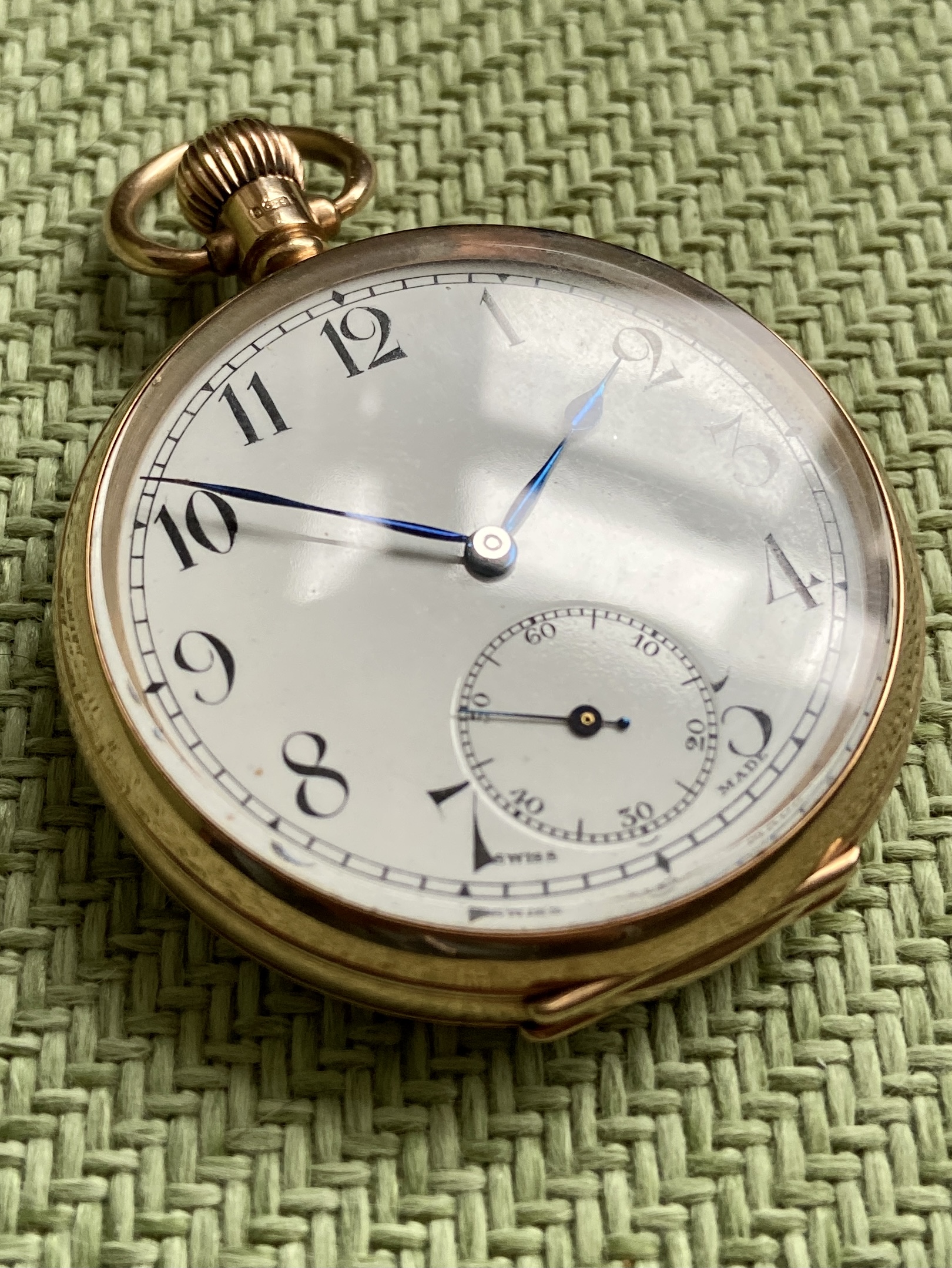 Dennison (UK) 9K cased open face, Hallmark for 1924. Swiss movement by Visible, nice blued hands.