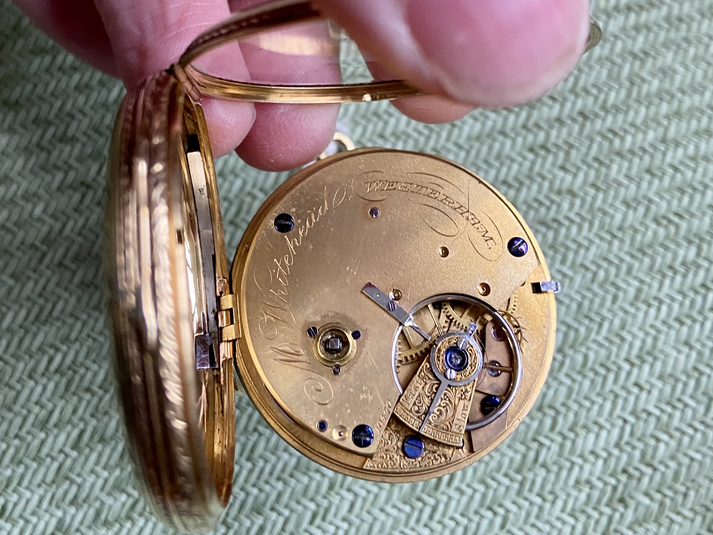 Open face model in 18K gold dated to 1851 by London hallmark. English movement marked M Whitehead, Westerham, which means nothing to me lol. Mens size but quite delicate in build.