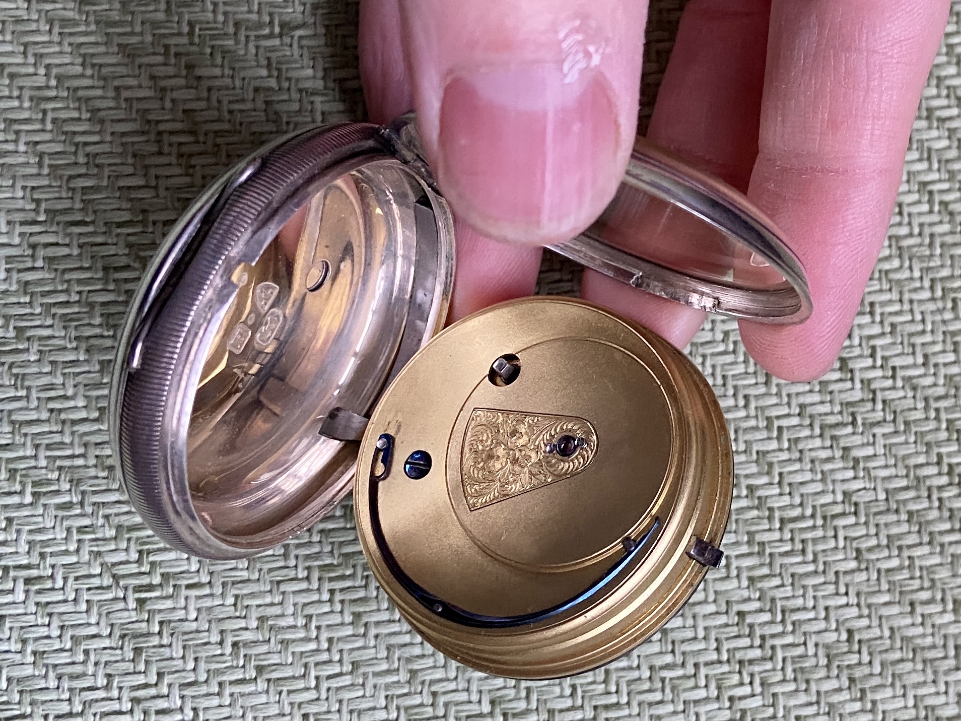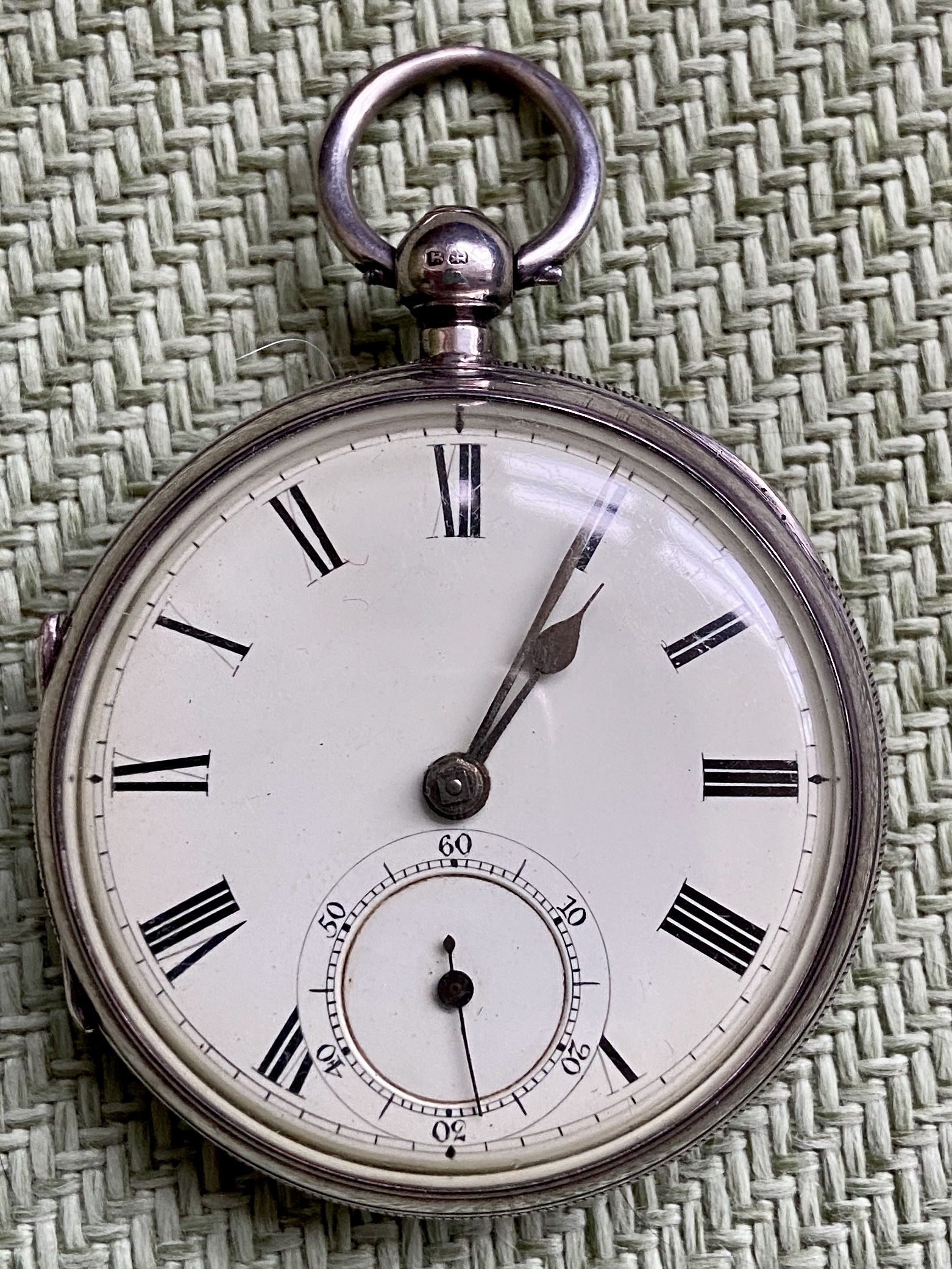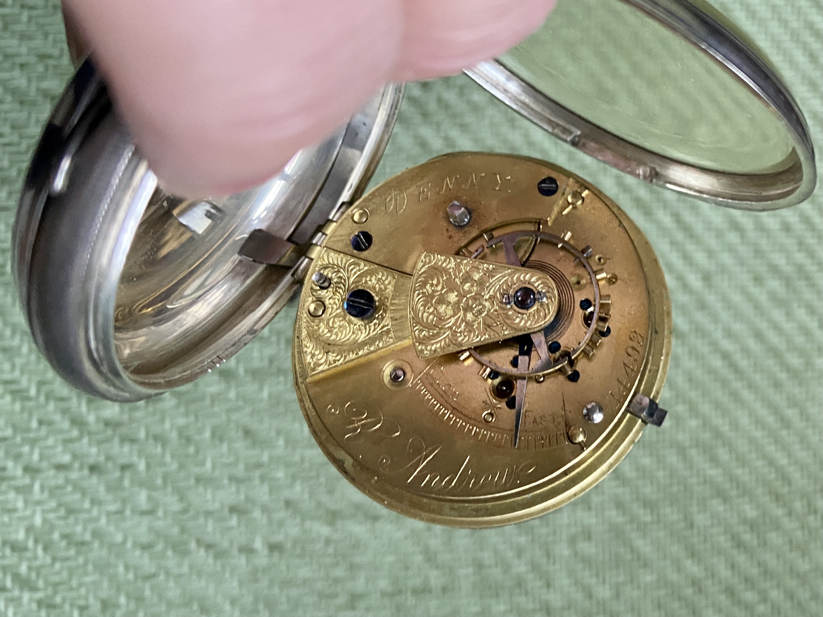 Finally, chunky Sterling silver full face with yellowing cellulose crystal, has Chester hallmark for 1891. Movement, presumably English, has natty removable cover, with R Andrew and Denny engraved on it.