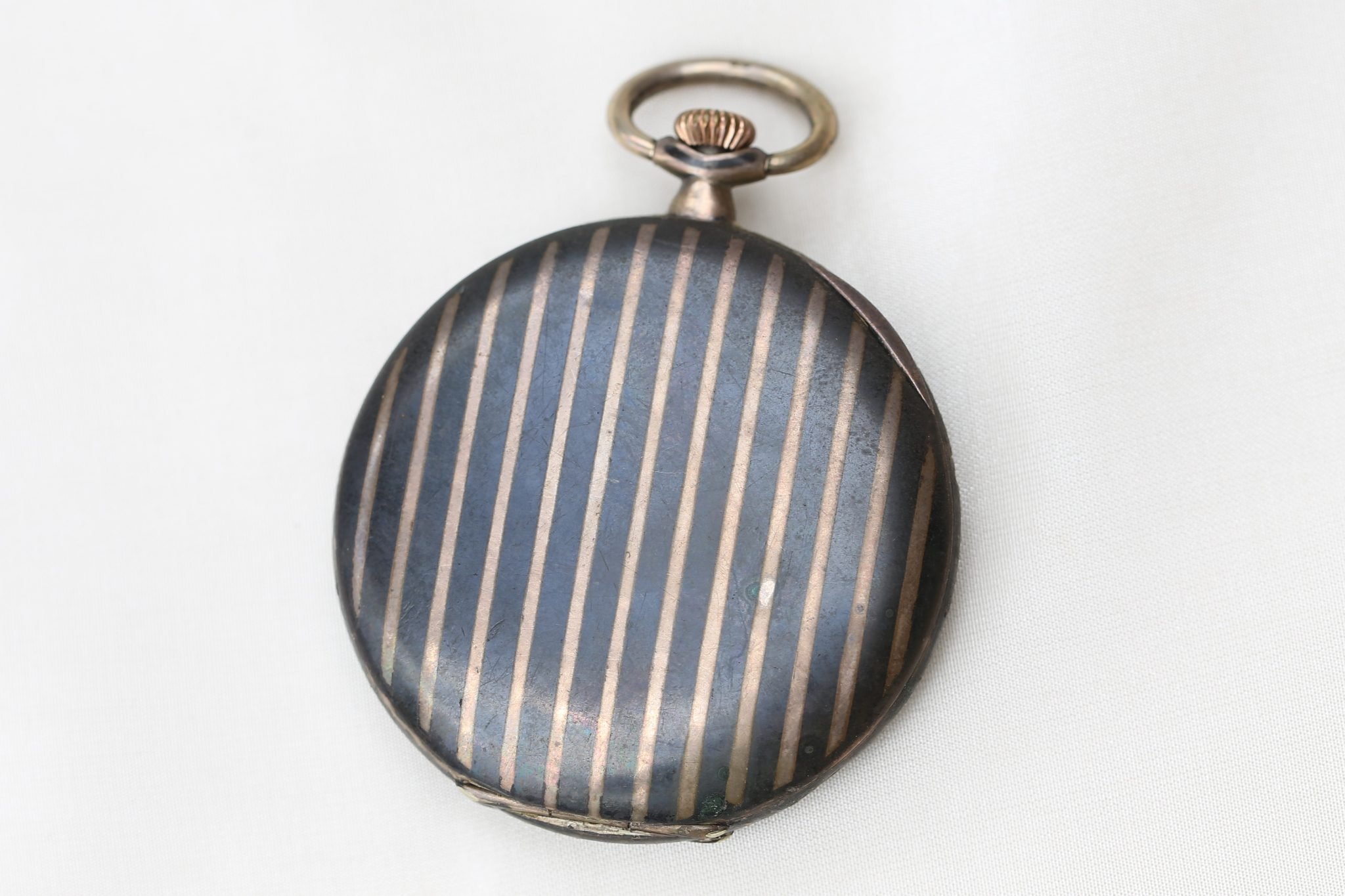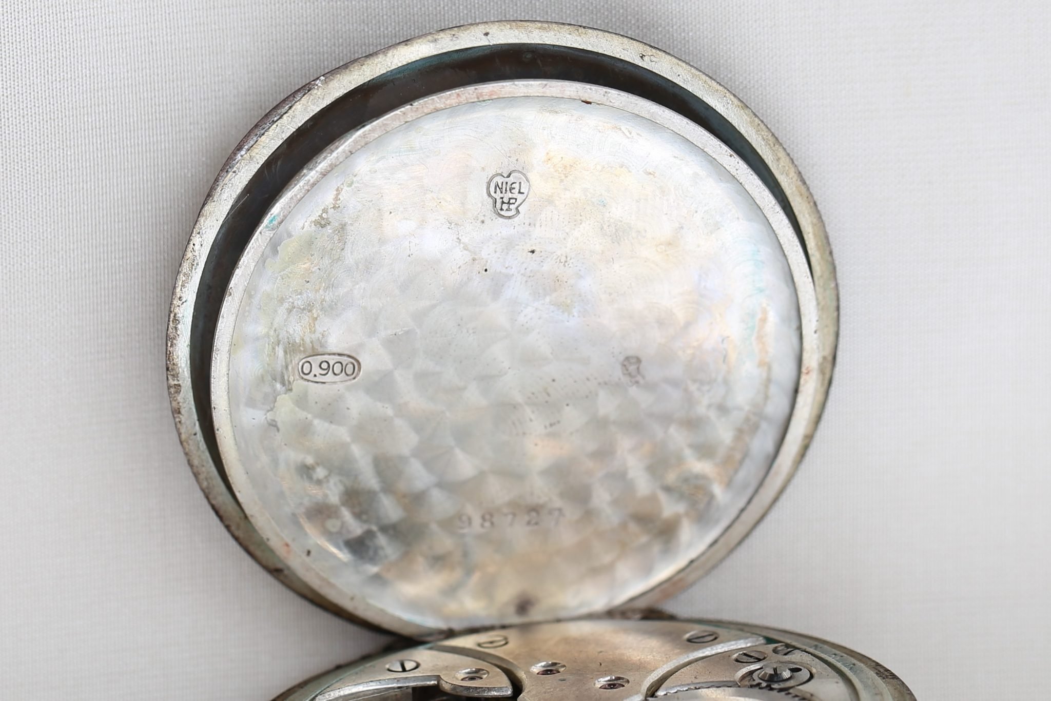 Maker’s mark? Nothing on the movement that I saw. The NIEL inside the case back could mean NIELLO, the dark finish on the case back. Coin silver .900 fine. IIRC, U S manufacturers used .900 coin silver alloy. American case? The movement has a bi-metallic, temperature compensated balance wheel, blued steel Breguet hairspring, and whiplash micrometer regulator, so it would appear to be a touch above your typical orchard run Swiss movement of the era.