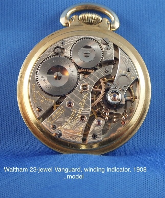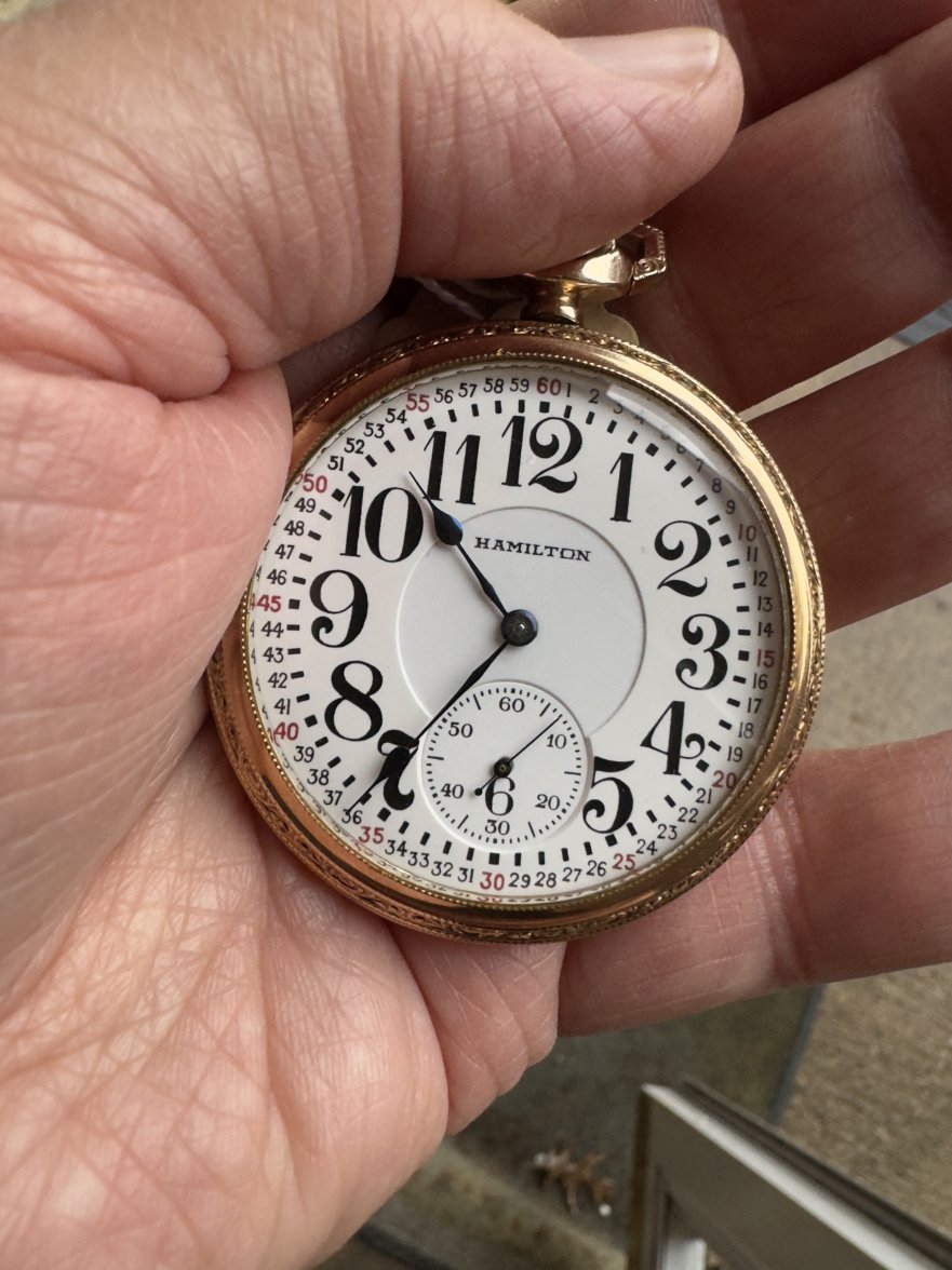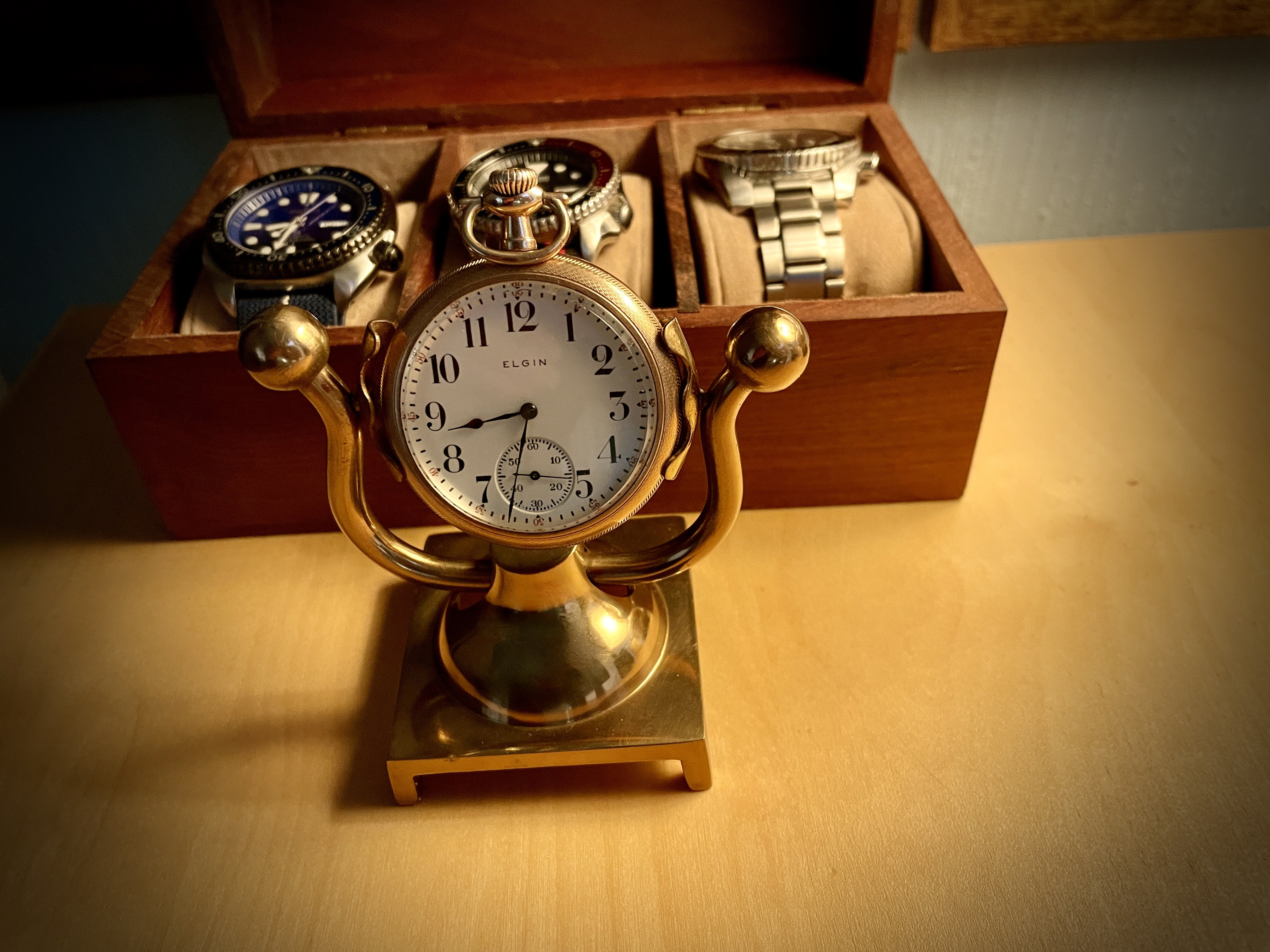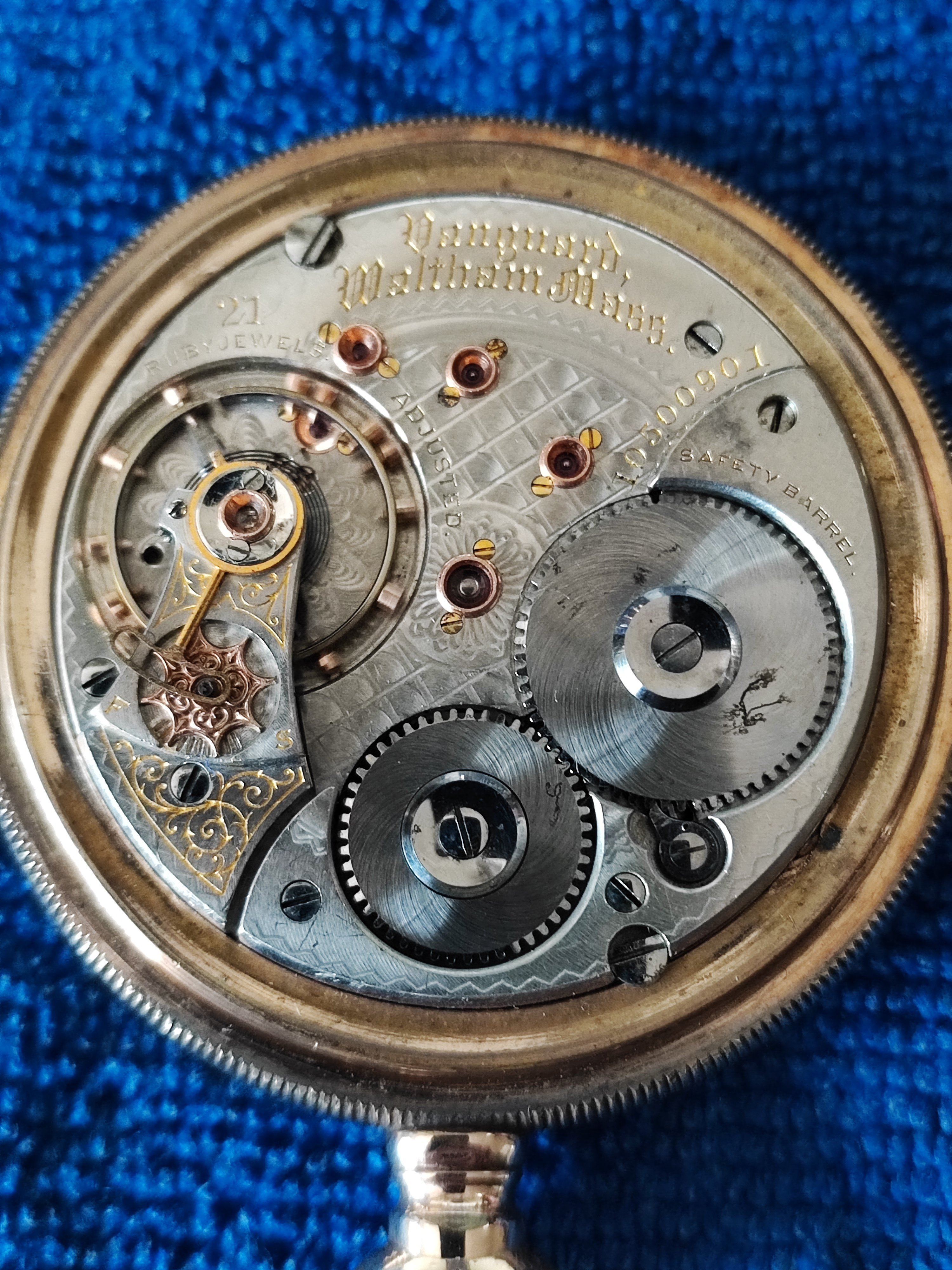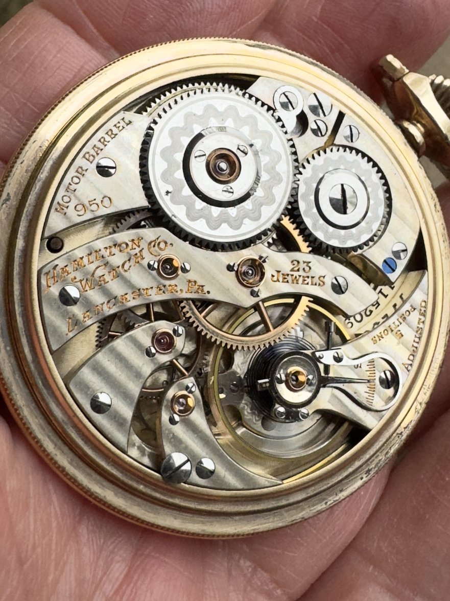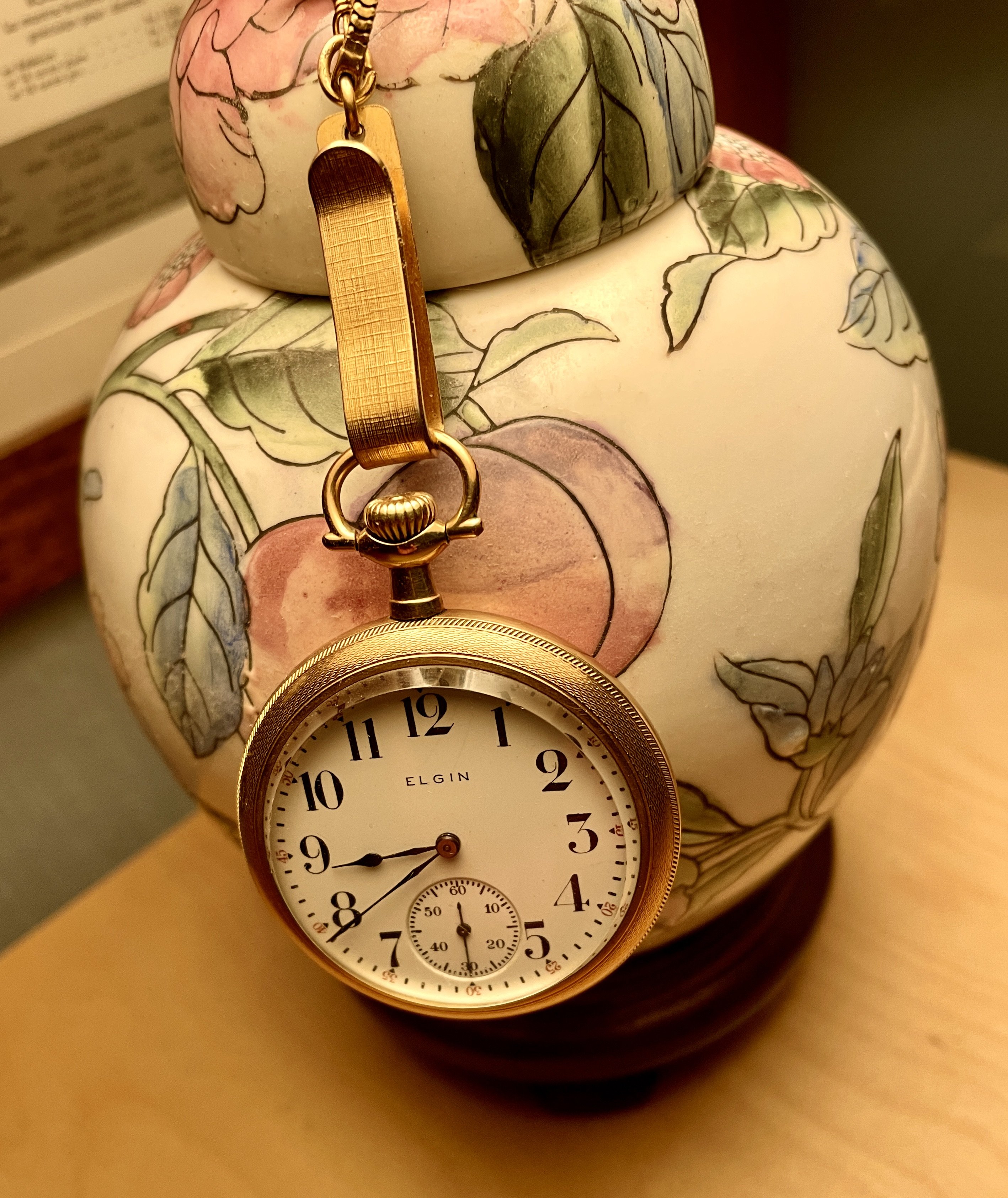 There can’t be too much beauty, can there! My 18-size, 19-jewel Elgin B W Raymond which was never used on a railroad. In your opinion, why might that have been with this watch? This one is from the second run of this model, made in 1903. A watch from Mrs. Cs family.
