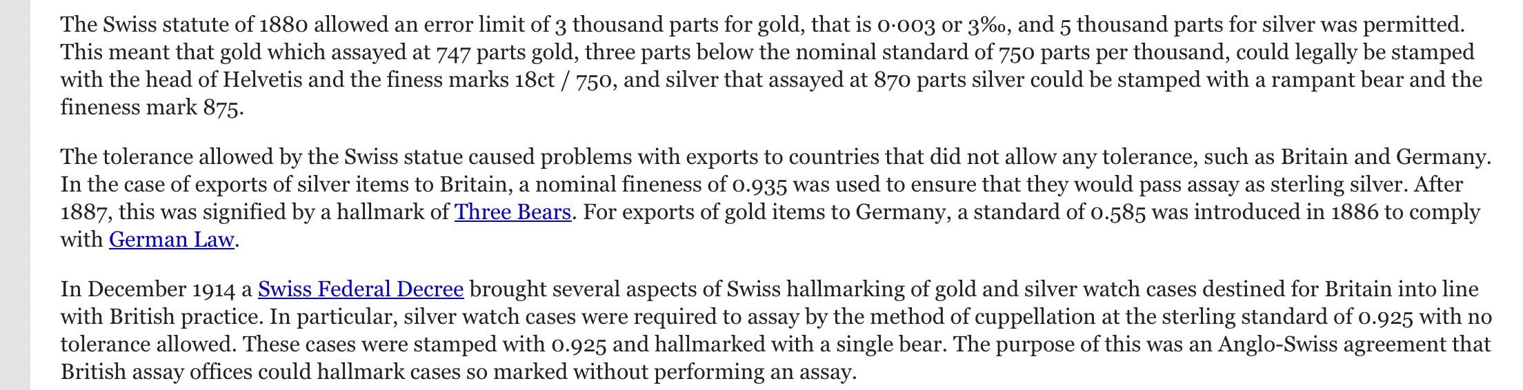 It seems the lowest legal purity for silver in England is 0.925 pure. 0.935 marked on a silver case might have 3 bears, but a silver case marked 0.900 would not likely be exported to Britain. The attached shows three bears accompanied by a 0.935 purity marking.