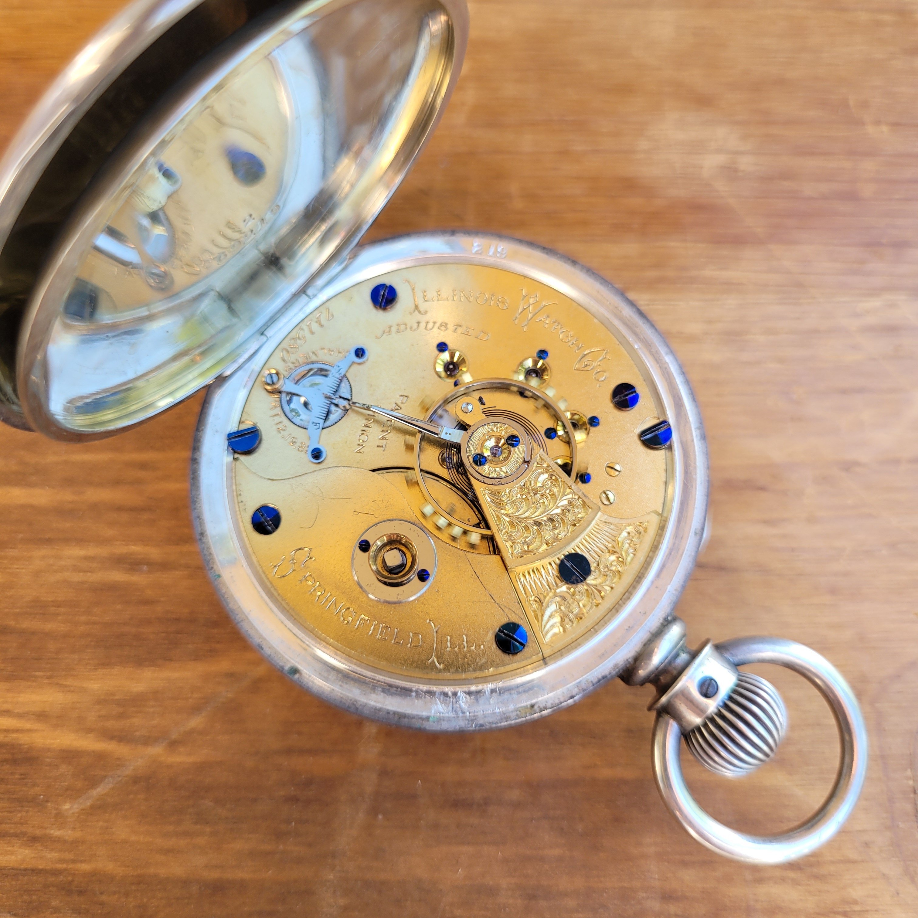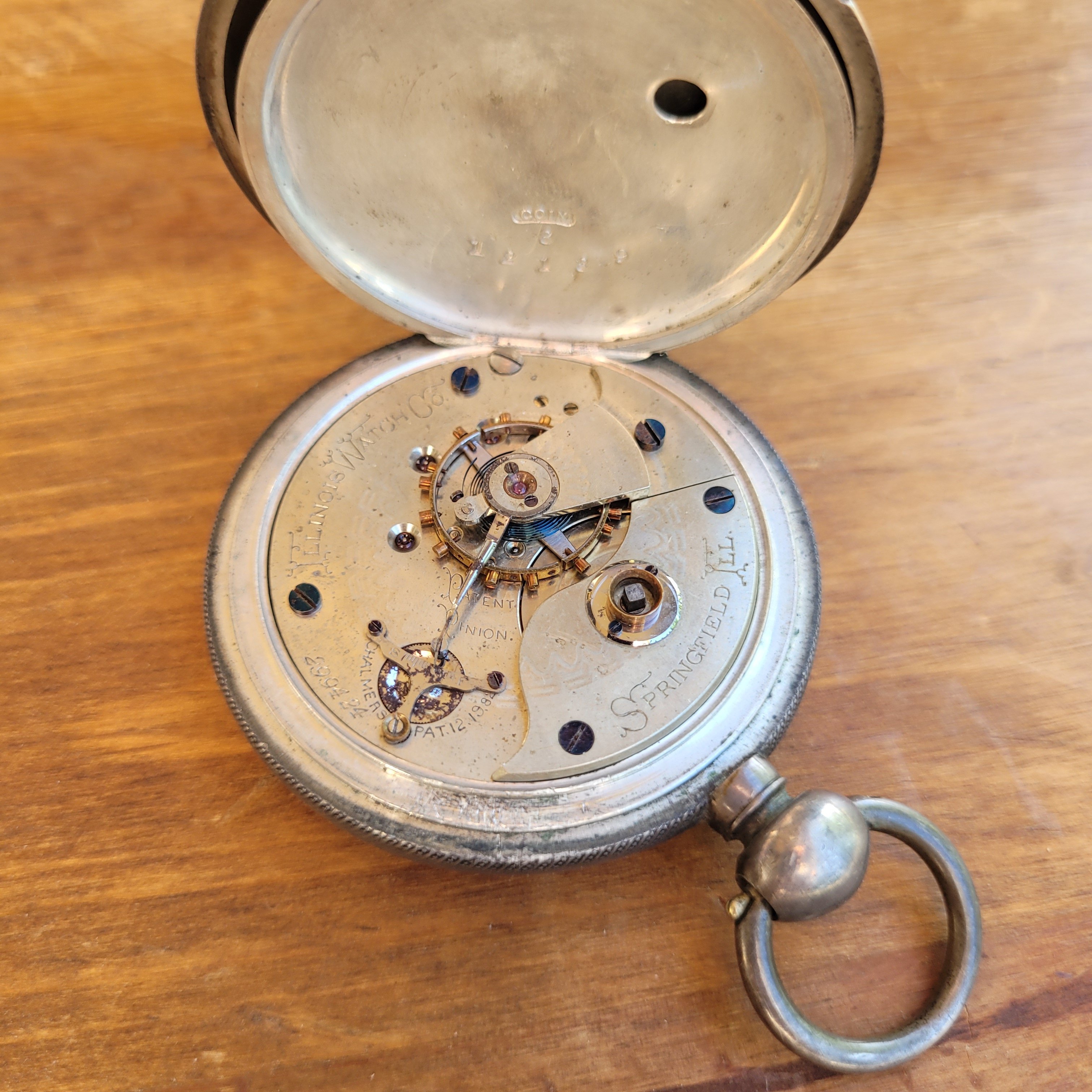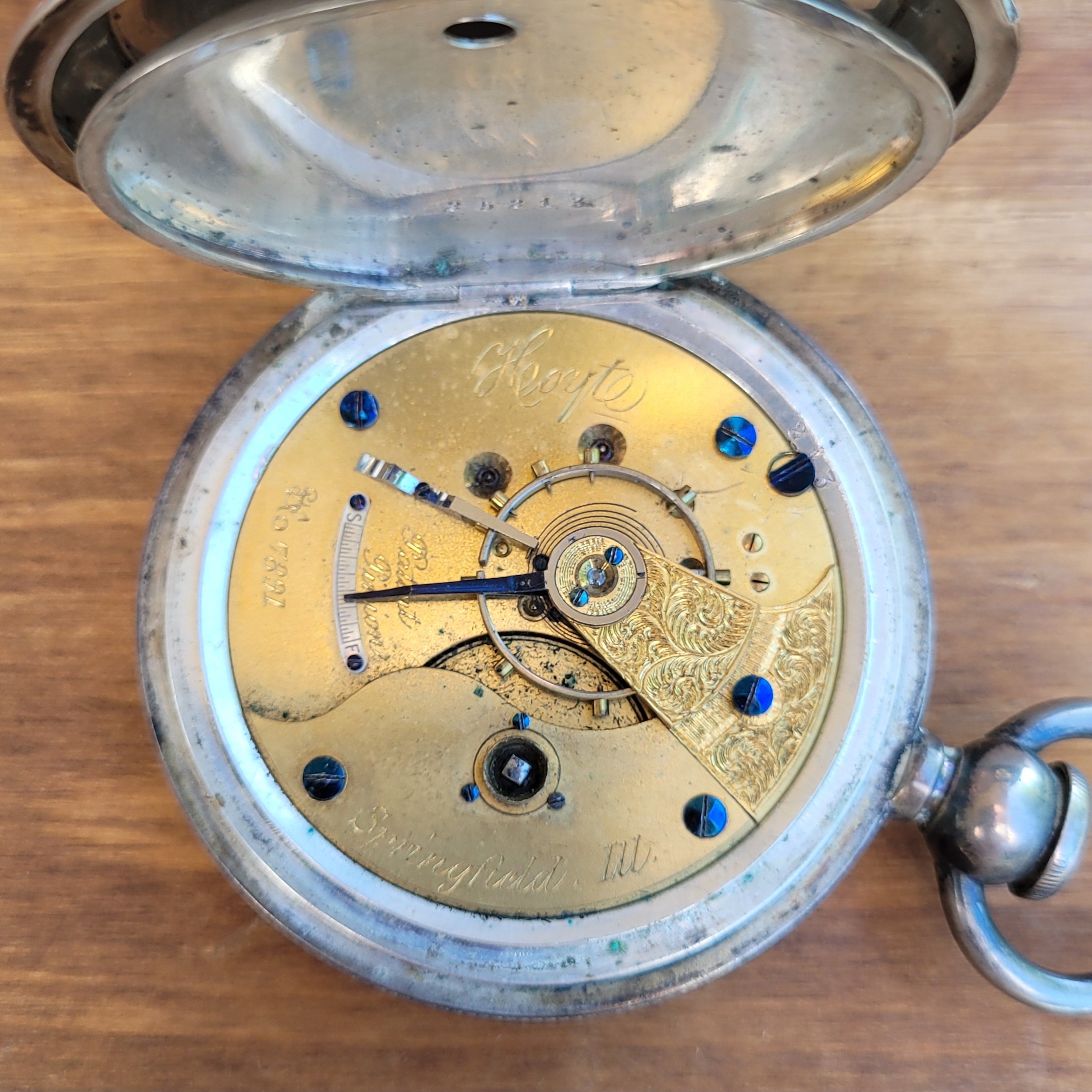 An 1871 Illinois, Model 1, Hoyt, 9J. It was made within probably the first eighteen months of Illinois production. It runs but needs a service.