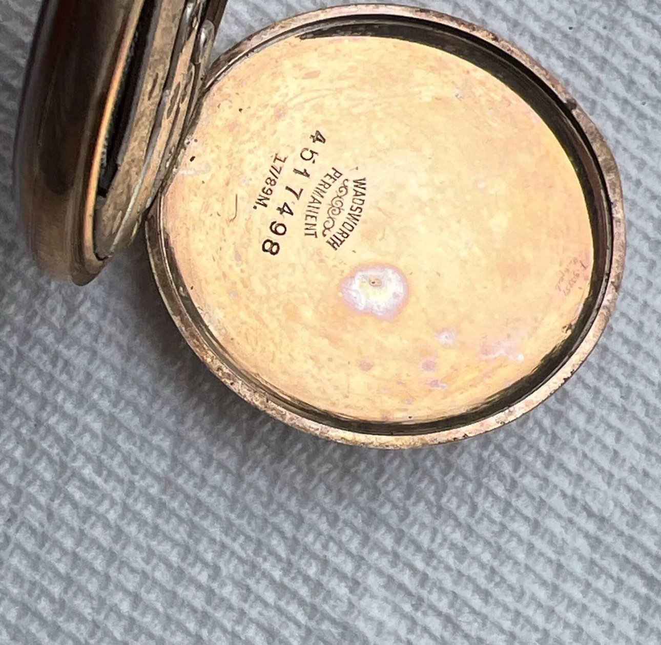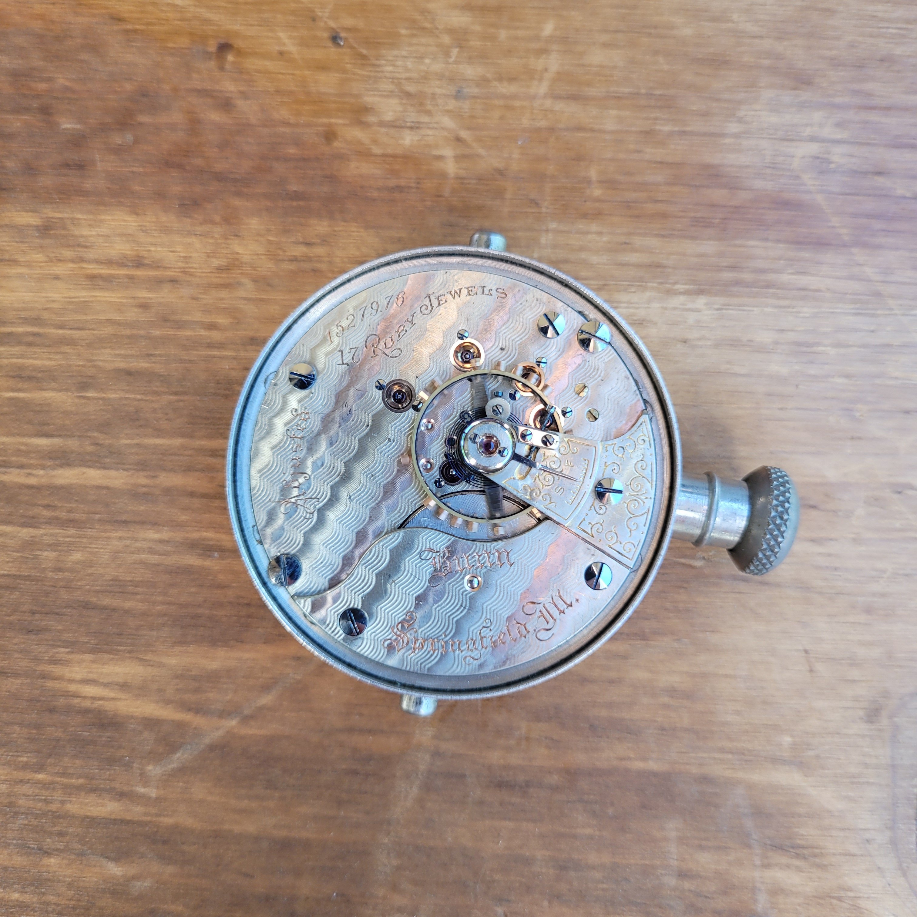 A 1900 Illinois, Model 5, Bunn Special, 17J. RR grade. I really like the two tone wavy damaskeening on this watch, and I wish it was easier to photograph. It's in a display case because I have it's silver hunting case on my bench; I'm finally getting around to repairing a bent hinge.