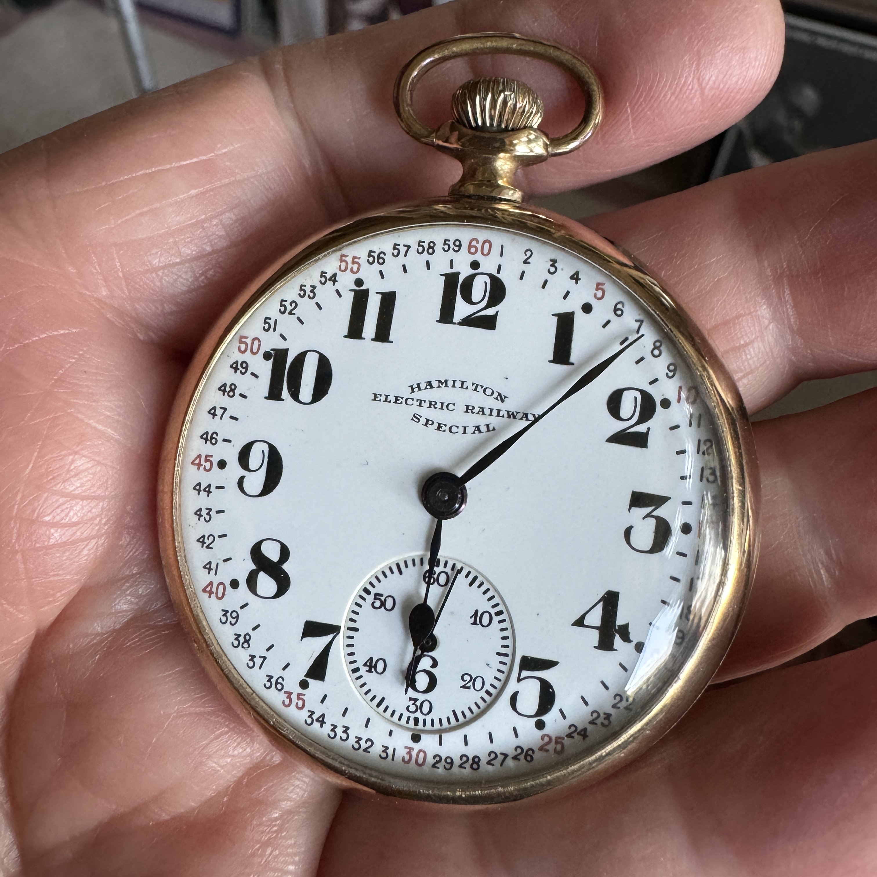 A 1903 Hamilton, 940, 21J. This RR watch keeps an outstanding +1 sec/day, making it one of the most accurate watches I own. When I acquired it it was in a raggedy old case with a bow that kept falling off. I picked up a nice, serviceable nickel case off ebay for it and recased it.