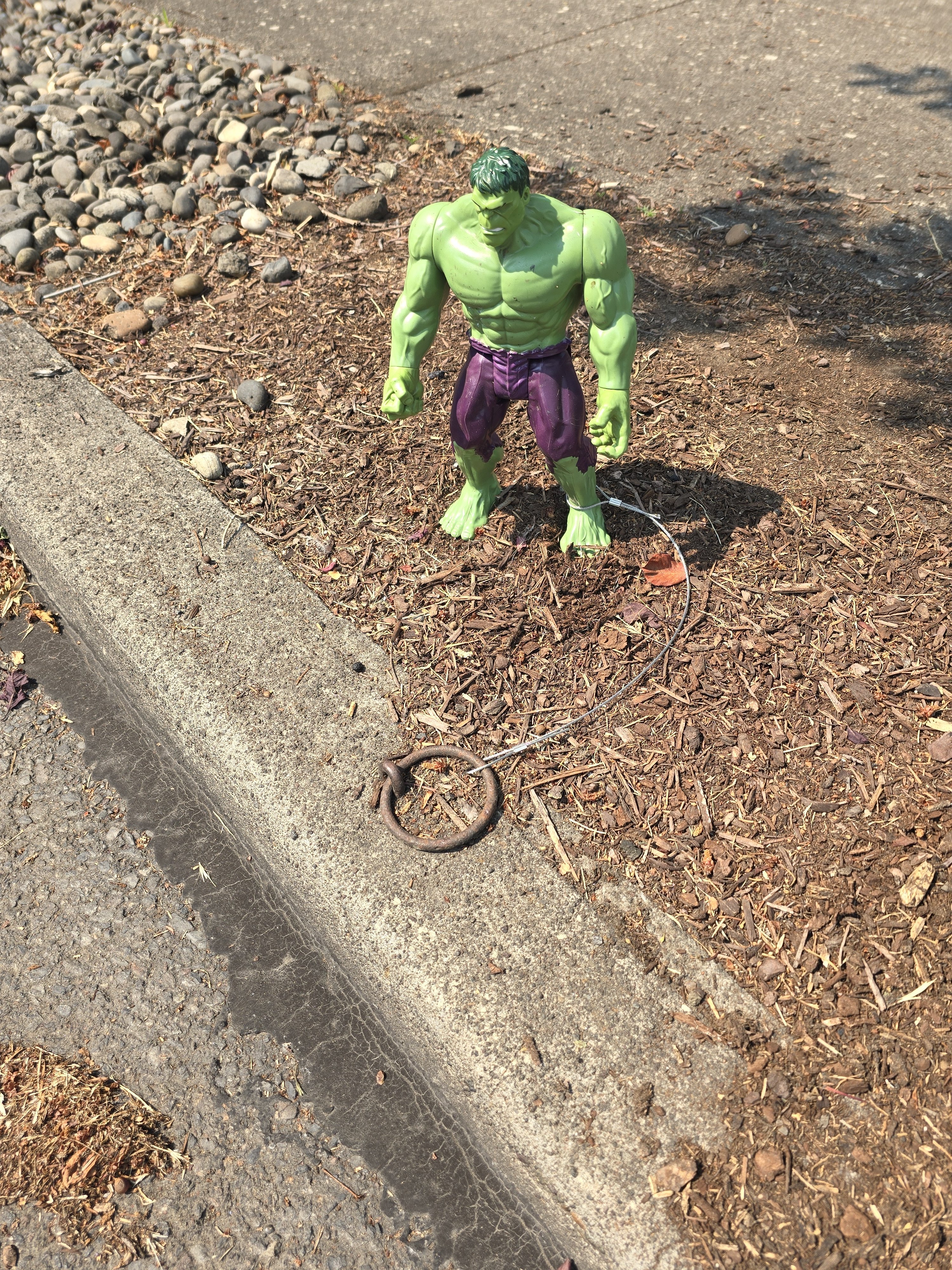 We have old iron rings where people used to tie up their horses. People chain up toy horses but now we get other random stuff too.