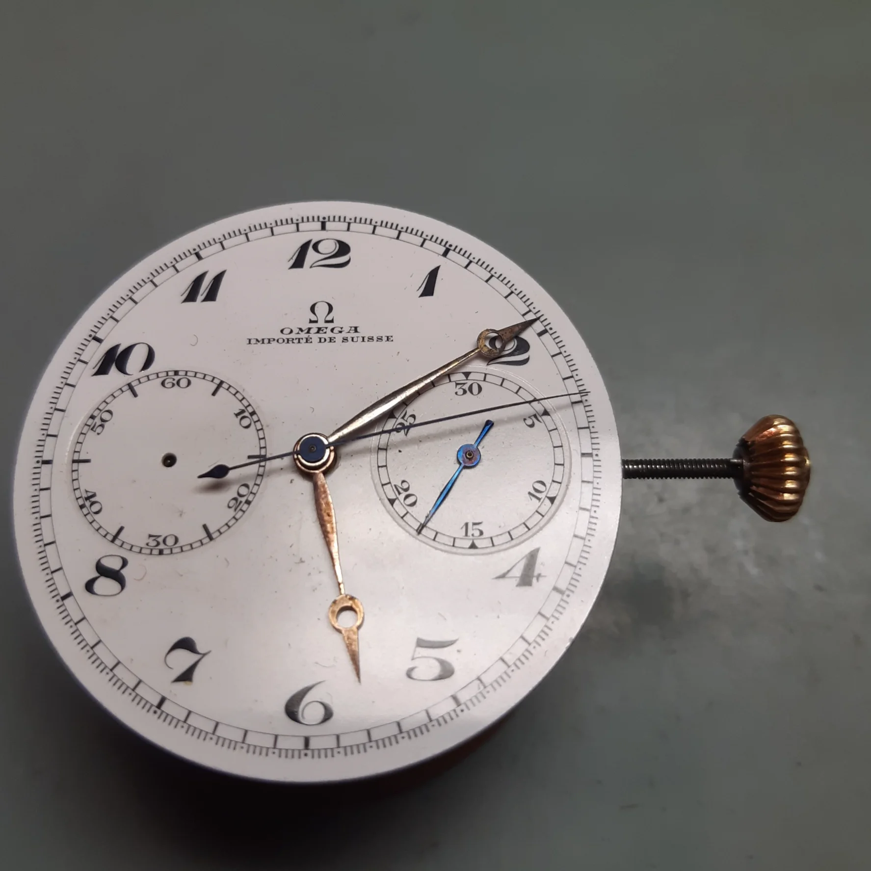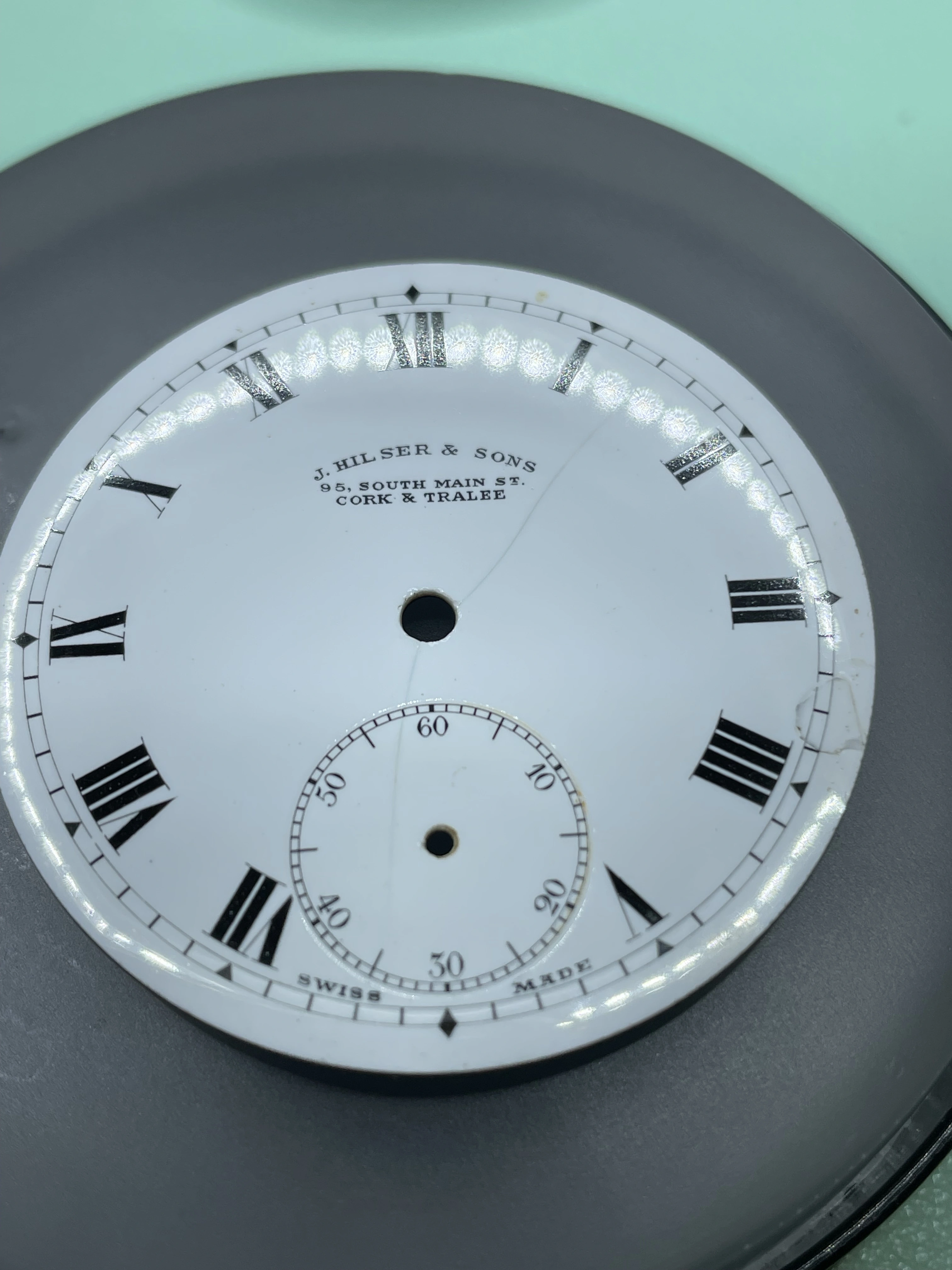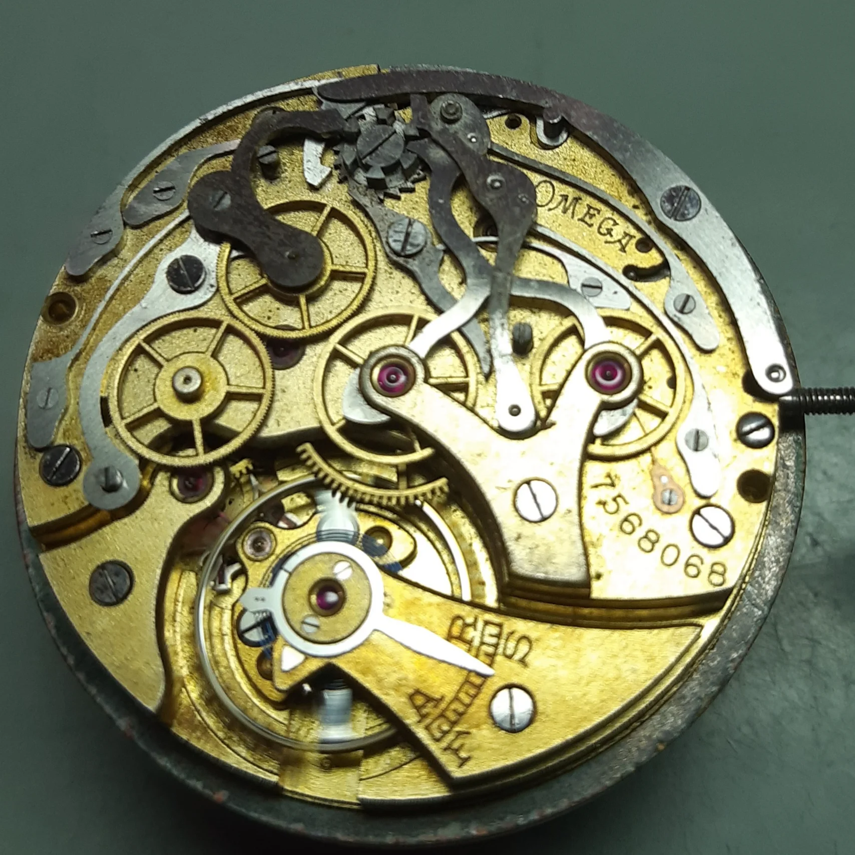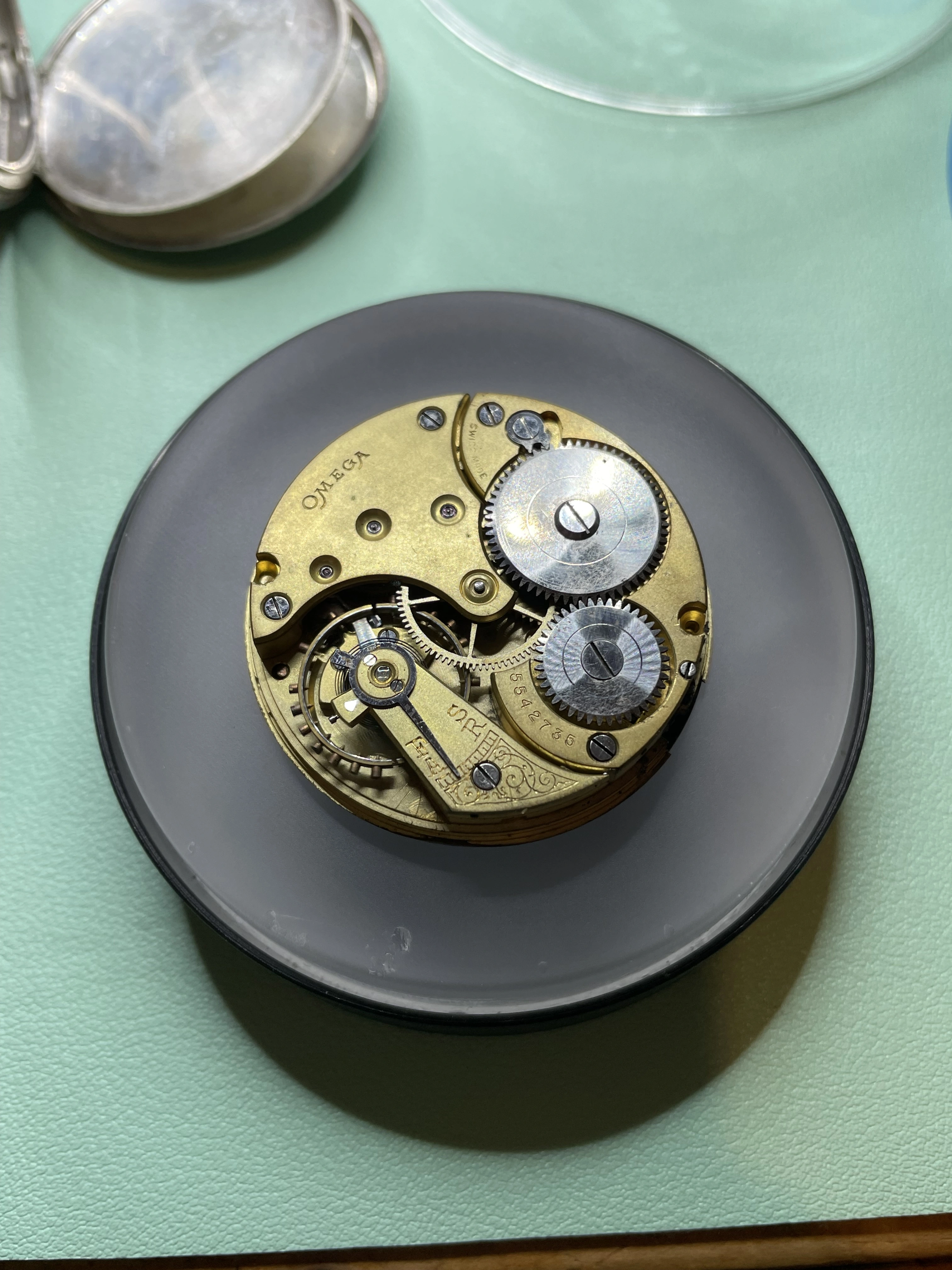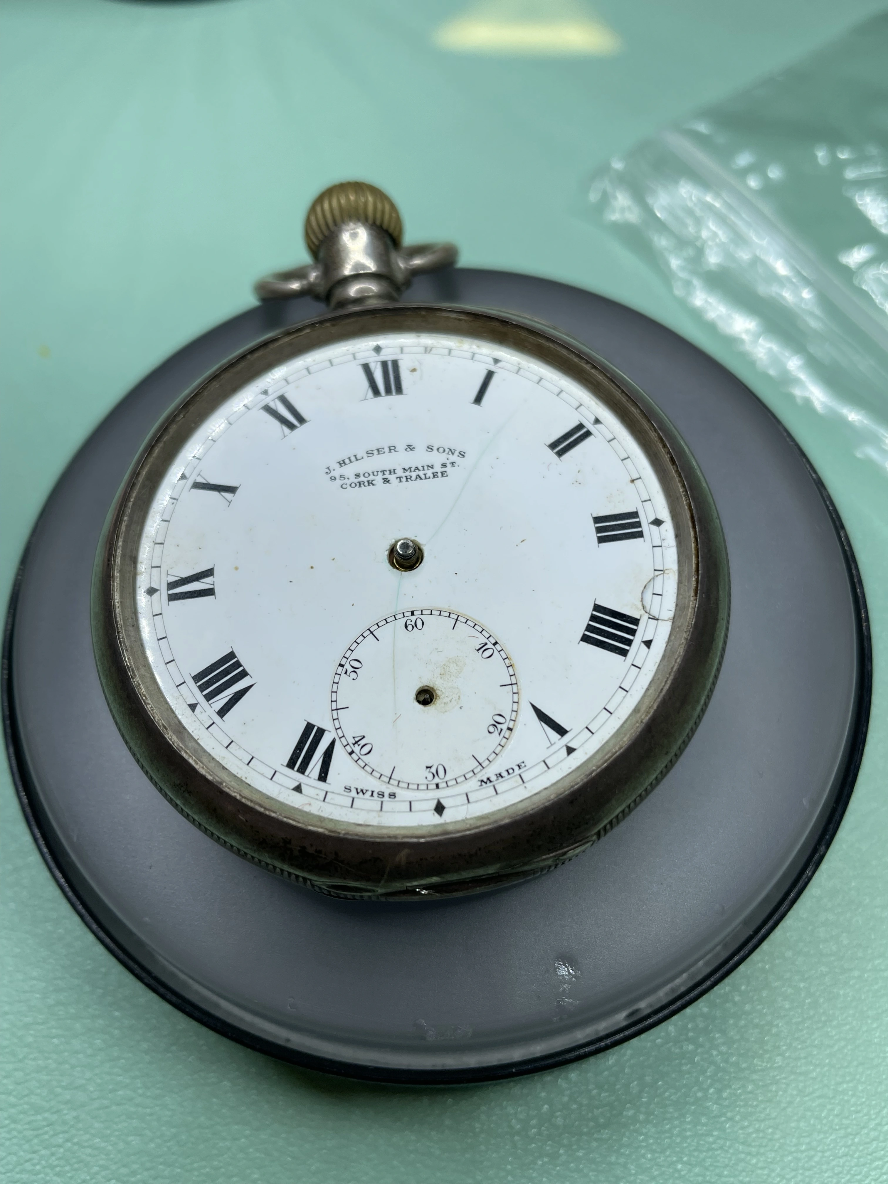 My grandfather’s pocket watch, passed down to my father and then my brother, I was unaware of this until today when he passed it on to me as he has no interest and is aware that I have. It is an omega movement cased in a Dennison case, with the dial marked by a local jeweller, Hilser’s here in Cork, from circa 1916. It’s not anything of great value but am absolutely thrilled to have it. It’s pretty dirty and dry so I’ll give it a good clean and put it on display, it’s in pretty good condition, working with all jewels and pivots etc intact.