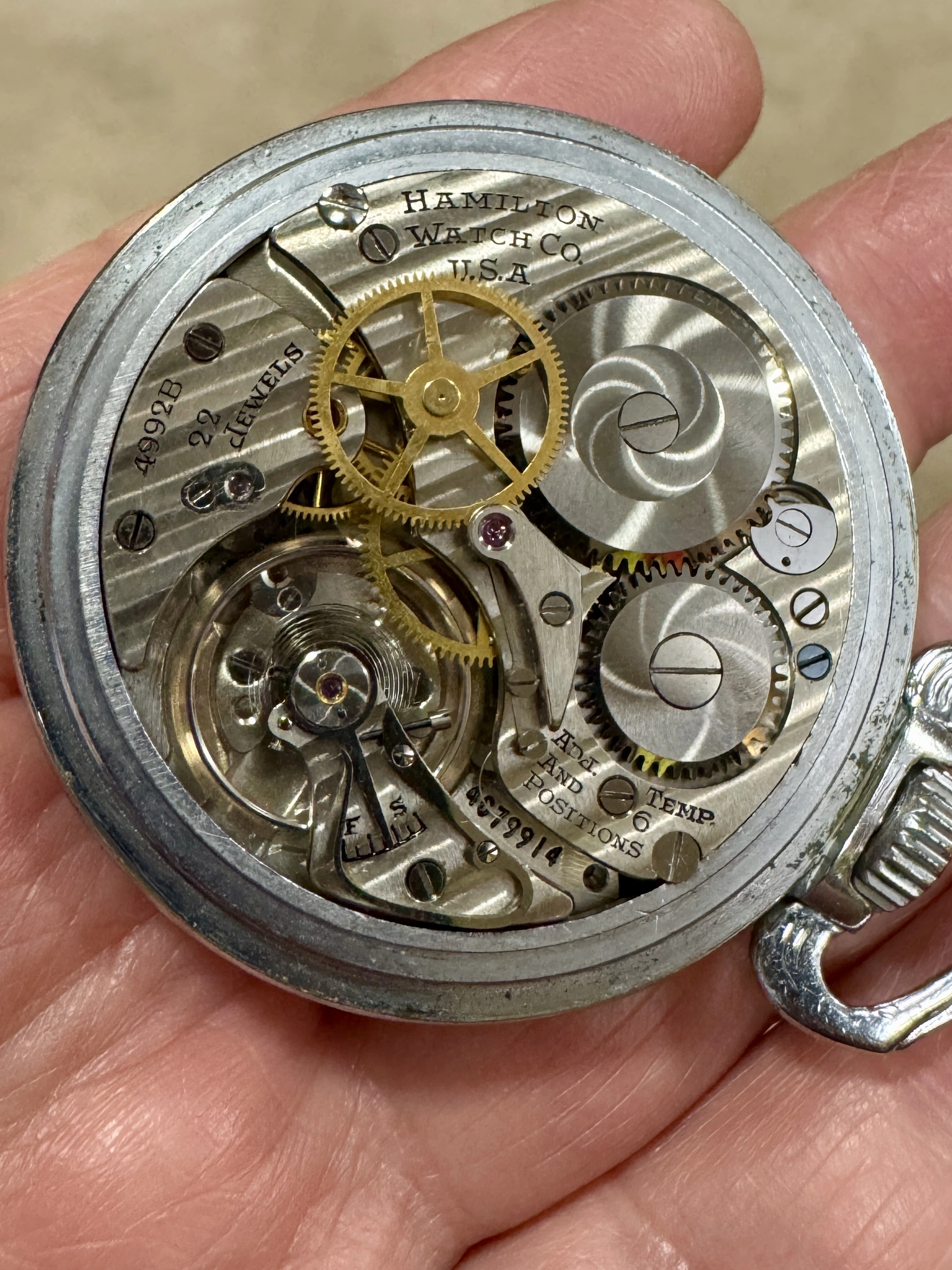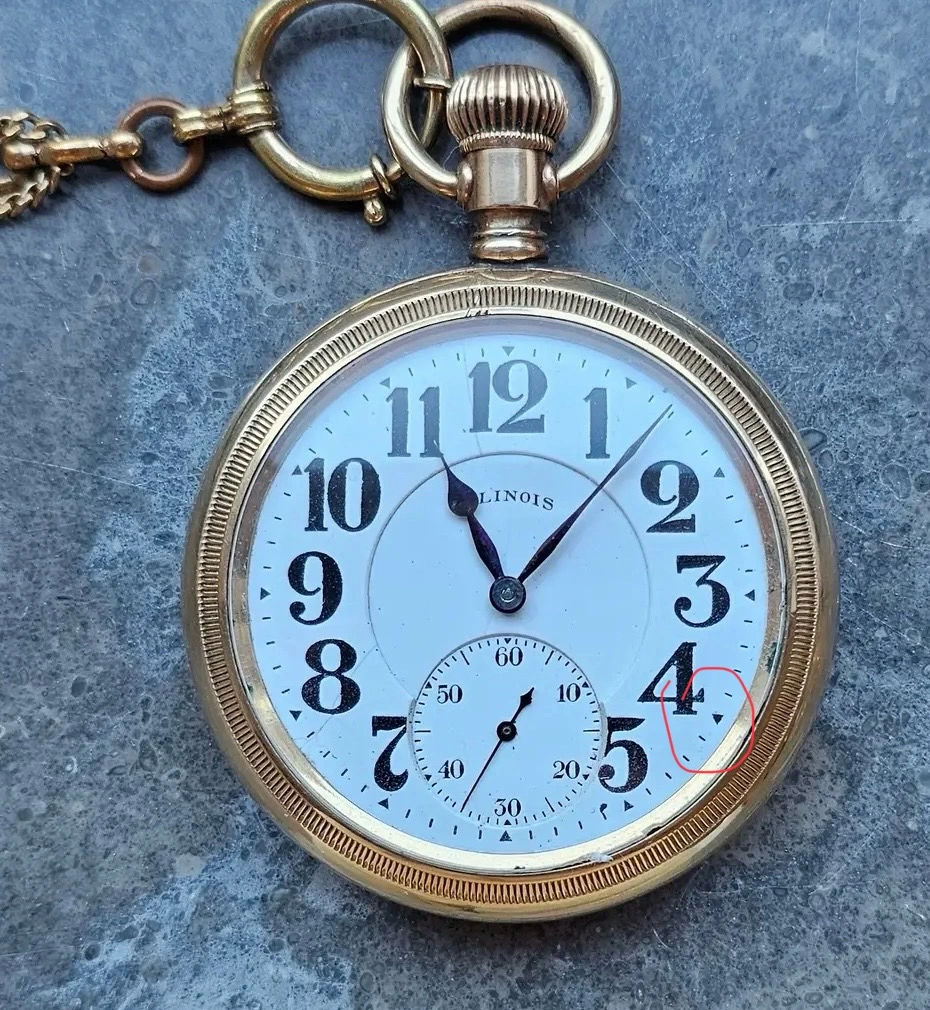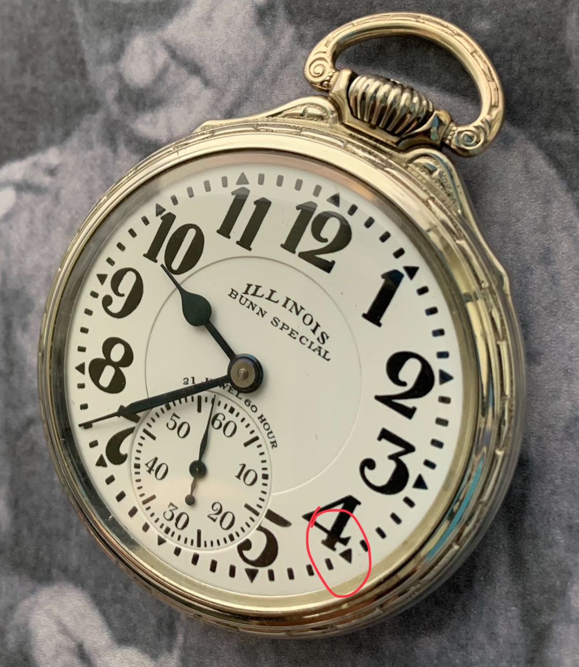 When Hamilton bought Illinois, they changed these markers to face outwards. This is my 1929 Bunn Special Type 111b, post-Hamilton takeover, with hour makers facing out