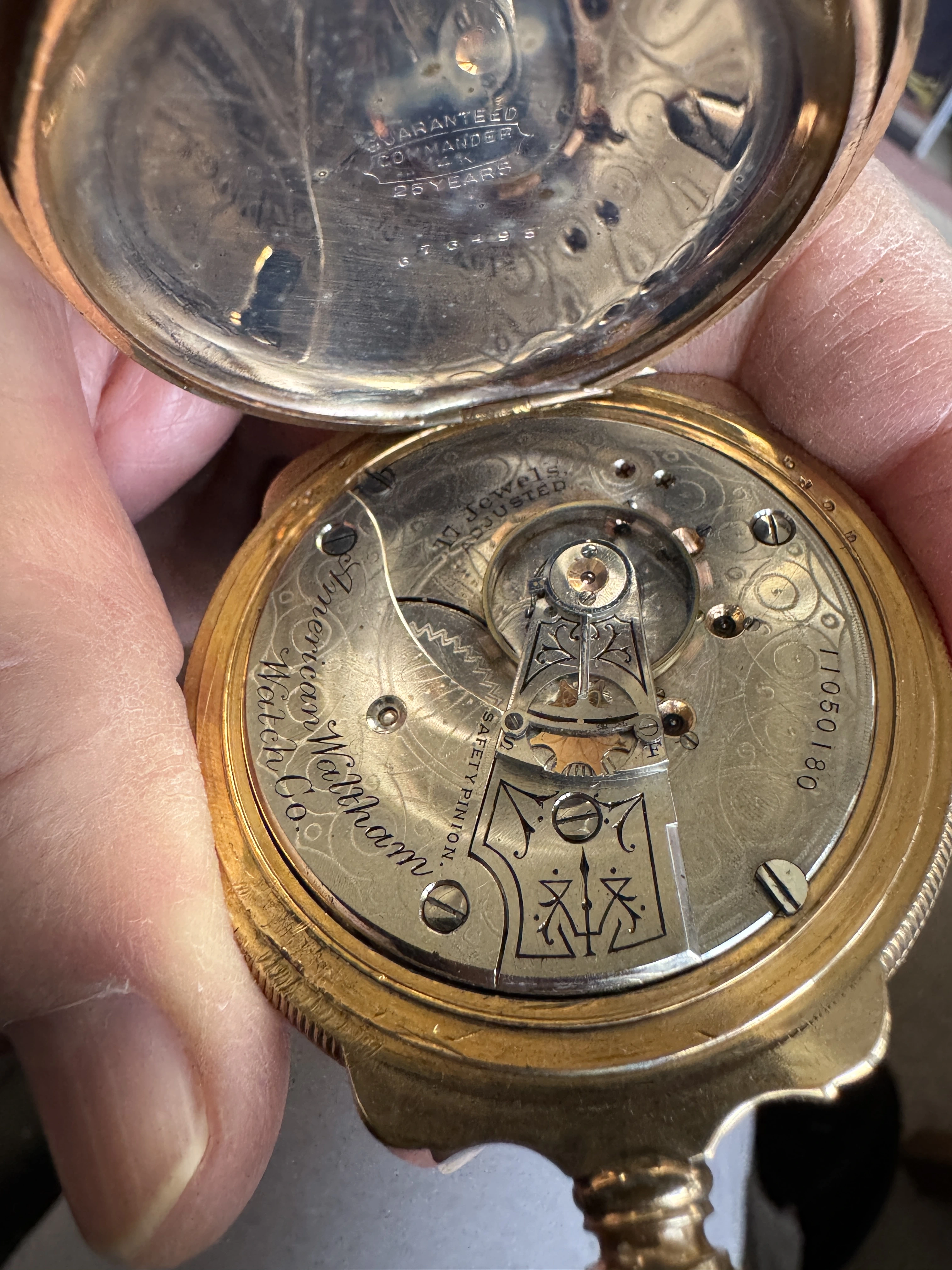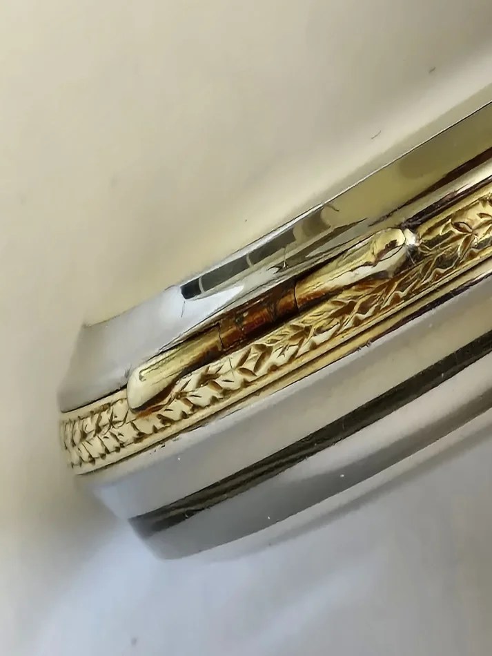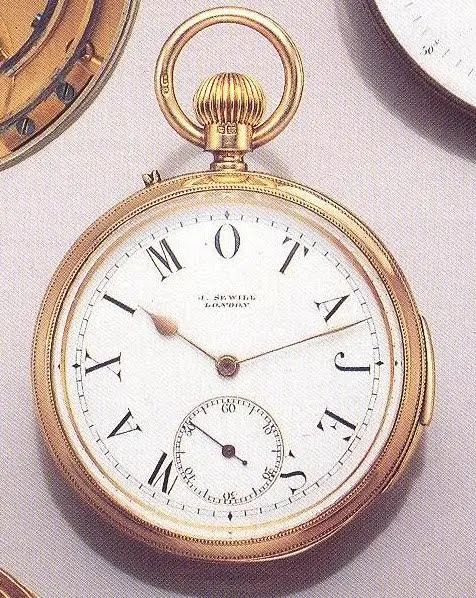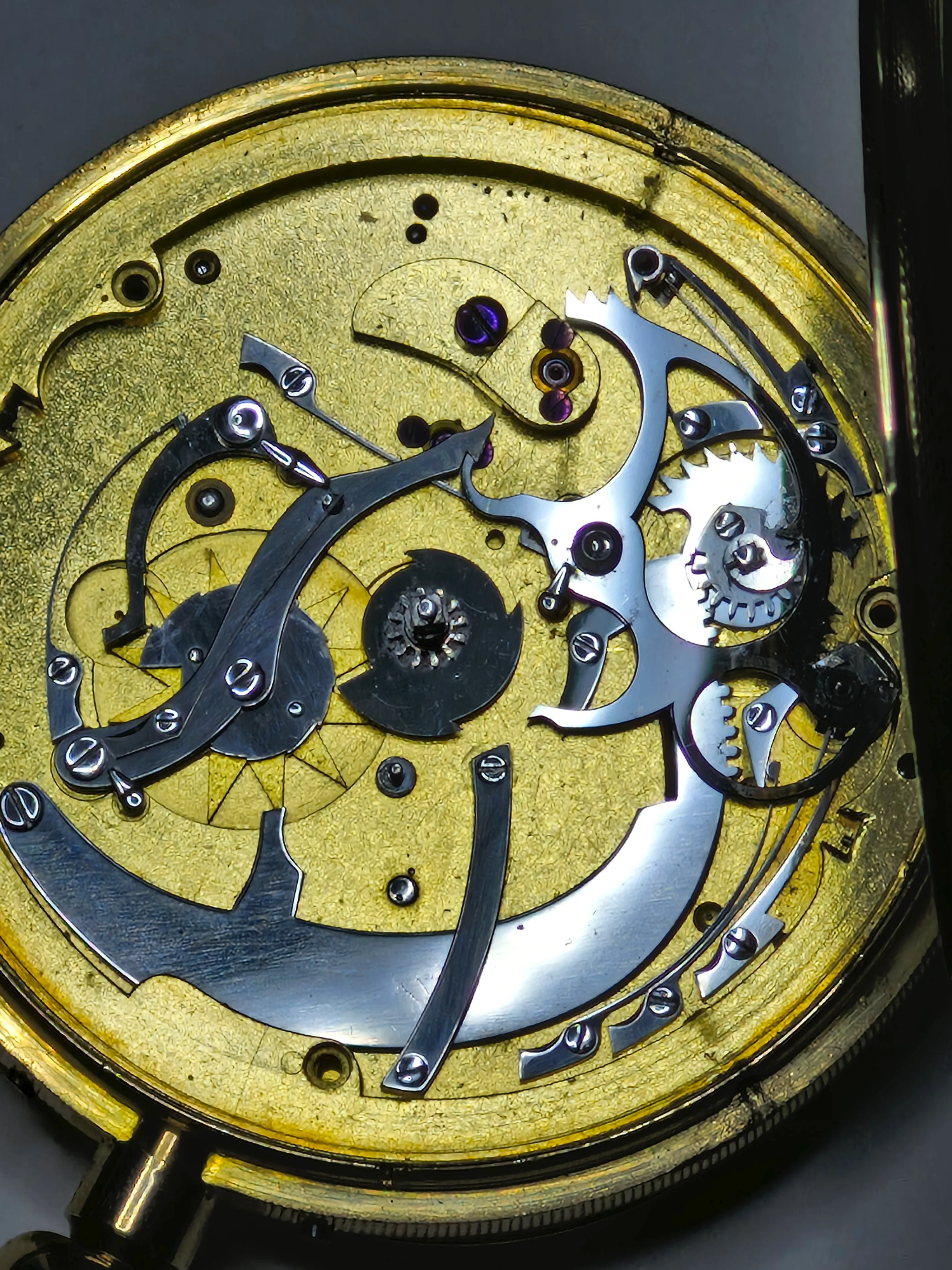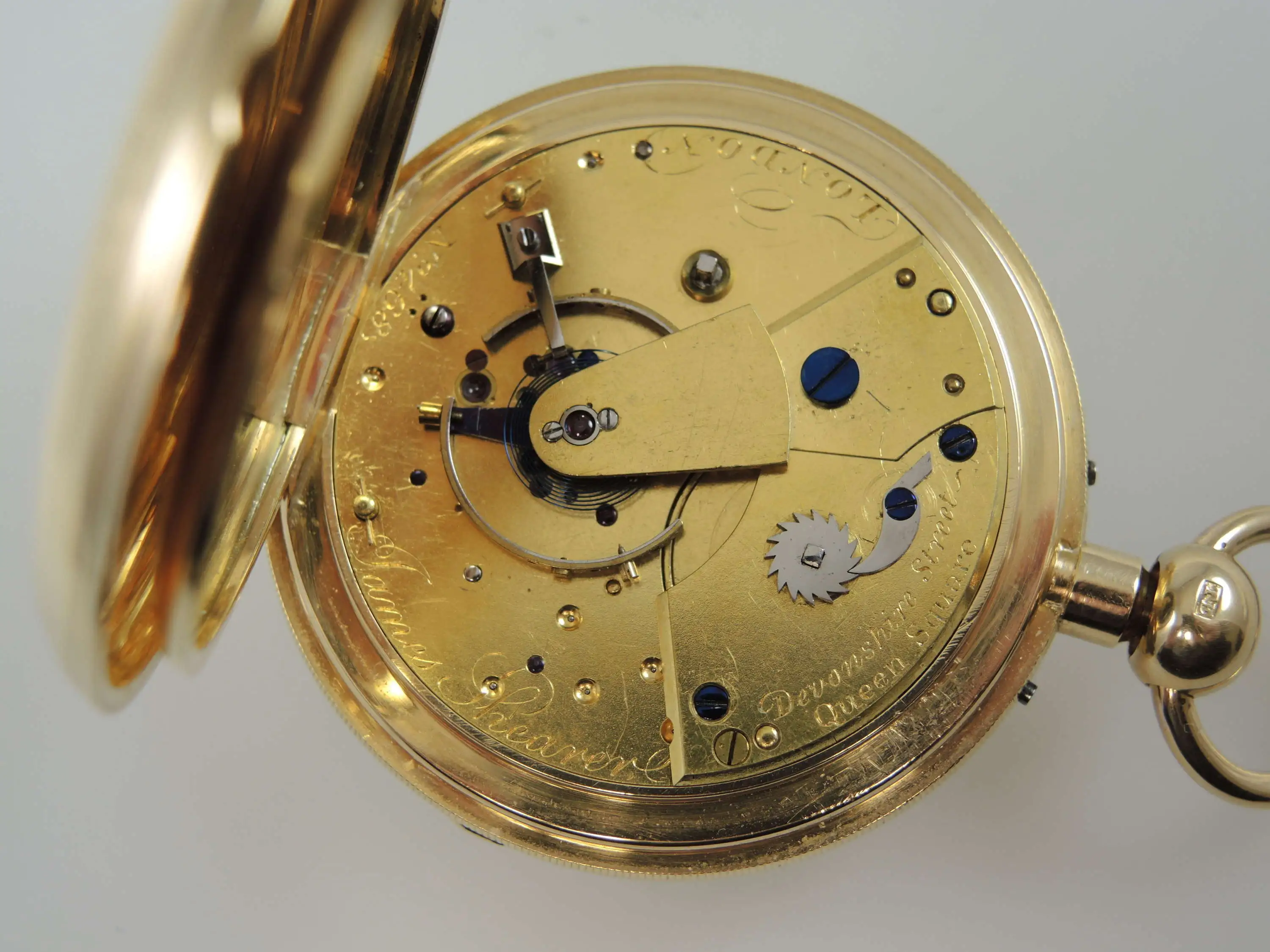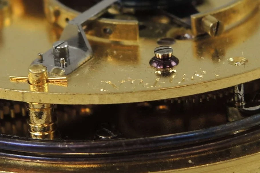 Regarding the escapement, it has a cylinder escapement and this seems very unusual at the time to be combined with a free sprung (early) Pennington compensation balance. This was what caught my attention initially. Close inspection of the movement then revealed that it either initially was a detent chronometer, or that the raw movement was designed to be fitted with both kinds of escapements as alternatives. The only tell tale is that holes for steady pins and a fixing screw for a detent foot are provided. The cylinder escape wheel is placed exactly where the detent escape wheel would have been. But there are speculations possible only. At that time English cylinder escapements were highly regarded (and very fine executed). And a customer might have chosen to prefer a cylinder escapement due to the fact that this is self starting, whereas a detent escapement is not, and even may stop running occassionally upon a "matching" movement of the watch (in most cases rotation around an axis of the balance). Insofar the cylinder escapement is the more practical escapement. On the other hand, the locating pins of a detent would have been placed in the plate after having made the detent. This would point to a later conversion. But if the detent was broken, it is rather unlikely that the customer, who had the money for such an expensive case, would not have the funds for having a new detent being made. But perhaps the customer had made the experience that the detent escapement occasionally stops, and upon needing to have the detent repaired chose the conversion to cylinder escapement for the above reasons.
