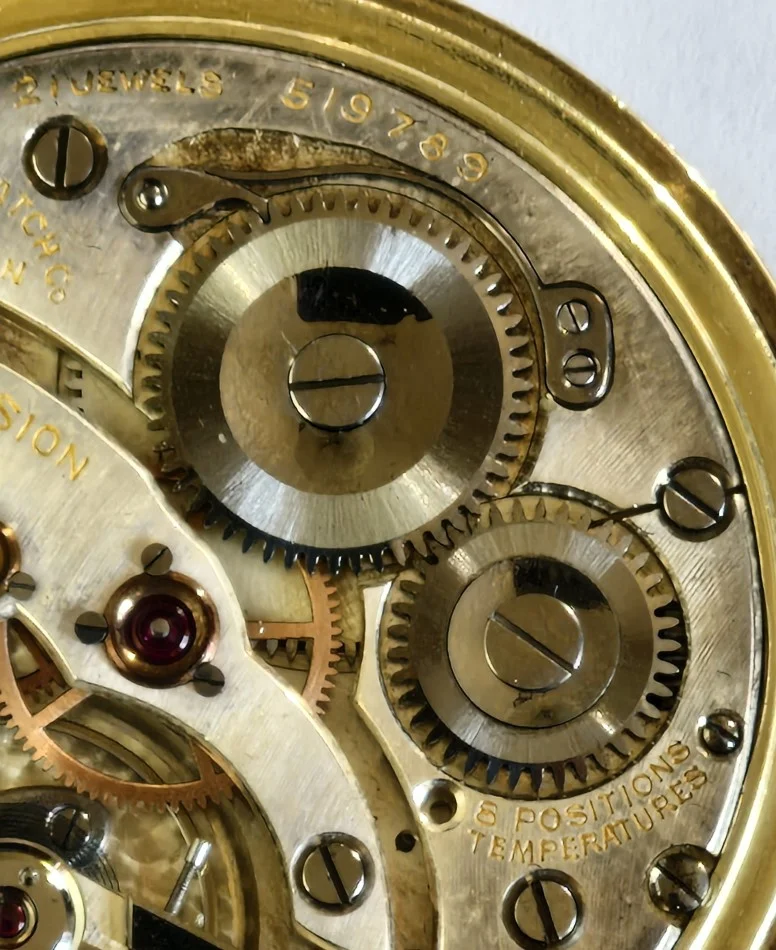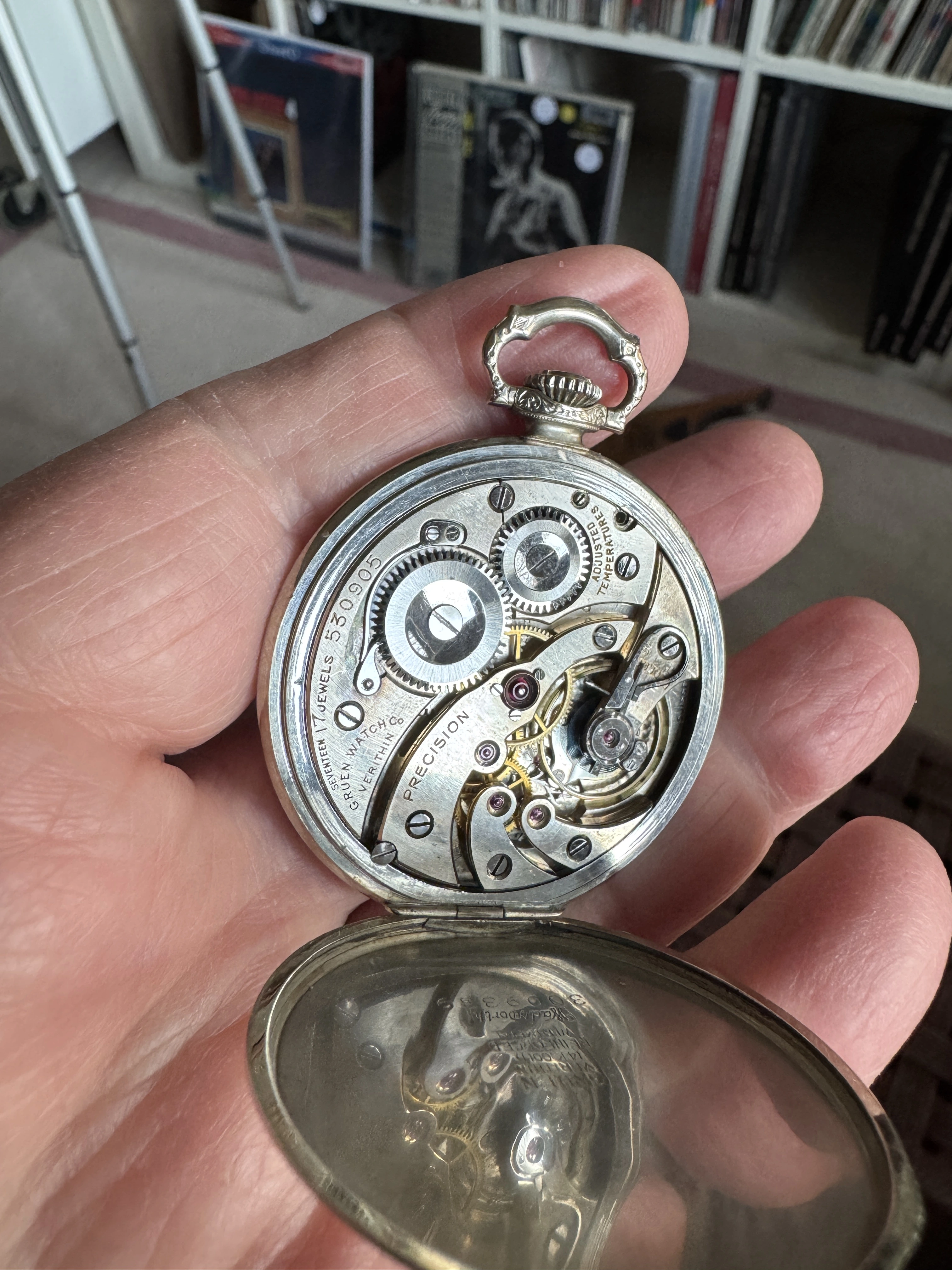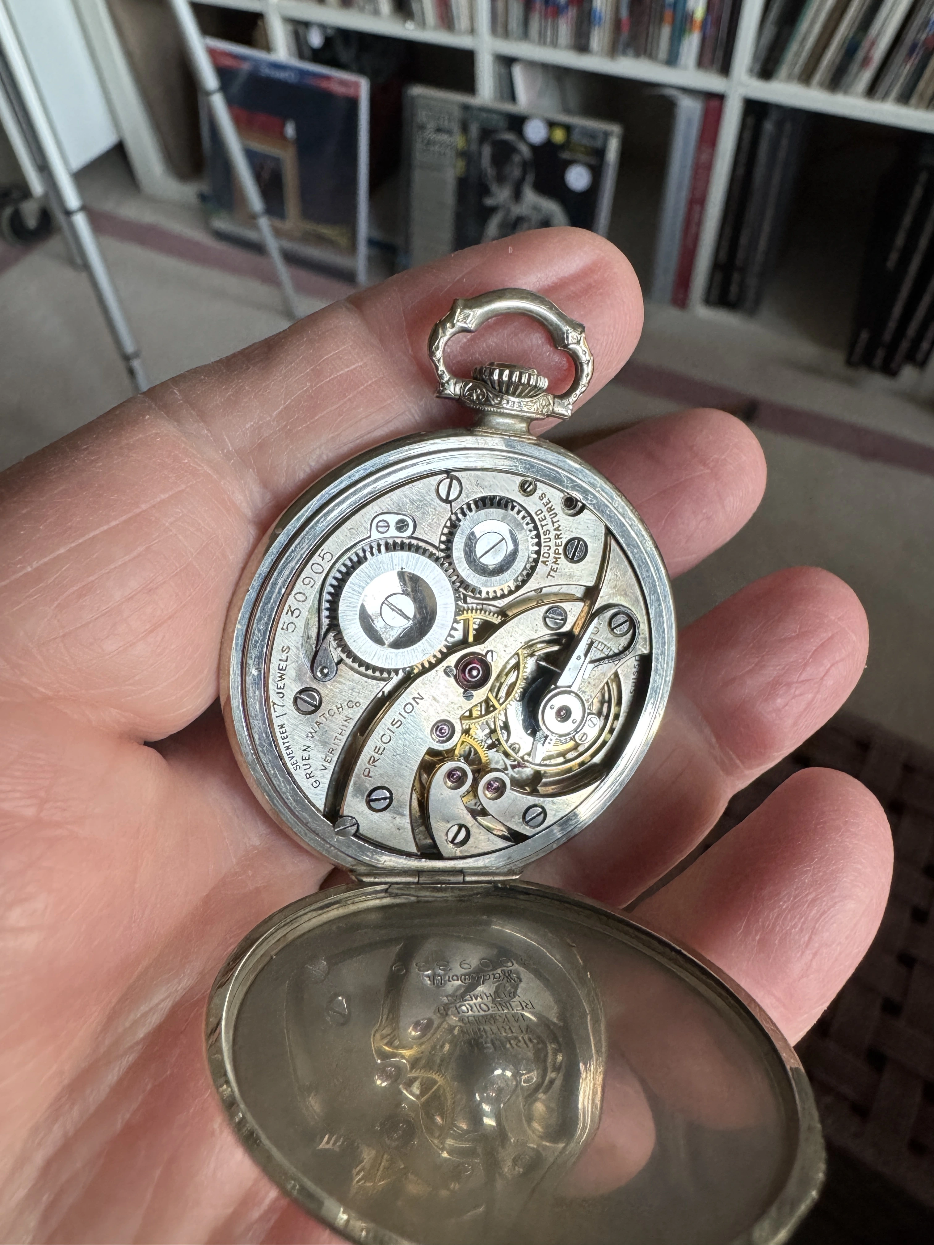 I recently won an auction on an American brand, which is lesser known for pocket watches. A Gruen Empire 26 from 1922, the case American (Gruen) in 14K white and yellow gold. The movement is caliber V1.5, the Gruen top of the range Swiss made movement. 21 jewels, 8 adjustments (5 positions, 2 temperatures and isochronism). And in really lovely condition. Even the glass seems original and of the bulleye kind (crystal).