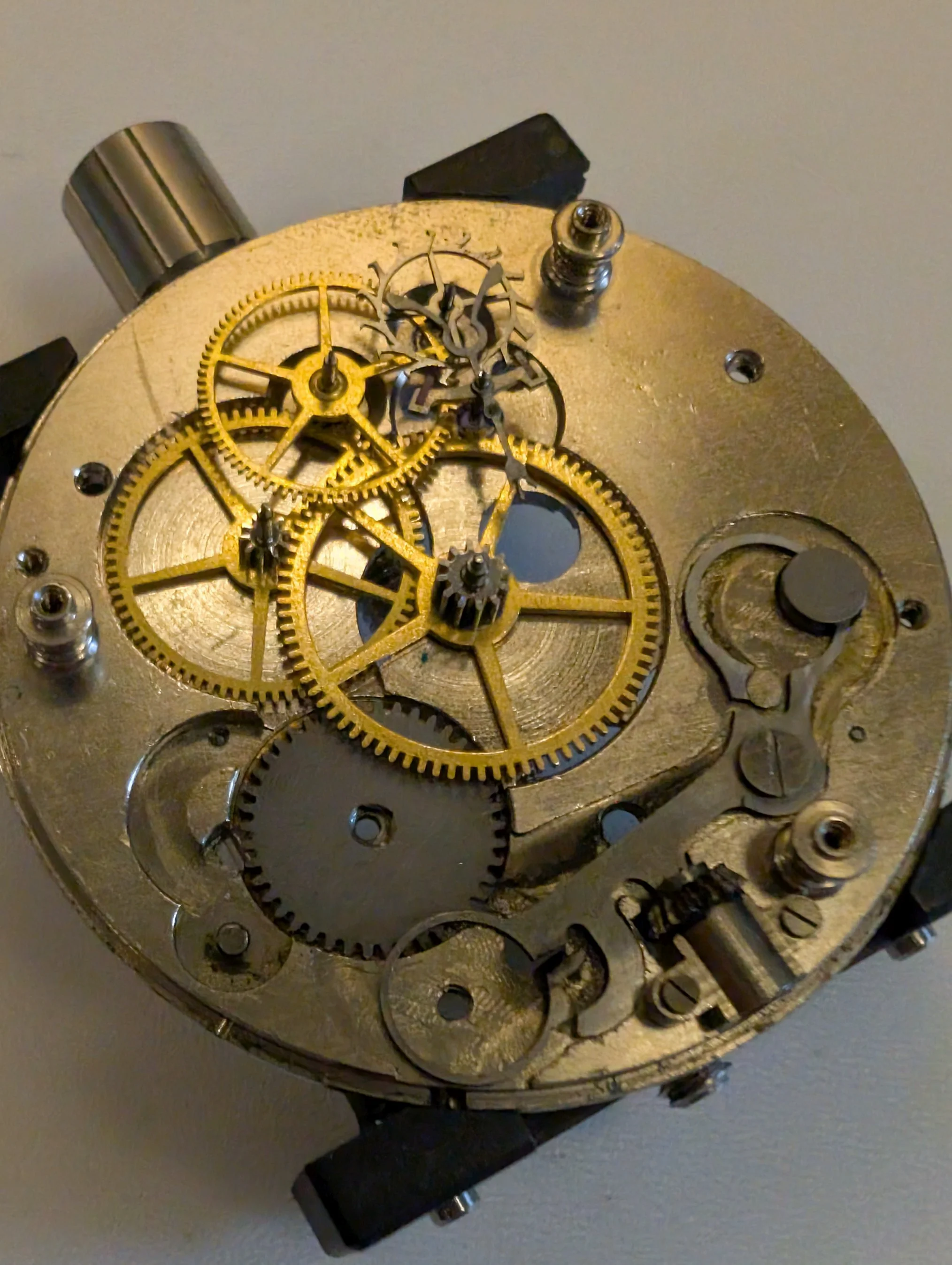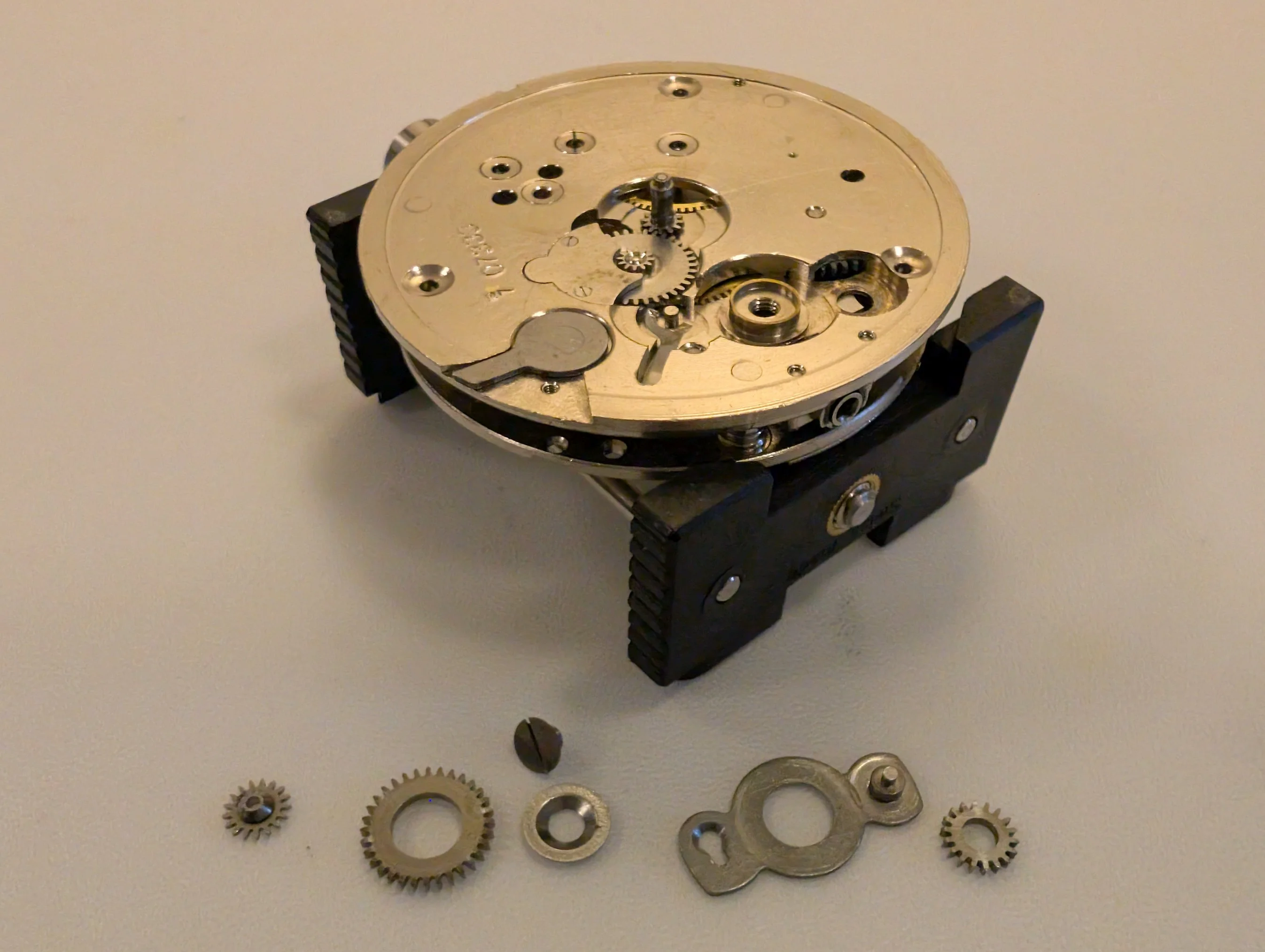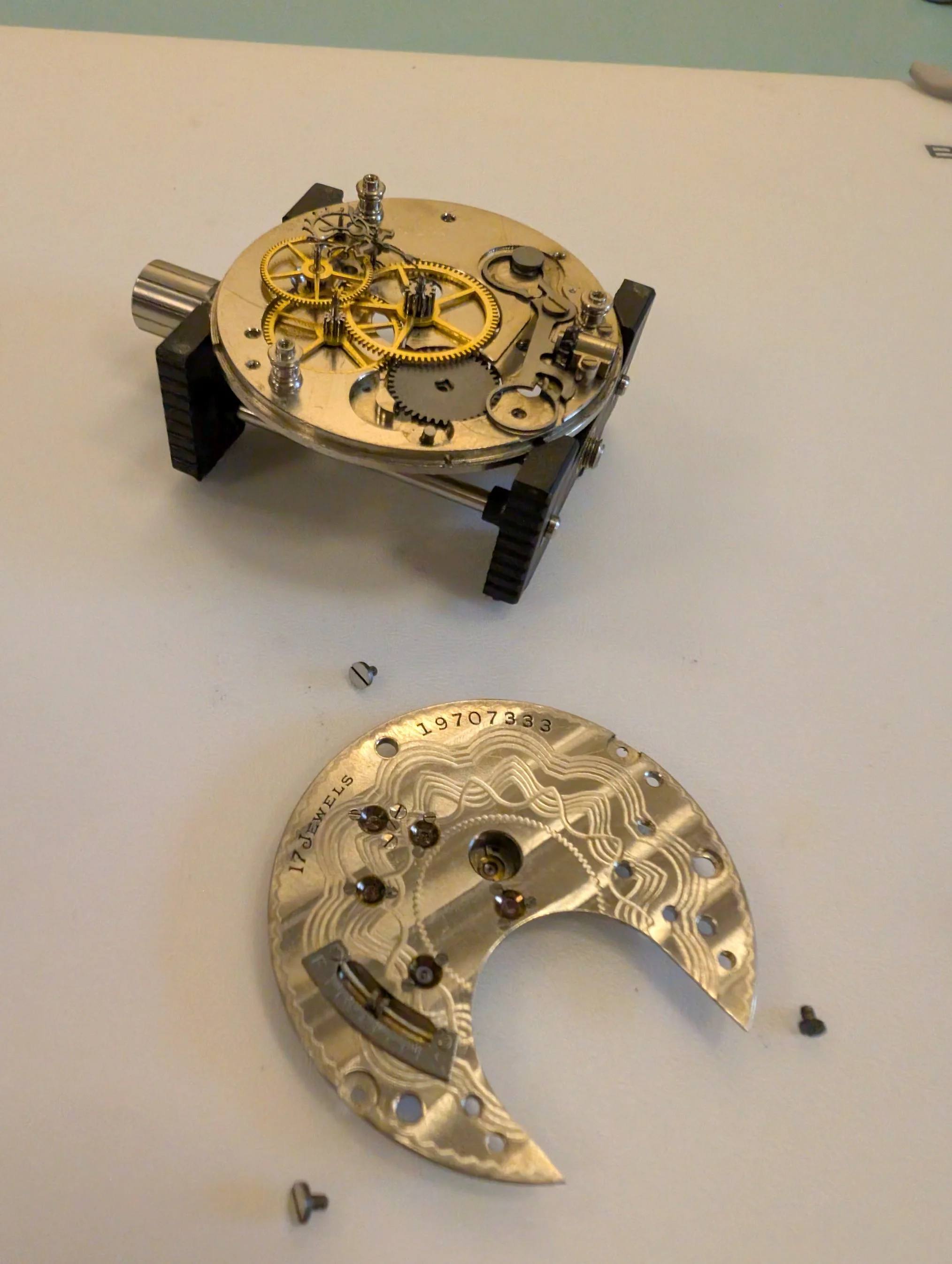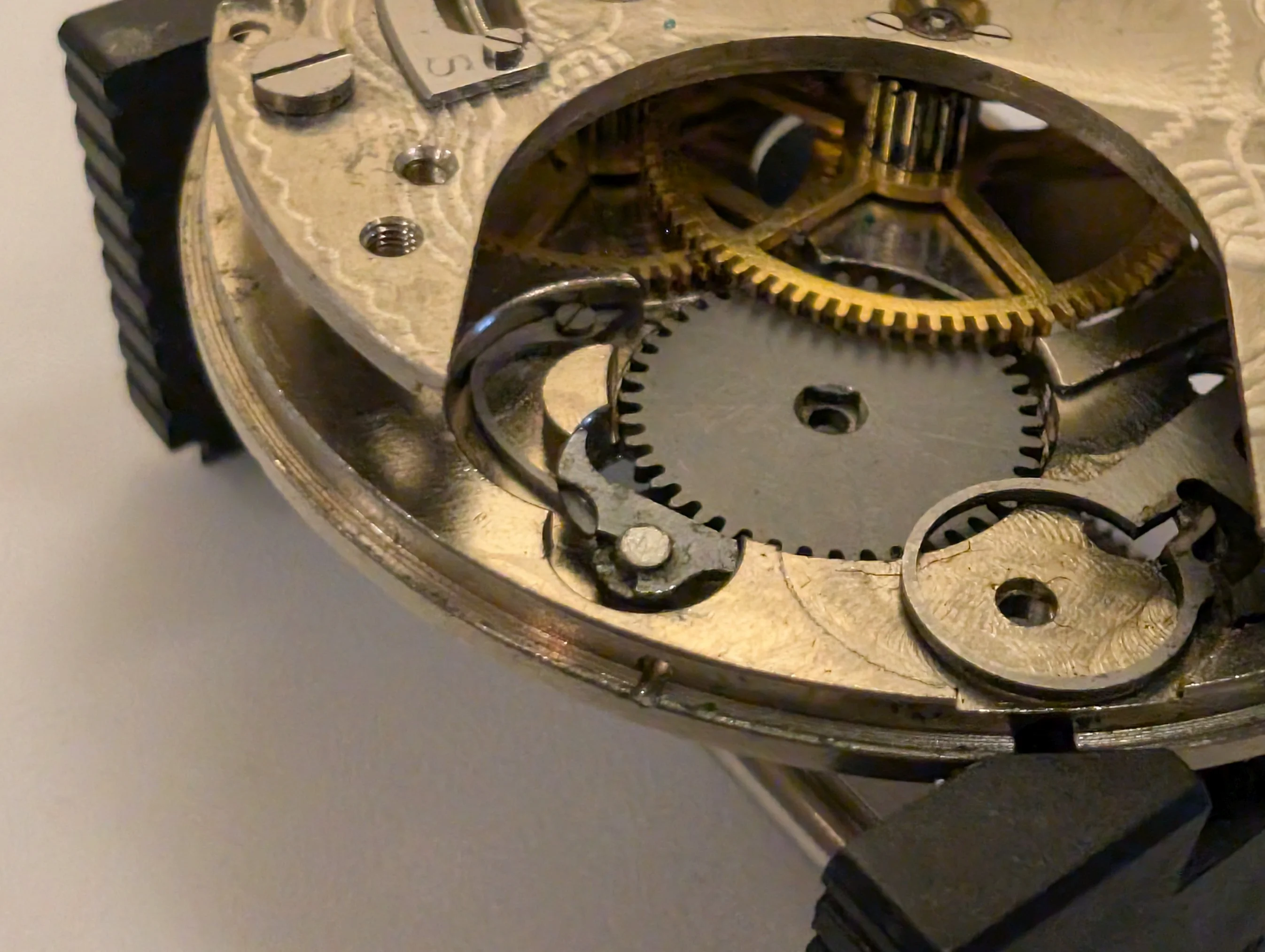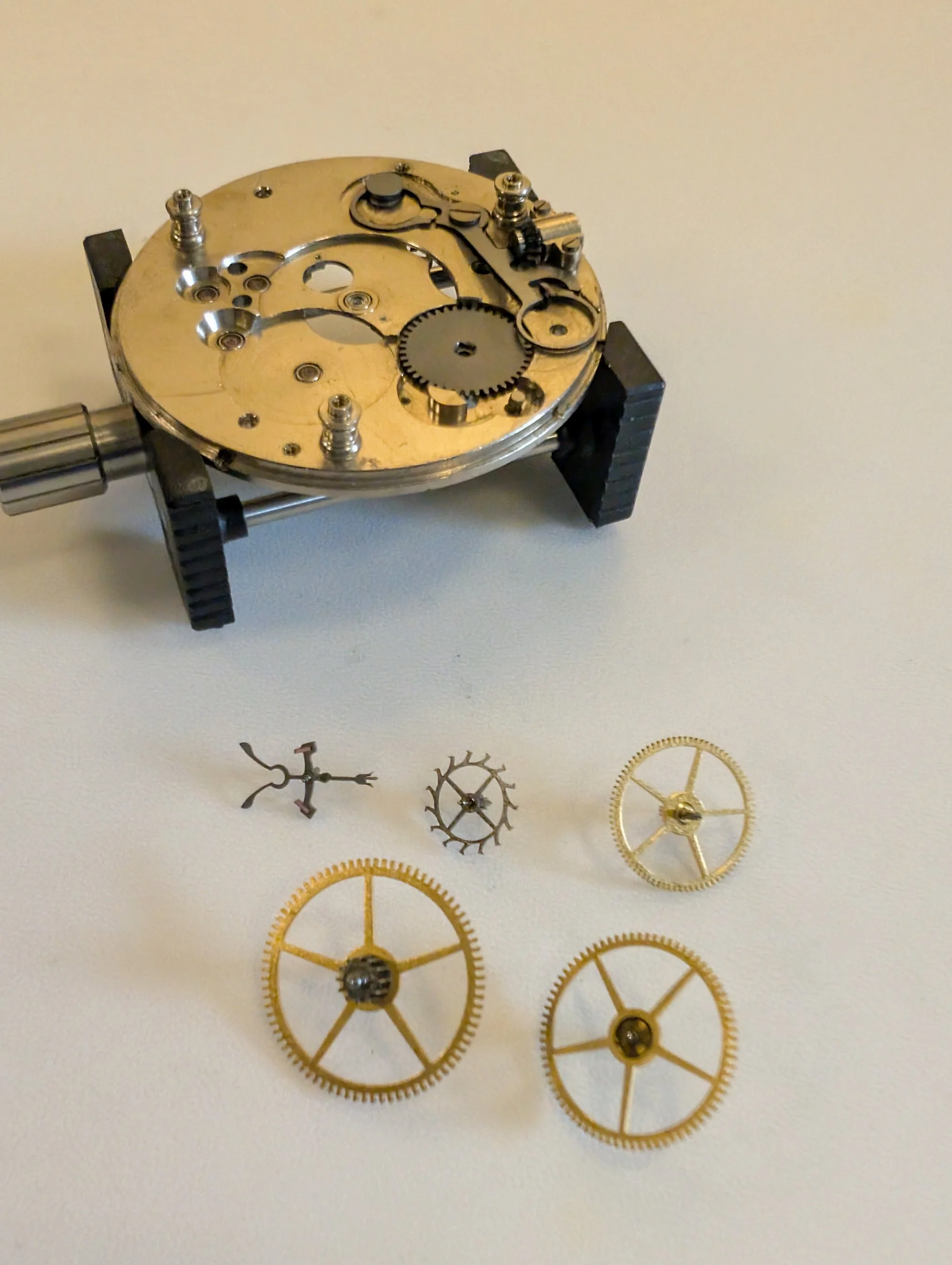 All clean (no longer smelling like 100 year old watch oil, thankfully), & coming back together