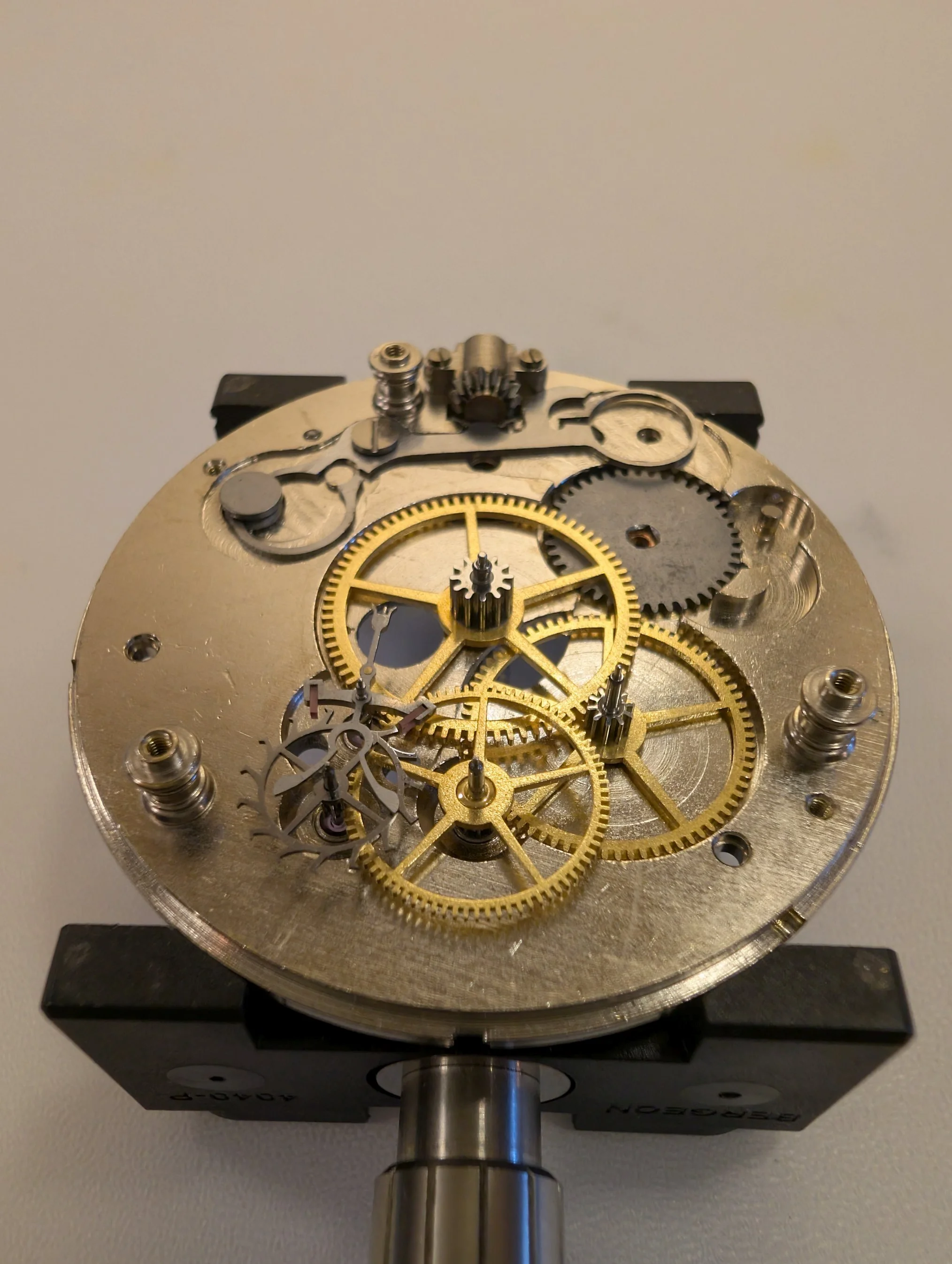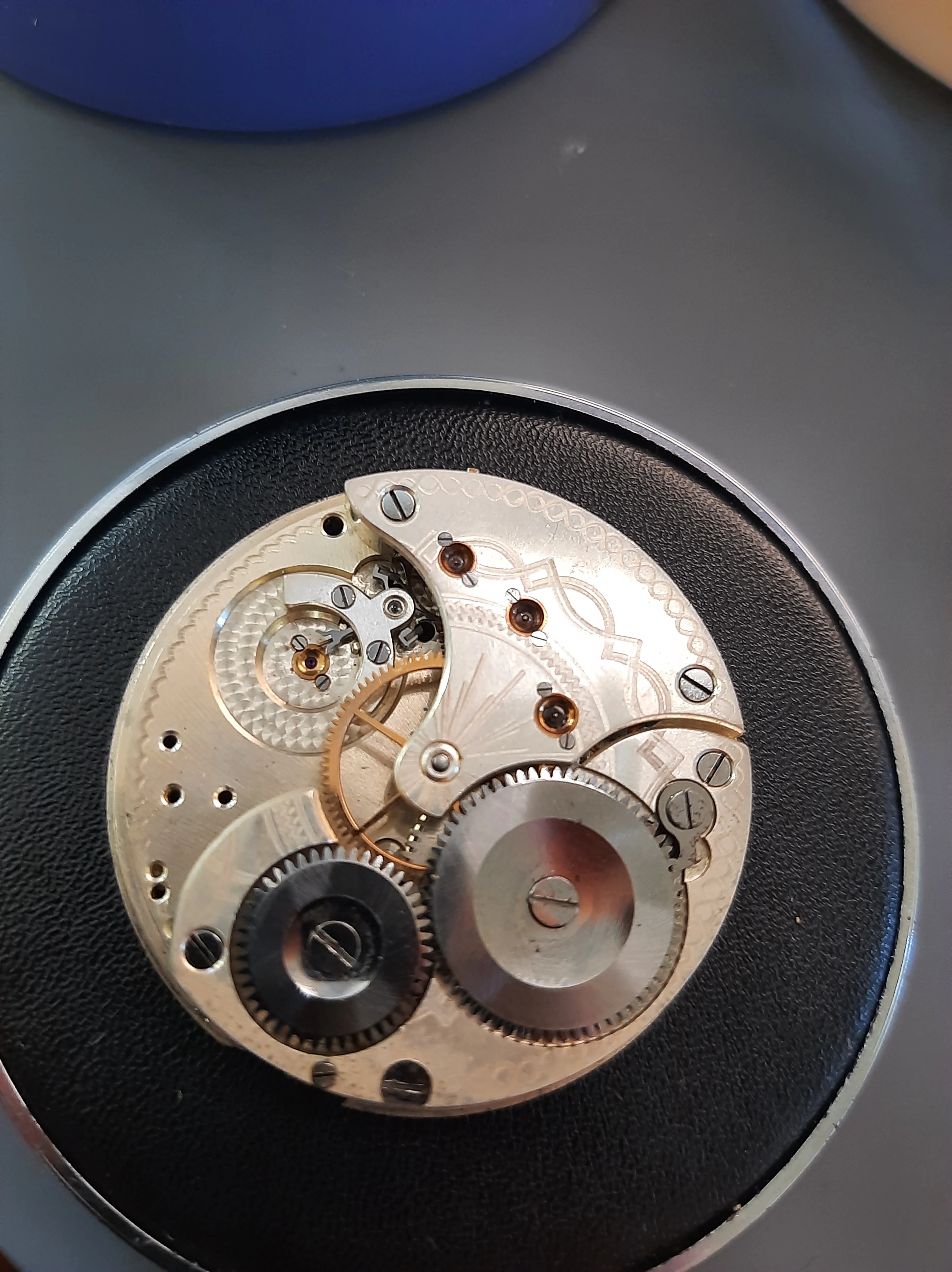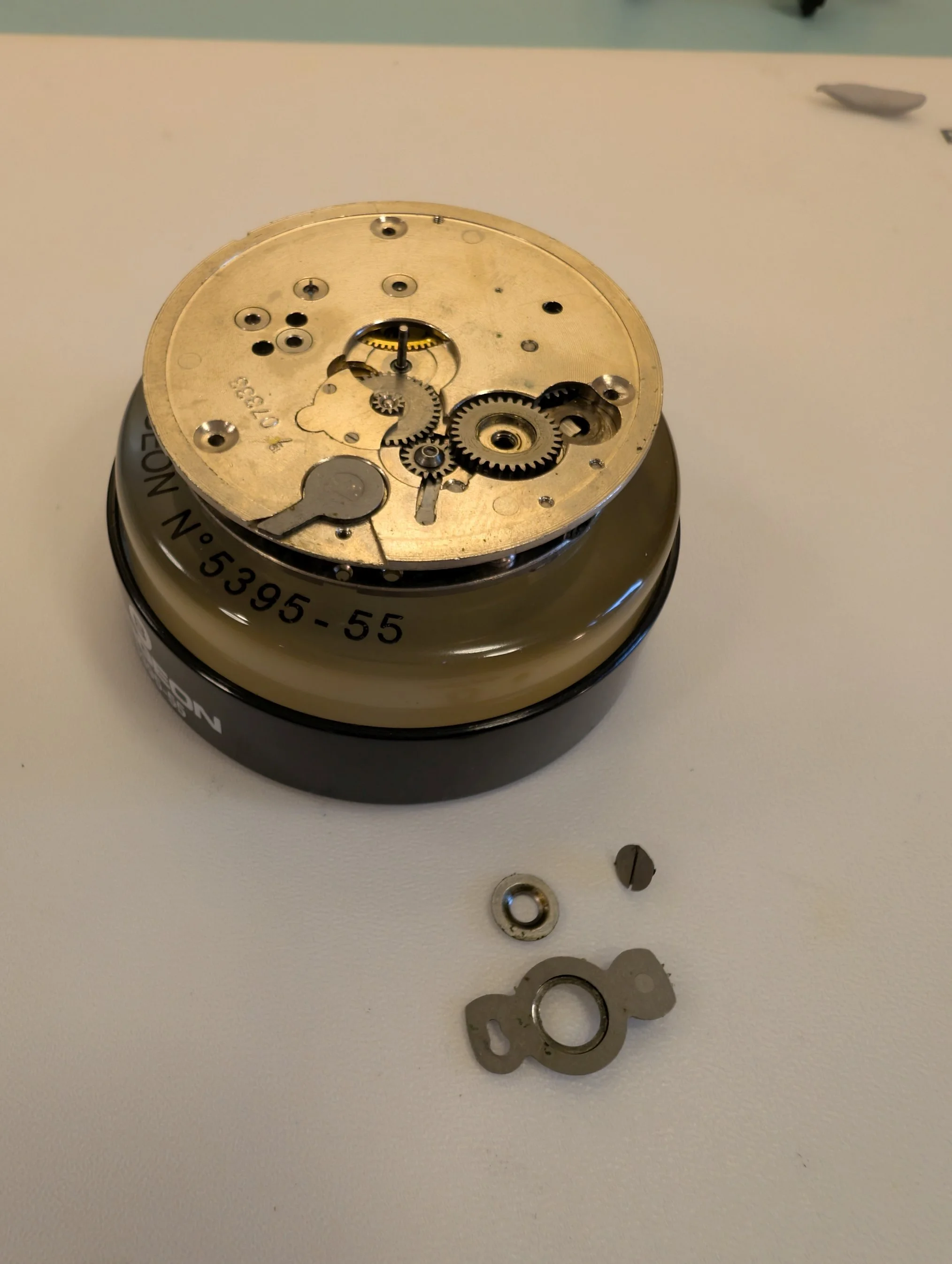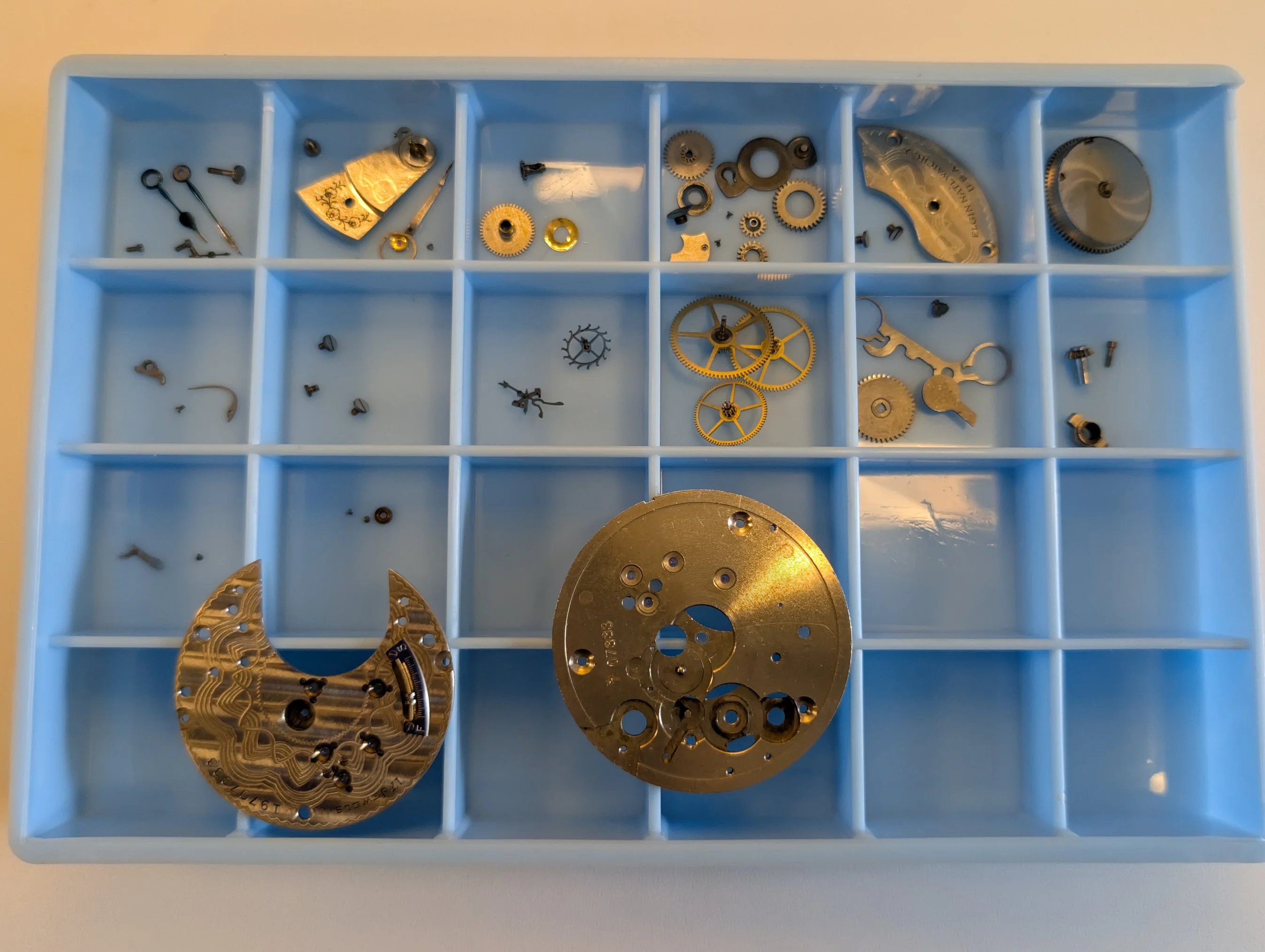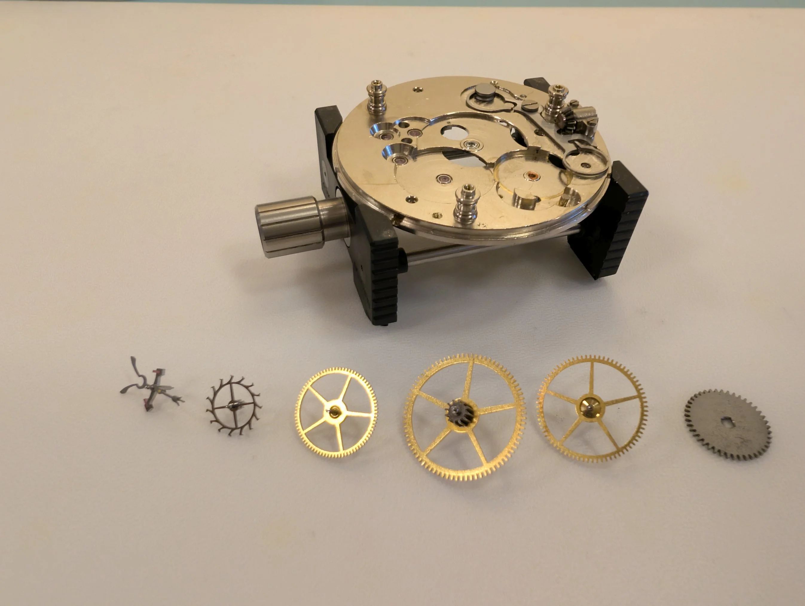 All clean (no longer smelling like 100 year old watch oil, thankfully), & coming back together