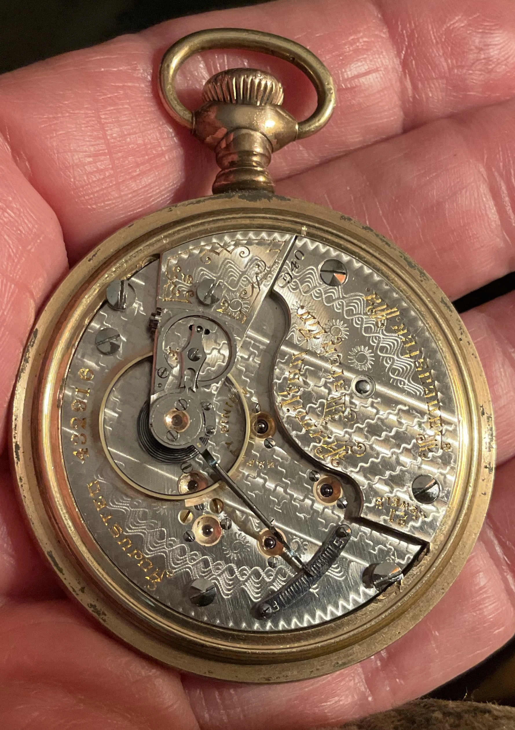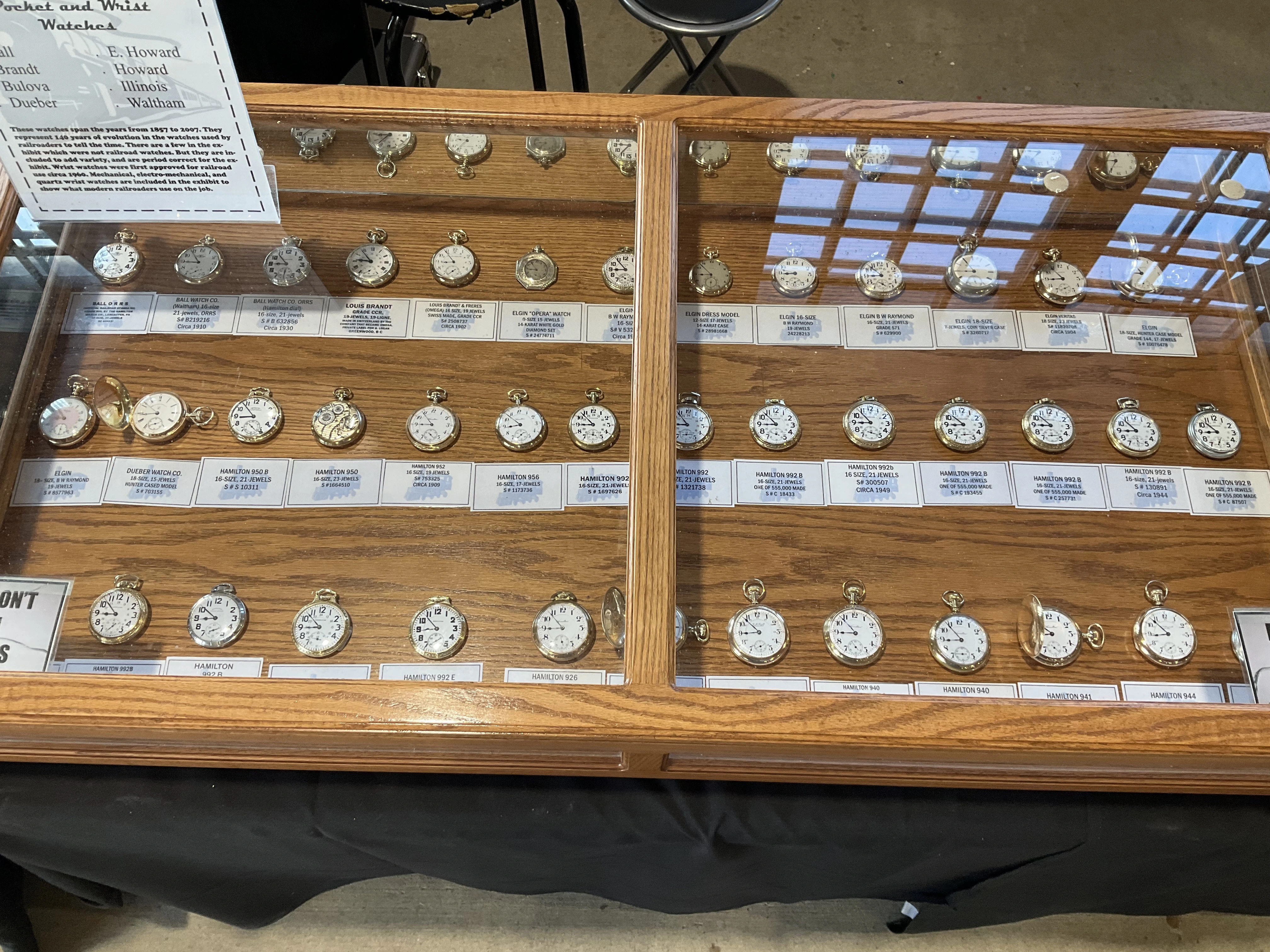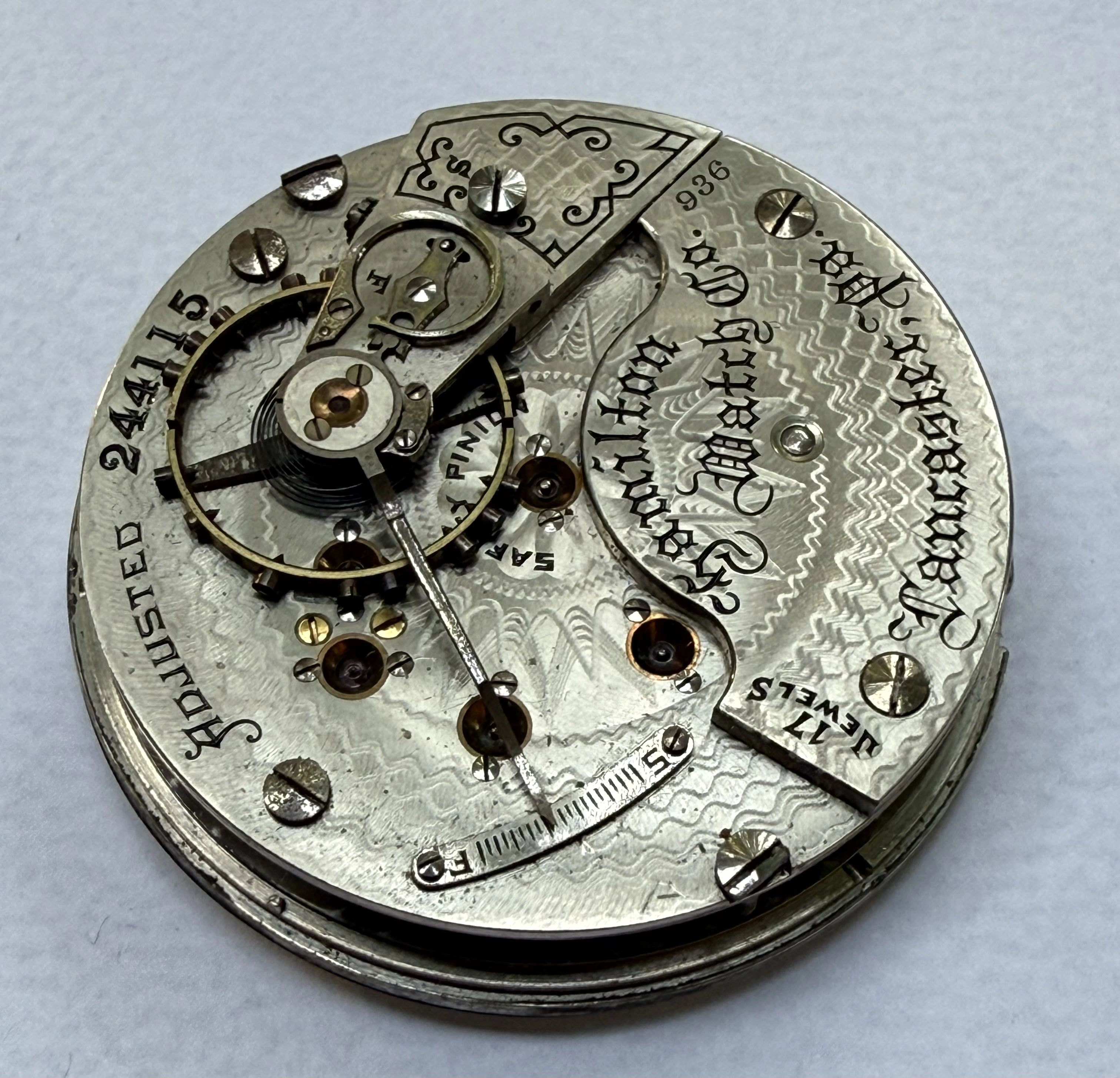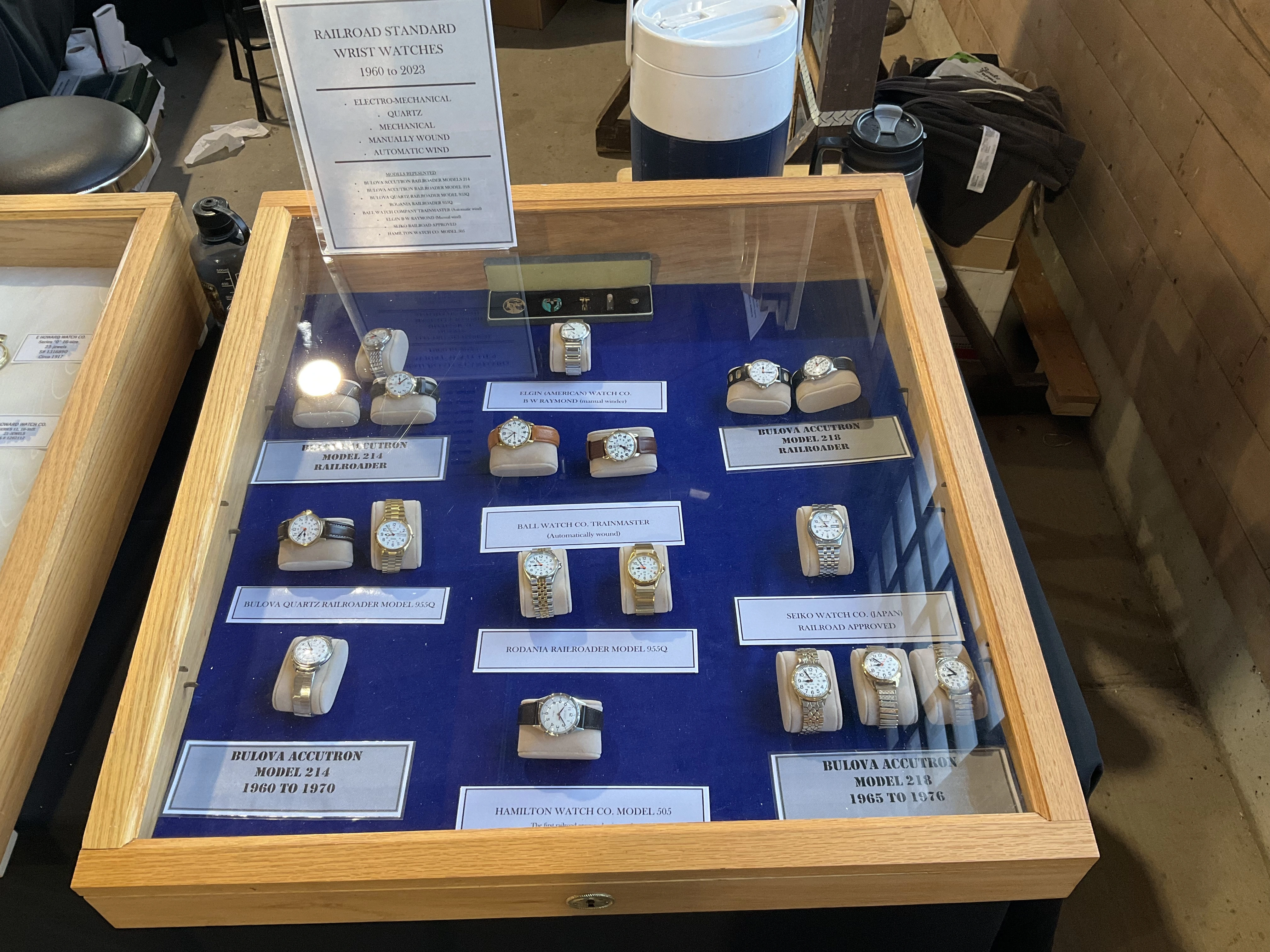 路I think I have the details correct. B W Raymond was the chap who helped set up the land deal where Elgin initially built its factory. Your Elgin is a manual winder. These are free sprung. That is, there is no traditional regulator on them. The arms on the balance wheel are in the shape of two semi-circular volute curves, each with a tiny weight on them which are moved over the balance arms, speeding up or slowing down the rate. These watches are not designed to be shock resistant, but the unusual balance arms are known to flex a bit in the event of a blow. In the photo I showed, there are 4 Accutron 214 models like yours. These were not the first railroad standard wrist watches, but they revolutionized the market for wrist watches for railroaders. They were the first widely accepted, and very successful railroad standard wrist watches. I have often had occasion to wonder how these Accutrons performed for crews that operated diesel/electric locomotives.